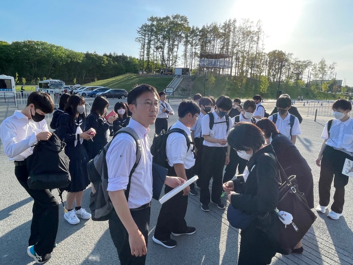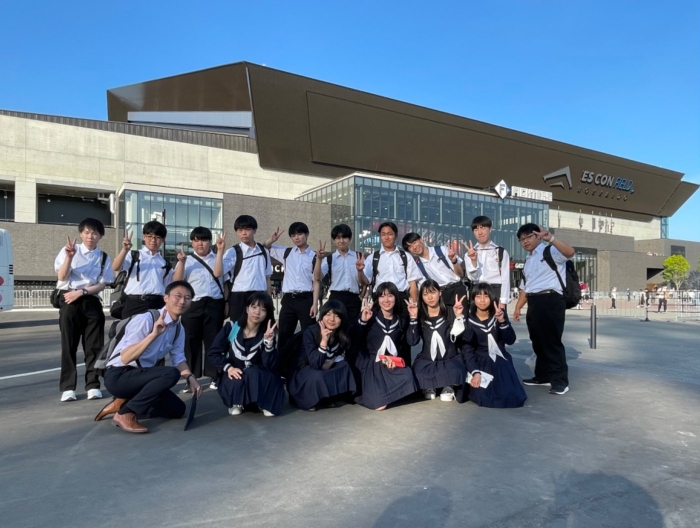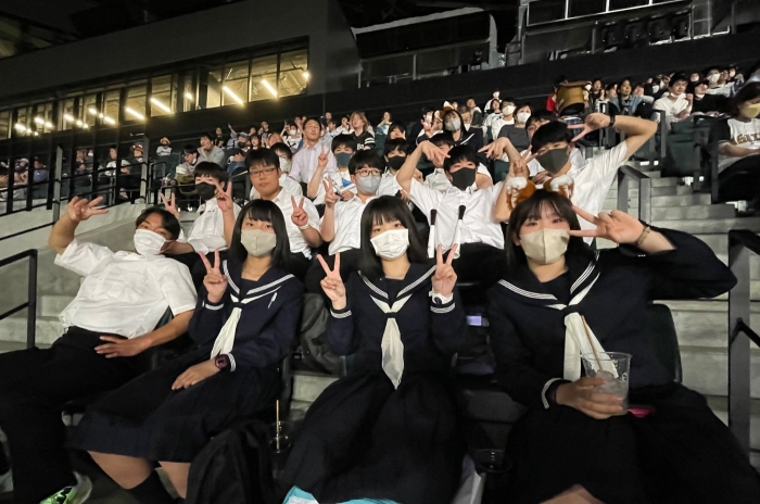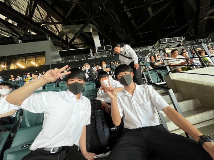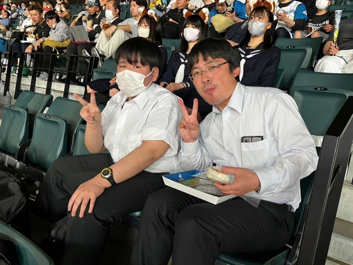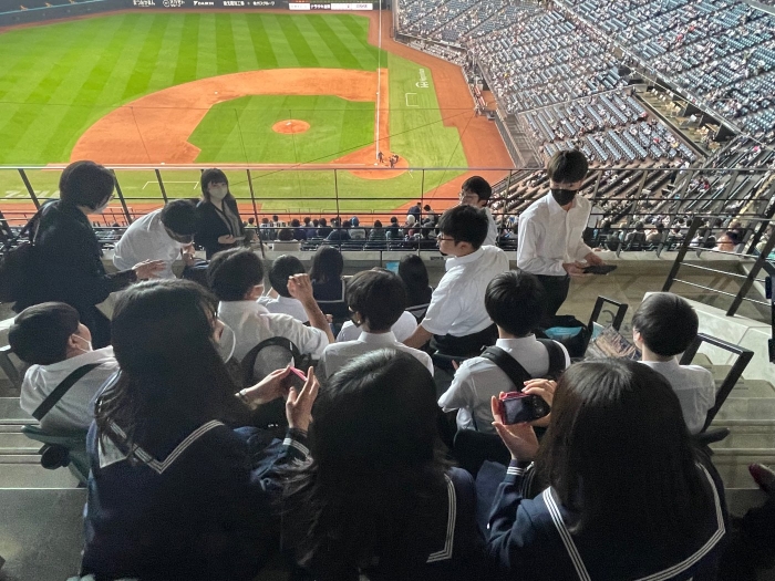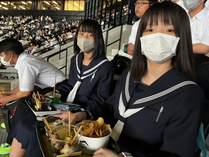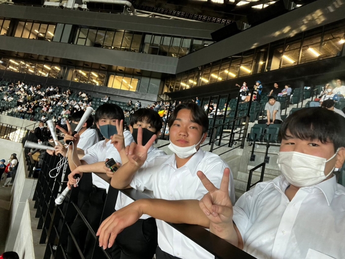 修学旅行その11 エスコンフィールド 2023年05月25日(木) 行事 札幌市から30分ほどバスで走り、エスコンフィールドに到着しました。ホークス側3階席ですが、バッターボックスとファイターズベンチががよく見える、とても眺めのいい席です! 球場をバックに記念撮影 チケットを受け取ります ファールボールをゲットできそうです 食べ物や飲み物を買い、準備万端でファイターズ応援に臨みます! 時間の都合上、試合の途中で球場をあとに。今のところ勝ってはいますが…結果が気になります!