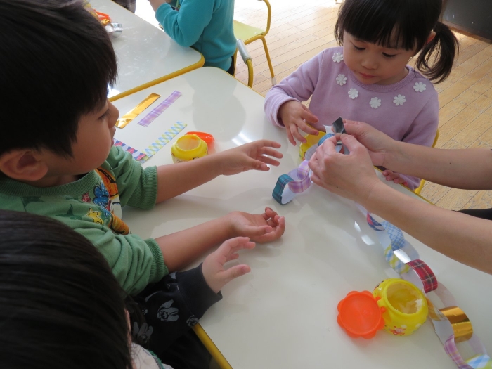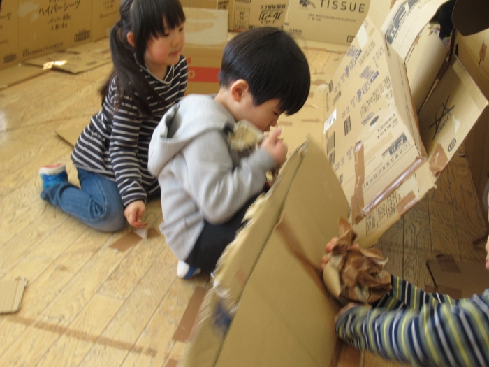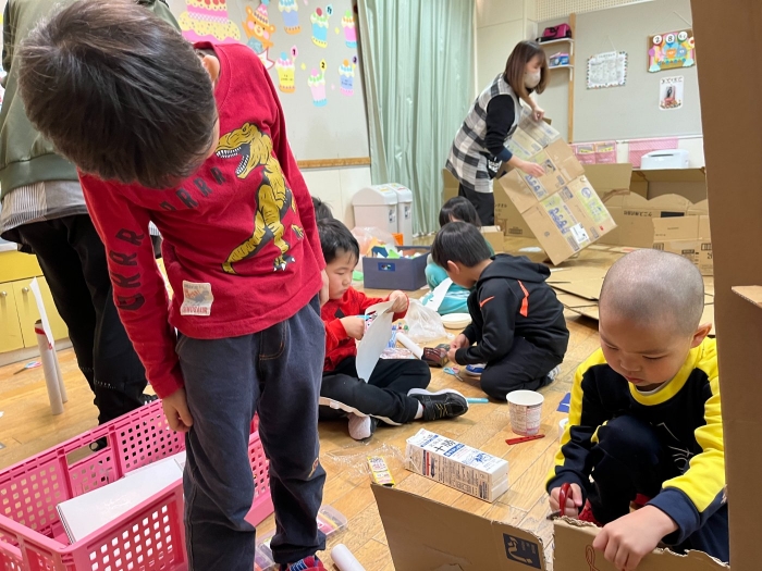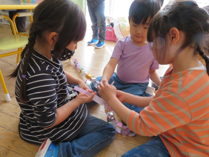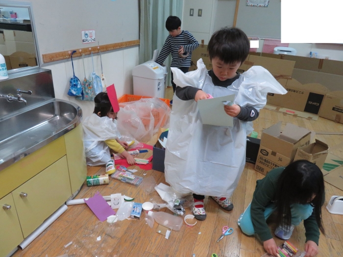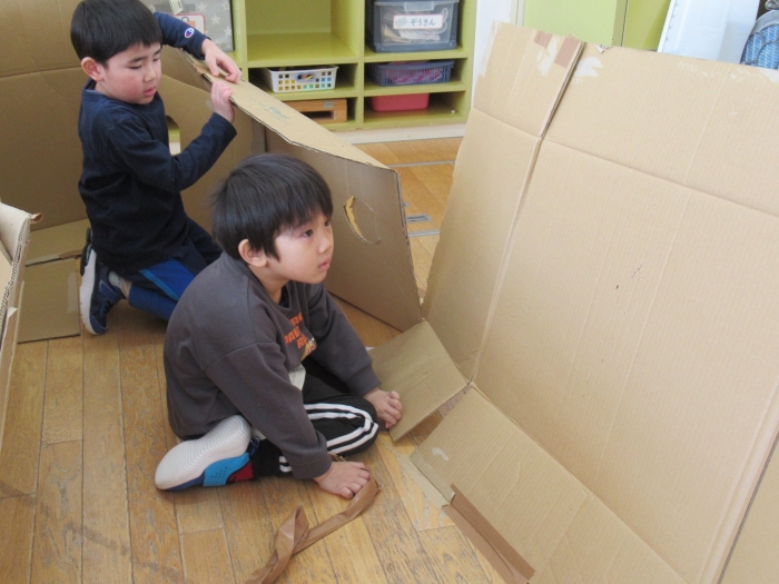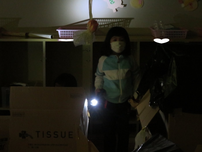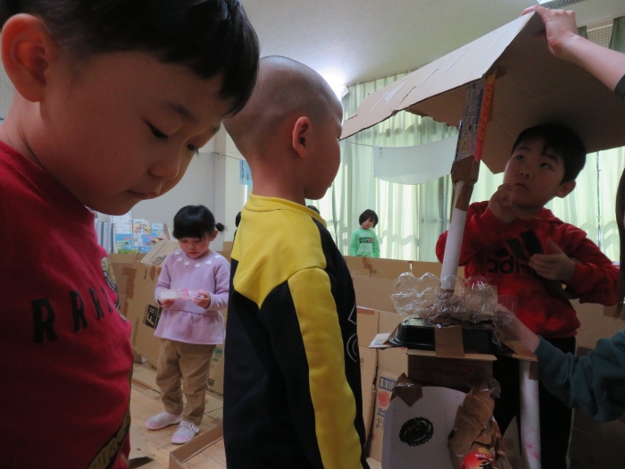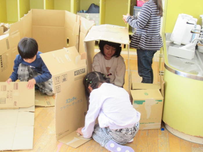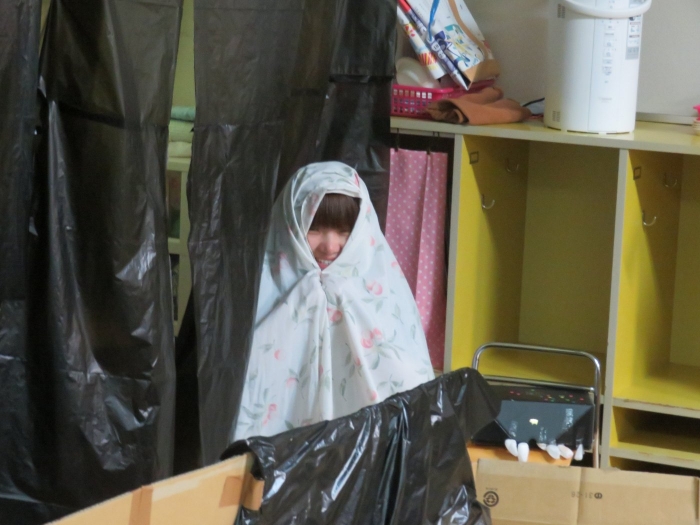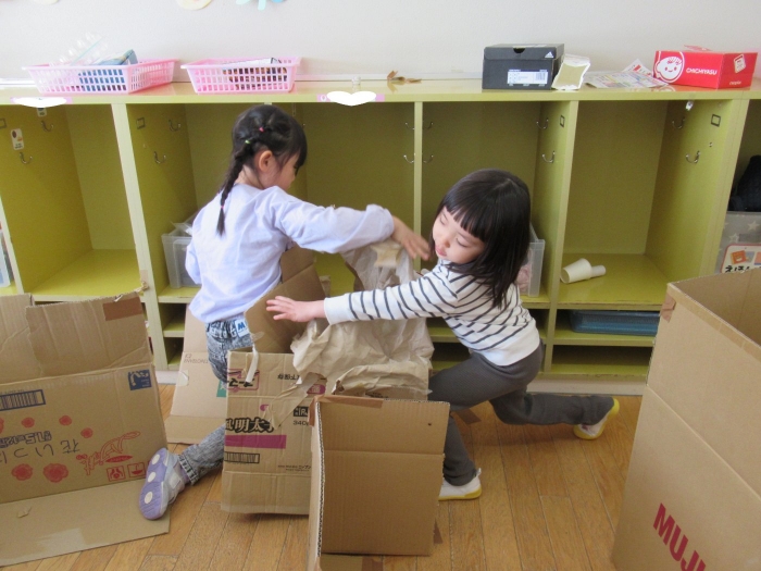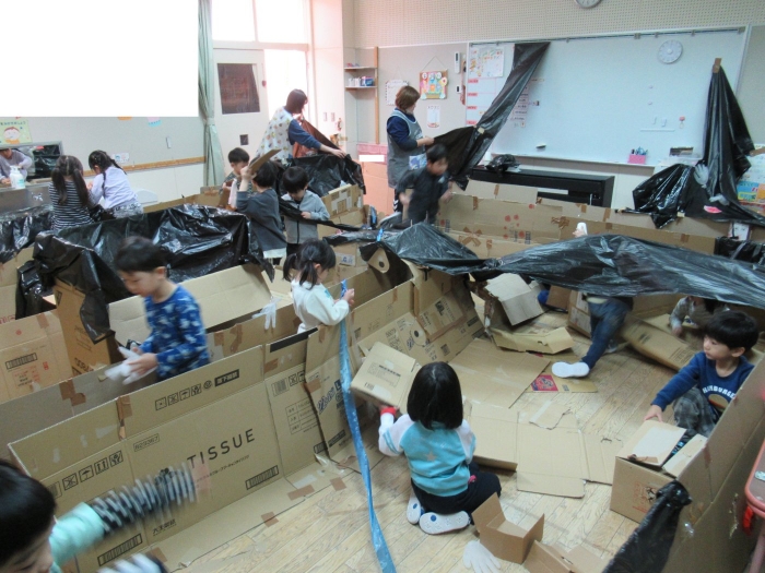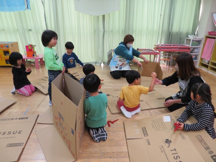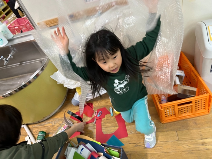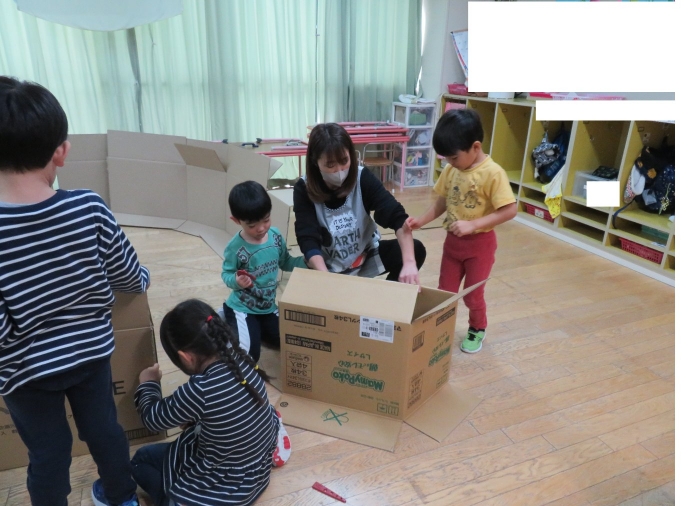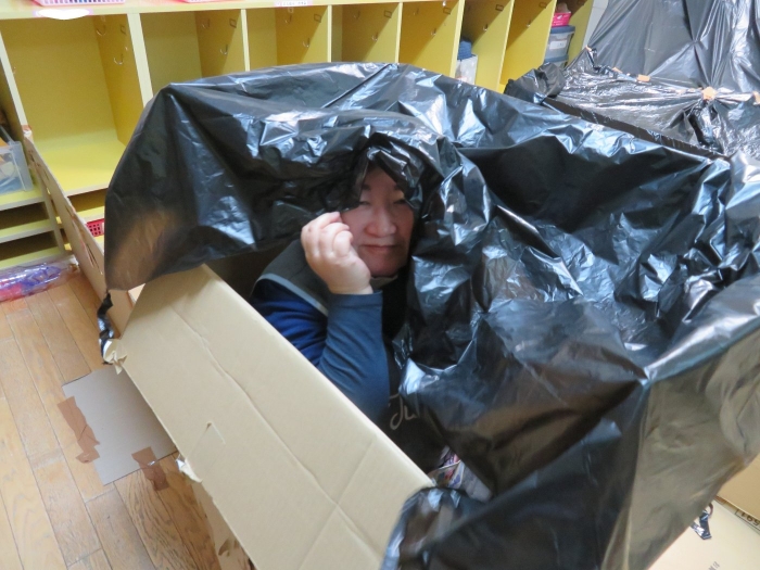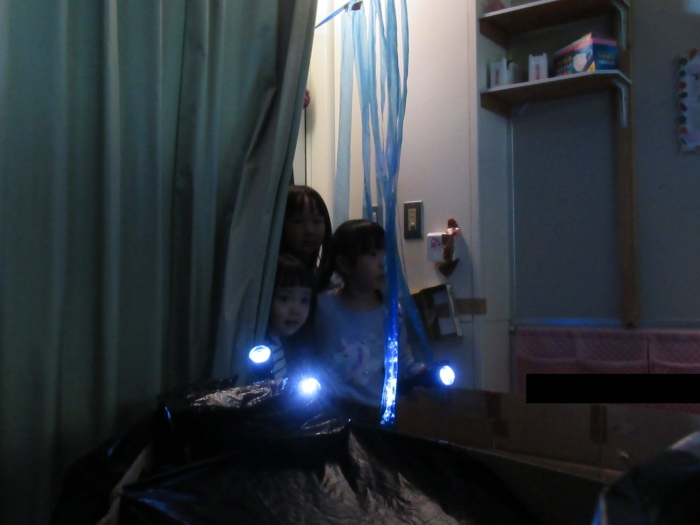 今日はつくしさん・いちごさんが、たけのこさんのために作成したお化け屋敷を片付けました。事前に子ども達から、「最後に先生方にお化けをやってほしい!」という要望があり、ノリノリで引き受ける先生方。最初は少し手加減しながら驚かせていましたが、だんだん気分が乗ってきて気付けば全力でお化けになりきっていました(笑)。自分たちが作ったお化け屋敷で、最後に怖~い?楽しい?体験をすることができました。