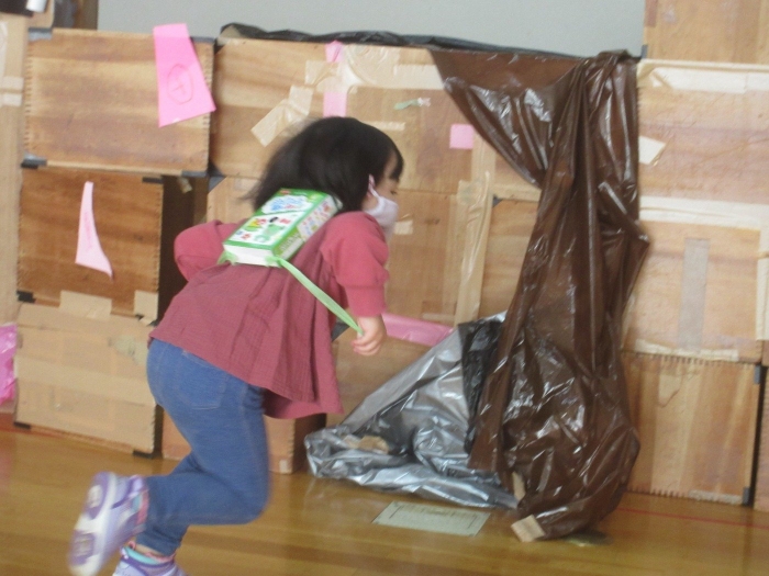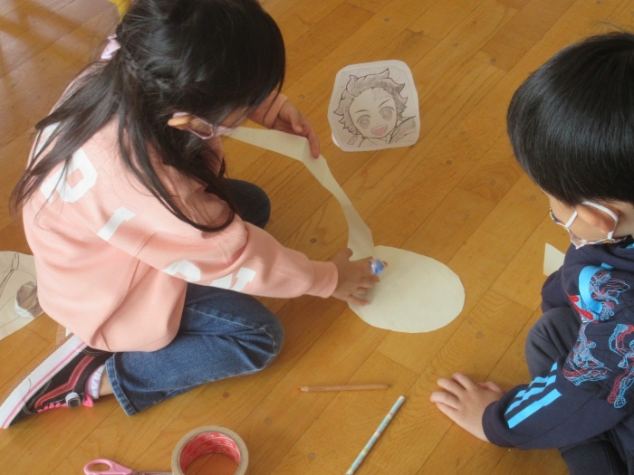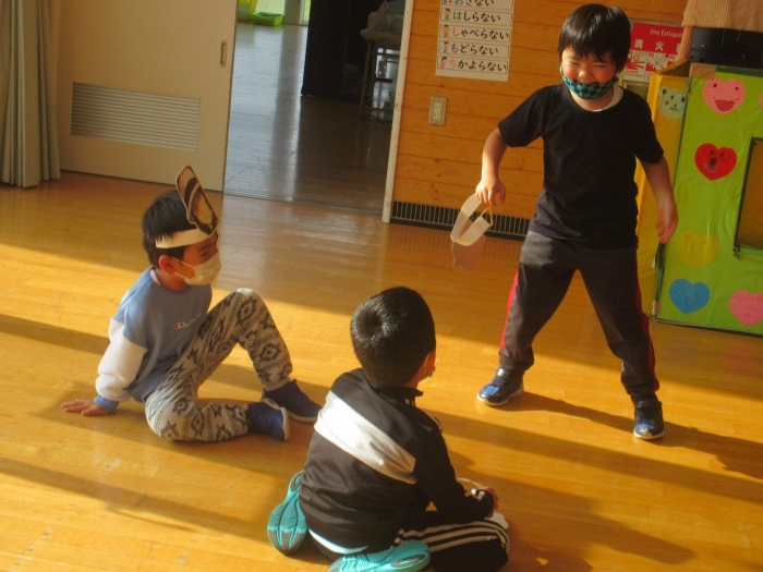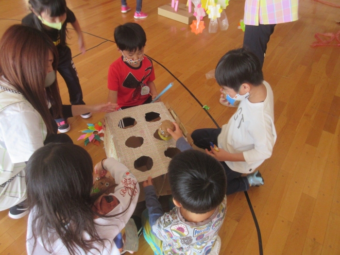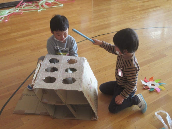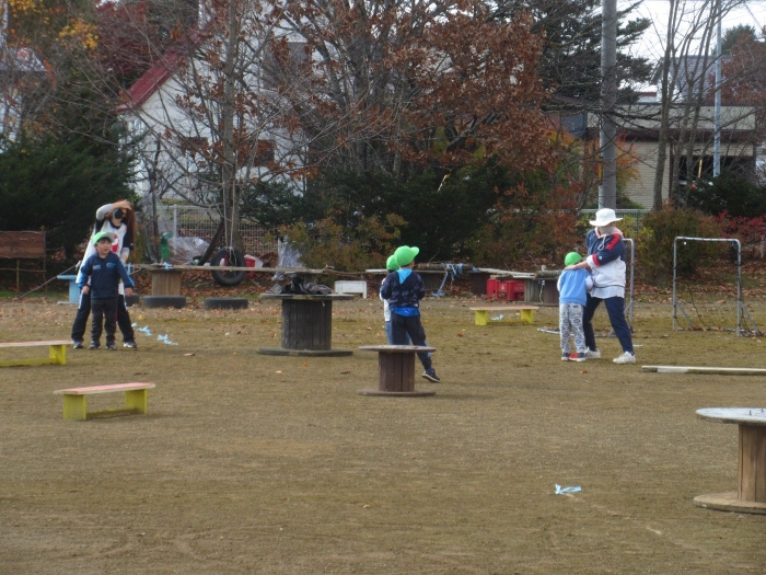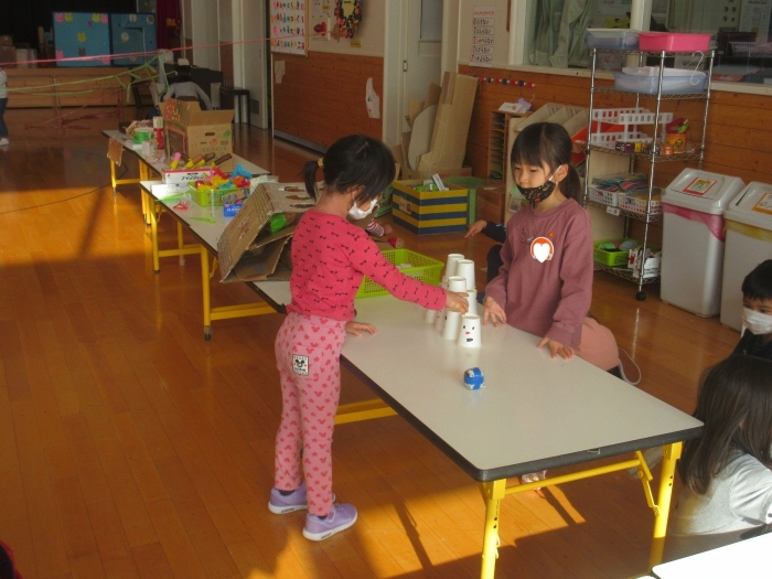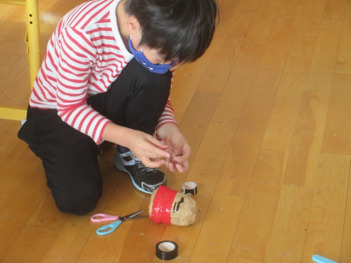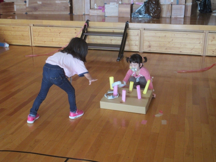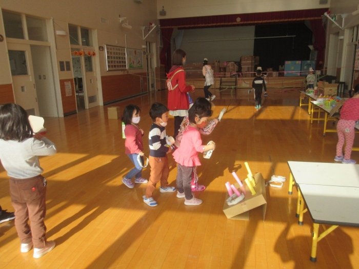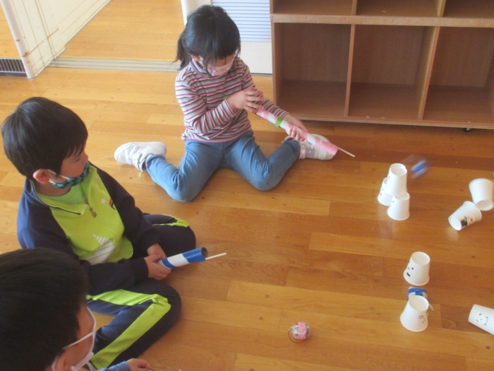 朝の遊びでは、早速、中学3年生が来園した際に行った遊びを楽しむ姿が見られていました。3年生がプレゼントしてくれた道具を使って遊ぶだけでなく、3年生が作った道具を見ながら自分で作っている子もいました。子供達が、考えたり工夫したりしながら遊んでいることが、とても感じられる姿でした。