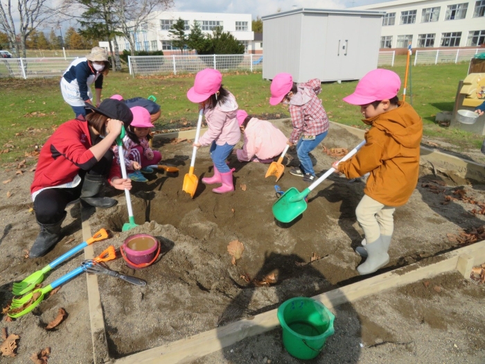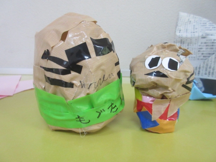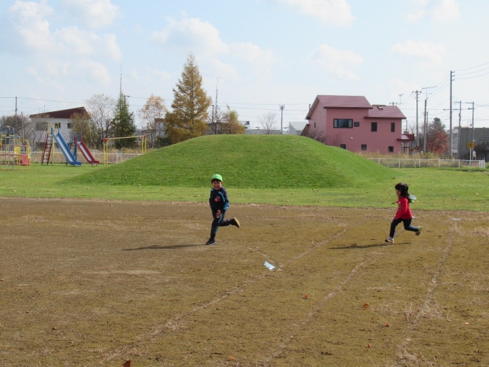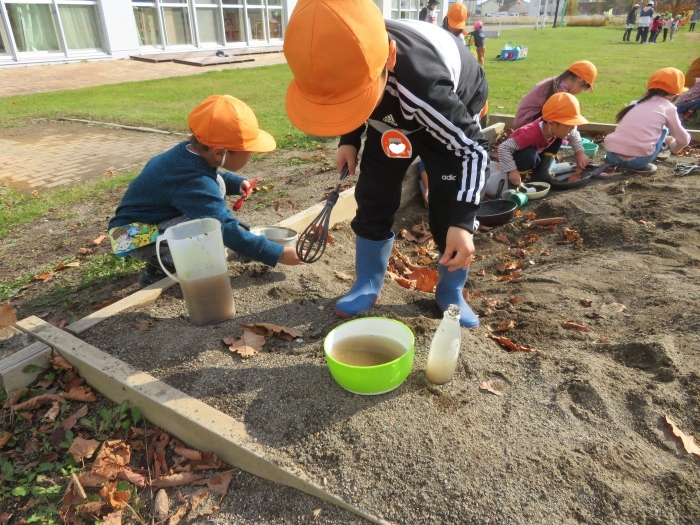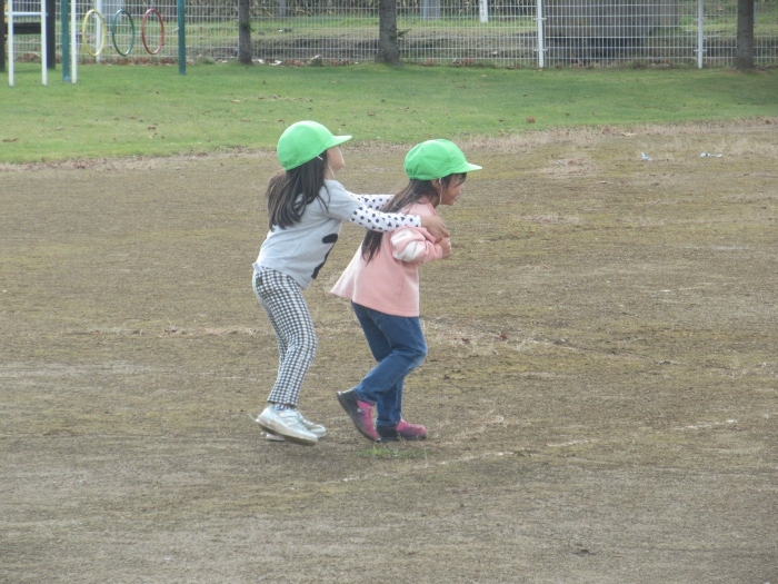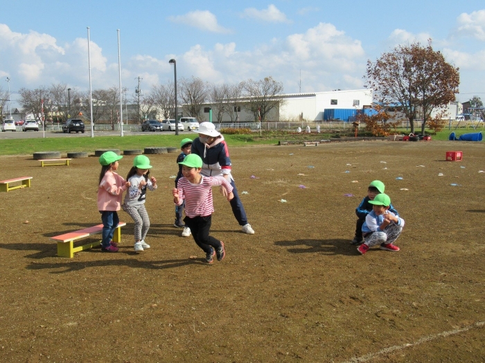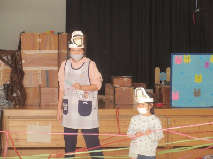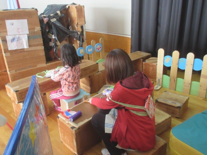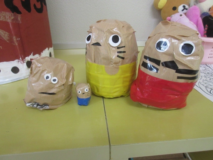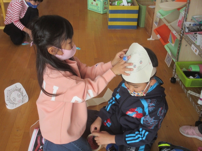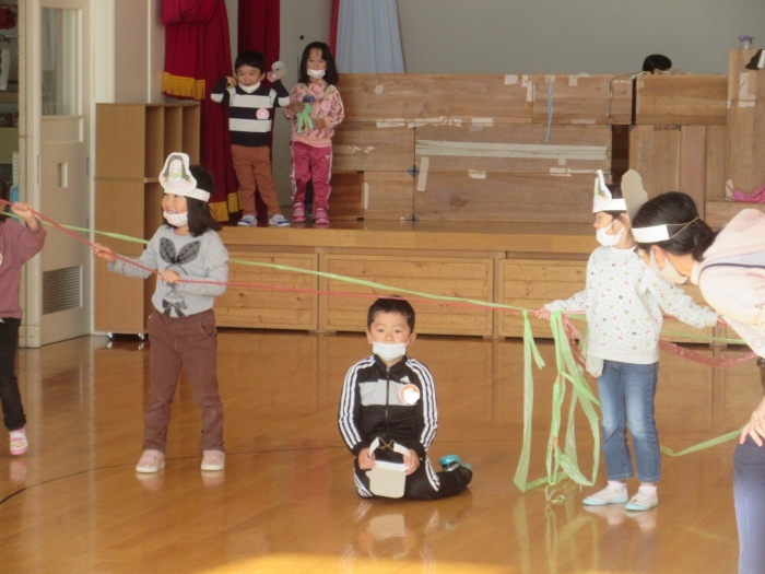 朝の遊びでは、早速、中学3年生が来園した際に行った遊びを楽しむ姿が見られていました。3年生がプレゼントしてくれた道具を使って遊ぶだけでなく、3年生が作った道具を見ながら自分で作っている子もいました。子供達が、考えたり工夫したりしながら遊んでいることが、とても感じられる姿でした。