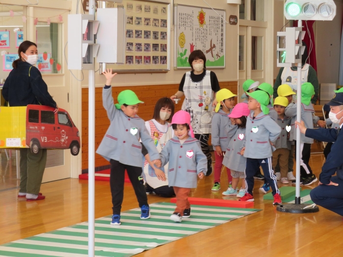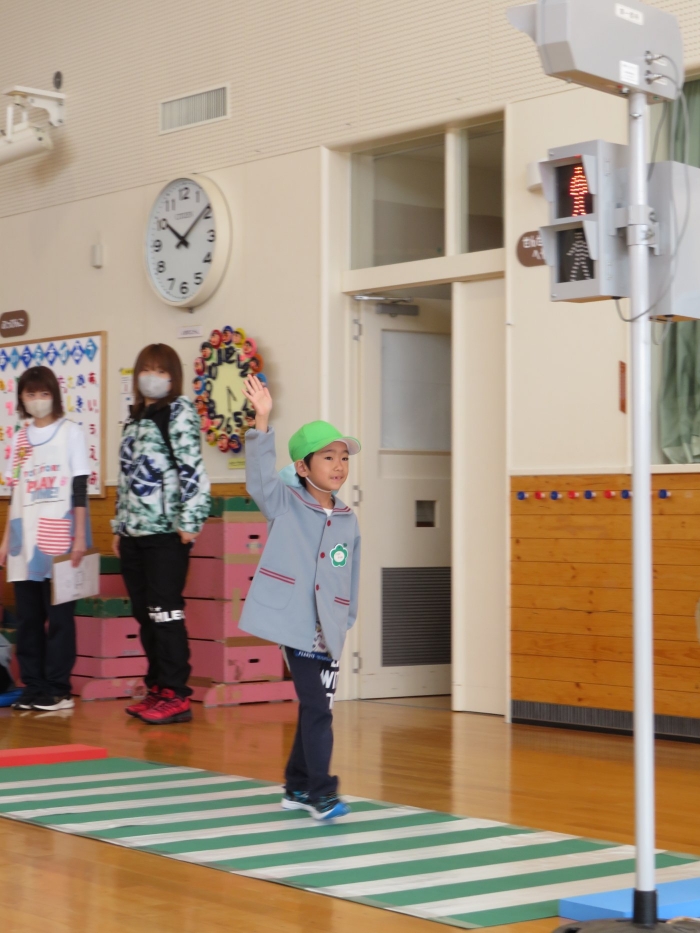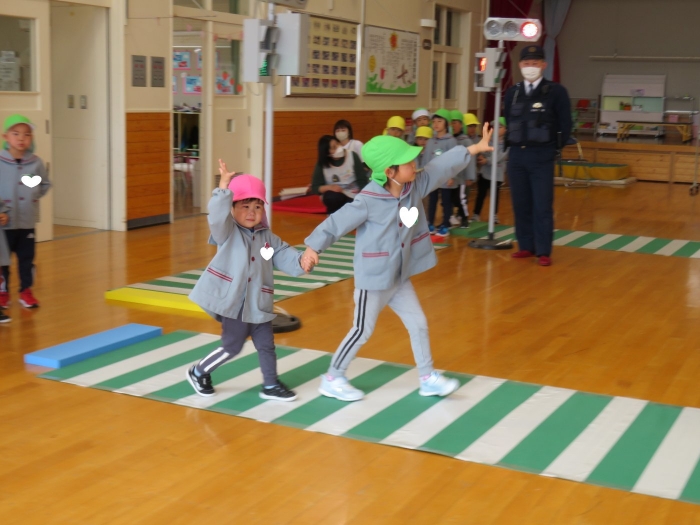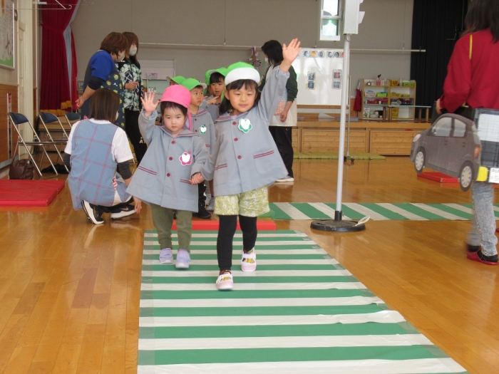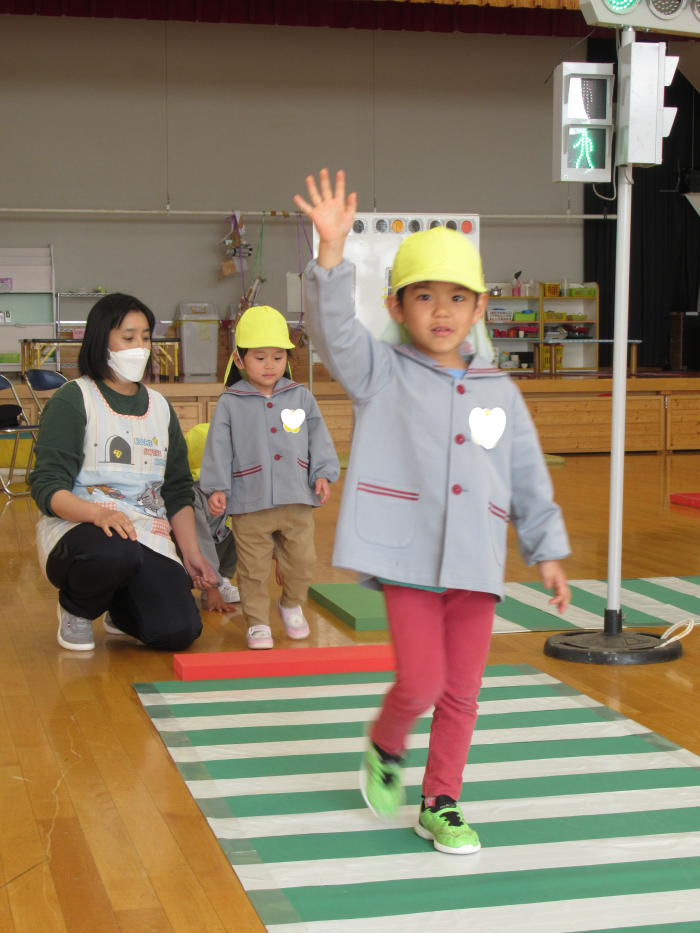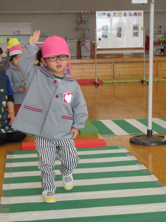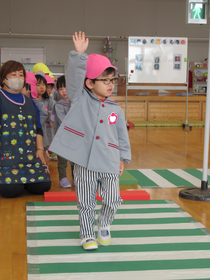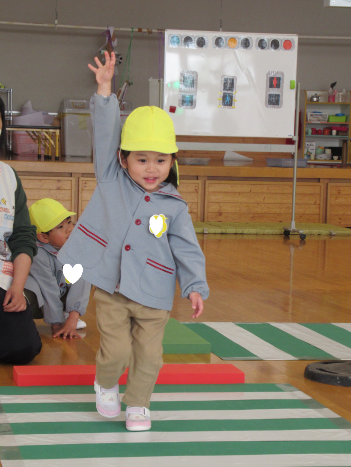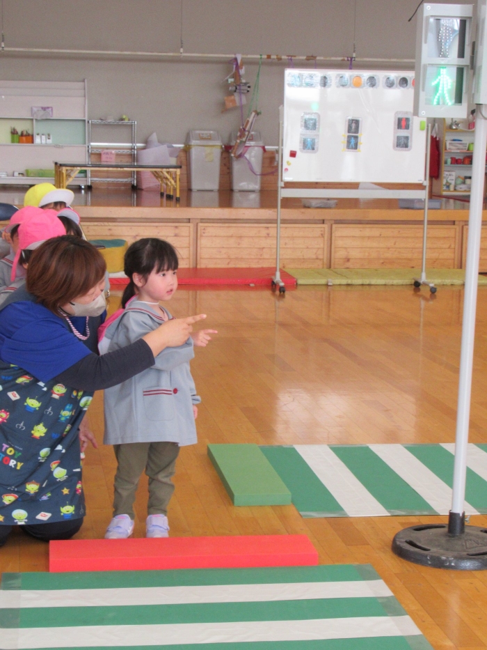 先週木曜日、第1回目の交通安全教室がありました。信号の見方や横断歩道の渡り方についてお話を聞いた後、プレイルールに設置したミニ信号機を使って練習を行いました。交通ルールを身に付けていくためには、繰り返しの練習や実際に渡ってみることが必要です。散歩へ行く際には、繰り返し練習を行っていきたいと思います。ご家庭でも、お出かけの際はお子さんと一緒に練習をしてみてください。