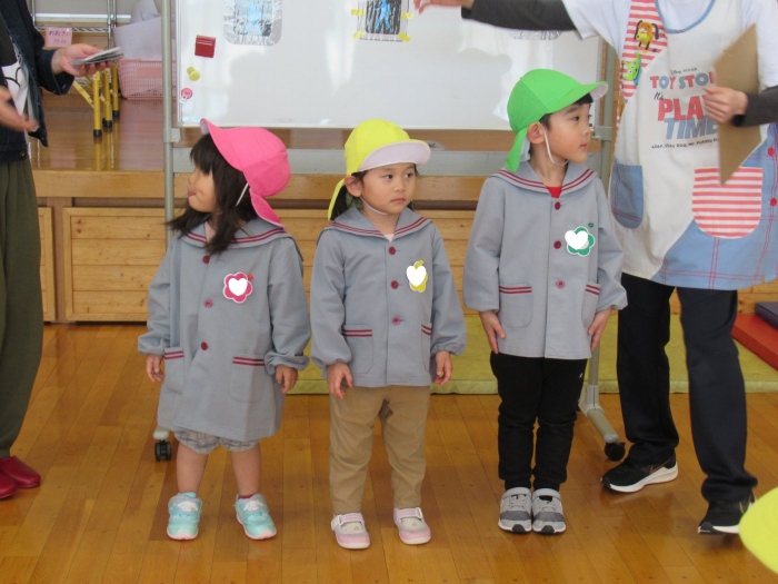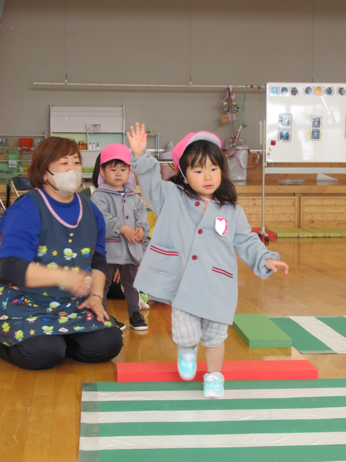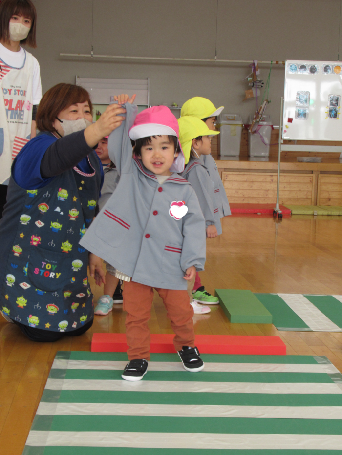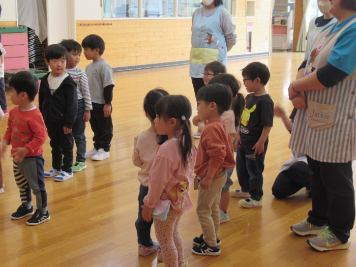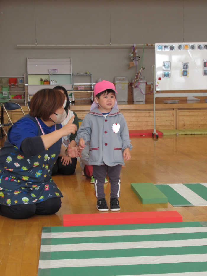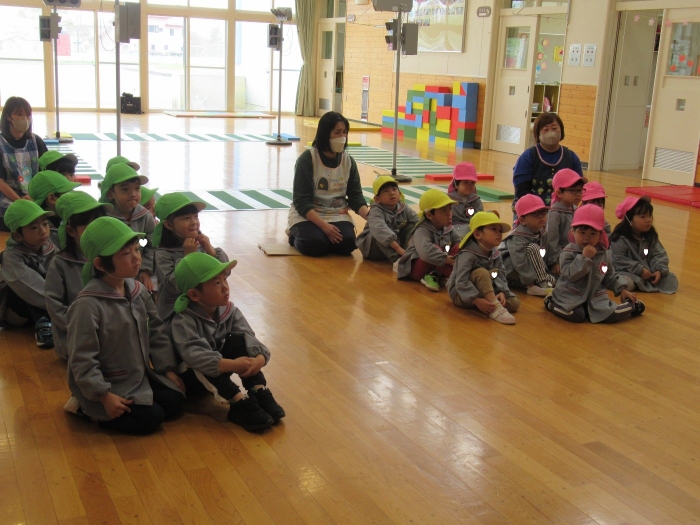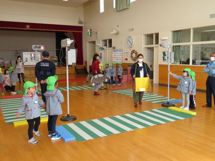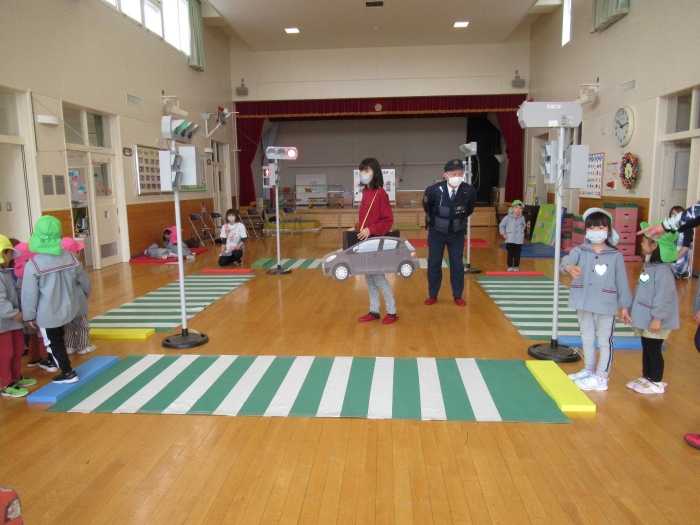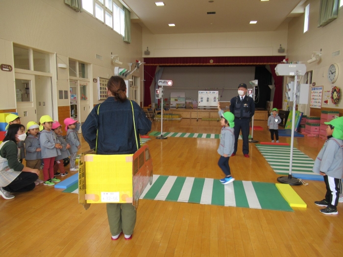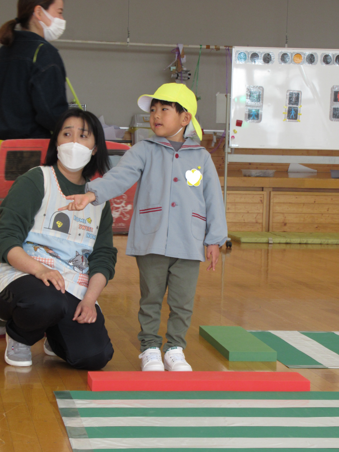 先週木曜日、第1回目の交通安全教室がありました。信号の見方や横断歩道の渡り方についてお話を聞いた後、プレイルールに設置したミニ信号機を使って練習を行いました。交通ルールを身に付けていくためには、繰り返しの練習や実際に渡ってみることが必要です。散歩へ行く際には、繰り返し練習を行っていきたいと思います。ご家庭でも、お出かけの際はお子さんと一緒に練習をしてみてください。