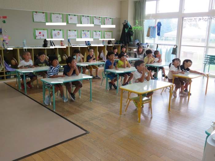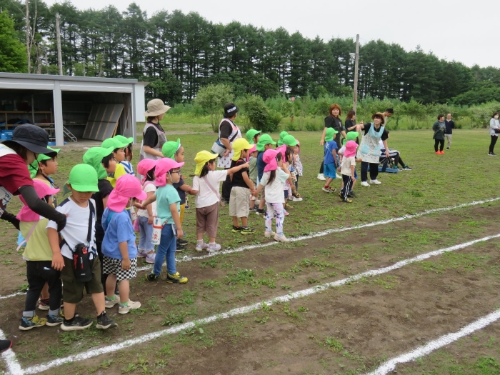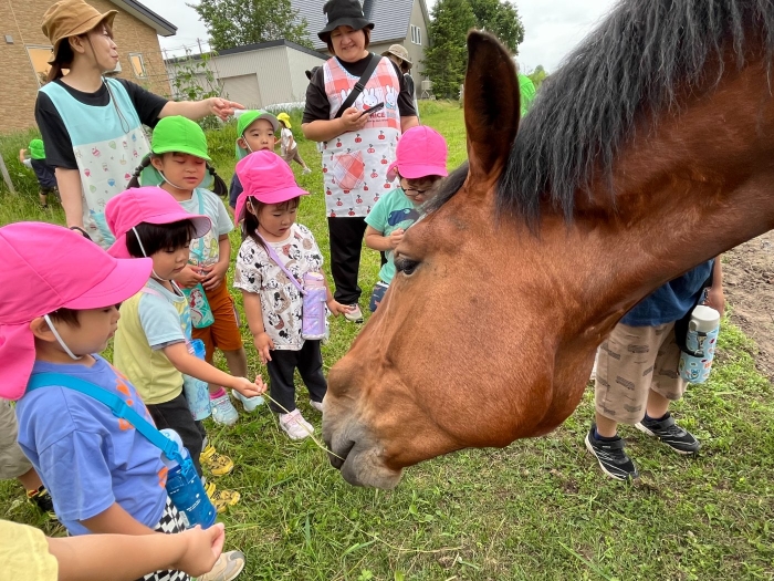 今日は、つくし組・たけのこ組の担任不在のため、2クラス合同で一緒に過ごしました。気温が高くなることを予想して水遊びを行う予定でしたが、気温があまり上がらなかったため、久しぶりに全クラスで馬たちに合いに行ってきました。