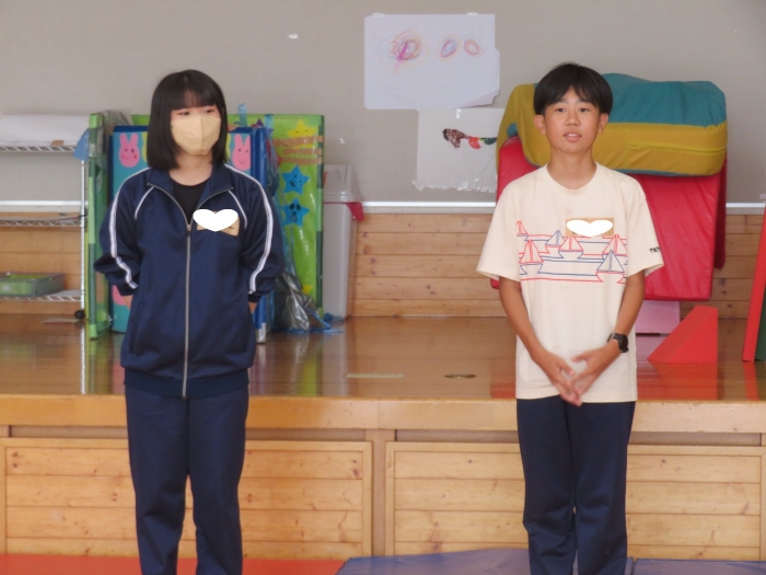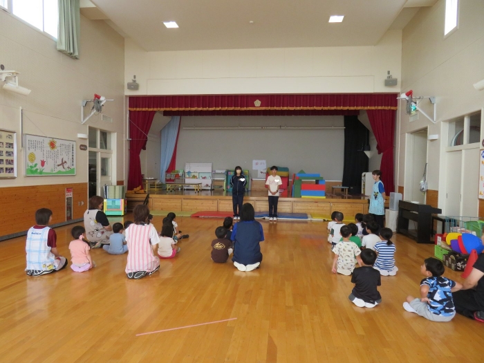 今日から2日間、上西春別中学校の2年生2名が職業体験を行っています。1名は幼稚園を卒園した生徒で、「懐かしいな~」と言いながら幼稚園時代を振り返っていました。朝の打ち合わせの時は、かなり緊張している様子でしたが、子ども達と触れ合ううちに笑顔が見られていました。2日間の体験を通して、園児や幼稚園、仕事に対する意識を高めていってほしいと思います。