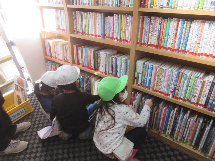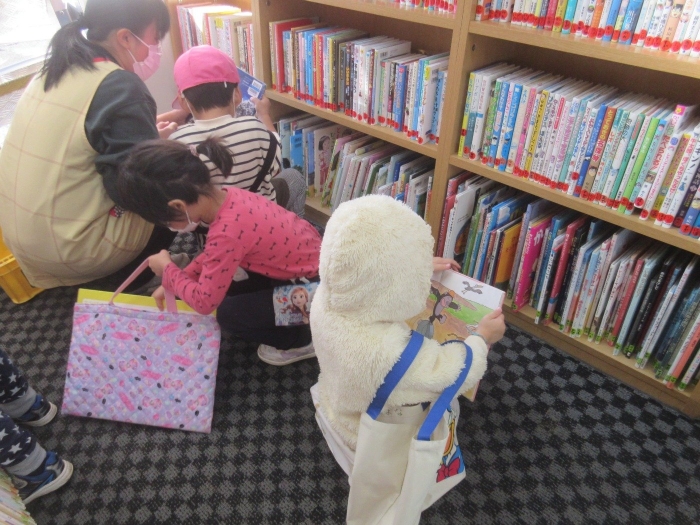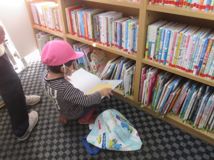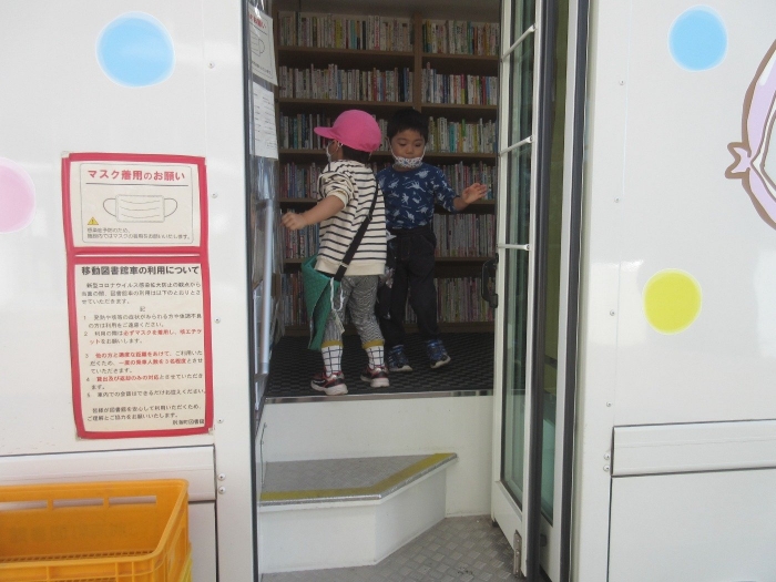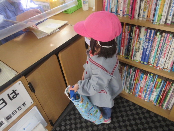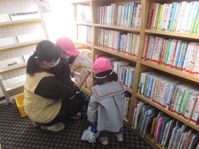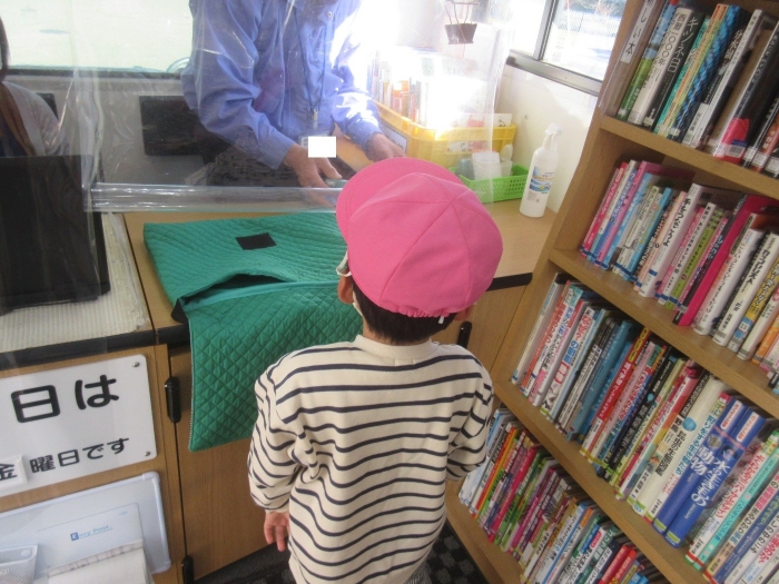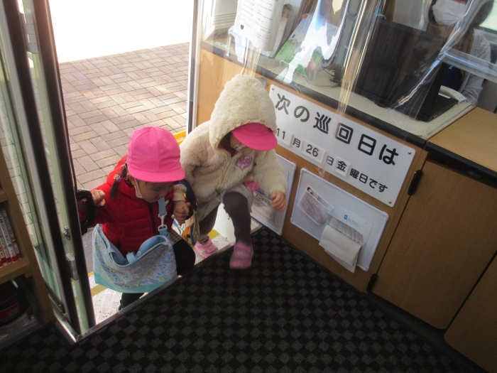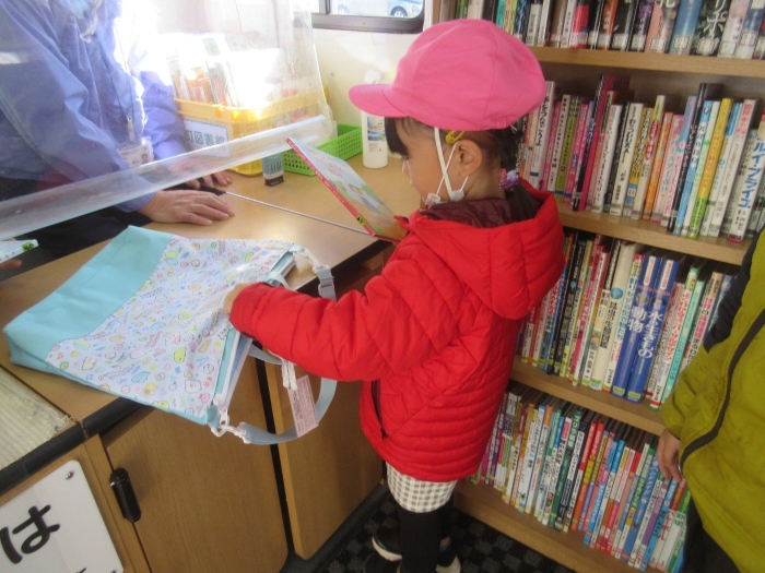 今日は、白鳥号(移動図書館バス)の日、一人2冊ずつ絵本を借りました。いちごさんも、上手に挨拶をしたり借りたりすることができるようになりましたよ。