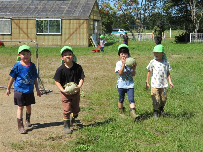 今日は、自分達で育てていた作物を大収穫!いちごさんはきゅうりとミニトマト、つくしさんは枝豆と中トマト、たけのこさんは、いんげん、とうきび、かぼちゃ、メロンを収穫。給食と一緒に少しずついただきました。