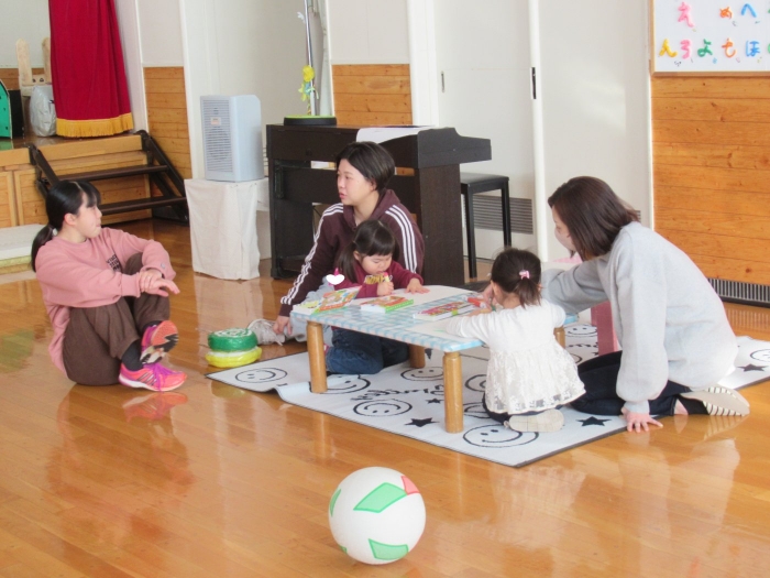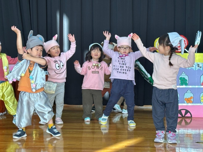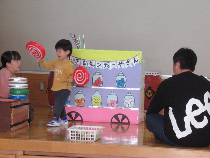 今日も昨日に引き続き、朝からステージ上ではゆめの会の様々な演目を楽しんでいました。今日は今年度最後の『にこぴんクラブ』もあり、7組の親子が来園し一緒に遊んだりステージで踊ったりして楽しみました。