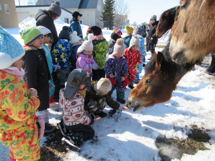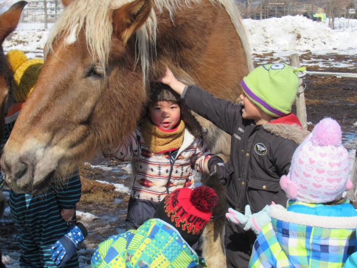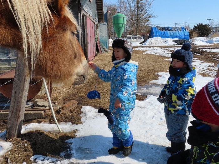 今日は、たけのこさんが卒園前に馬たちにお別れの挨拶に行くことになり、つくしさん・いちごさんも一緒に、秋に収穫した人参が数本残っていたので持参して行ってきました。久しぶりの再会で、子ども達はとても嬉しそうでした。きっと馬たちも喜んでくれたことでしょう。帰ってきた時に馬たちの様子を聞いてみると、「なんか寂しそうだった」と話していたのは、たけのこさん。帰り際に「ヒヒ~ン」と鳴いていたそうです。大好きな馬とのお別れ、少し寂しかったようです。