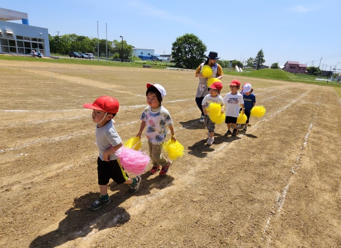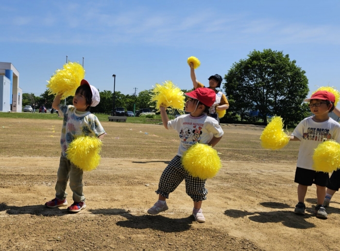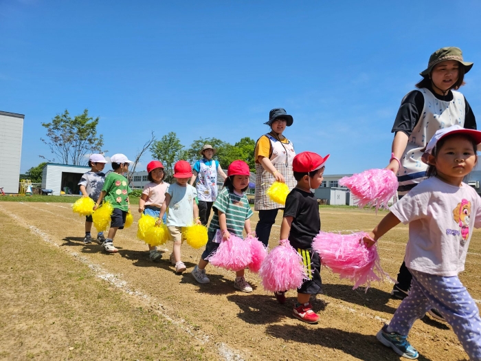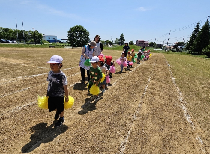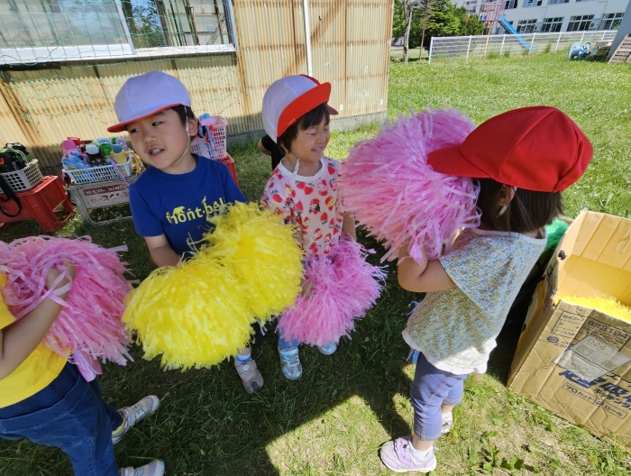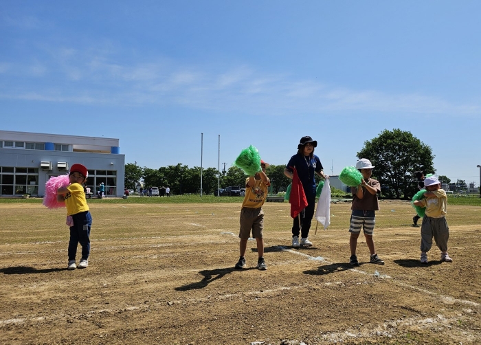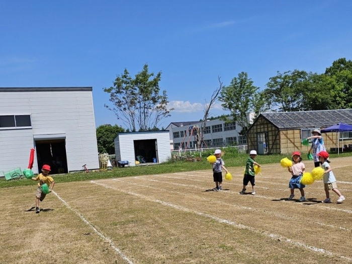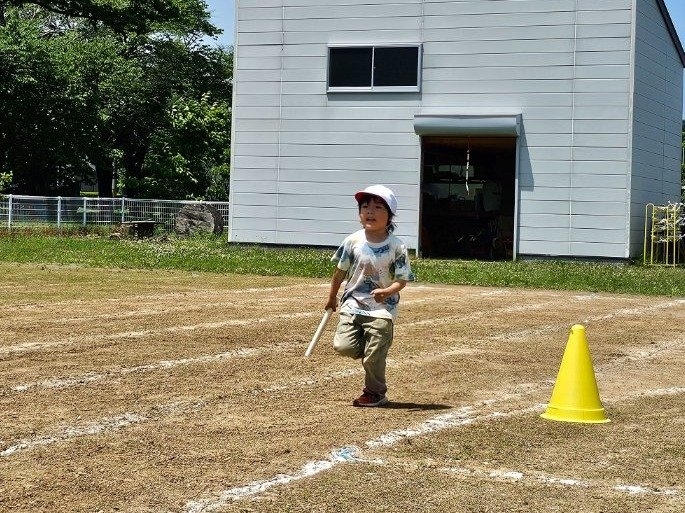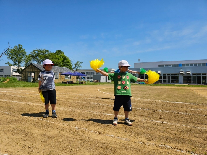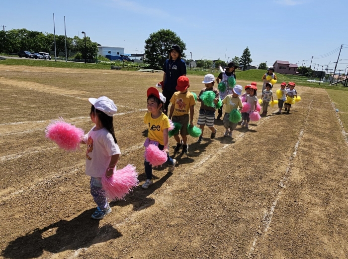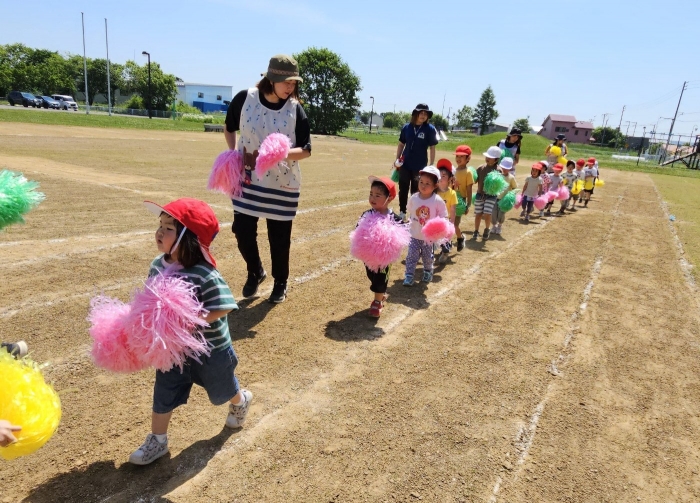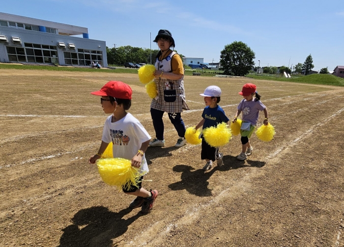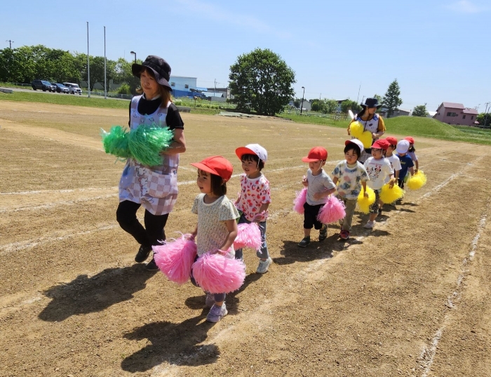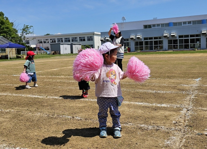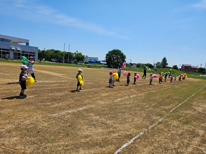 子ども達の方も、張り切って運動会練習へ!  今日は、ポンポンを持って初めてグラウンドで遊戯を踊ったり、用具が出揃った障害物競走(今年は野菜の苗・野菜を運搬)を一通り行ったり、つくし・たけのこ組はパラバルーンやリレーをしました。競技も応援も全力投球の子ども達でした。