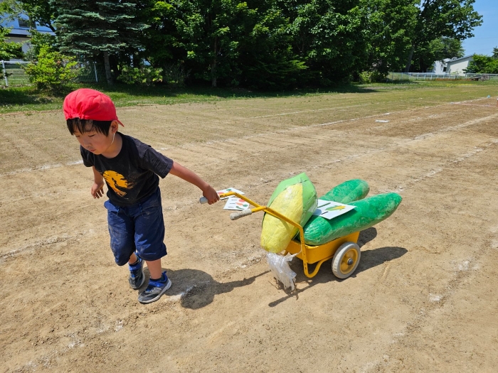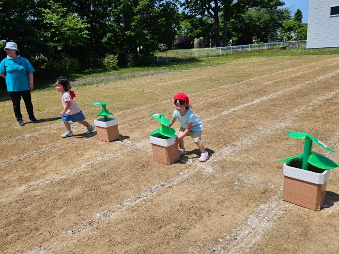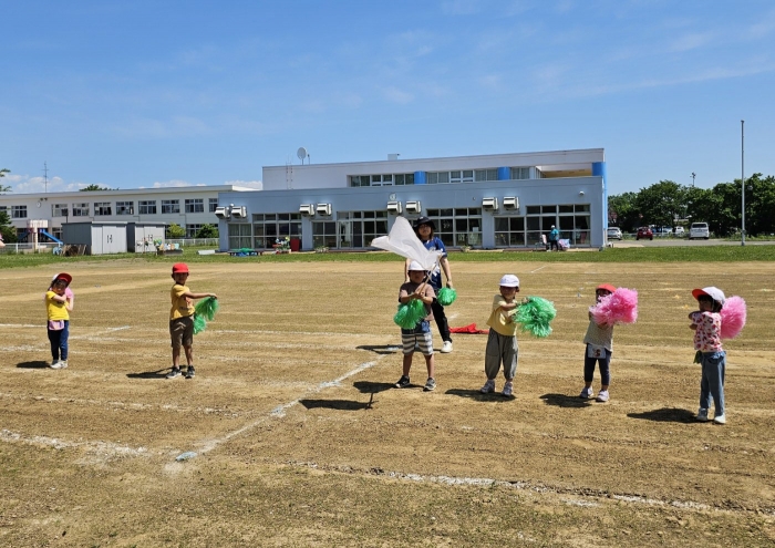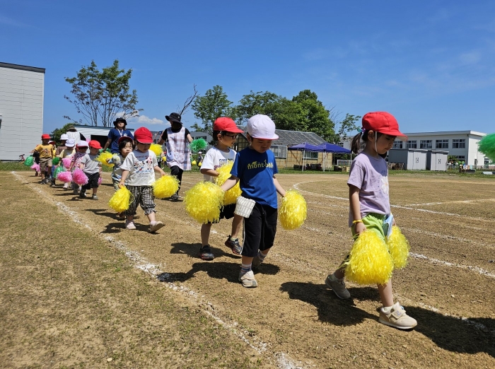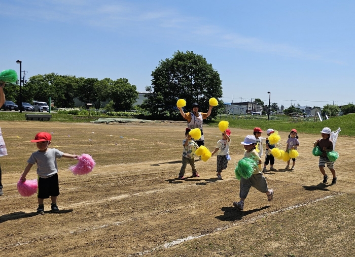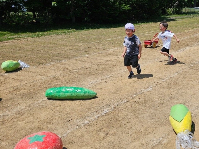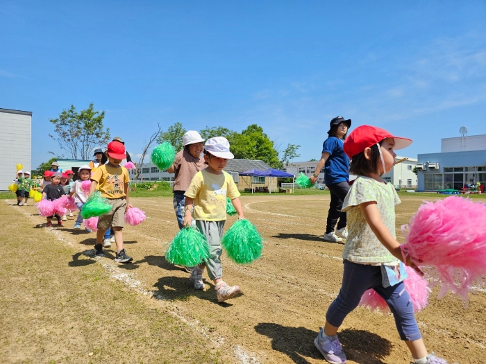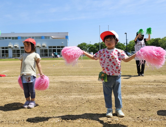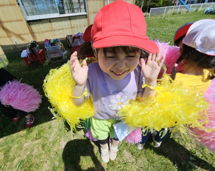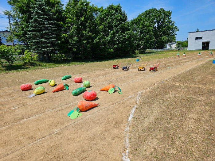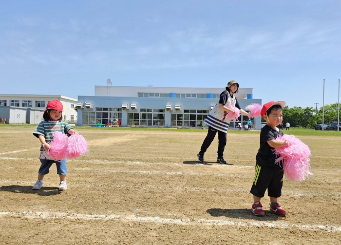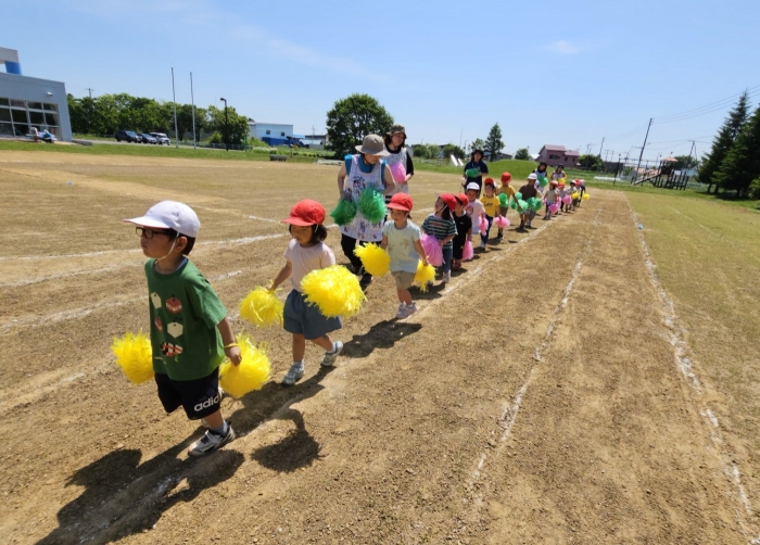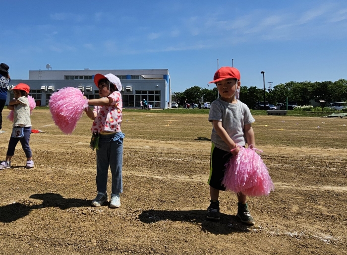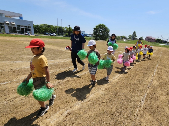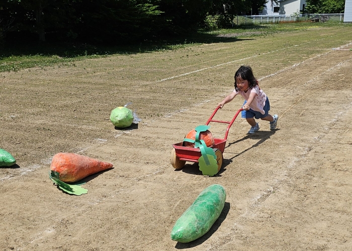 子ども達の方も、張り切って運動会練習へ!  今日は、ポンポンを持って初めてグラウンドで遊戯を踊ったり、用具が出揃った障害物競走(今年は野菜の苗・野菜を運搬)を一通り行ったり、つくし・たけのこ組はパラバルーンやリレーをしました。競技も応援も全力投球の子ども達でした。