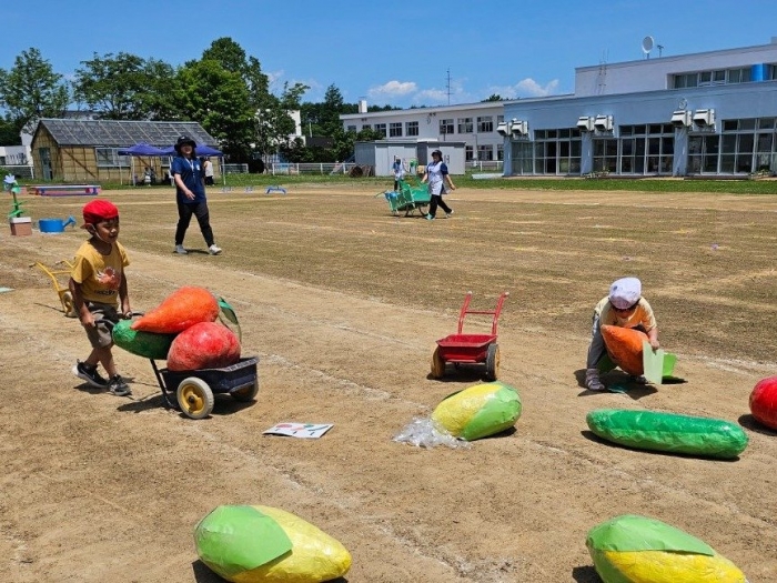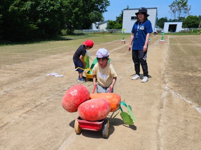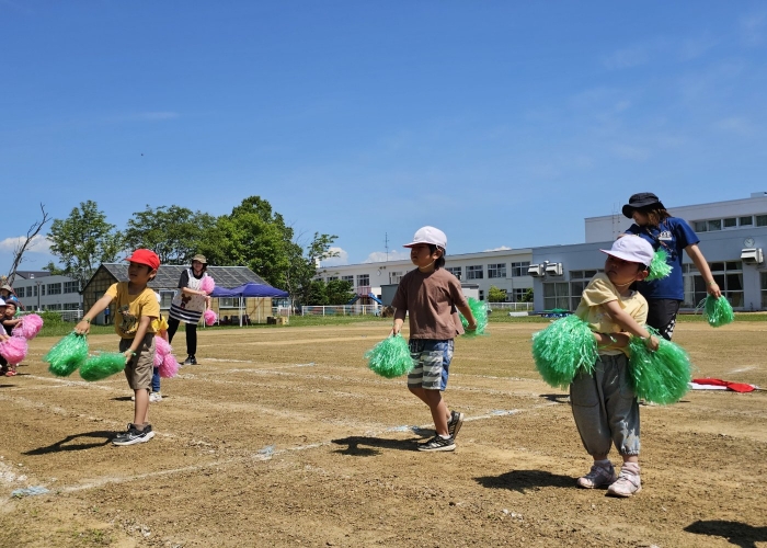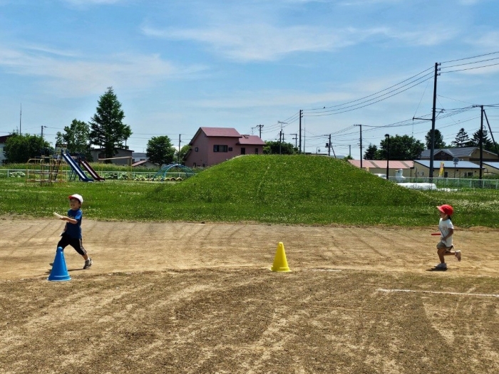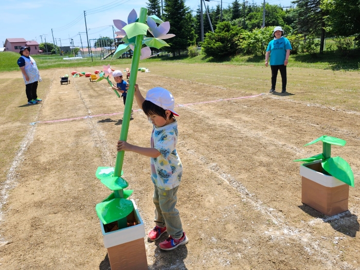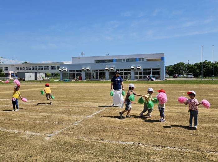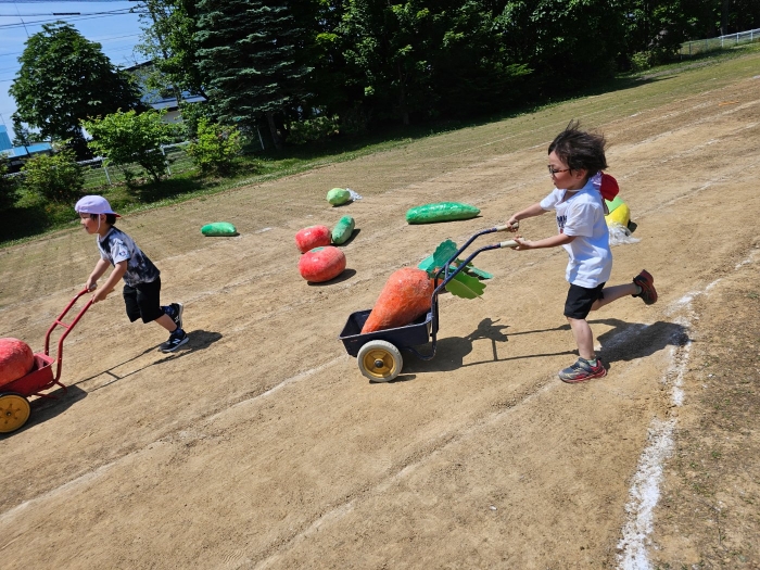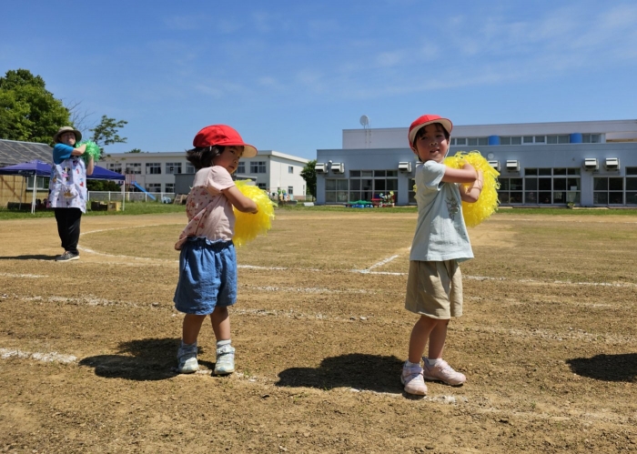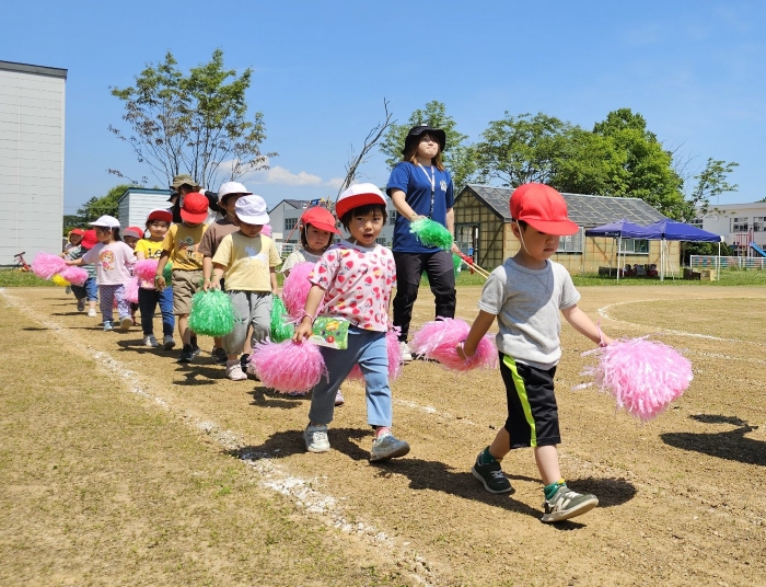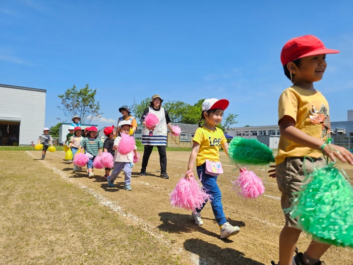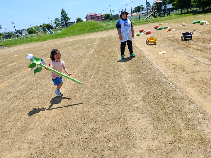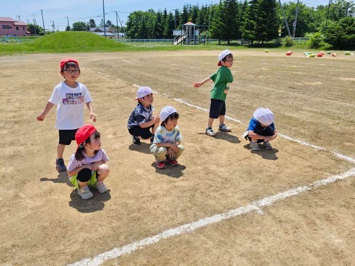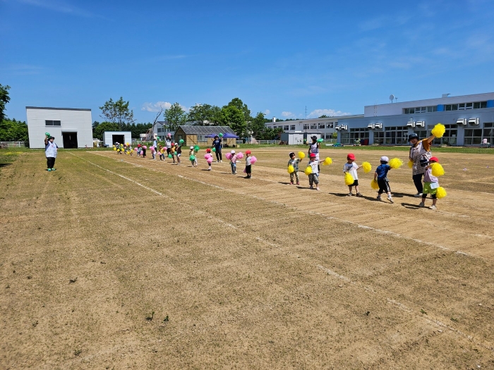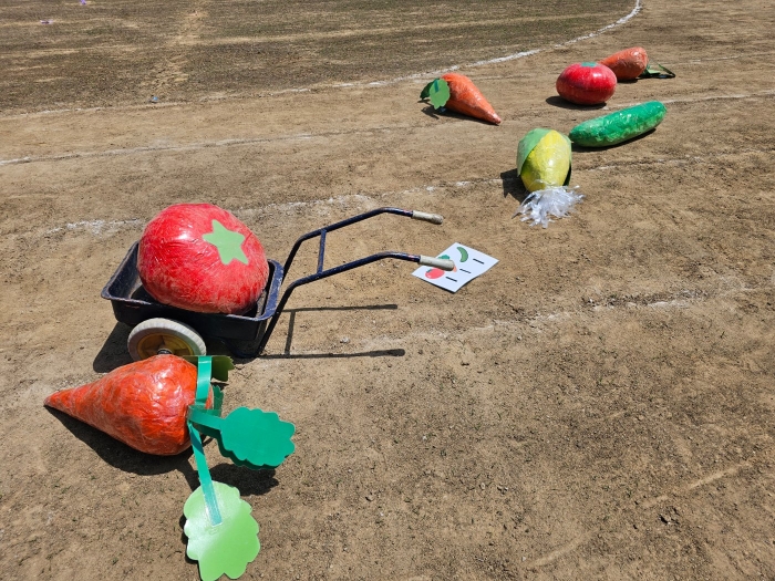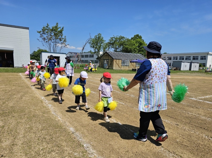 子ども達の方も、張り切って運動会練習へ!  今日は、ポンポンを持って初めてグラウンドで遊戯を踊ったり、用具が出揃った障害物競走(今年は野菜の苗・野菜を運搬)を一通り行ったり、つくし・たけのこ組はパラバルーンやリレーをしました。競技も応援も全力投球の子ども達でした。