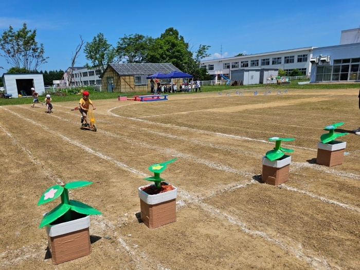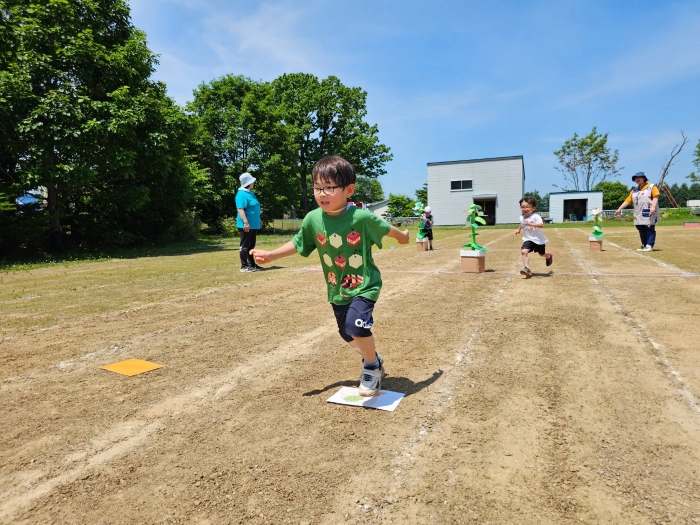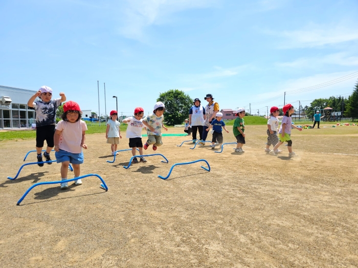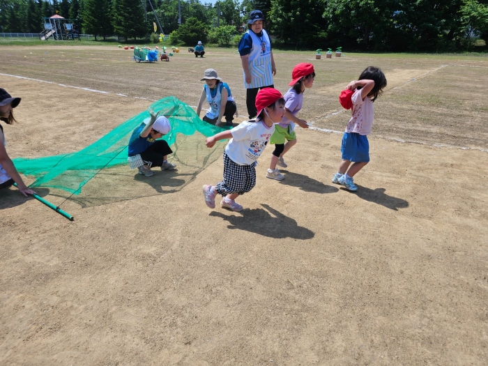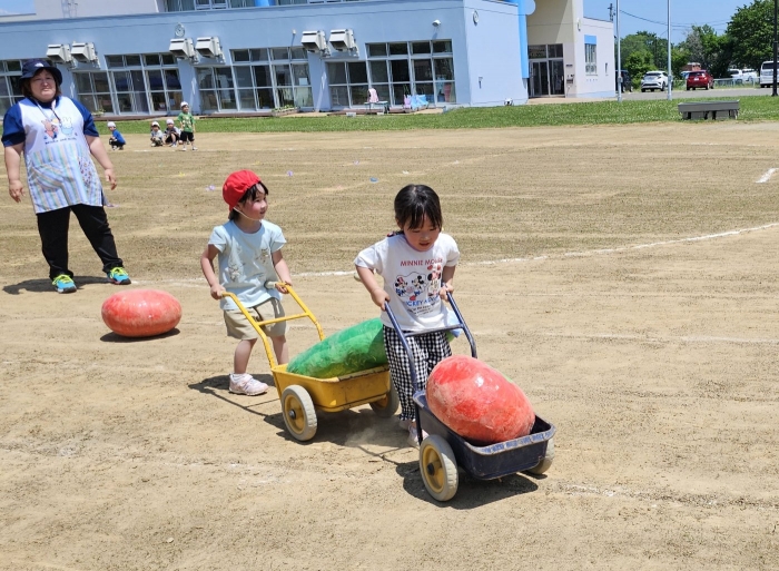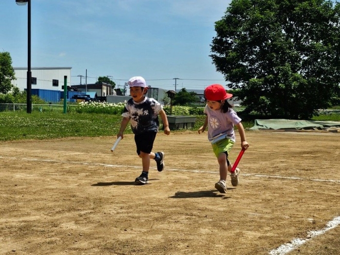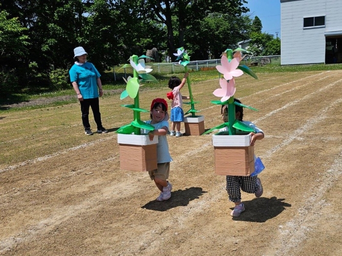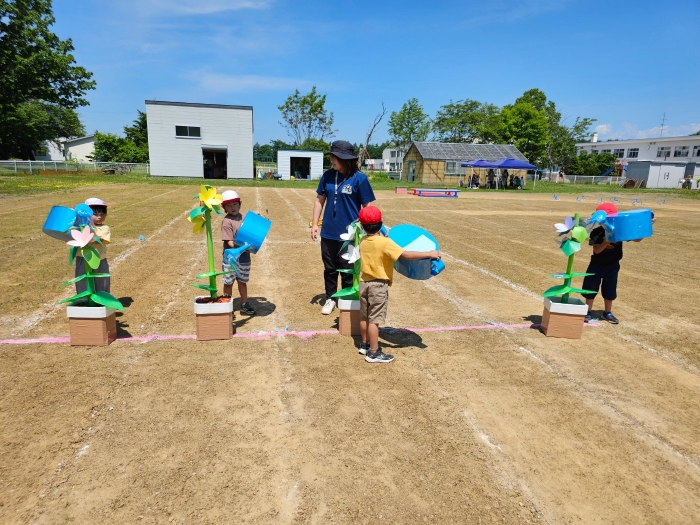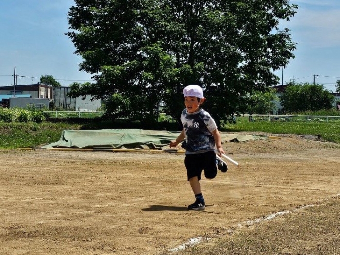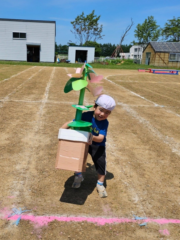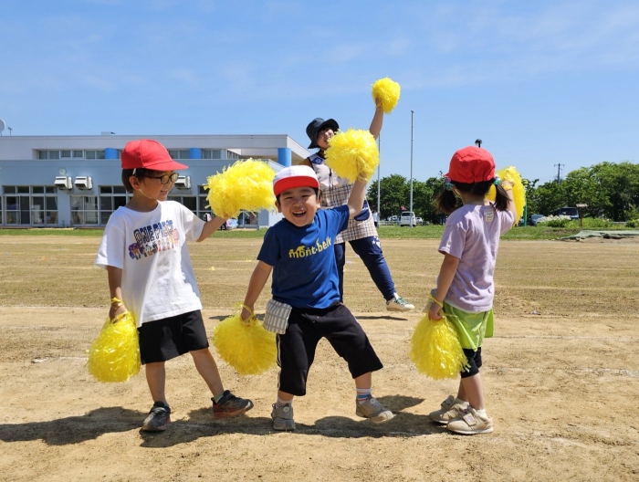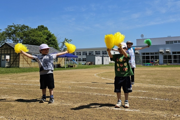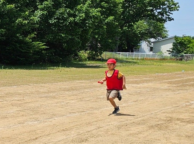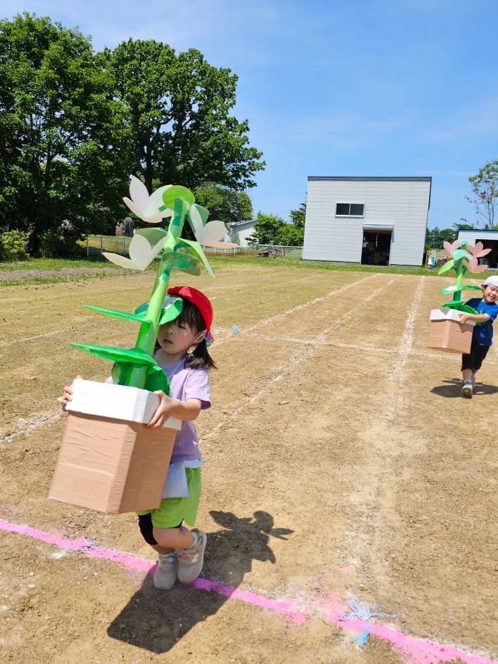 子ども達の方も、張り切って運動会練習へ!  今日は、ポンポンを持って初めてグラウンドで遊戯を踊ったり、用具が出揃った障害物競走(今年は野菜の苗・野菜を運搬)を一通り行ったり、つくし・たけのこ組はパラバルーンやリレーをしました。競技も応援も全力投球の子ども達でした。