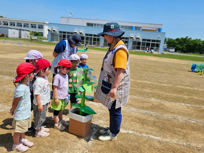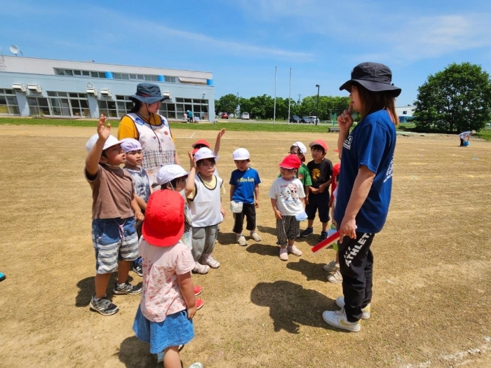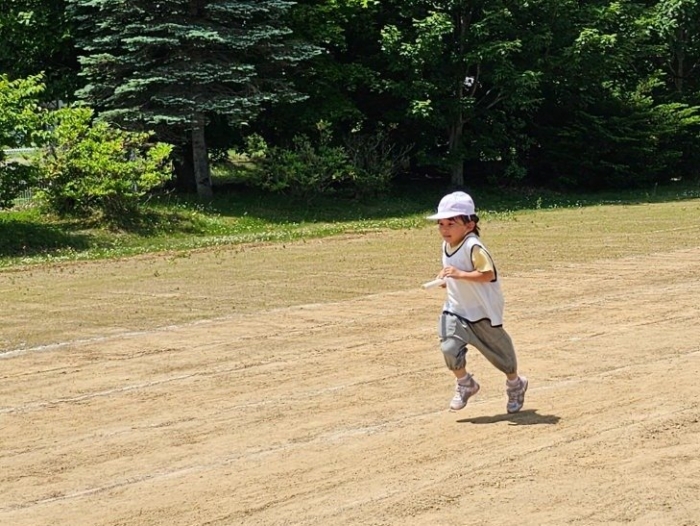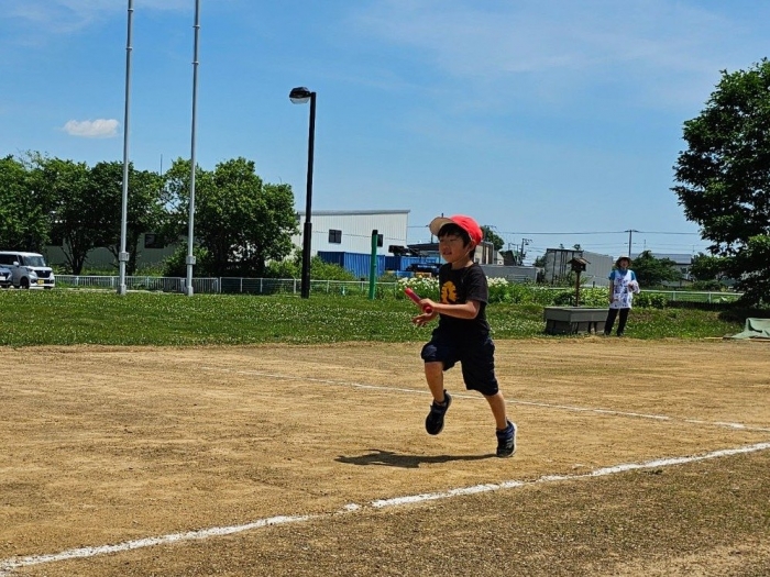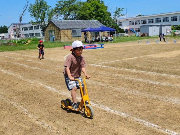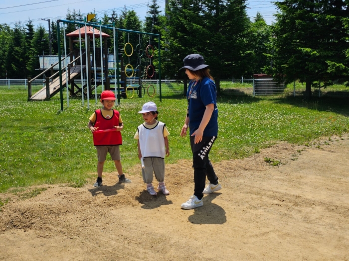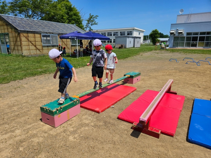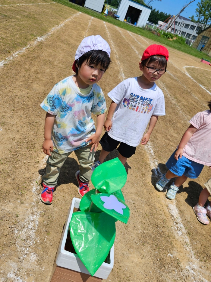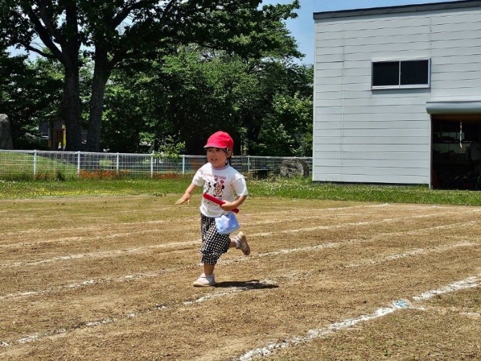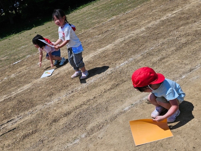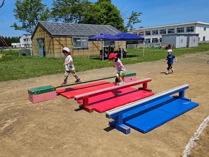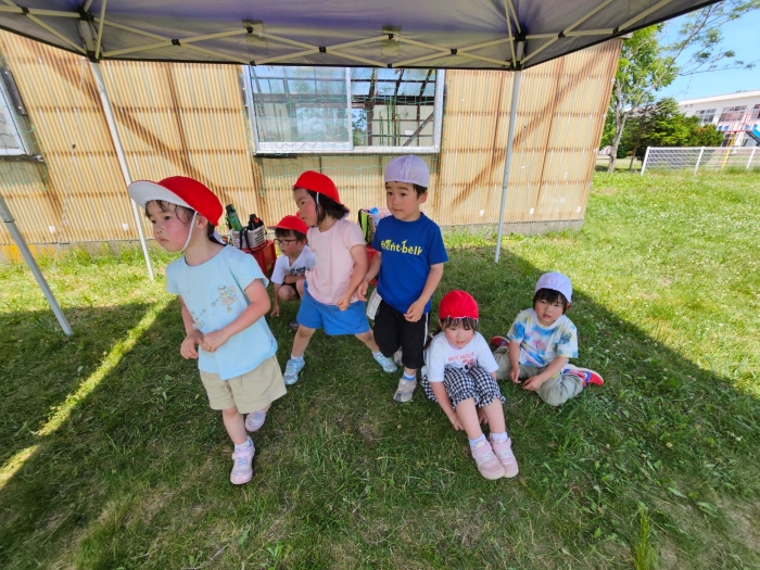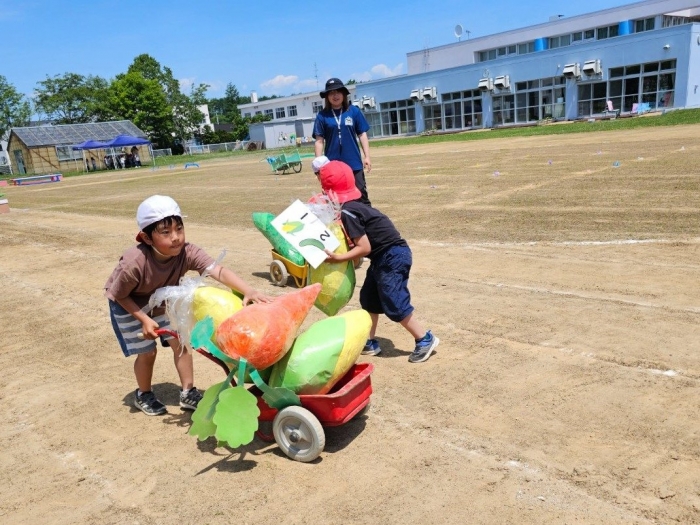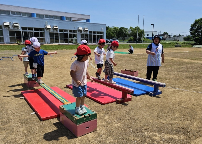 子ども達の方も、張り切って運動会練習へ!  今日は、ポンポンを持って初めてグラウンドで遊戯を踊ったり、用具が出揃った障害物競走(今年は野菜の苗・野菜を運搬)を一通り行ったり、つくし・たけのこ組はパラバルーンやリレーをしました。競技も応援も全力投球の子ども達でした。