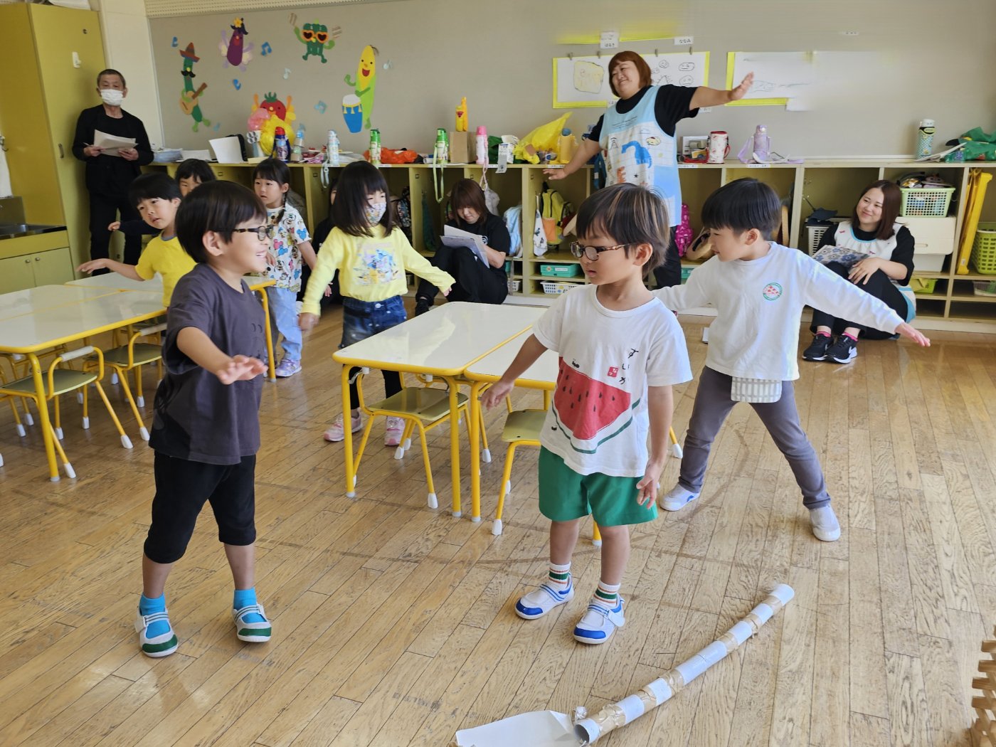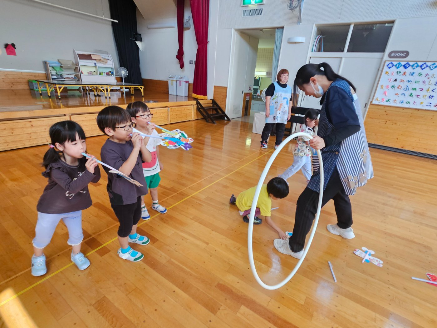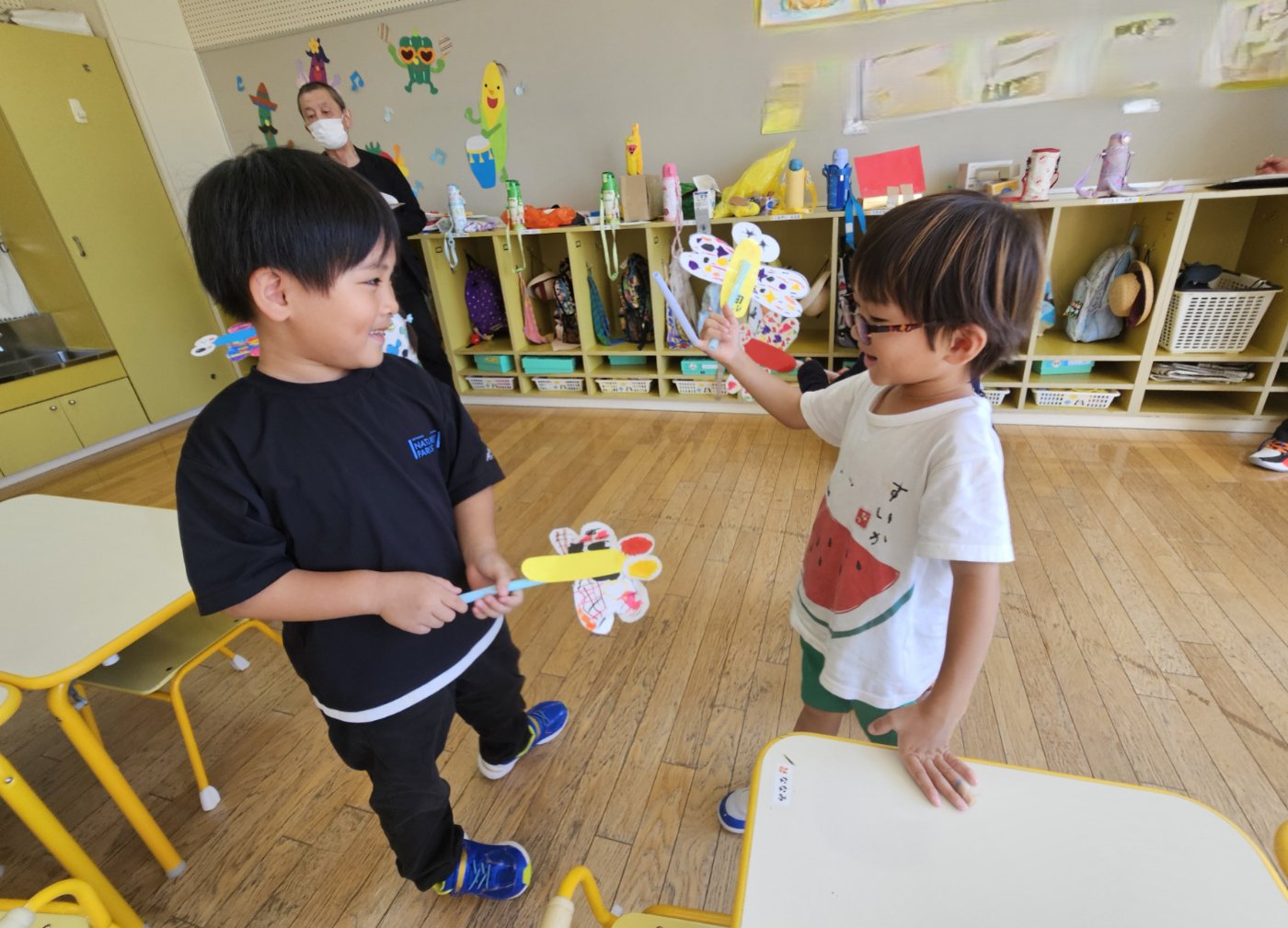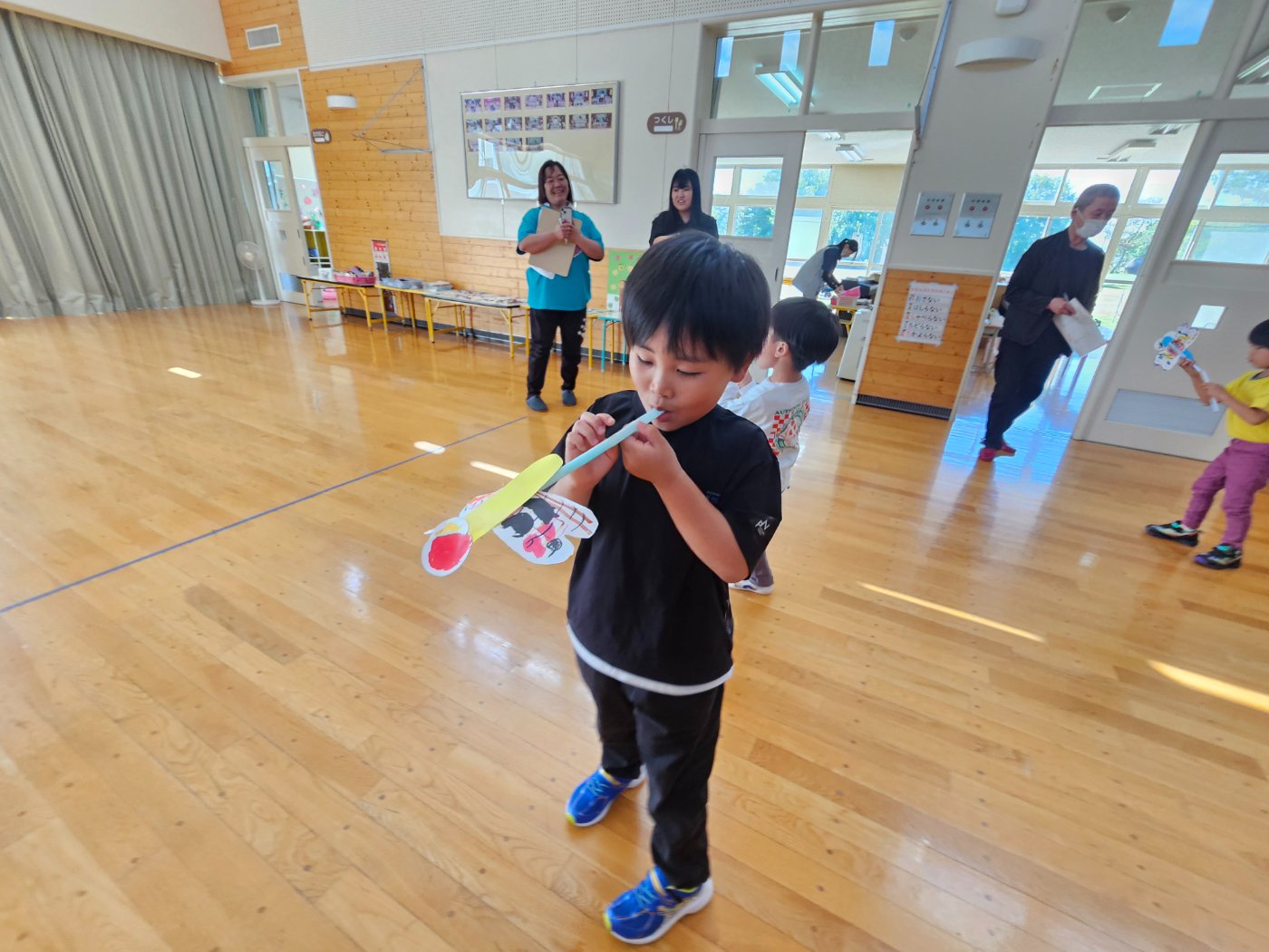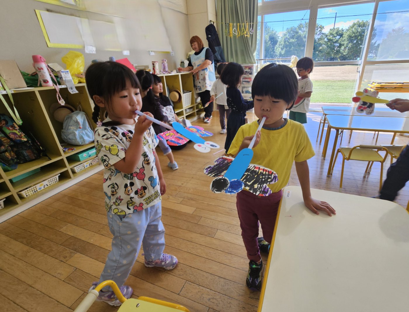 4週間の教育実習のまとめとして、今日一日、実習生のM先生が一日つくし組担任となりました。そのことを前日の帰りの会で伝えられた つくし組、ワクワクしながら今日の日を迎えていました。クラス時間では、前に立つM先生の話にしっかりと耳を傾け、普段通り元気いっぱい朝の会!『ストローとんぼ』という新たな製作を教えてもらいました。トンボの羽に好きな模様や表情豊かな目玉を描いたり、友達と見せ合ったりしながら和気あいあいと取組んでいました。ストローを取り付け、吹き矢のように息を吹きかけると、ビューンと飛んでいくトンボに大興奮⤴  フラフープの輪の中やステージの上から飛ばしたり、ストローの差し込み具合や拭き加減を調整したりなど、いかに遠くに飛ばすかを友達と一緒に考えながら楽しんでいました。