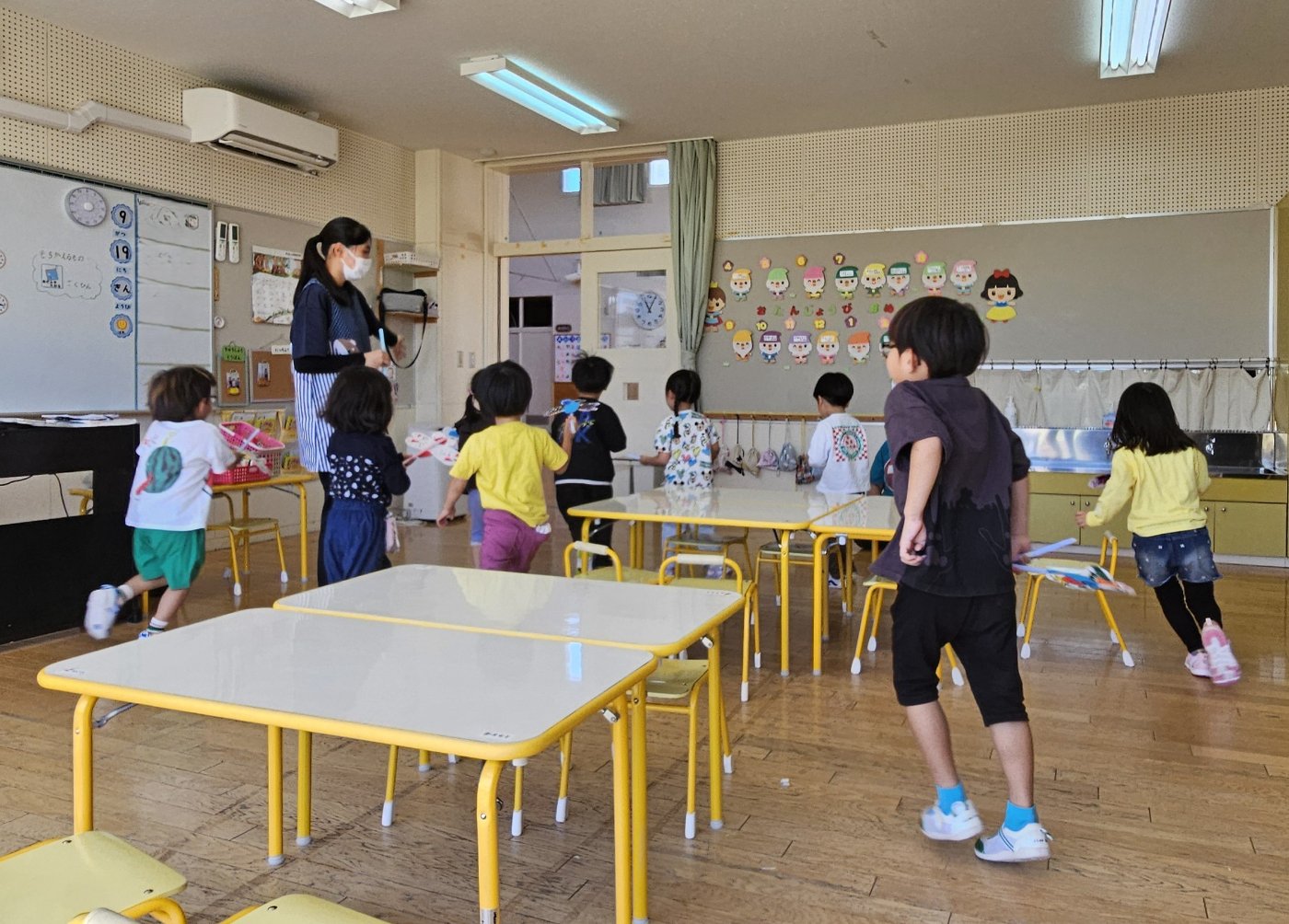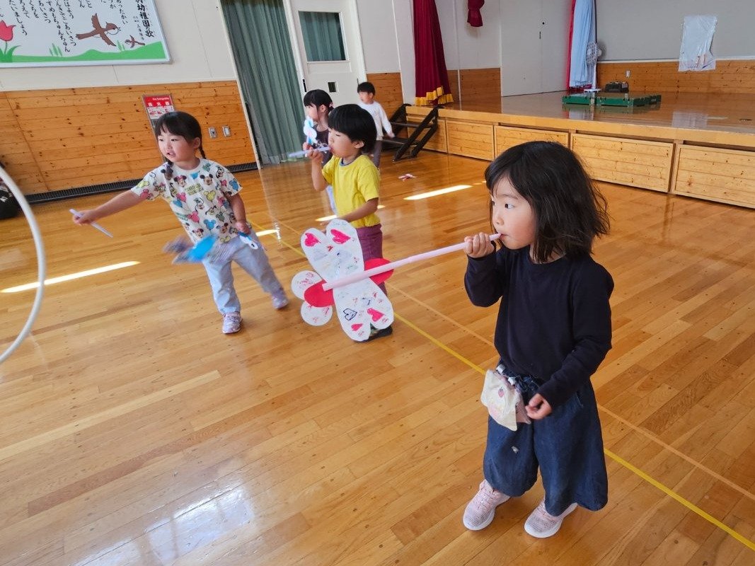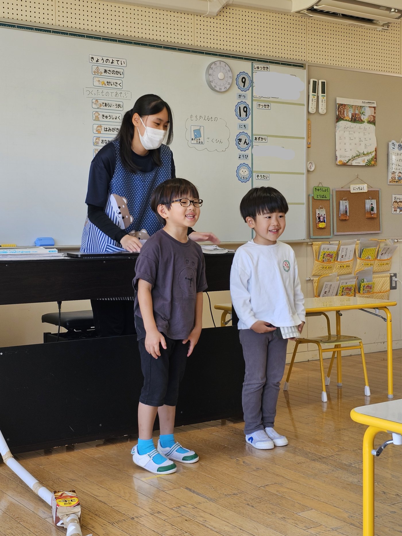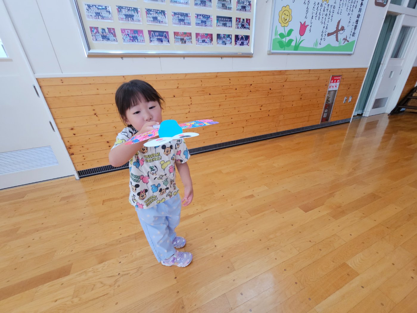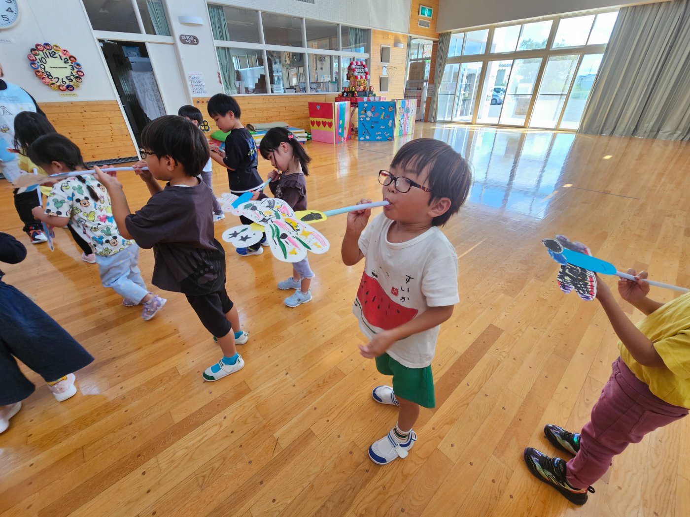 4週間の教育実習のまとめとして、今日一日、実習生のM先生が一日つくし組担任となりました。そのことを前日の帰りの会で伝えられた つくし組、ワクワクしながら今日の日を迎えていました。クラス時間では、前に立つM先生の話にしっかりと耳を傾け、普段通り元気いっぱい朝の会!『ストローとんぼ』という新たな製作を教えてもらいました。トンボの羽に好きな模様や表情豊かな目玉を描いたり、友達と見せ合ったりしながら和気あいあいと取組んでいました。ストローを取り付け、吹き矢のように息を吹きかけると、ビューンと飛んでいくトンボに大興奮⤴  フラフープの輪の中やステージの上から飛ばしたり、ストローの差し込み具合や拭き加減を調整したりなど、いかに遠くに飛ばすかを友達と一緒に考えながら楽しんでいました。