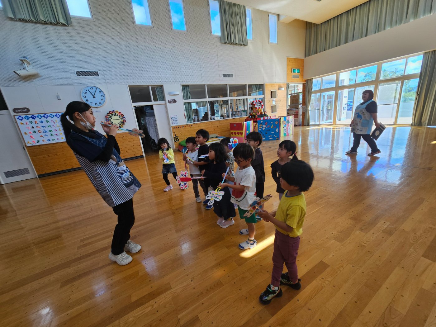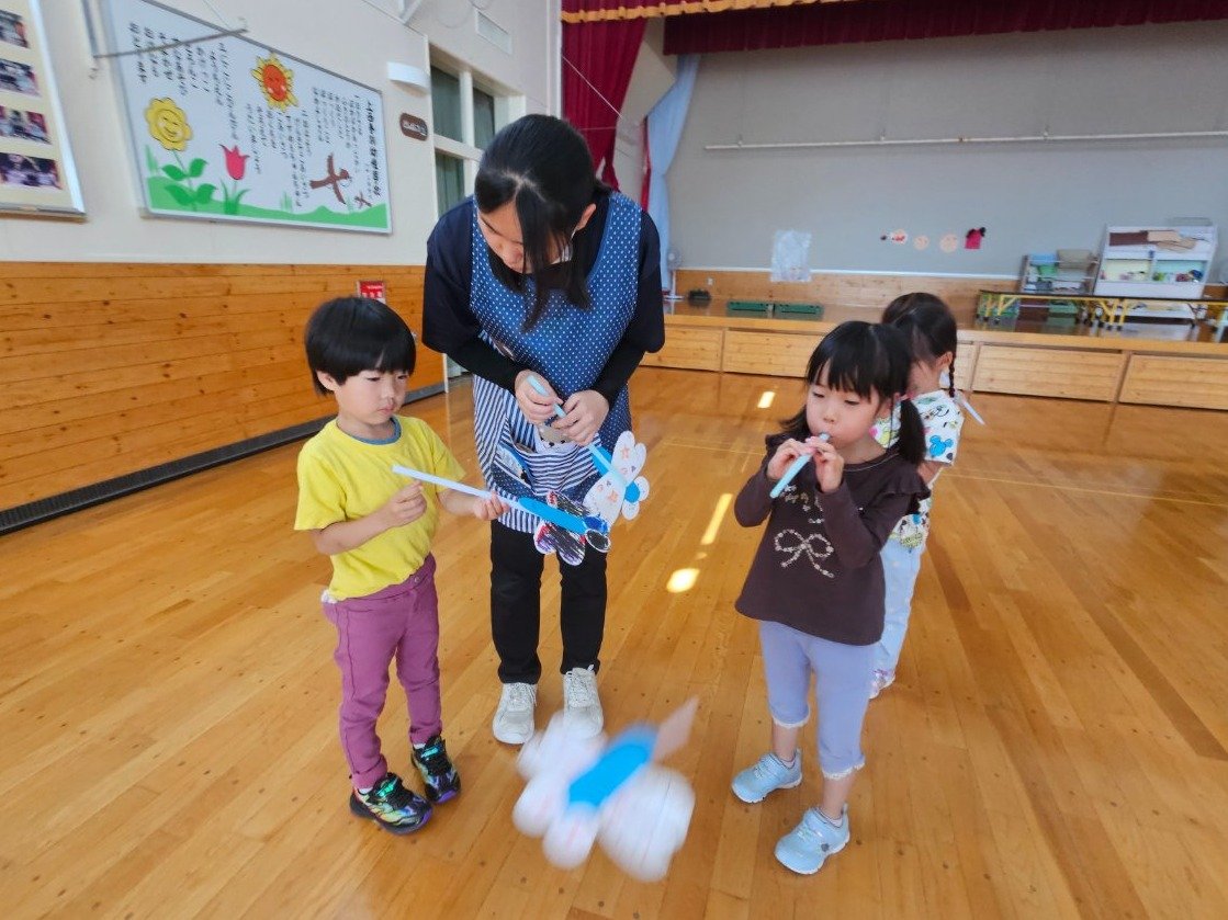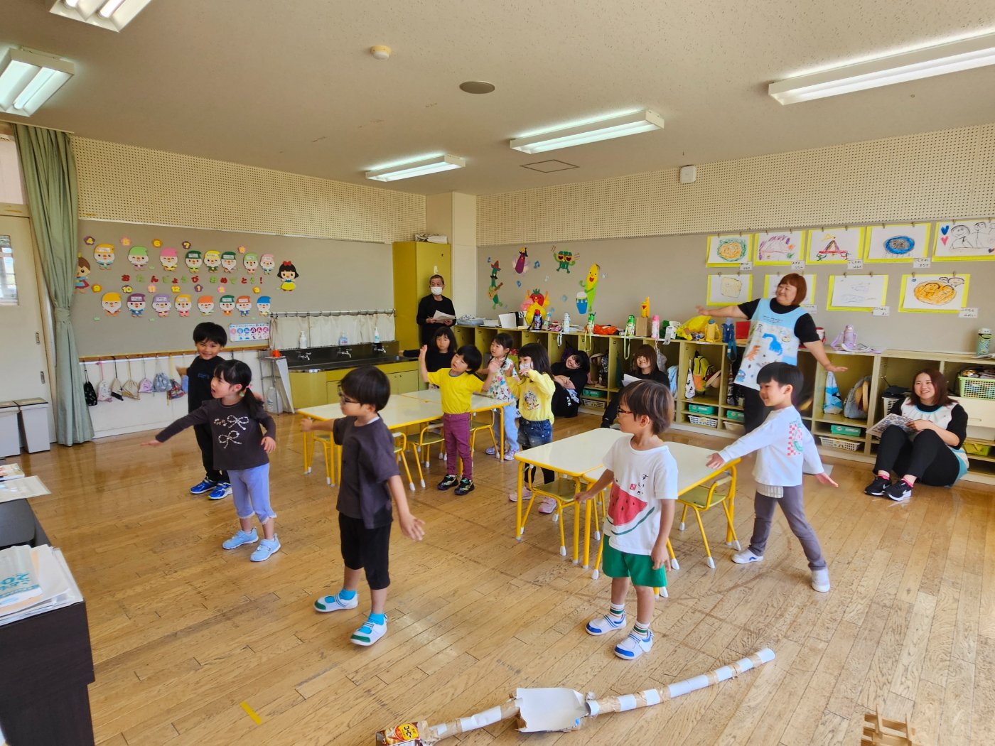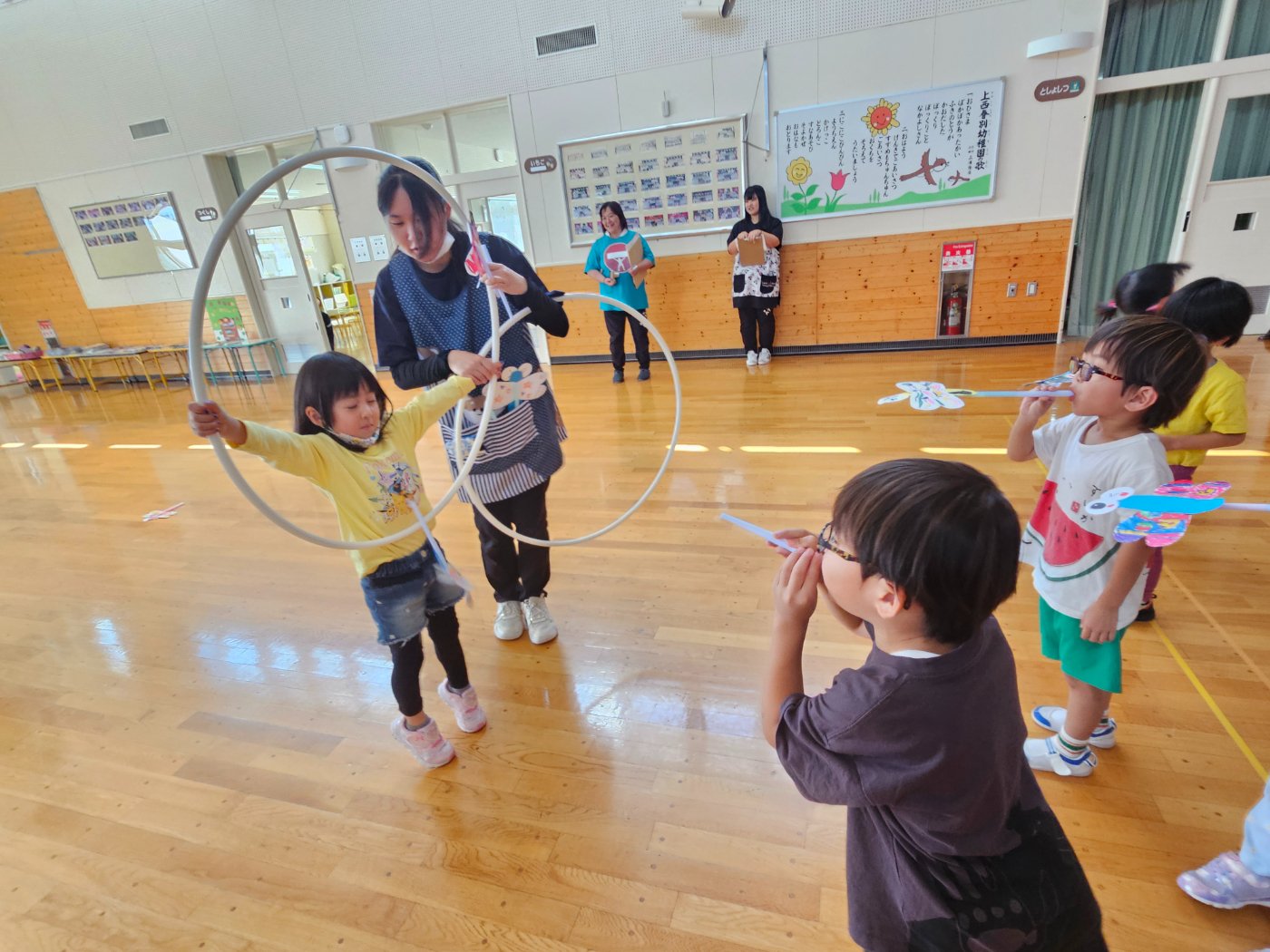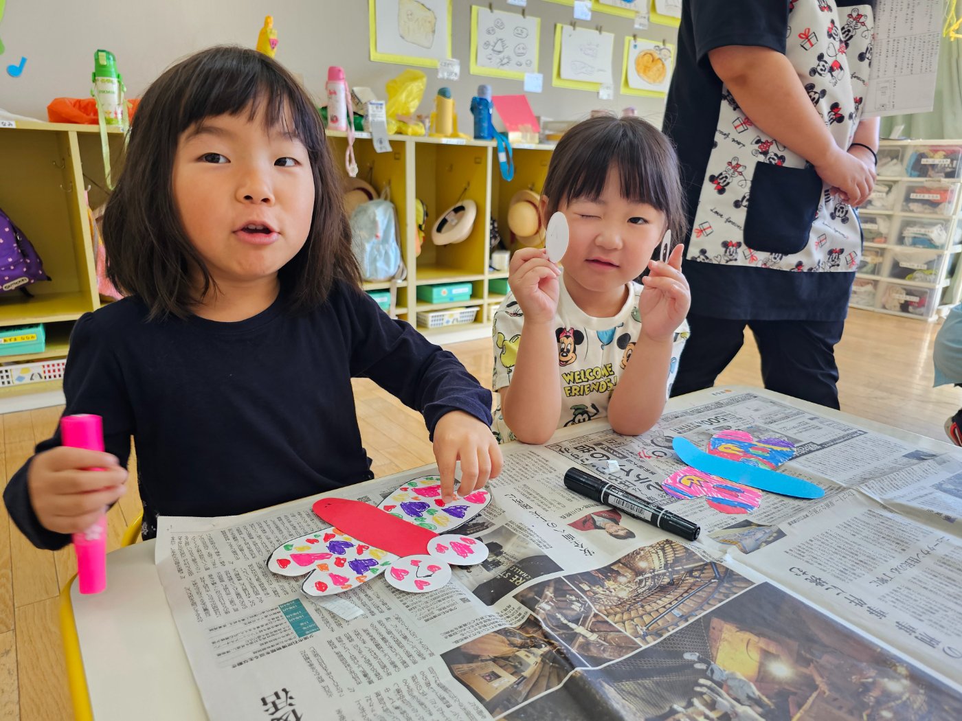 4週間の教育実習のまとめとして、今日一日、実習生のM先生が一日つくし組担任となりました。そのことを前日の帰りの会で伝えられた つくし組、ワクワクしながら今日の日を迎えていました。クラス時間では、前に立つM先生の話にしっかりと耳を傾け、普段通り元気いっぱい朝の会!『ストローとんぼ』という新たな製作を教えてもらいました。トンボの羽に好きな模様や表情豊かな目玉を描いたり、友達と見せ合ったりしながら和気あいあいと取組んでいました。ストローを取り付け、吹き矢のように息を吹きかけると、ビューンと飛んでいくトンボに大興奮⤴  フラフープの輪の中やステージの上から飛ばしたり、ストローの差し込み具合や拭き加減を調整したりなど、いかに遠くに飛ばすかを友達と一緒に考えながら楽しんでいました。