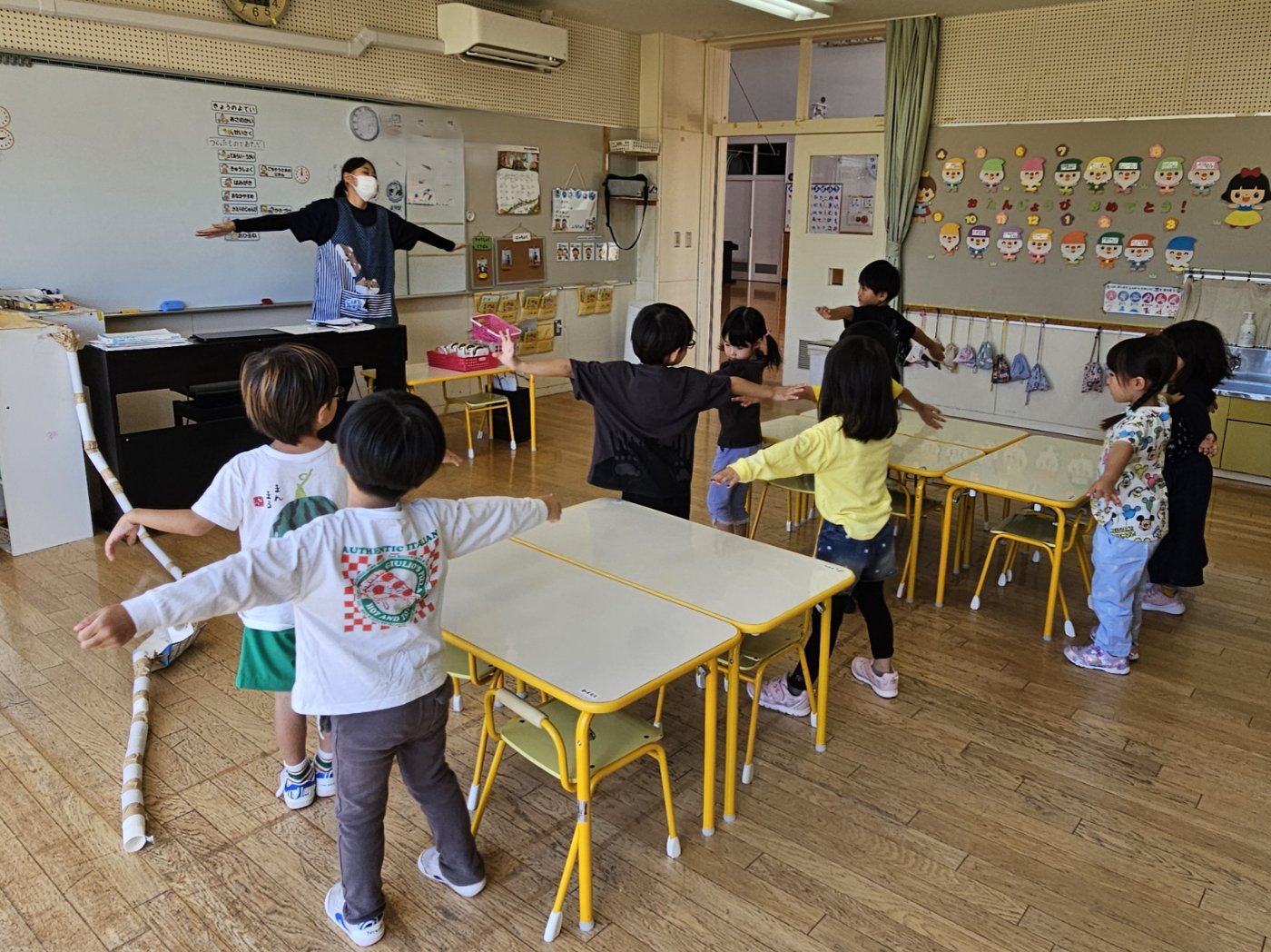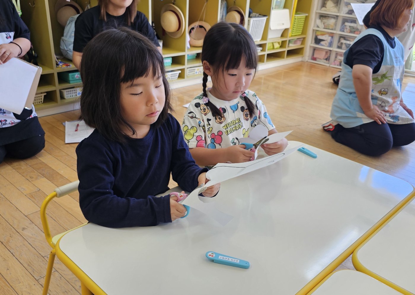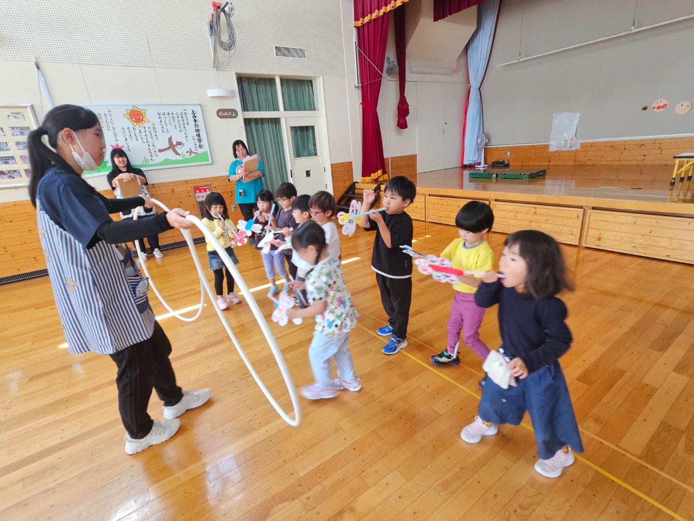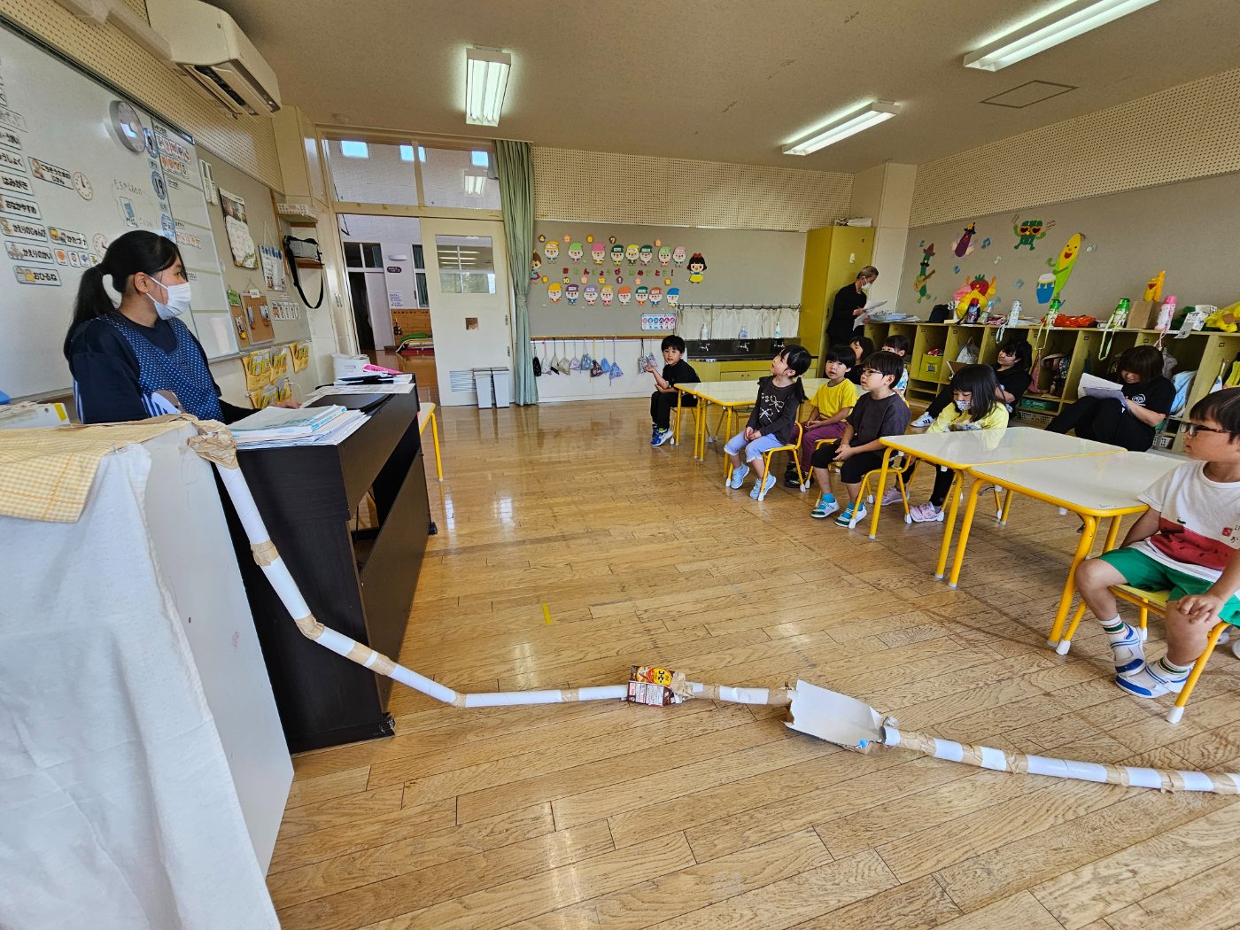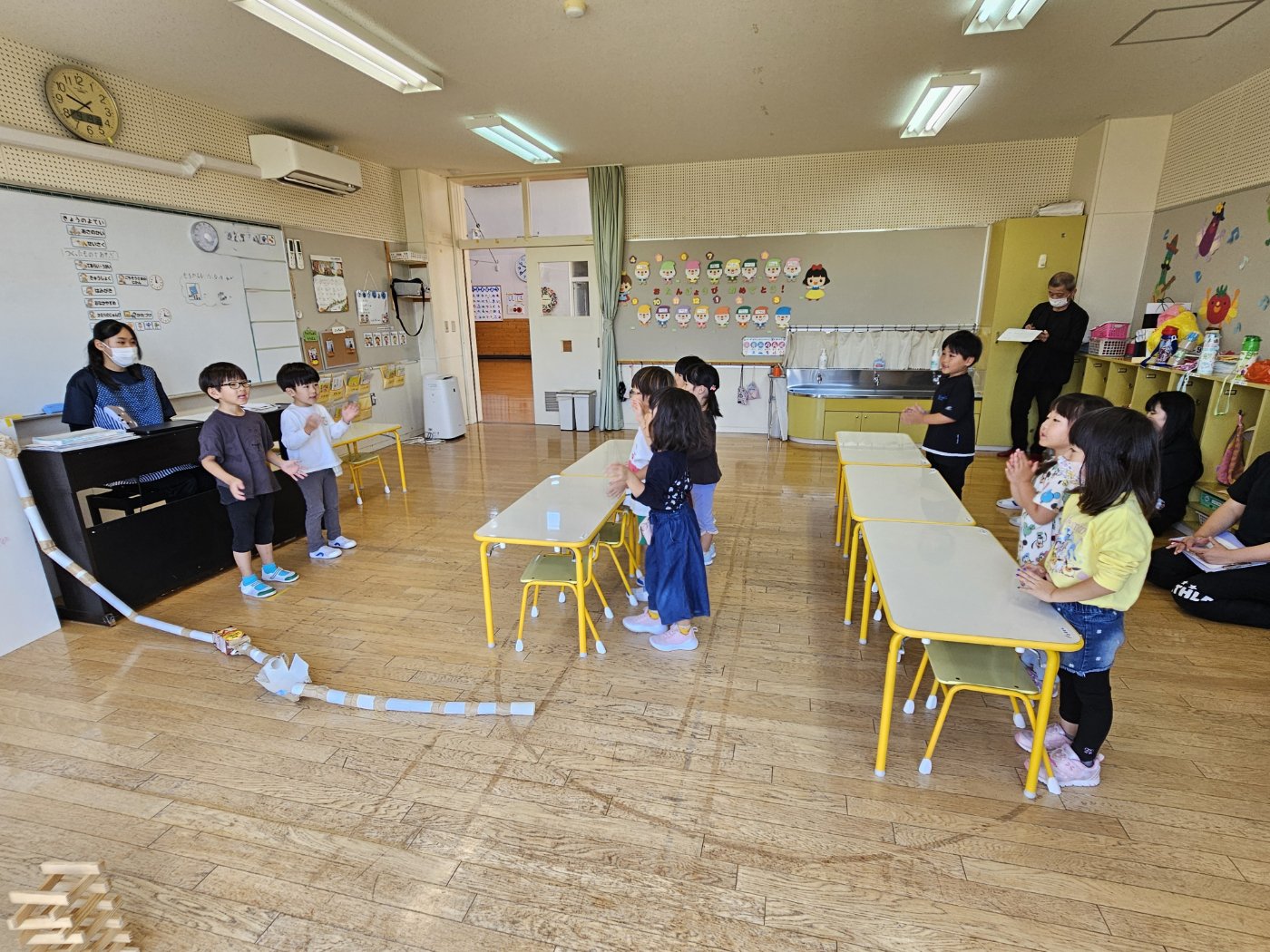4週間の教育実習のまとめとして、今日一日、実習生のM先生が一日つくし組担任となりました。そのことを前日の帰りの会で伝えられた つくし組、ワクワクしながら今日の日を迎えていました。クラス時間では、前に立つM先生の話にしっかりと耳を傾け、普段通り元気いっぱい朝の会!『ストローとんぼ』という新たな製作を教えてもらいました。トンボの羽に好きな模様や表情豊かな目玉を描いたり、友達と見せ合ったりしながら和気あいあいと取組んでいました。ストローを取り付け、吹き矢のように息を吹きかけると、ビューンと飛んでいくトンボに大興奮⤴  フラフープの輪の中やステージの上から飛ばしたり、ストローの差し込み具合や拭き加減を調整したりなど、いかに遠くに飛ばすかを友達と一緒に考えながら楽しんでいました。