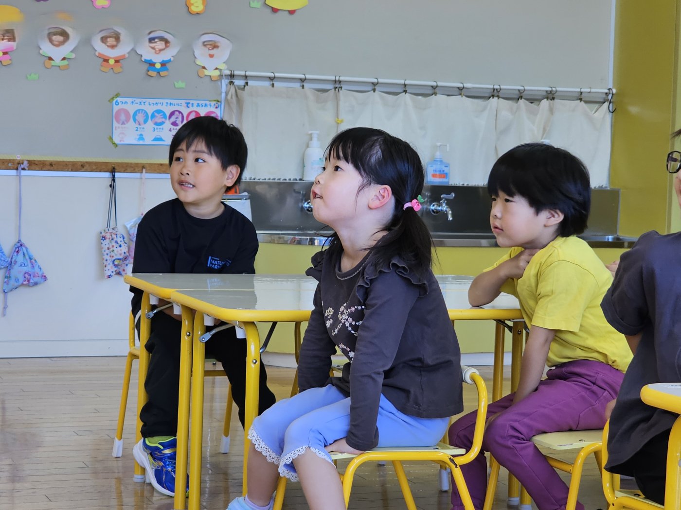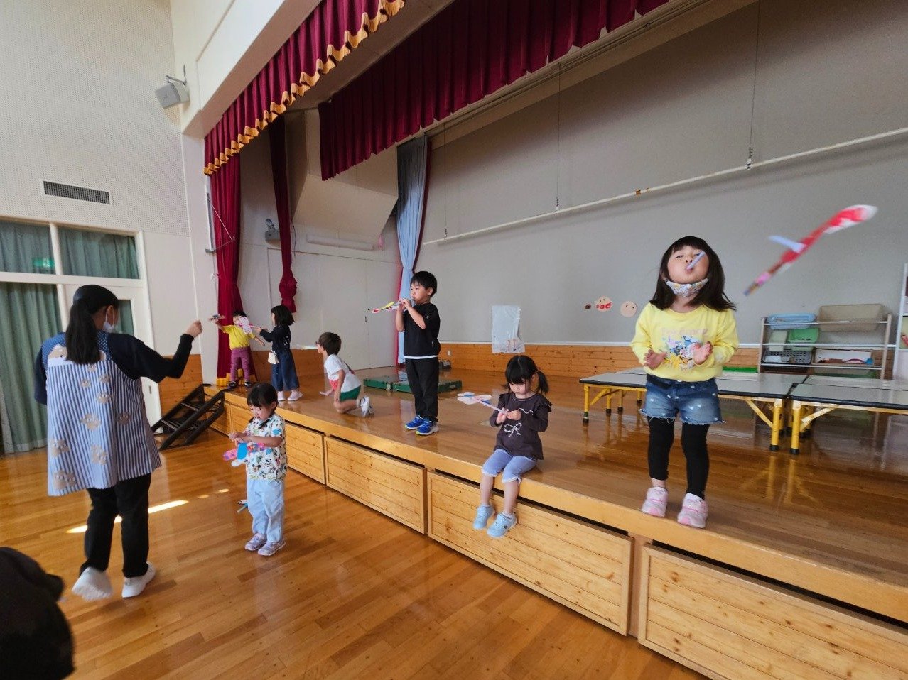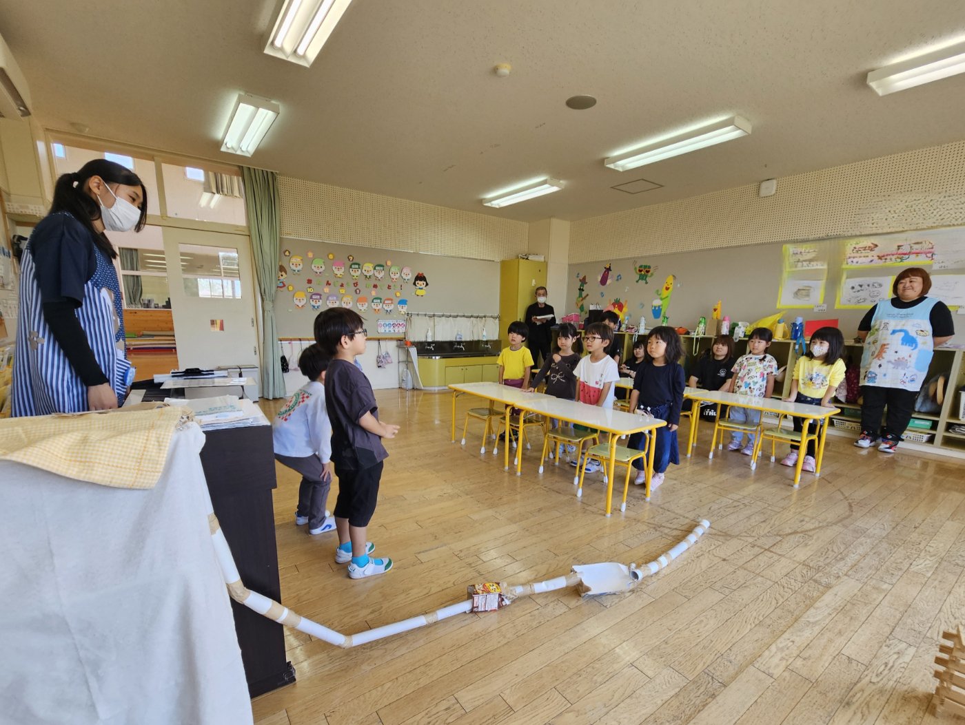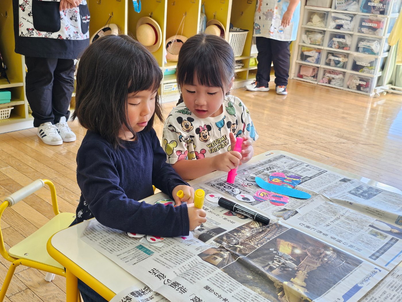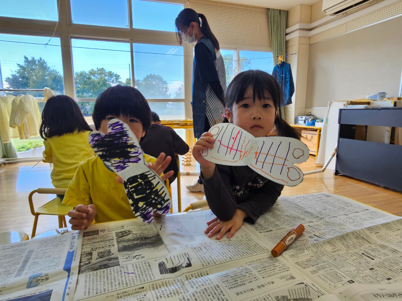 4週間の教育実習のまとめとして、今日一日、実習生のM先生が一日つくし組担任となりました。そのことを前日の帰りの会で伝えられた つくし組、ワクワクしながら今日の日を迎えていました。クラス時間では、前に立つM先生の話にしっかりと耳を傾け、普段通り元気いっぱい朝の会!『ストローとんぼ』という新たな製作を教えてもらいました。トンボの羽に好きな模様や表情豊かな目玉を描いたり、友達と見せ合ったりしながら和気あいあいと取組んでいました。ストローを取り付け、吹き矢のように息を吹きかけると、ビューンと飛んでいくトンボに大興奮⤴  フラフープの輪の中やステージの上から飛ばしたり、ストローの差し込み具合や拭き加減を調整したりなど、いかに遠くに飛ばすかを友達と一緒に考えながら楽しんでいました。