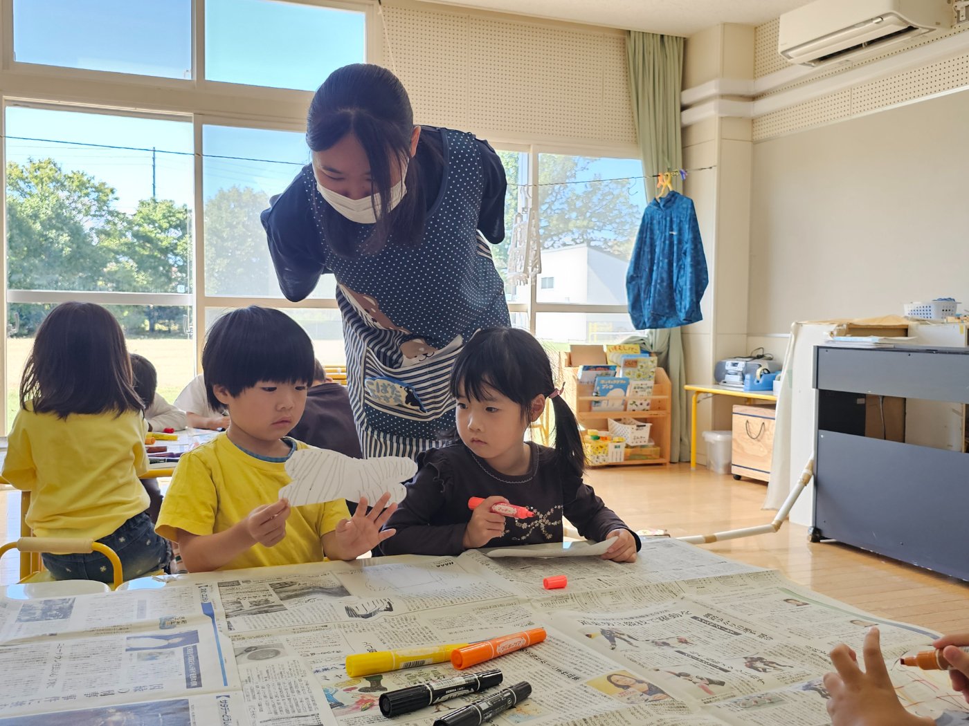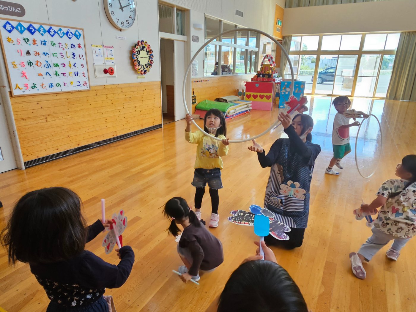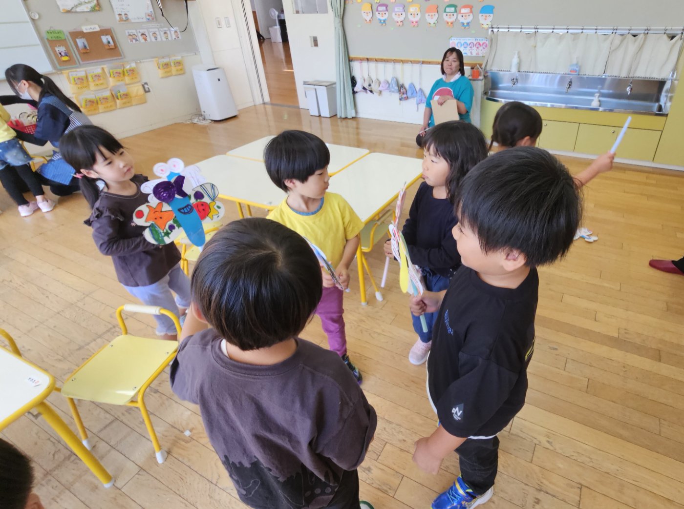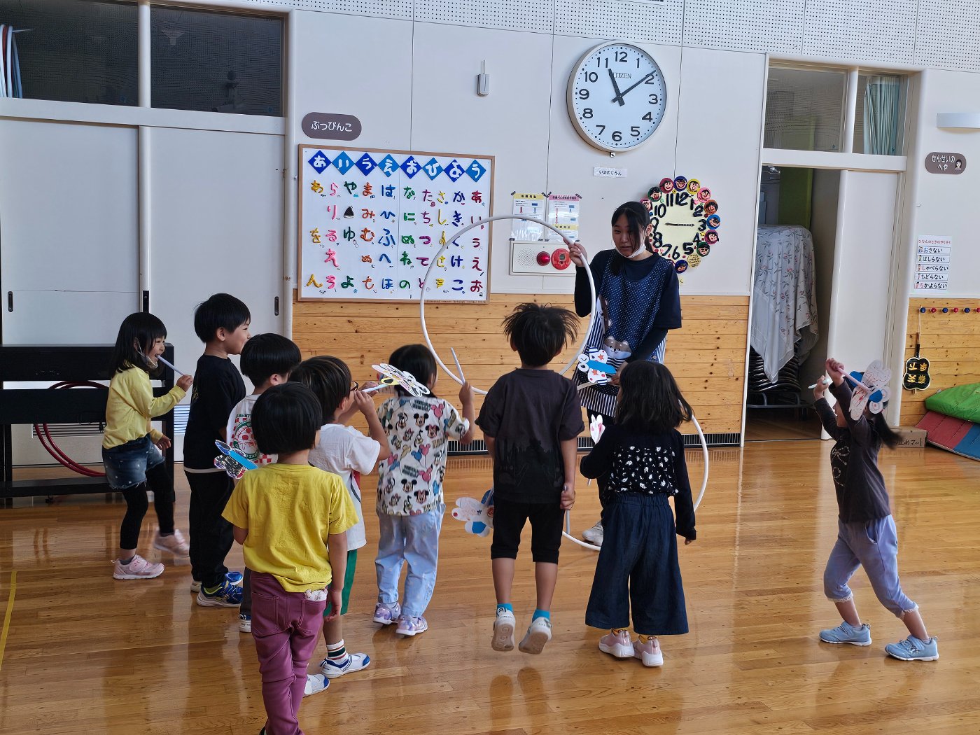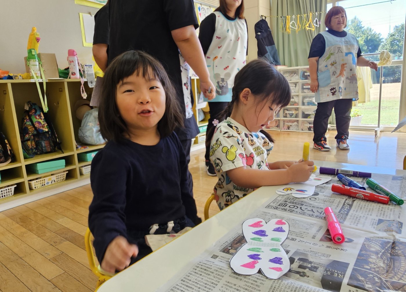 4週間の教育実習のまとめとして、今日一日、実習生のM先生が一日つくし組担任となりました。そのことを前日の帰りの会で伝えられた つくし組、ワクワクしながら今日の日を迎えていました。クラス時間では、前に立つM先生の話にしっかりと耳を傾け、普段通り元気いっぱい朝の会!『ストローとんぼ』という新たな製作を教えてもらいました。トンボの羽に好きな模様や表情豊かな目玉を描いたり、友達と見せ合ったりしながら和気あいあいと取組んでいました。ストローを取り付け、吹き矢のように息を吹きかけると、ビューンと飛んでいくトンボに大興奮⤴  フラフープの輪の中やステージの上から飛ばしたり、ストローの差し込み具合や拭き加減を調整したりなど、いかに遠くに飛ばすかを友達と一緒に考えながら楽しんでいました。