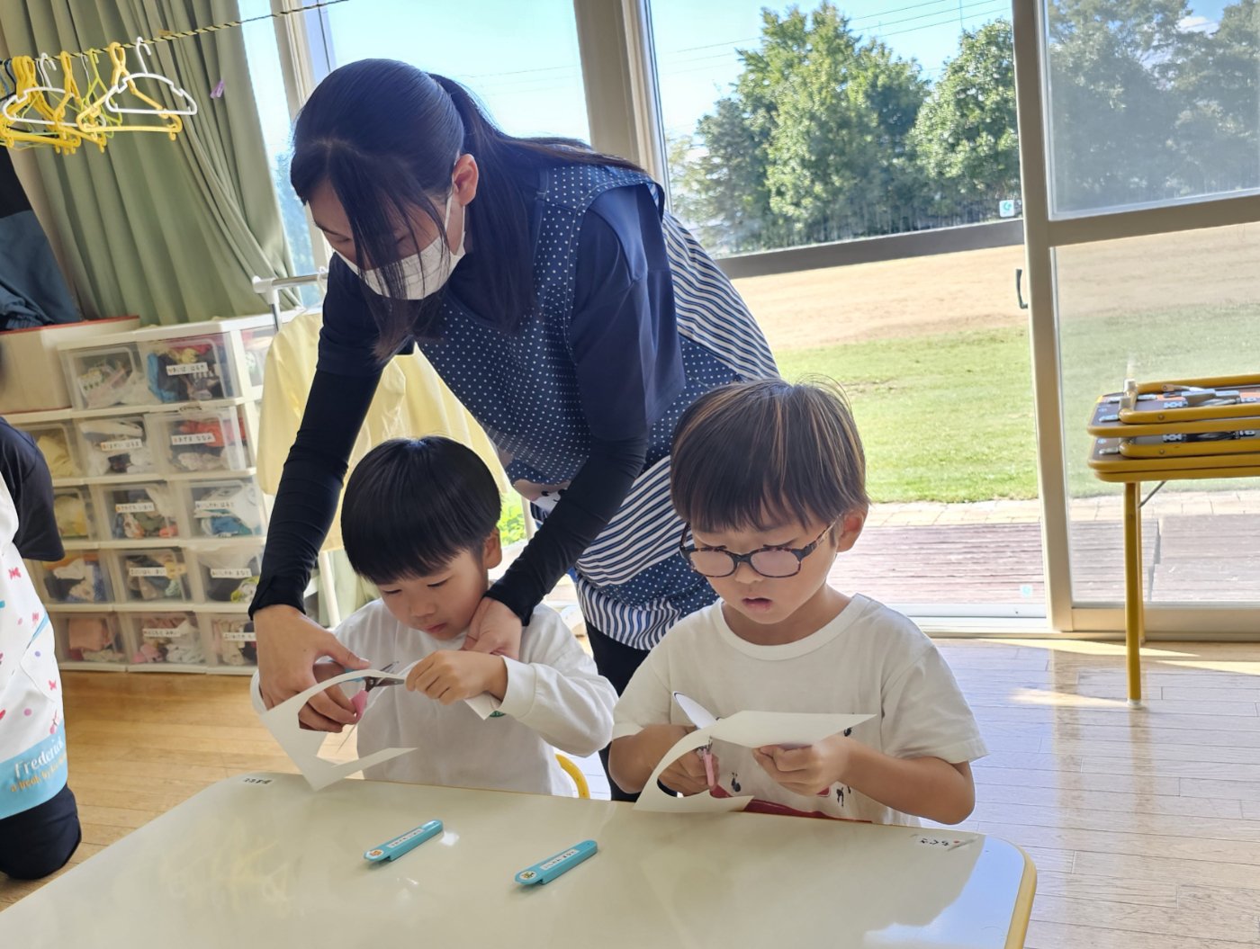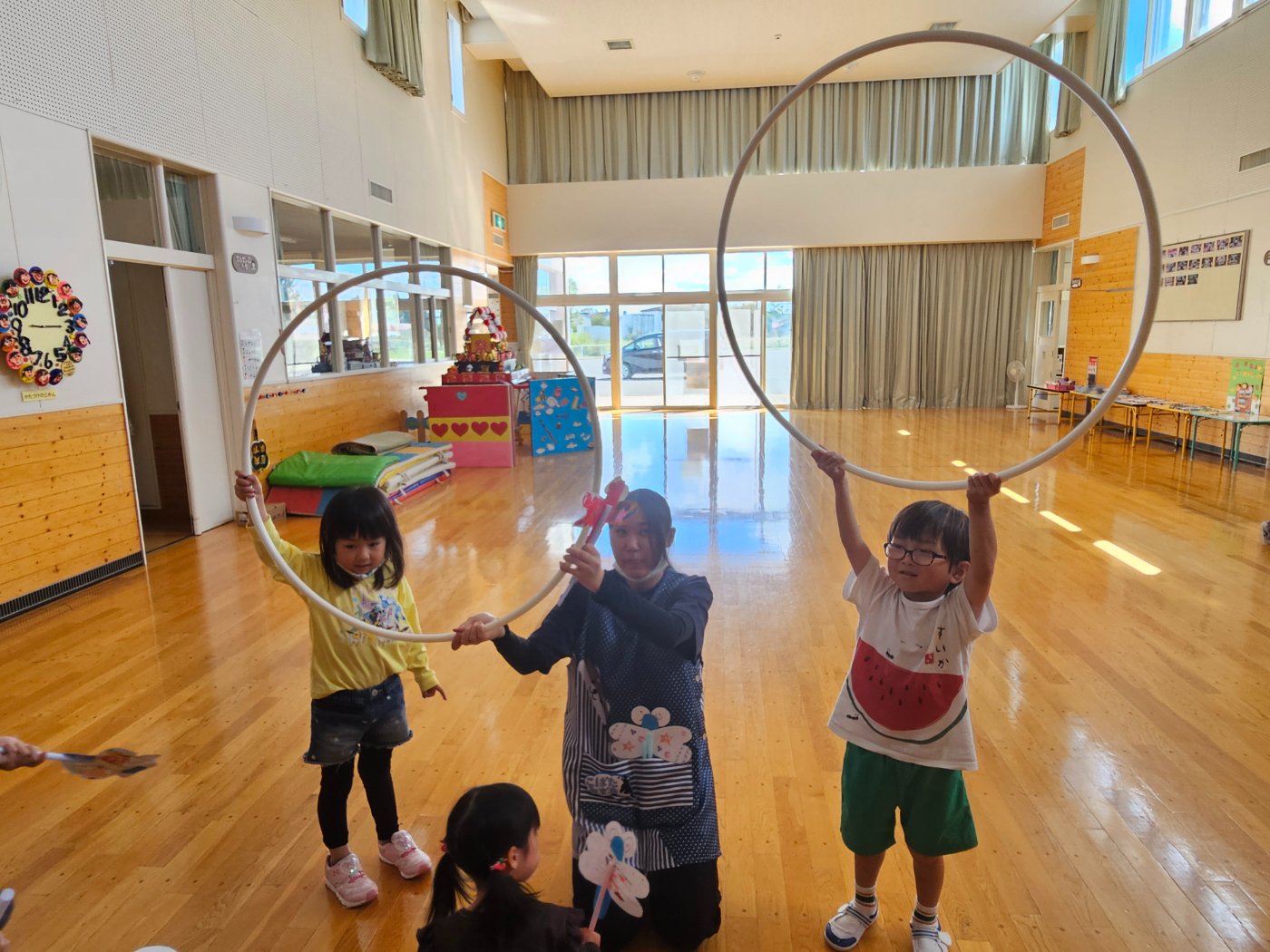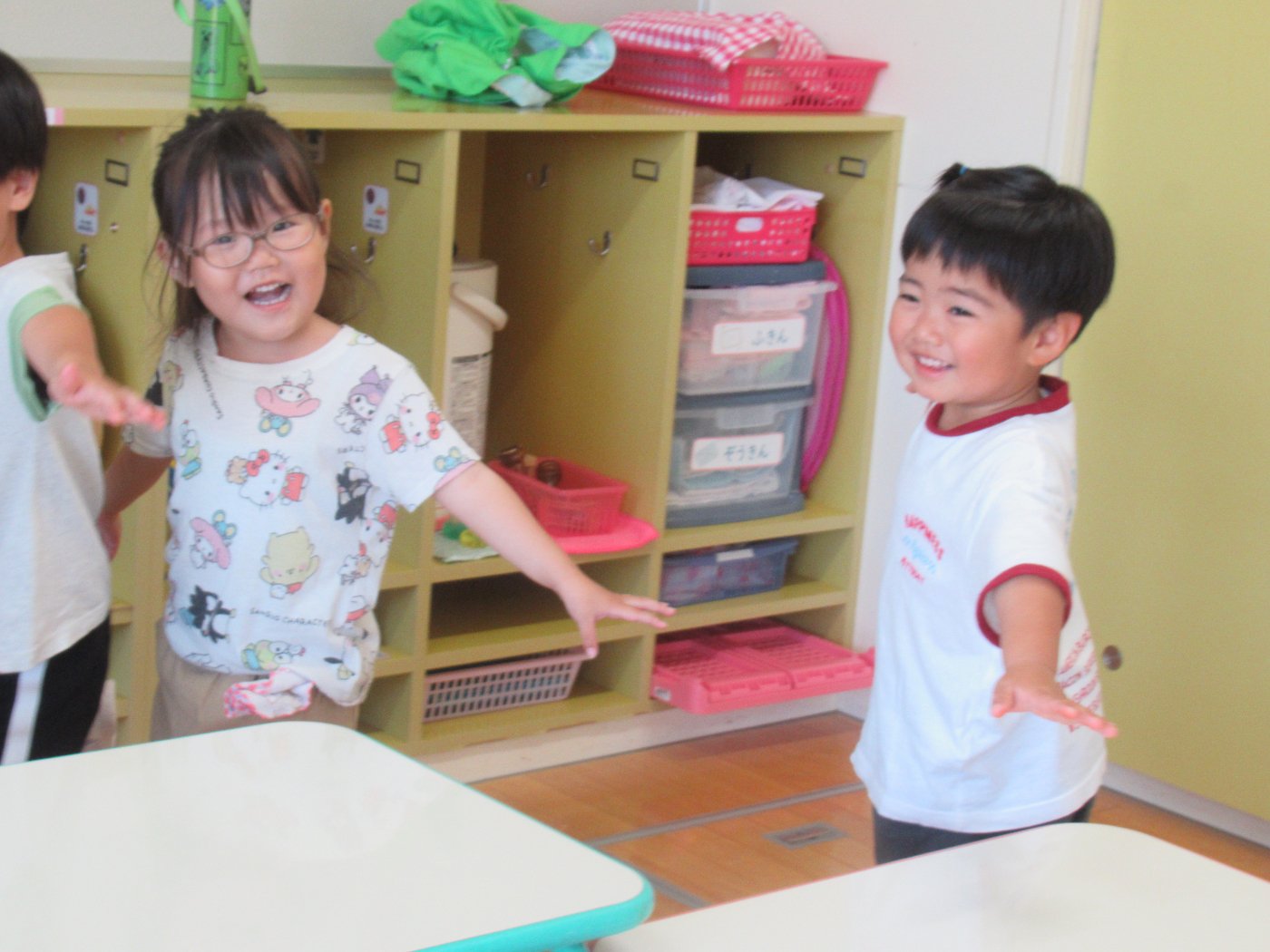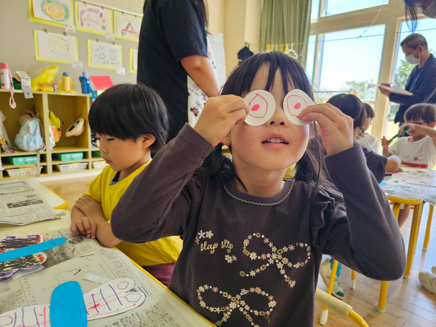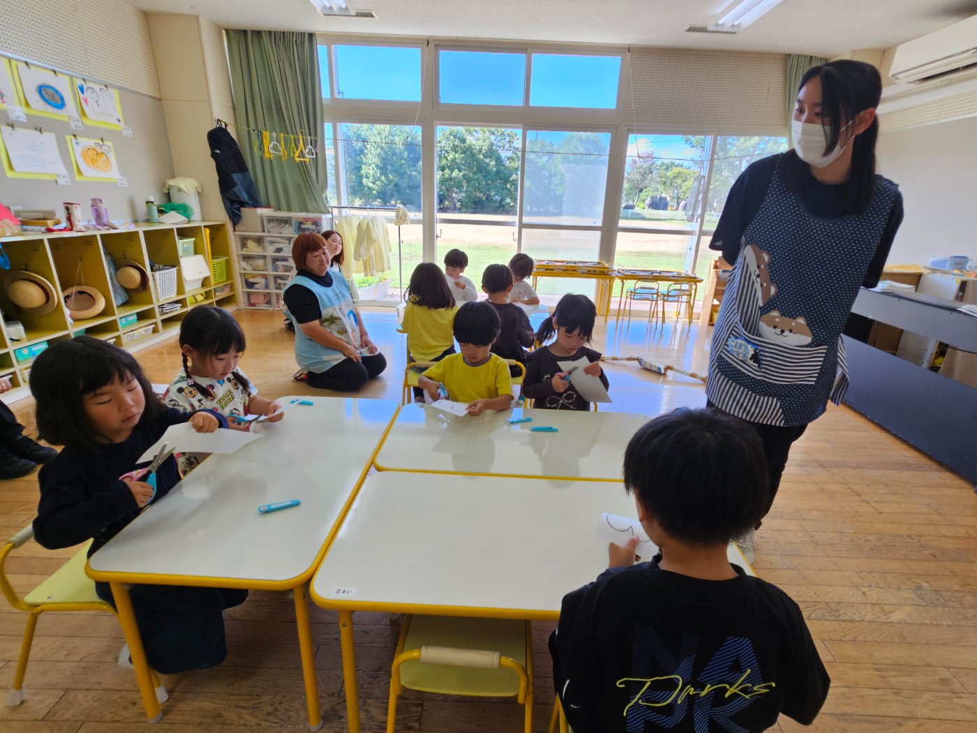 4週間の教育実習のまとめとして、今日一日、実習生のM先生が一日つくし組担任となりました。そのことを前日の帰りの会で伝えられた つくし組、ワクワクしながら今日の日を迎えていました。クラス時間では、前に立つM先生の話にしっかりと耳を傾け、普段通り元気いっぱい朝の会!『ストローとんぼ』という新たな製作を教えてもらいました。トンボの羽に好きな模様や表情豊かな目玉を描いたり、友達と見せ合ったりしながら和気あいあいと取組んでいました。ストローを取り付け、吹き矢のように息を吹きかけると、ビューンと飛んでいくトンボに大興奮⤴  フラフープの輪の中やステージの上から飛ばしたり、ストローの差し込み具合や拭き加減を調整したりなど、いかに遠くに飛ばすかを友達と一緒に考えながら楽しんでいました。