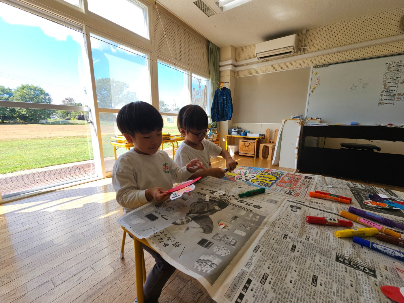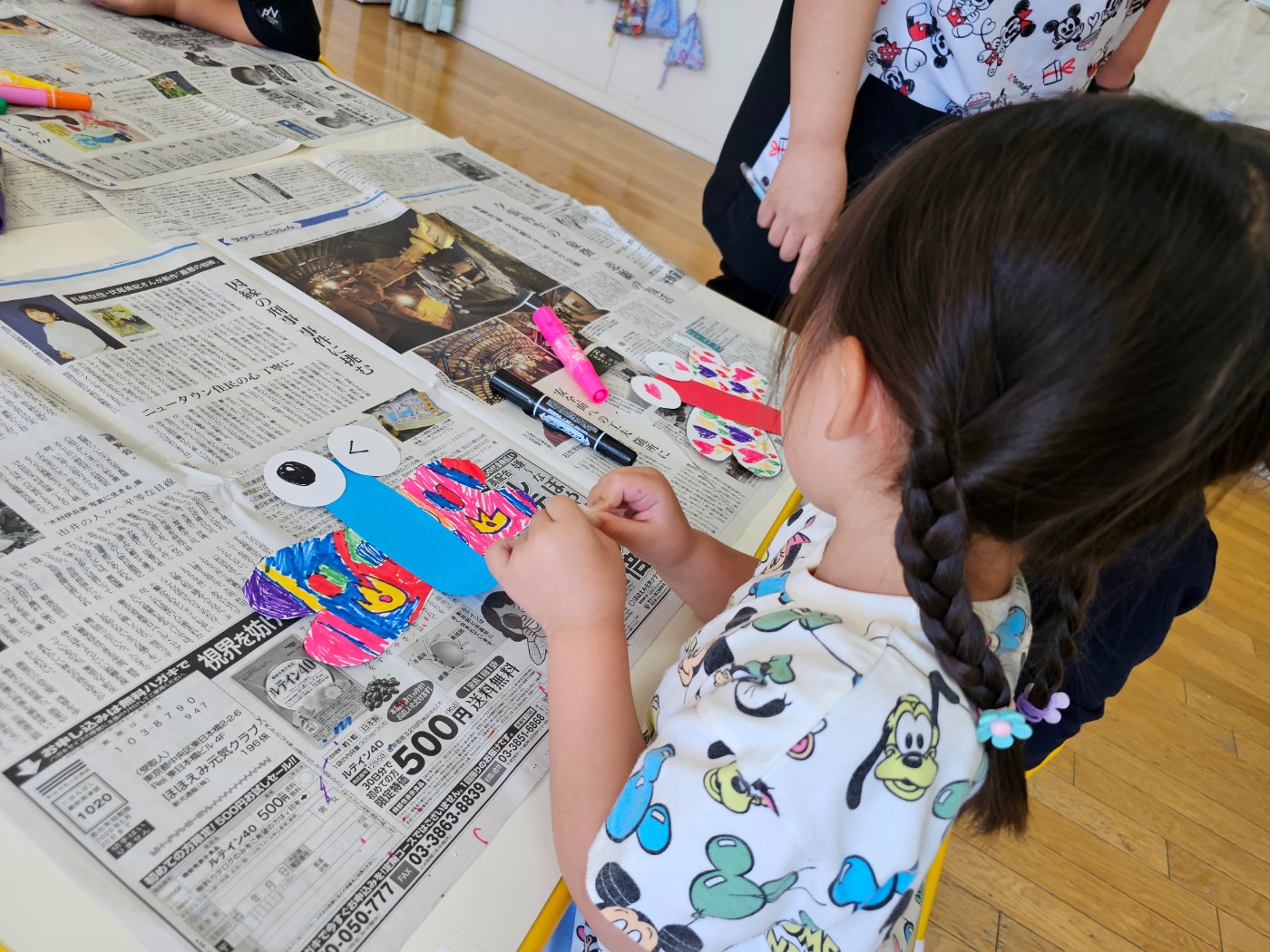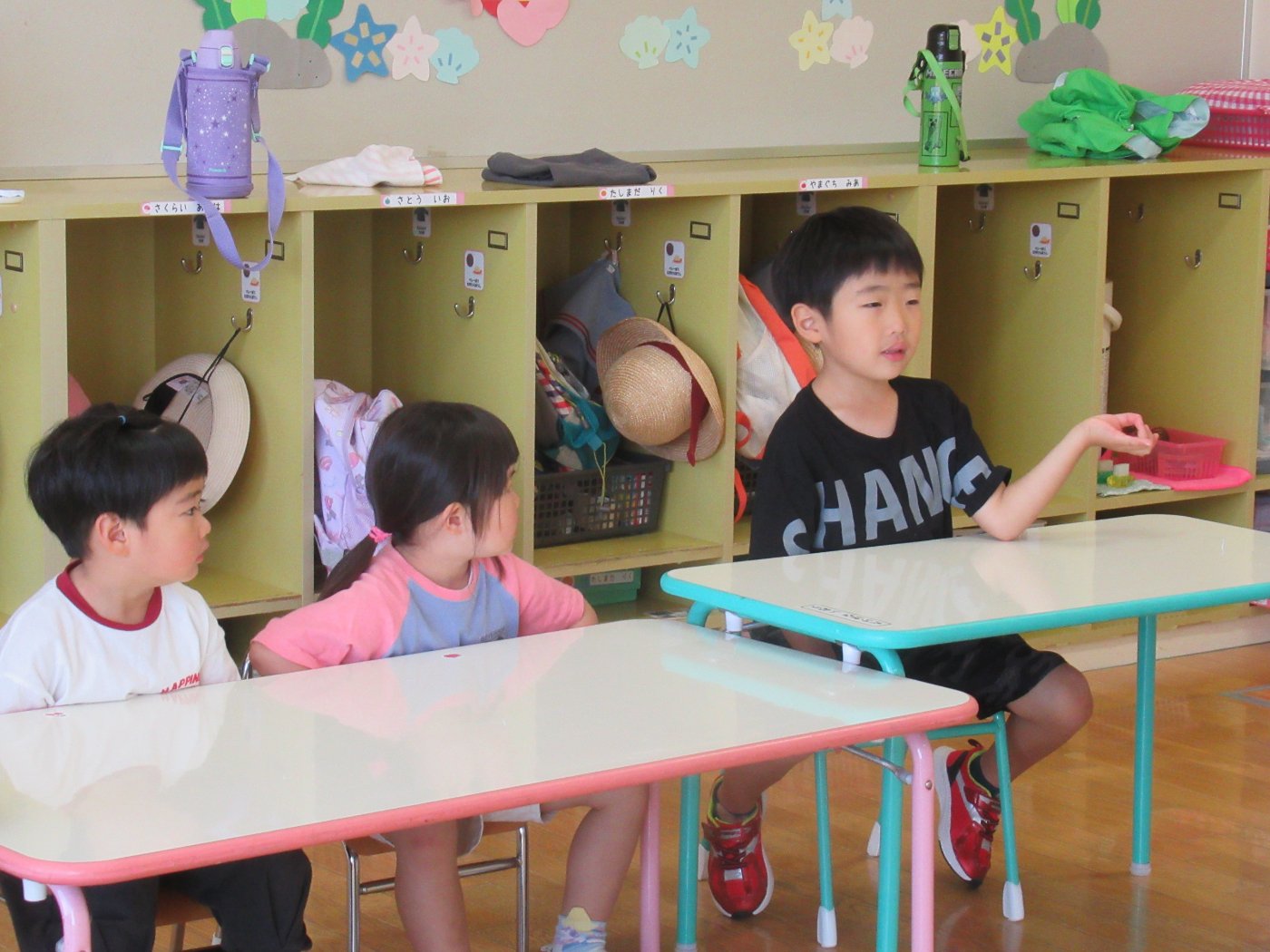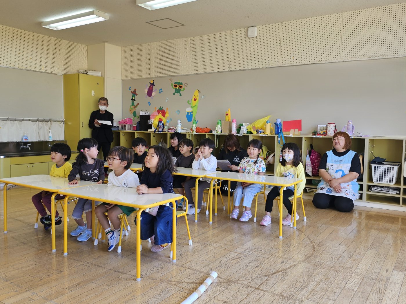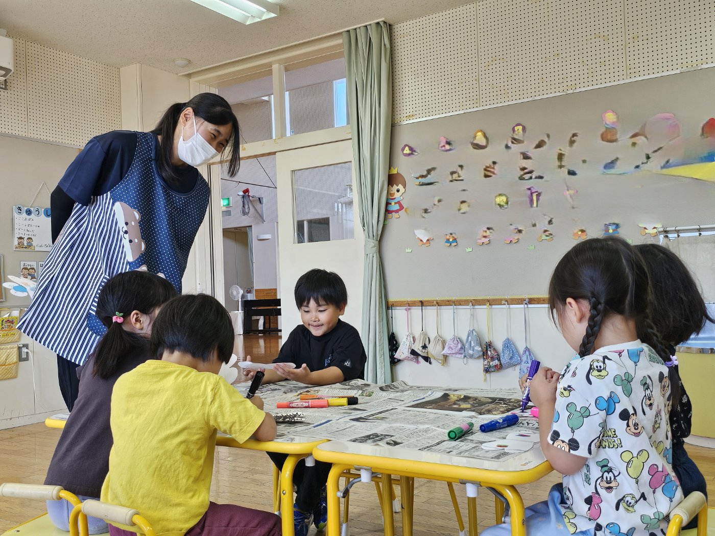 4週間の教育実習のまとめとして、今日一日、実習生のM先生が一日つくし組担任となりました。そのことを前日の帰りの会で伝えられた つくし組、ワクワクしながら今日の日を迎えていました。クラス時間では、前に立つM先生の話にしっかりと耳を傾け、普段通り元気いっぱい朝の会!『ストローとんぼ』という新たな製作を教えてもらいました。トンボの羽に好きな模様や表情豊かな目玉を描いたり、友達と見せ合ったりしながら和気あいあいと取組んでいました。ストローを取り付け、吹き矢のように息を吹きかけると、ビューンと飛んでいくトンボに大興奮⤴  フラフープの輪の中やステージの上から飛ばしたり、ストローの差し込み具合や拭き加減を調整したりなど、いかに遠くに飛ばすかを友達と一緒に考えながら楽しんでいました。