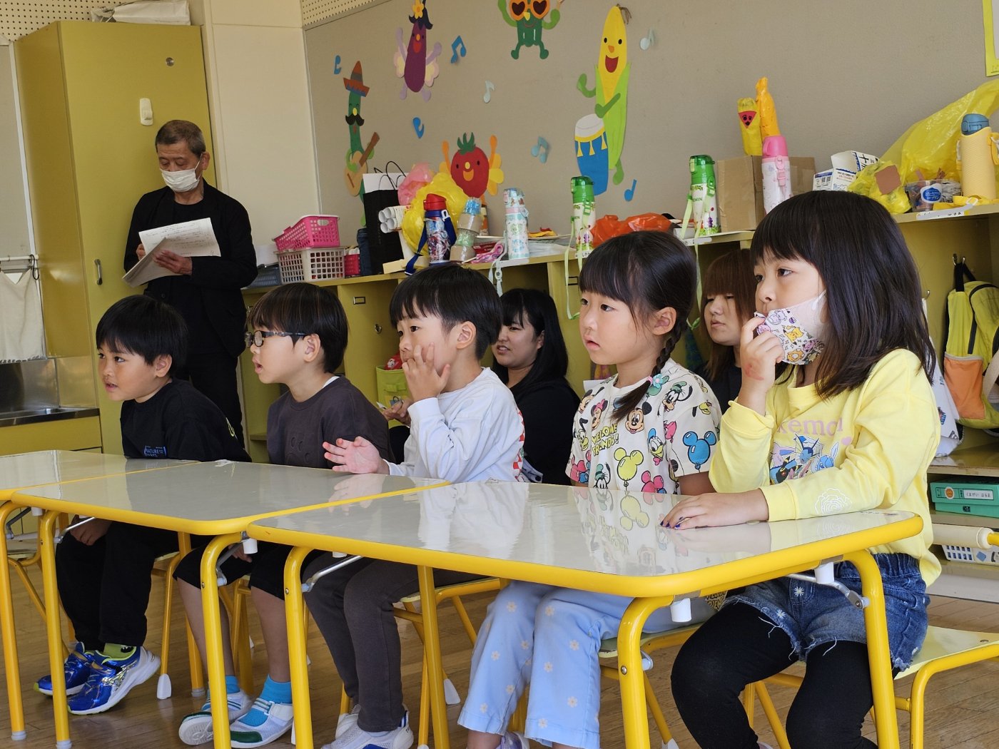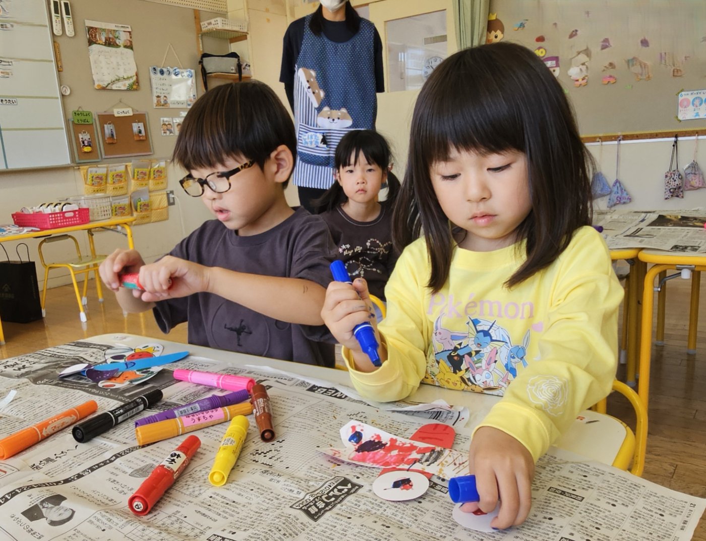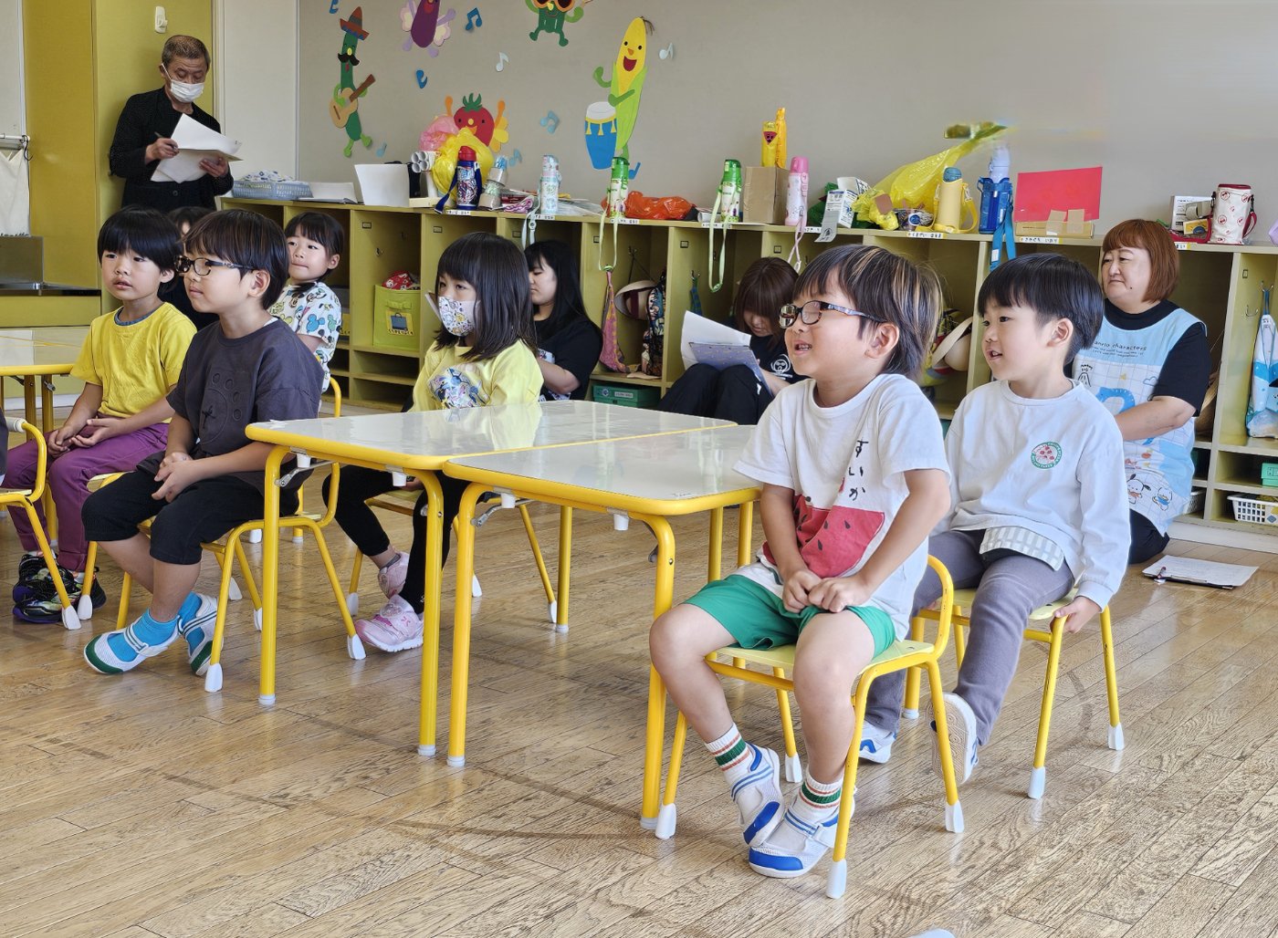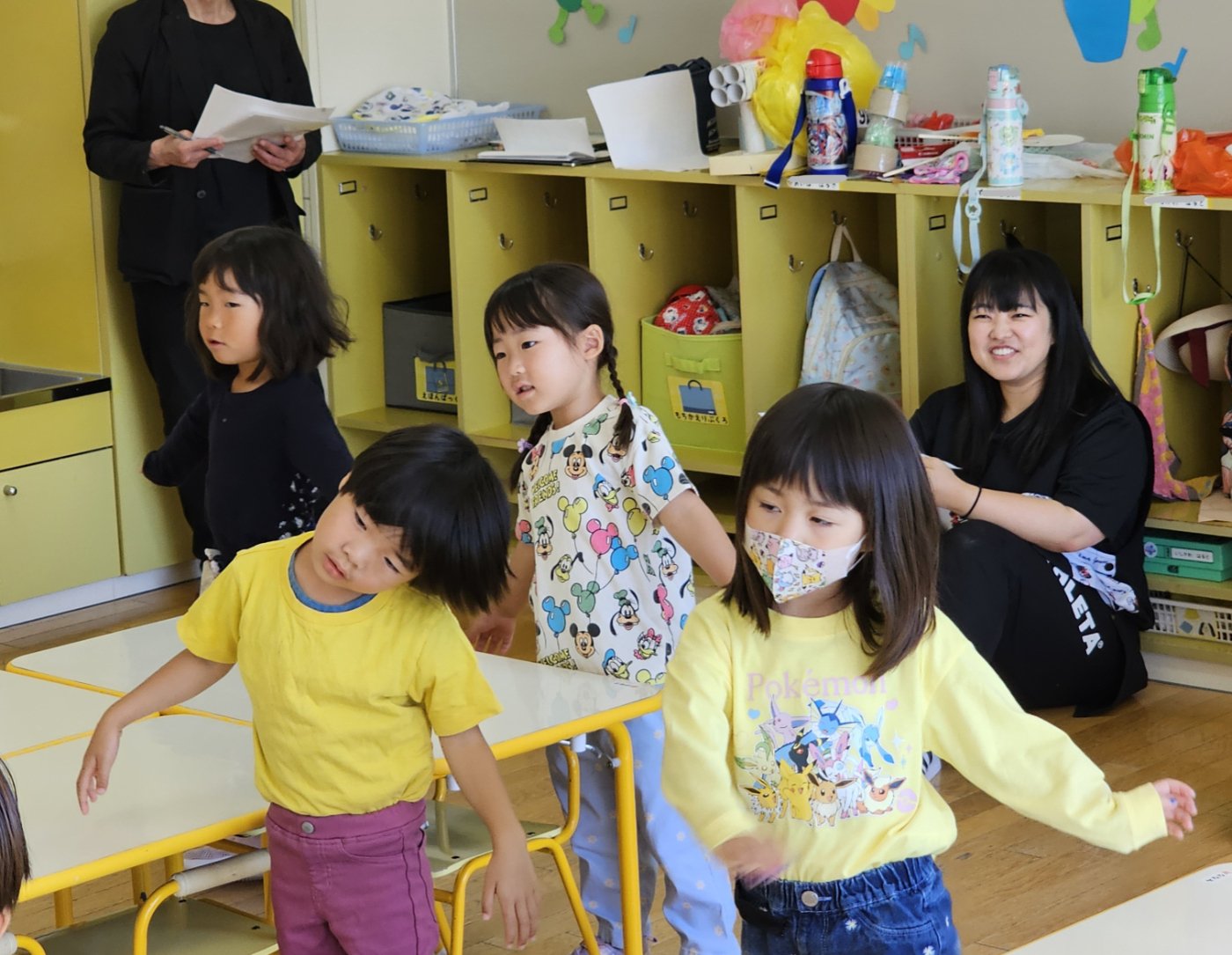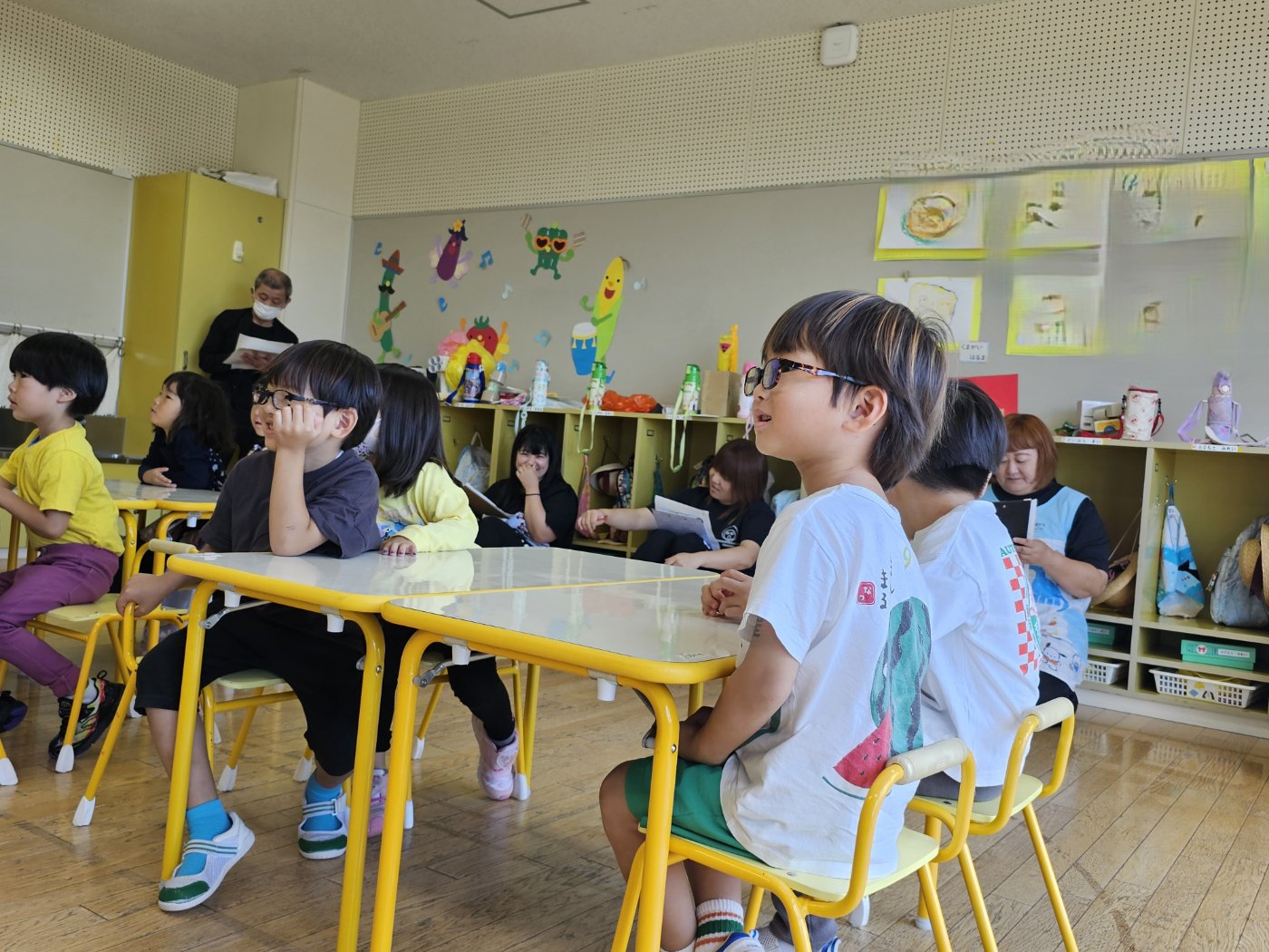 4週間の教育実習のまとめとして、今日一日、実習生のM先生が一日つくし組担任となりました。そのことを前日の帰りの会で伝えられた つくし組、ワクワクしながら今日の日を迎えていました。クラス時間では、前に立つM先生の話にしっかりと耳を傾け、普段通り元気いっぱい朝の会!『ストローとんぼ』という新たな製作を教えてもらいました。トンボの羽に好きな模様や表情豊かな目玉を描いたり、友達と見せ合ったりしながら和気あいあいと取組んでいました。ストローを取り付け、吹き矢のように息を吹きかけると、ビューンと飛んでいくトンボに大興奮⤴  フラフープの輪の中やステージの上から飛ばしたり、ストローの差し込み具合や拭き加減を調整したりなど、いかに遠くに飛ばすかを友達と一緒に考えながら楽しんでいました。