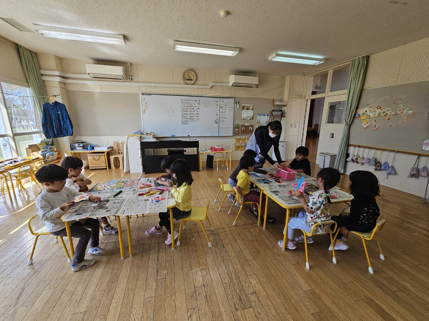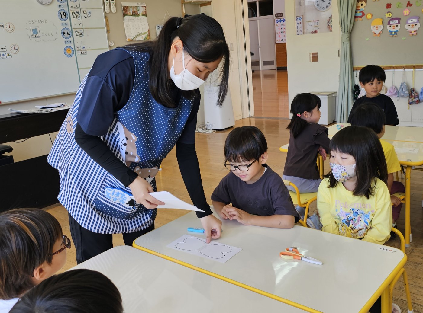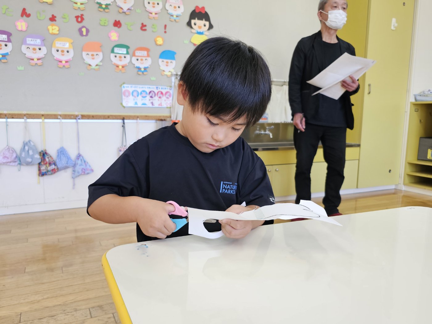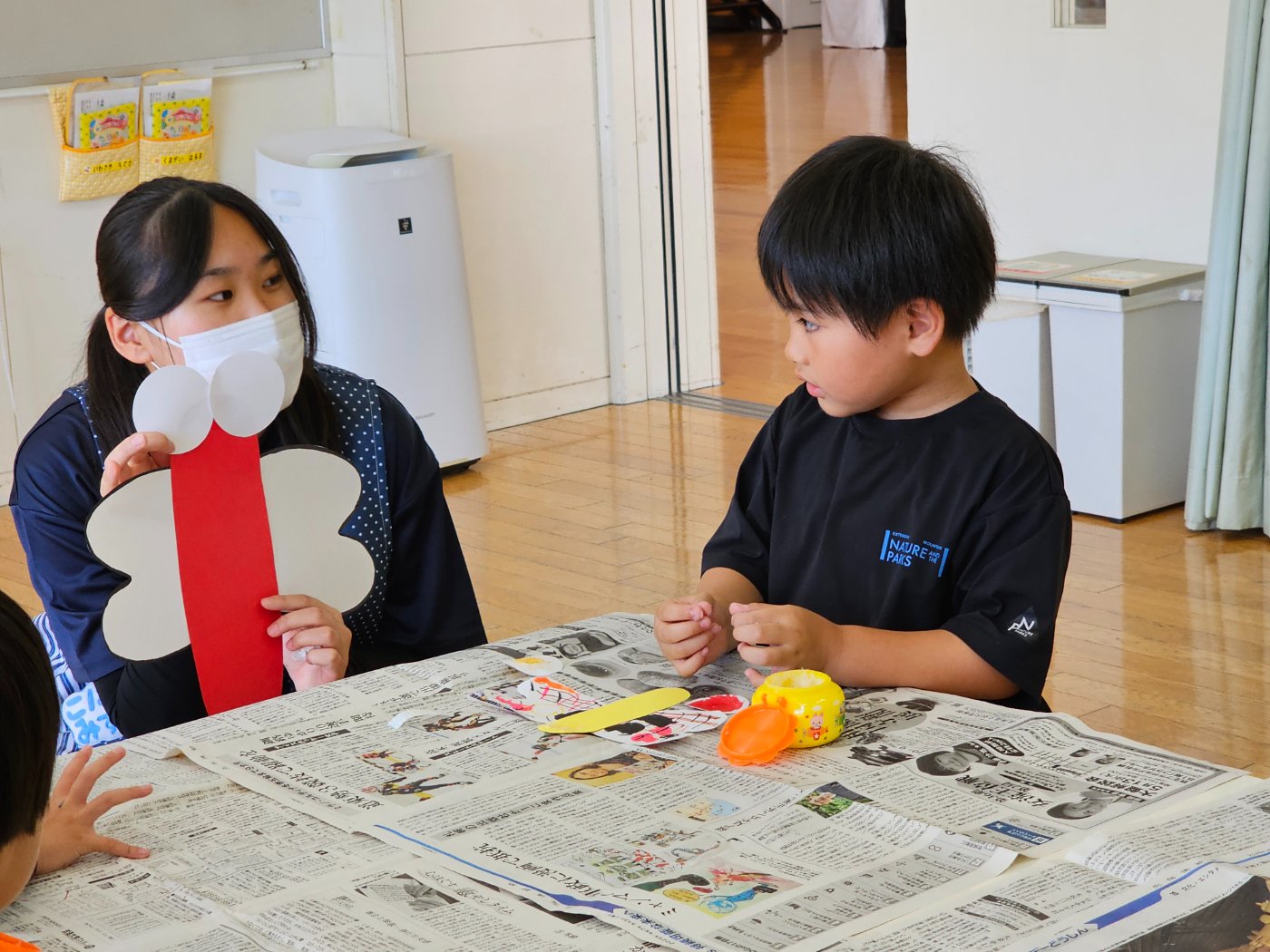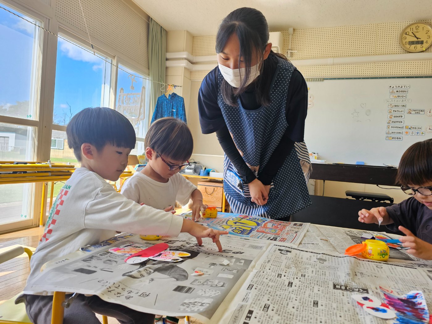 4週間の教育実習のまとめとして、今日一日、実習生のM先生が一日つくし組担任となりました。そのことを前日の帰りの会で伝えられた つくし組、ワクワクしながら今日の日を迎えていました。クラス時間では、前に立つM先生の話にしっかりと耳を傾け、普段通り元気いっぱい朝の会!『ストローとんぼ』という新たな製作を教えてもらいました。トンボの羽に好きな模様や表情豊かな目玉を描いたり、友達と見せ合ったりしながら和気あいあいと取組んでいました。ストローを取り付け、吹き矢のように息を吹きかけると、ビューンと飛んでいくトンボに大興奮⤴  フラフープの輪の中やステージの上から飛ばしたり、ストローの差し込み具合や拭き加減を調整したりなど、いかに遠くに飛ばすかを友達と一緒に考えながら楽しんでいました。