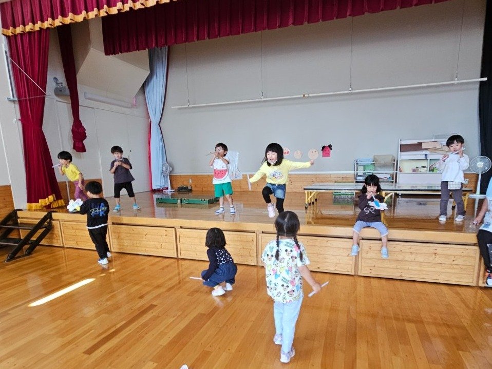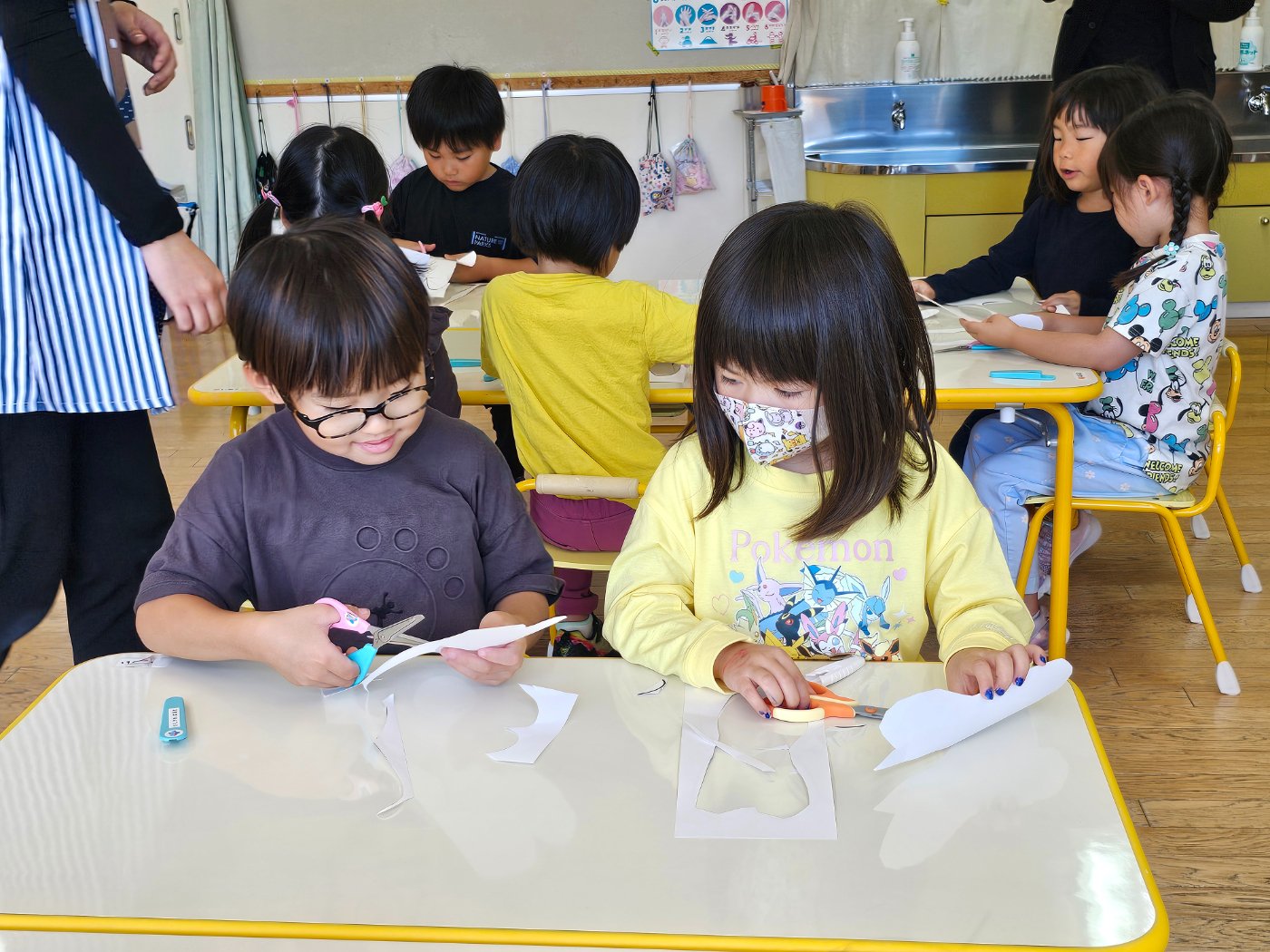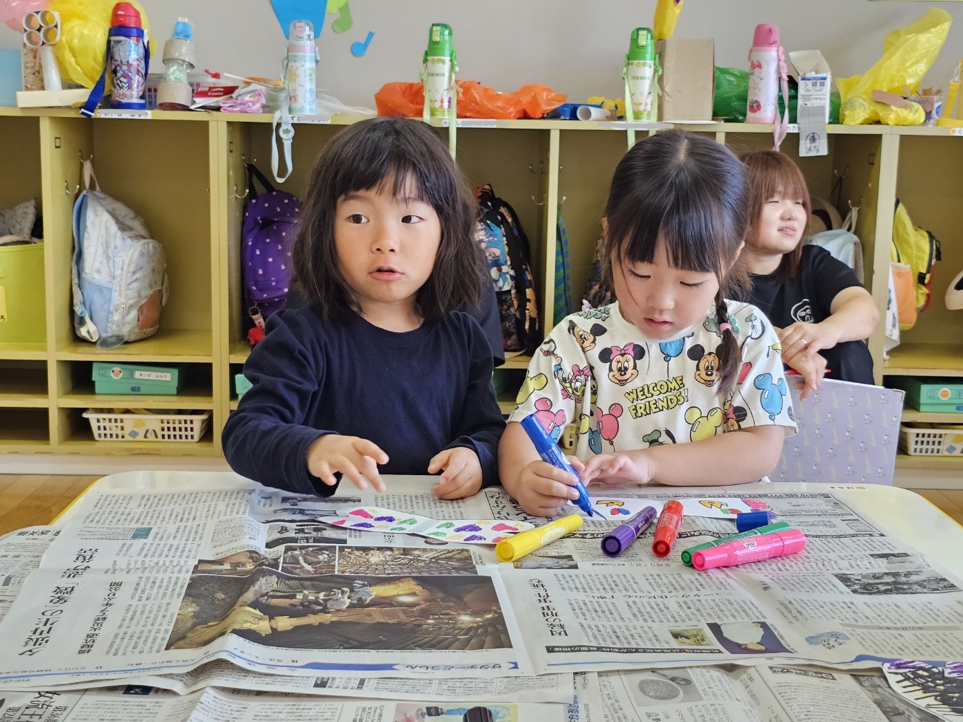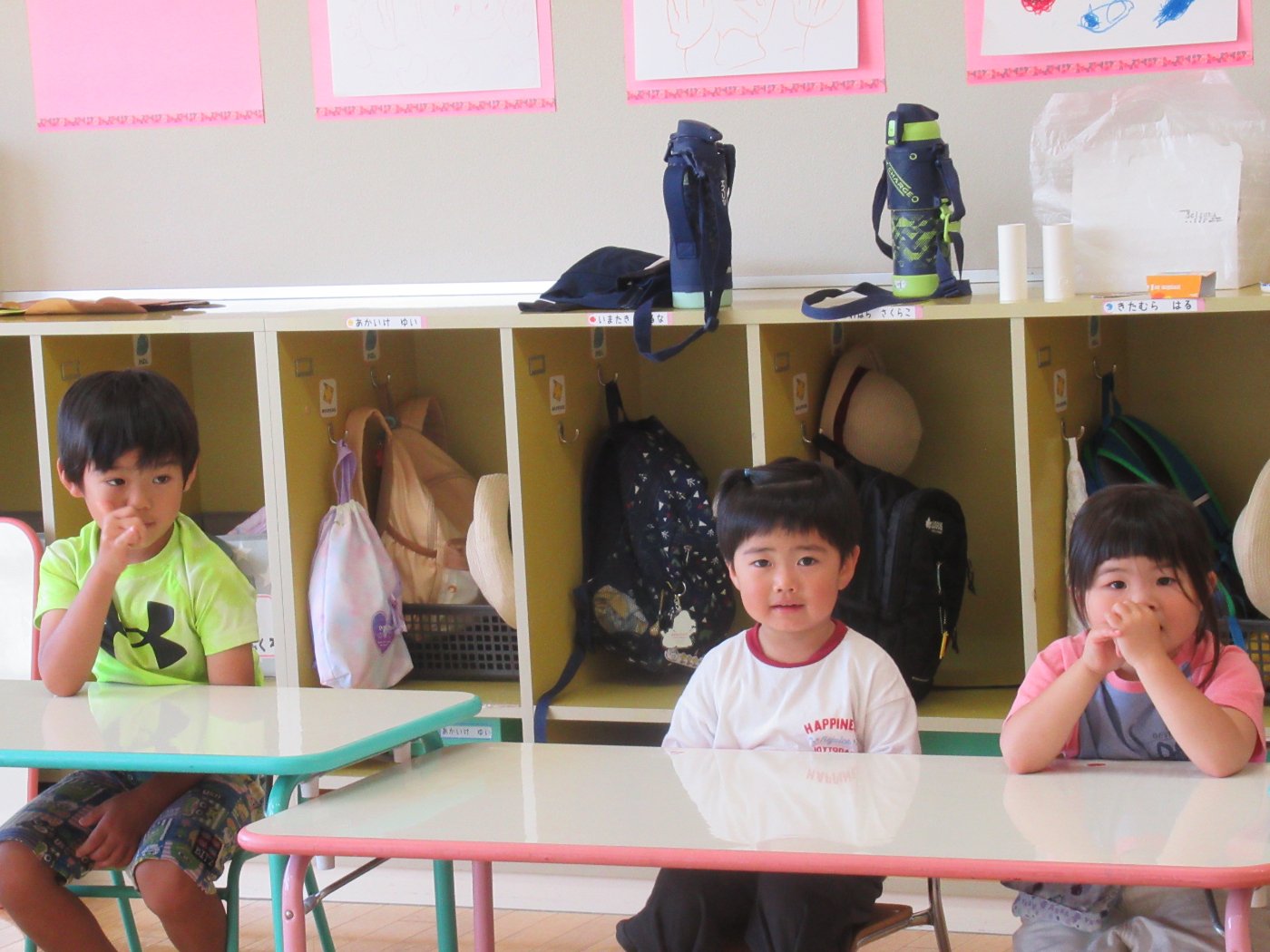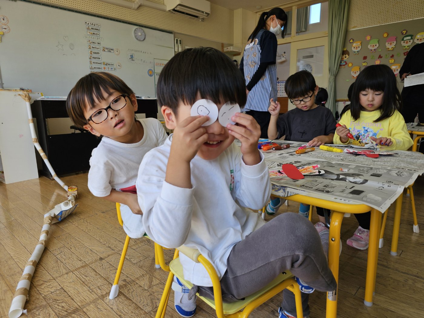 4週間の教育実習のまとめとして、今日一日、実習生のM先生が一日つくし組担任となりました。そのことを前日の帰りの会で伝えられた つくし組、ワクワクしながら今日の日を迎えていました。クラス時間では、前に立つM先生の話にしっかりと耳を傾け、普段通り元気いっぱい朝の会!『ストローとんぼ』という新たな製作を教えてもらいました。トンボの羽に好きな模様や表情豊かな目玉を描いたり、友達と見せ合ったりしながら和気あいあいと取組んでいました。ストローを取り付け、吹き矢のように息を吹きかけると、ビューンと飛んでいくトンボに大興奮⤴  フラフープの輪の中やステージの上から飛ばしたり、ストローの差し込み具合や拭き加減を調整したりなど、いかに遠くに飛ばすかを友達と一緒に考えながら楽しんでいました。