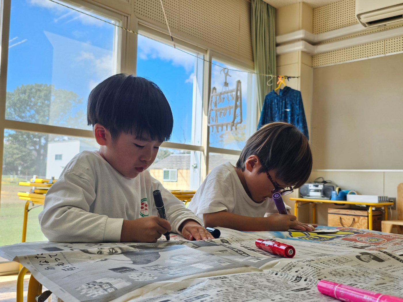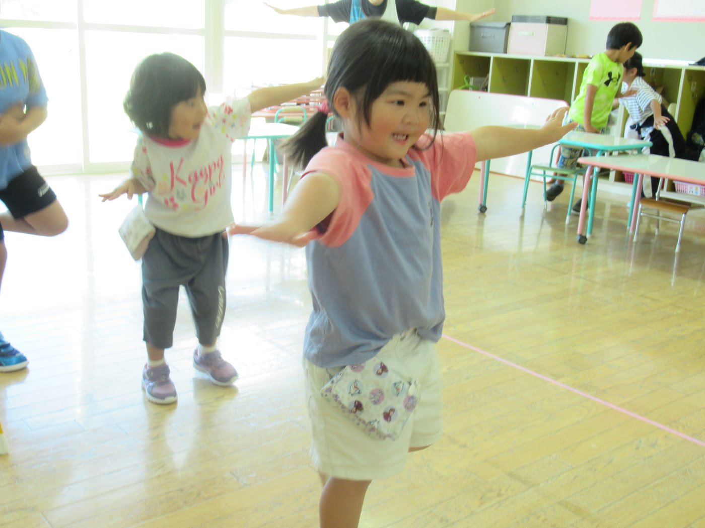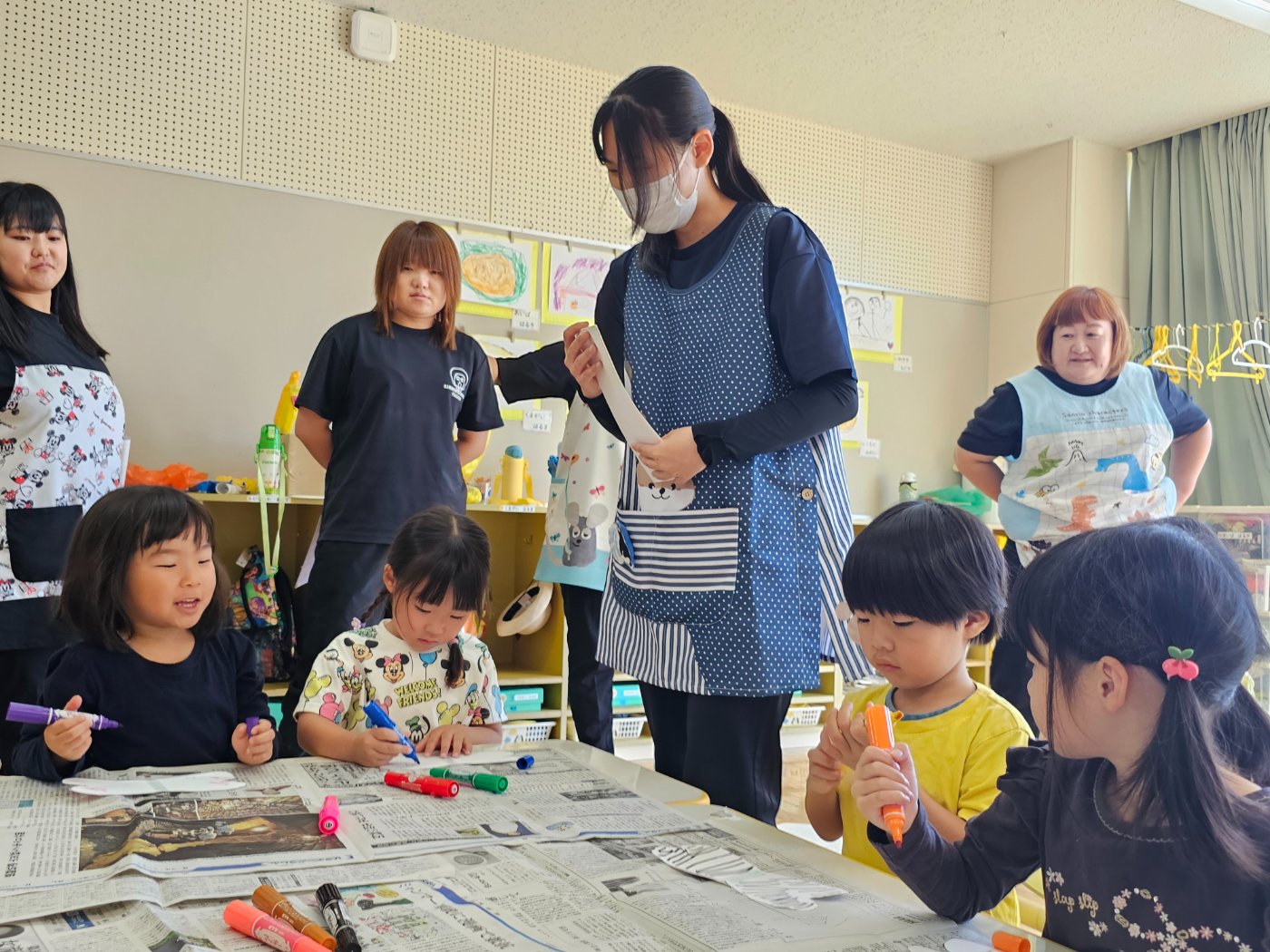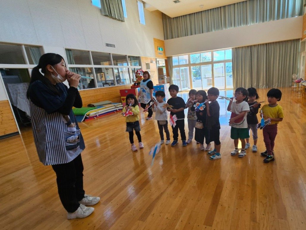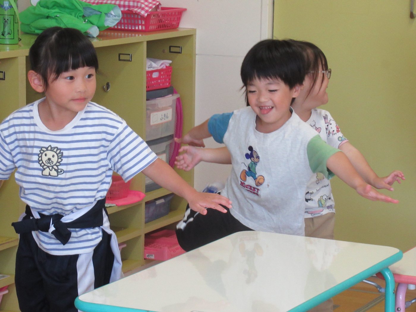 4週間の教育実習のまとめとして、今日一日、実習生のM先生が一日つくし組担任となりました。そのことを前日の帰りの会で伝えられた つくし組、ワクワクしながら今日の日を迎えていました。クラス時間では、前に立つM先生の話にしっかりと耳を傾け、普段通り元気いっぱい朝の会!『ストローとんぼ』という新たな製作を教えてもらいました。トンボの羽に好きな模様や表情豊かな目玉を描いたり、友達と見せ合ったりしながら和気あいあいと取組んでいました。ストローを取り付け、吹き矢のように息を吹きかけると、ビューンと飛んでいくトンボに大興奮⤴  フラフープの輪の中やステージの上から飛ばしたり、ストローの差し込み具合や拭き加減を調整したりなど、いかに遠くに飛ばすかを友達と一緒に考えながら楽しんでいました。
