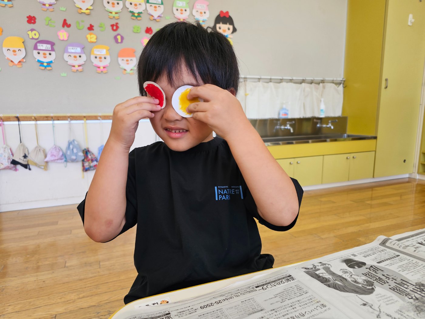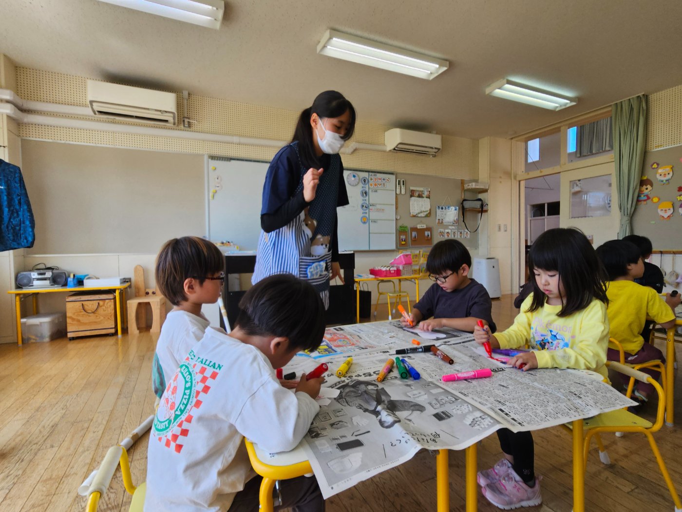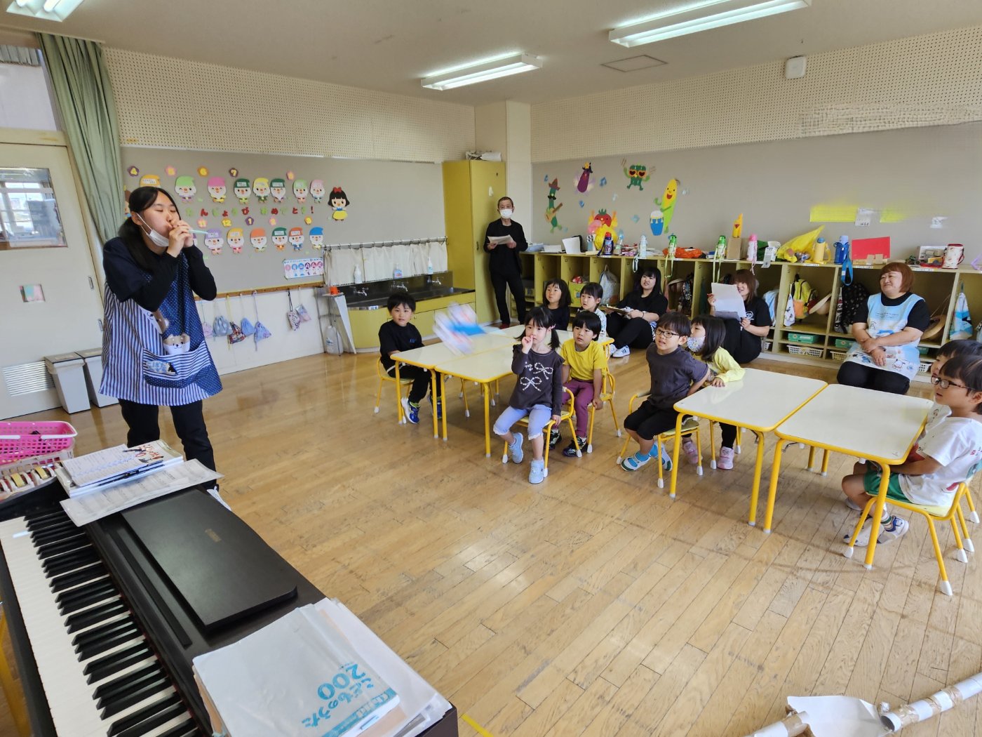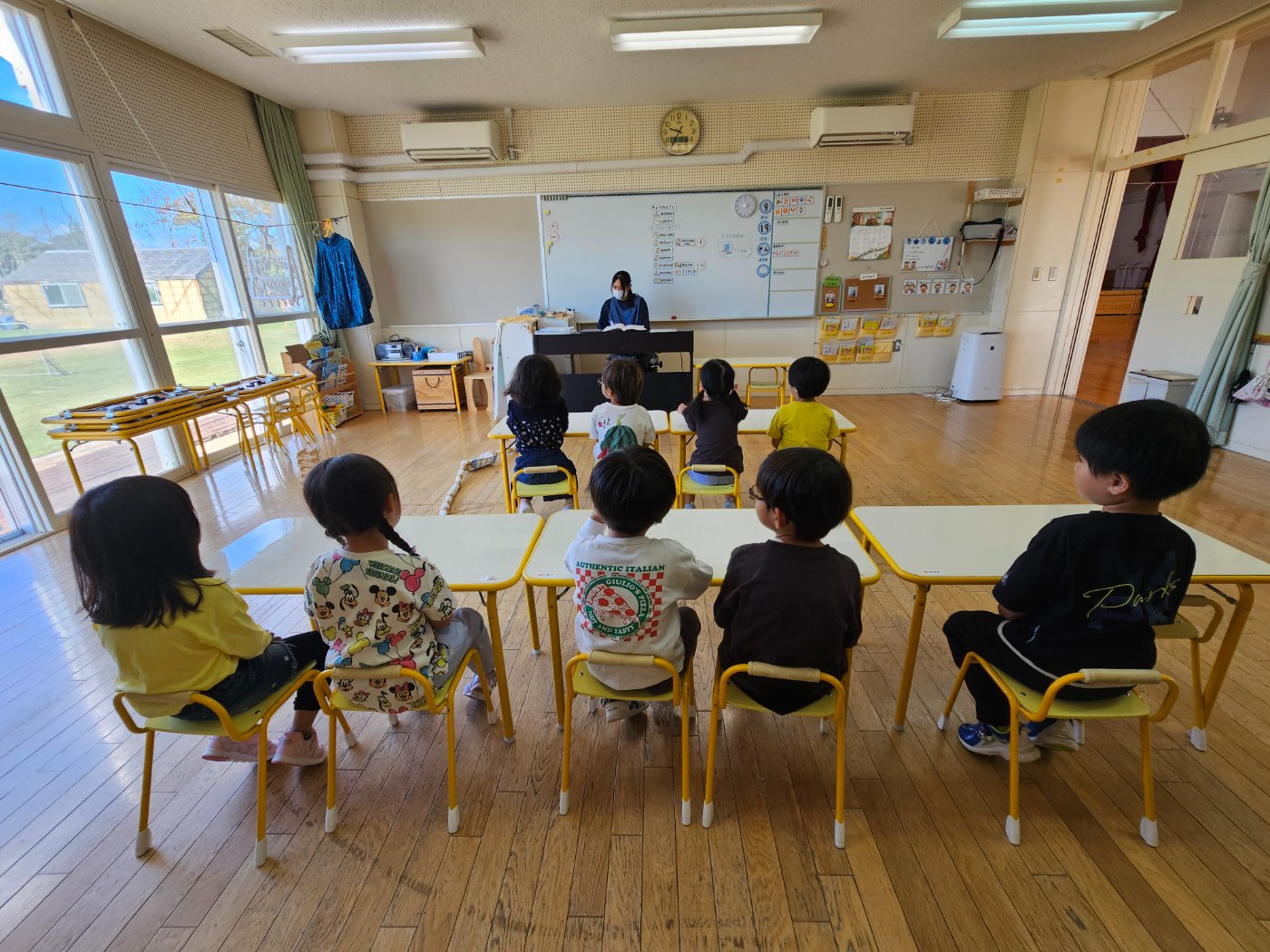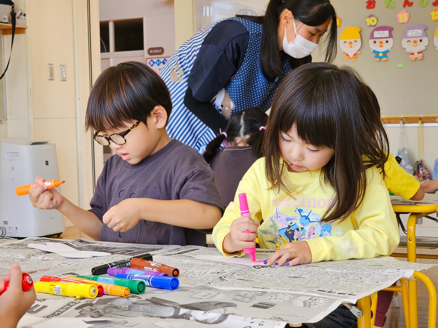4週間の教育実習のまとめとして、今日一日、実習生のM先生が一日つくし組担任となりました。そのことを前日の帰りの会で伝えられた つくし組、ワクワクしながら今日の日を迎えていました。クラス時間では、前に立つM先生の話にしっかりと耳を傾け、普段通り元気いっぱい朝の会!『ストローとんぼ』という新たな製作を教えてもらいました。トンボの羽に好きな模様や表情豊かな目玉を描いたり、友達と見せ合ったりしながら和気あいあいと取組んでいました。ストローを取り付け、吹き矢のように息を吹きかけると、ビューンと飛んでいくトンボに大興奮⤴  フラフープの輪の中やステージの上から飛ばしたり、ストローの差し込み具合や拭き加減を調整したりなど、いかに遠くに飛ばすかを友達と一緒に考えながら楽しんでいました。