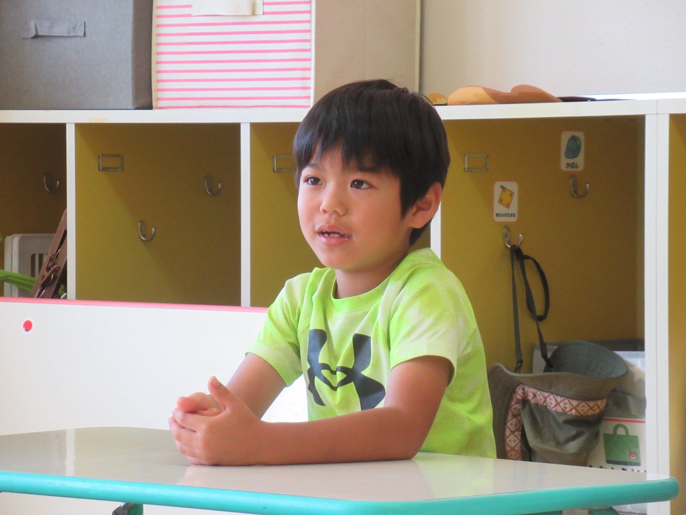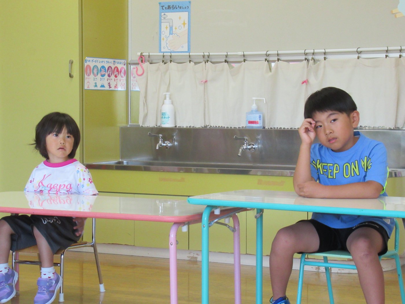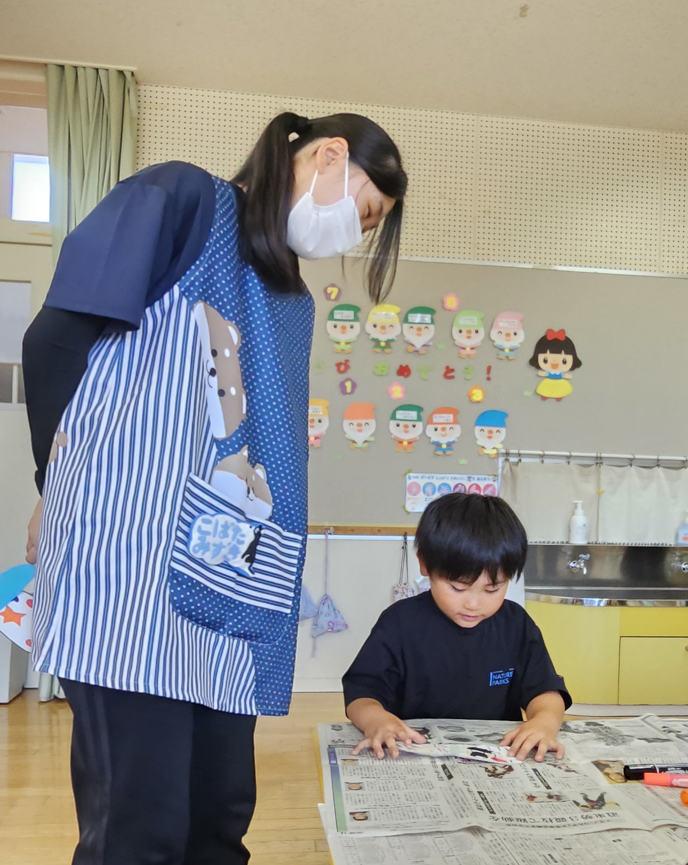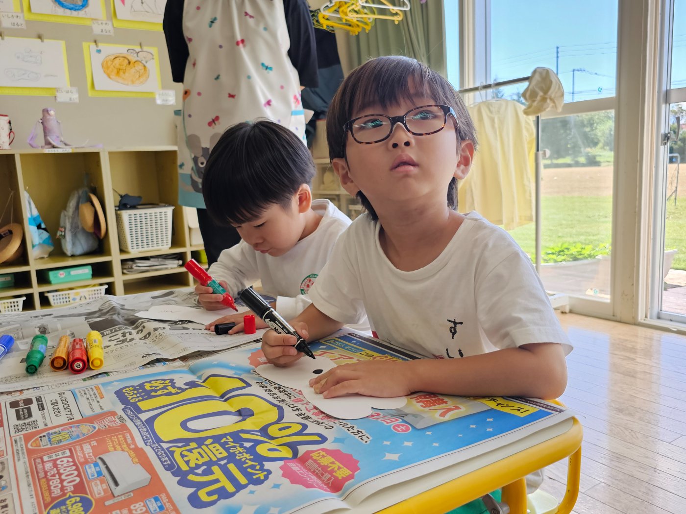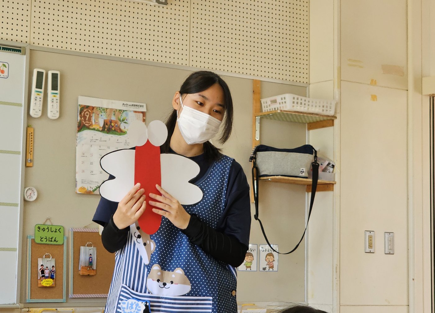 4週間の教育実習のまとめとして、今日一日、実習生のM先生が一日つくし組担任となりました。そのことを前日の帰りの会で伝えられた つくし組、ワクワクしながら今日の日を迎えていました。クラス時間では、前に立つM先生の話にしっかりと耳を傾け、普段通り元気いっぱい朝の会!『ストローとんぼ』という新たな製作を教えてもらいました。トンボの羽に好きな模様や表情豊かな目玉を描いたり、友達と見せ合ったりしながら和気あいあいと取組んでいました。ストローを取り付け、吹き矢のように息を吹きかけると、ビューンと飛んでいくトンボに大興奮⤴  フラフープの輪の中やステージの上から飛ばしたり、ストローの差し込み具合や拭き加減を調整したりなど、いかに遠くに飛ばすかを友達と一緒に考えながら楽しんでいました。