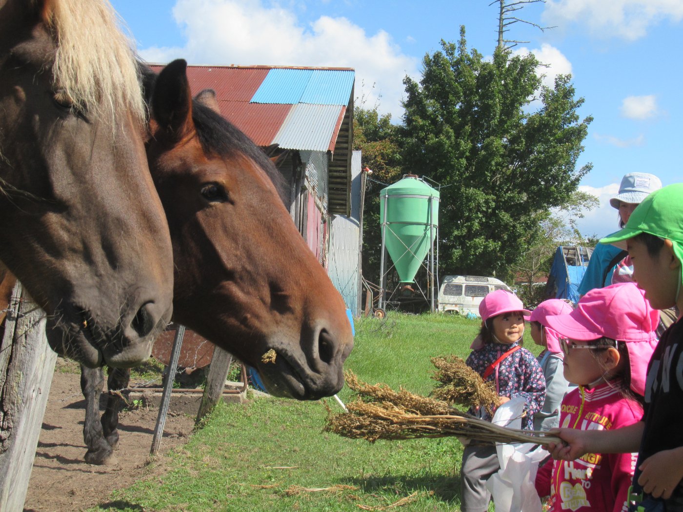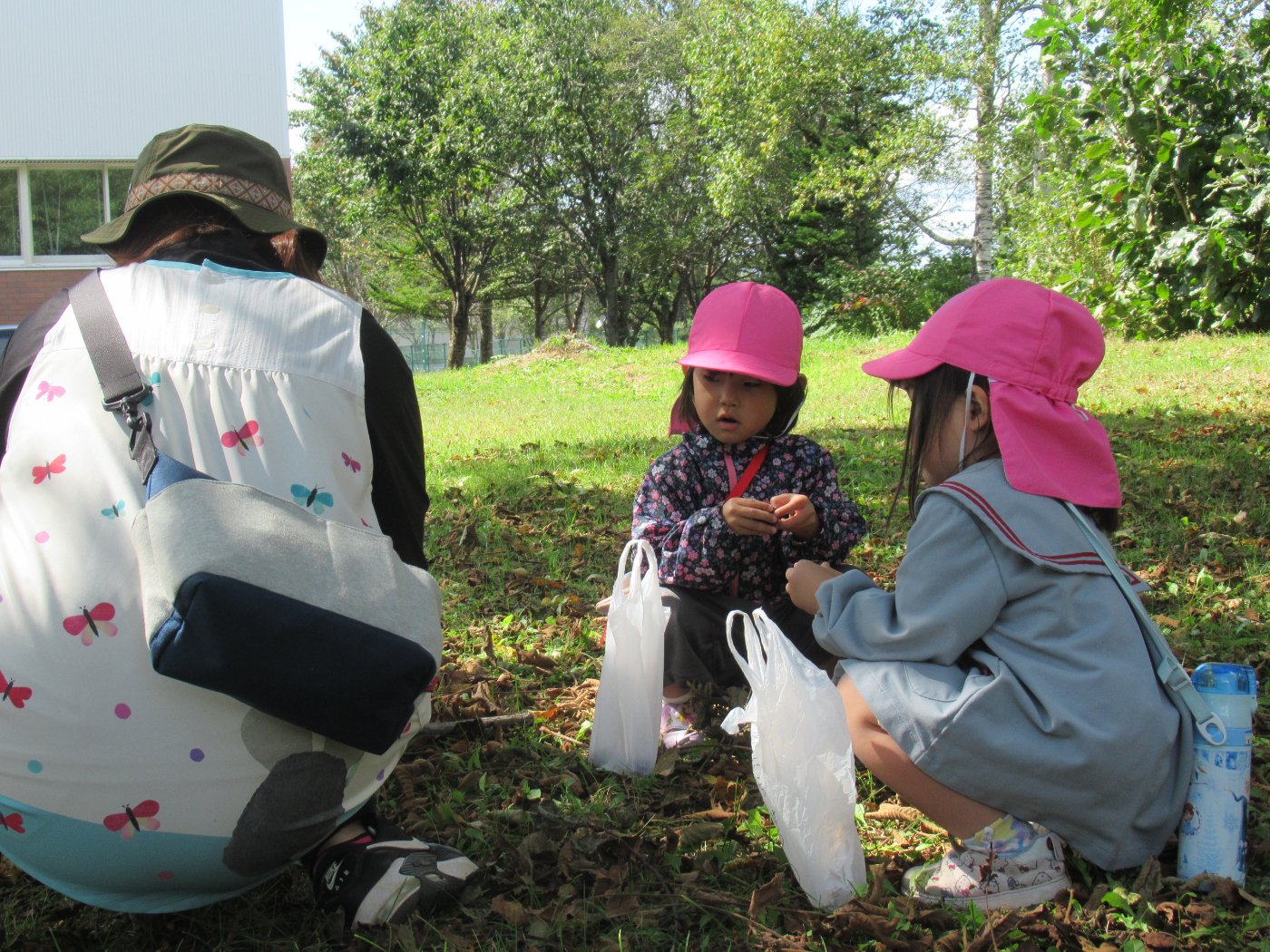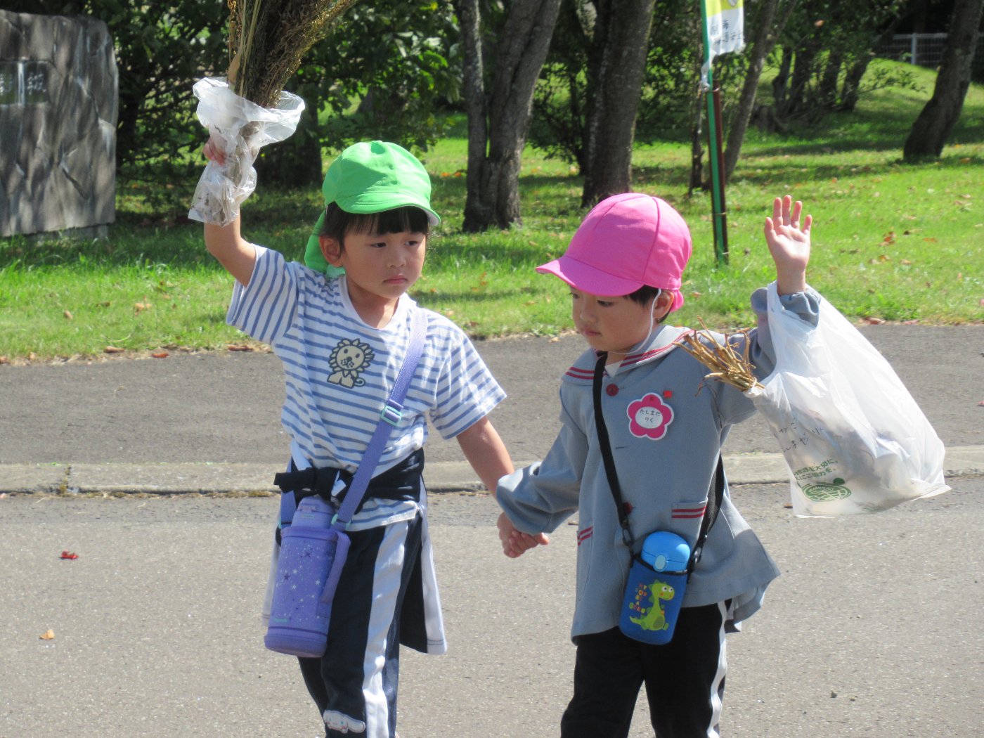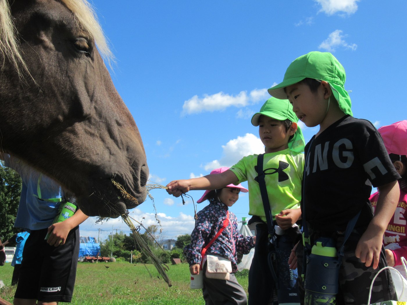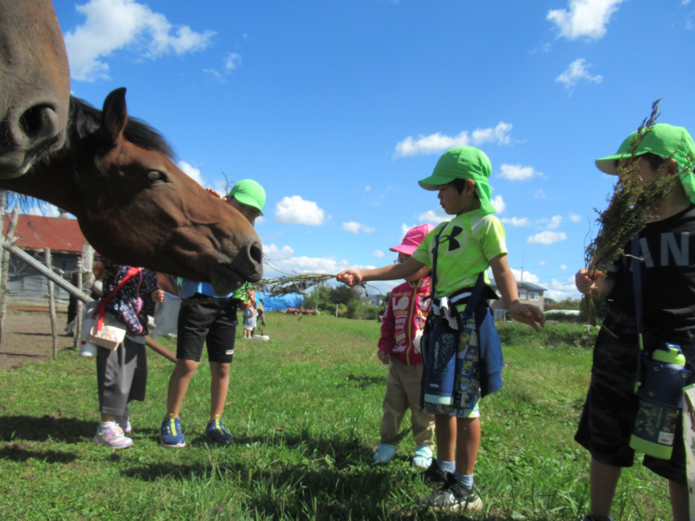 つくし組外の教職員も交代で総合実習を参観するため、いちご組・たけのこ組は合同で朝の会をしたり、園外散策に出掛けたりしました。幼稚園から5分ほど歩いた所にある牧場に馬を見に行こう!と、収穫後に干しておいたニンジンの葉を携えて行ってきました。馬との触れ合いに慣れている子もいれば、間近に見る大きさに驚いている子もいましたが、次々と自分たちのところまで駆け寄ってきてニンジンの葉を美味しそうに食べてくれる馬の姿には癒されたようです。その後は、中学校裏から鉄道公園、スケートリンクへとぐるりと回って散策しました。少し涼しくなった風を感じながら、木の実を拾い集めたり、キノコや枝付きの木の葉を発見したり、様々な秋の自然を堪能していた子ども達です。