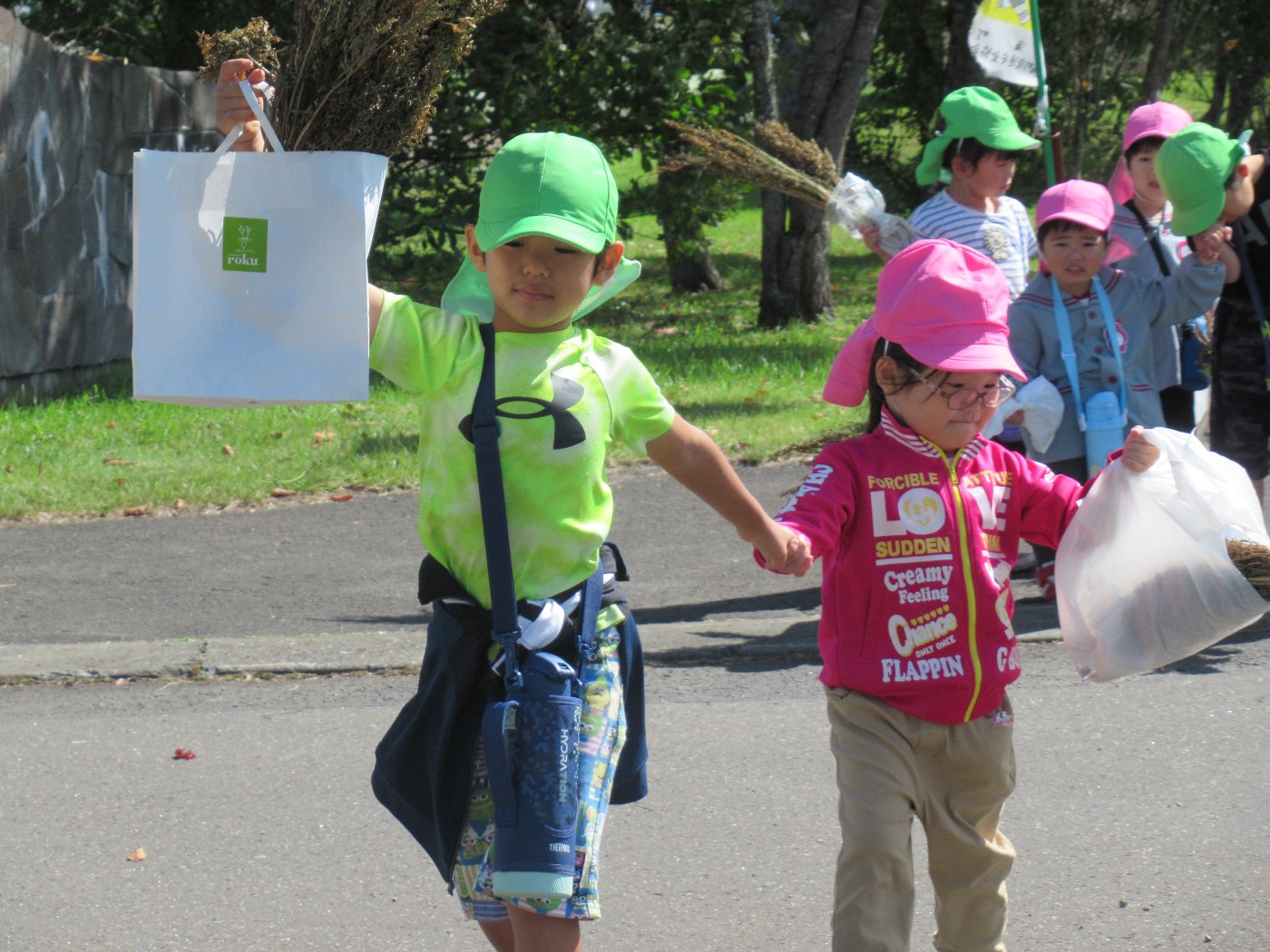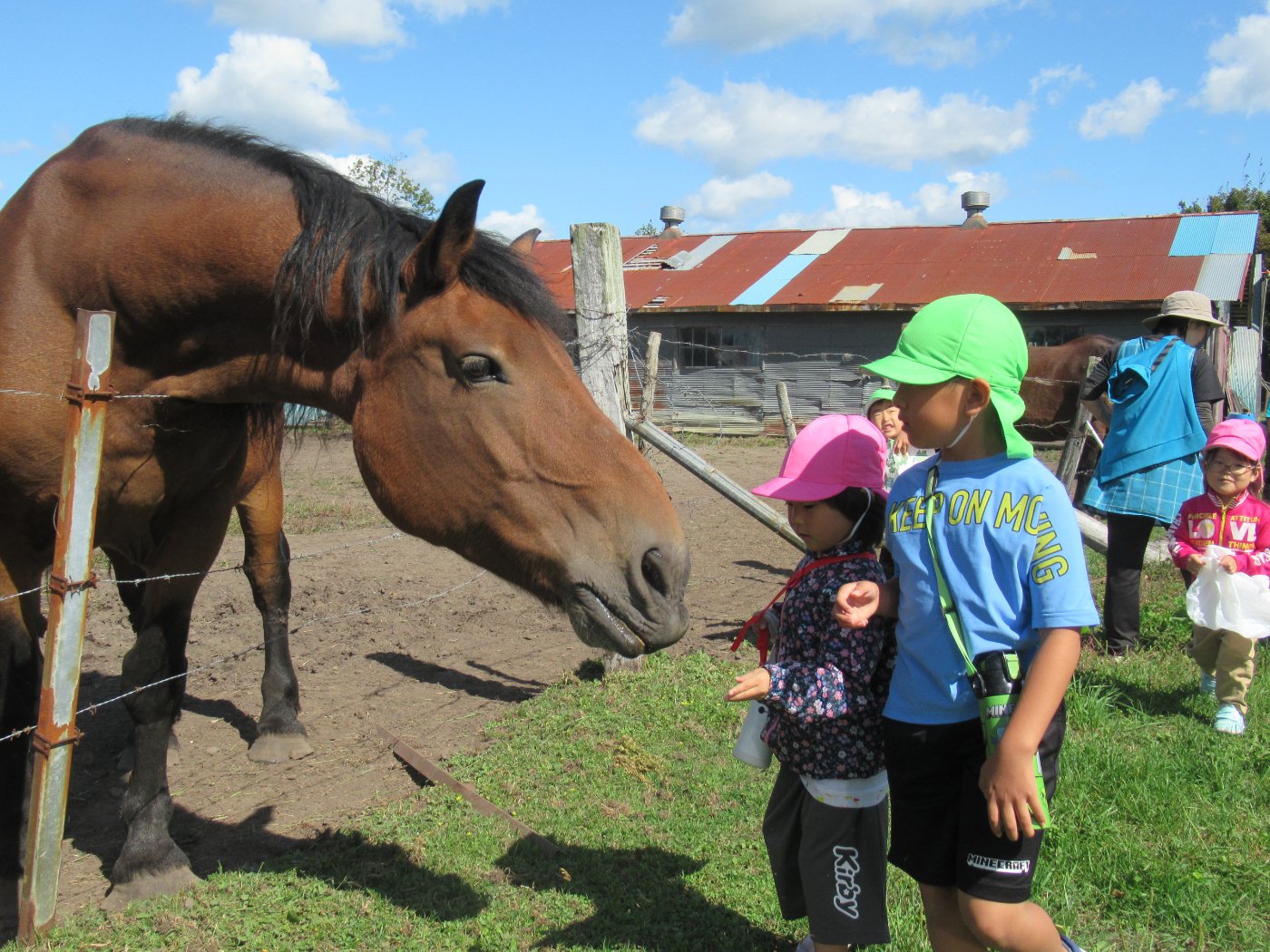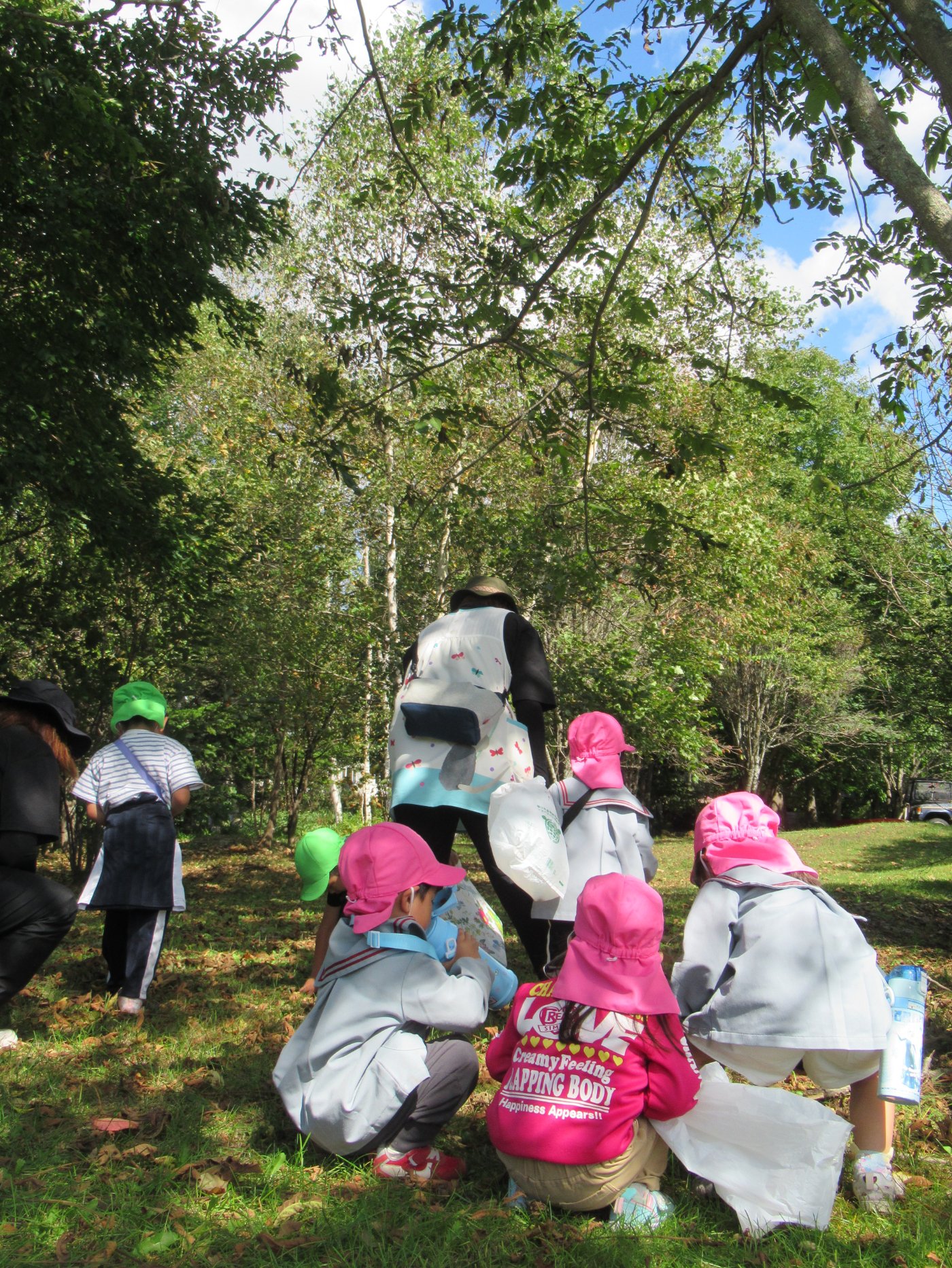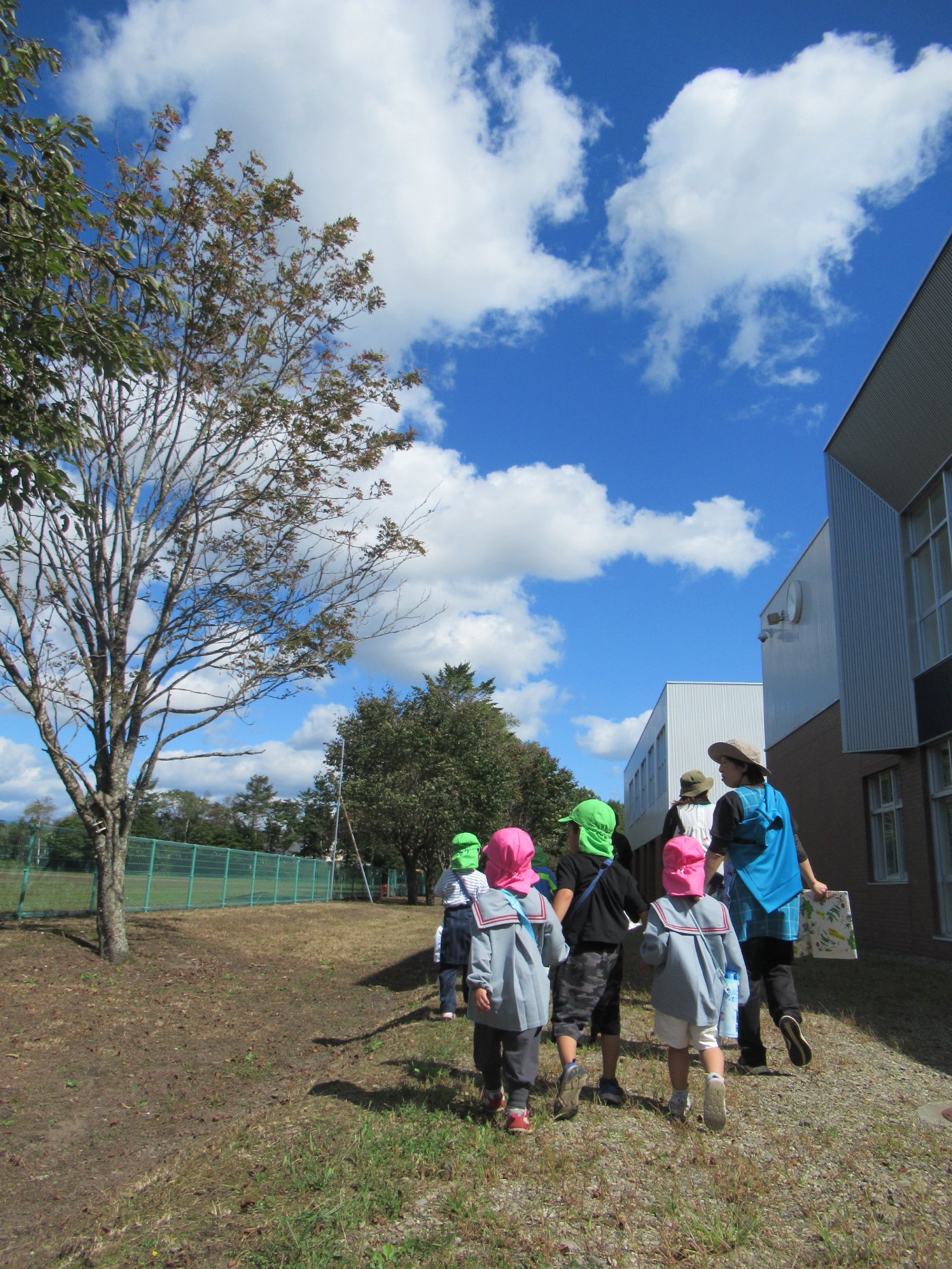 つくし組外の教職員も交代で総合実習を参観するため、いちご組・たけのこ組は合同で朝の会をしたり、園外散策に出掛けたりしました。幼稚園から5分ほど歩いた所にある牧場に馬を見に行こう!と、収穫後に干しておいたニンジンの葉を携えて行ってきました。馬との触れ合いに慣れている子もいれば、間近に見る大きさに驚いている子もいましたが、次々と自分たちのところまで駆け寄ってきてニンジンの葉を美味しそうに食べてくれる馬の姿には癒されたようです。その後は、中学校裏から鉄道公園、スケートリンクへとぐるりと回って散策しました。少し涼しくなった風を感じながら、木の実を拾い集めたり、キノコや枝付きの木の葉を発見したり、様々な秋の自然を堪能していた子ども達です。