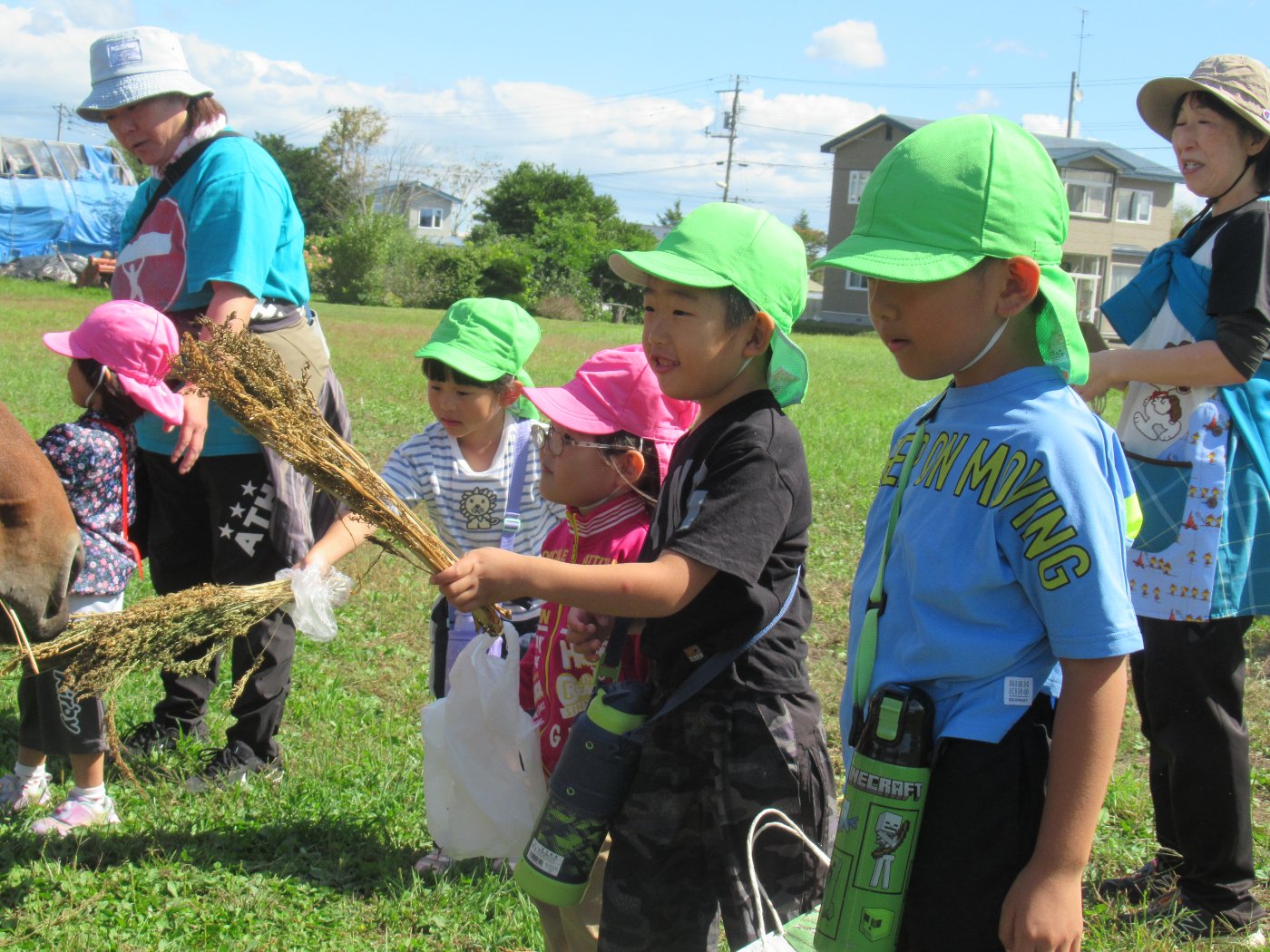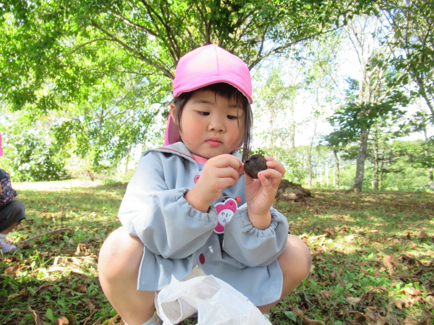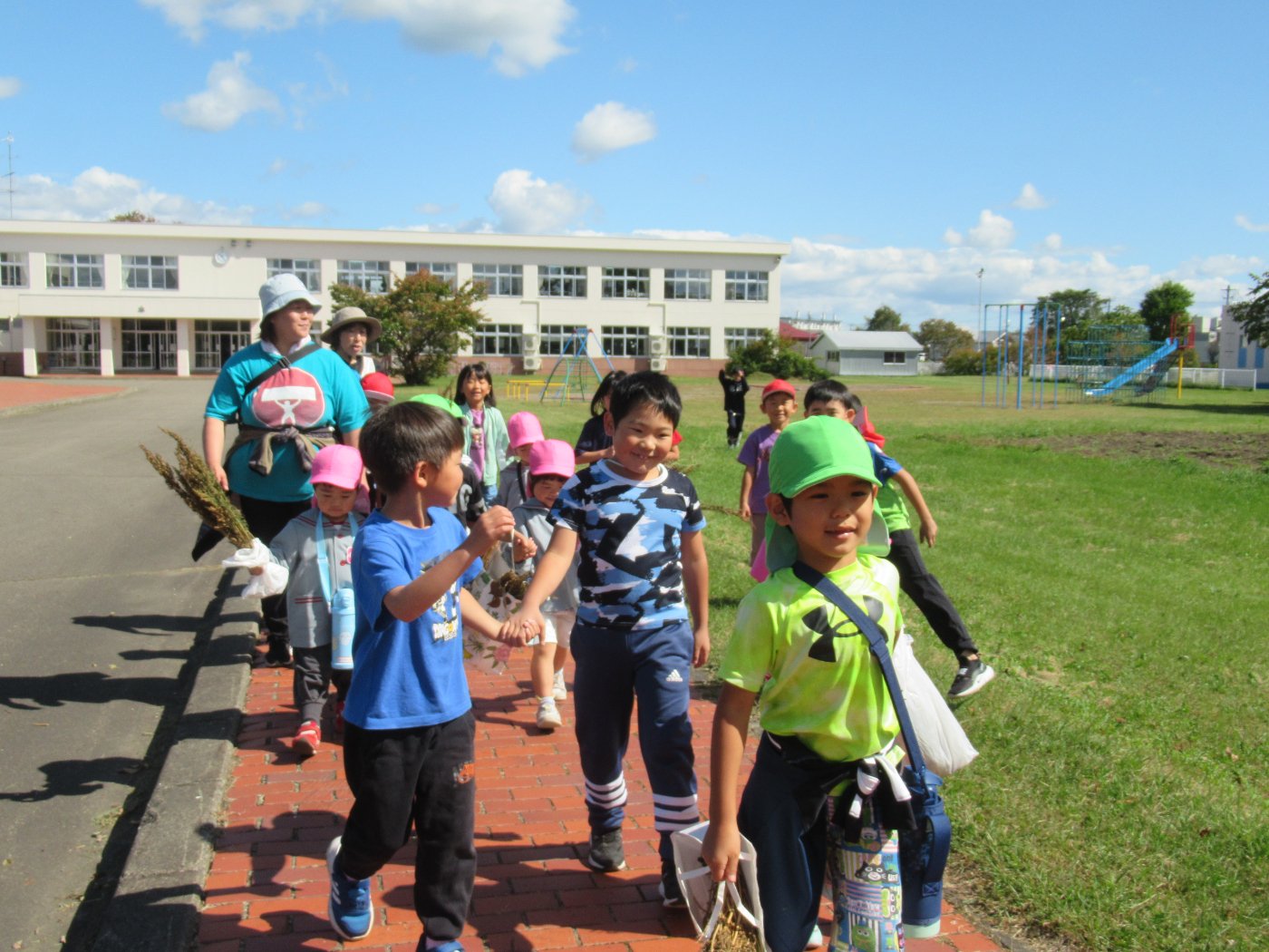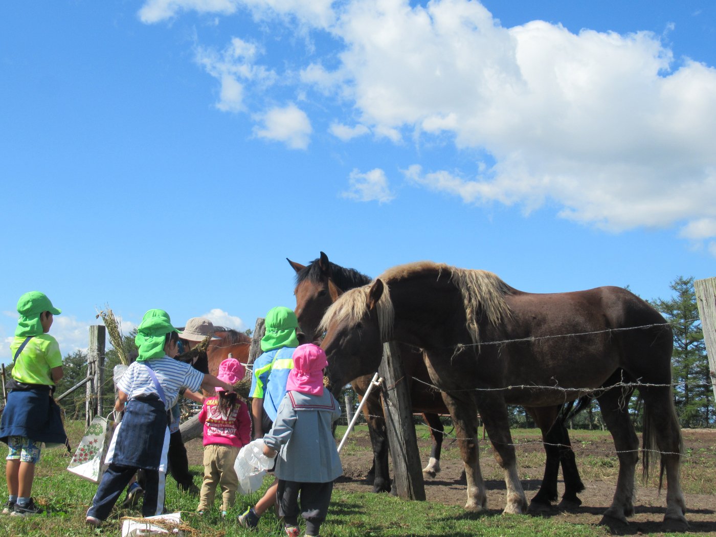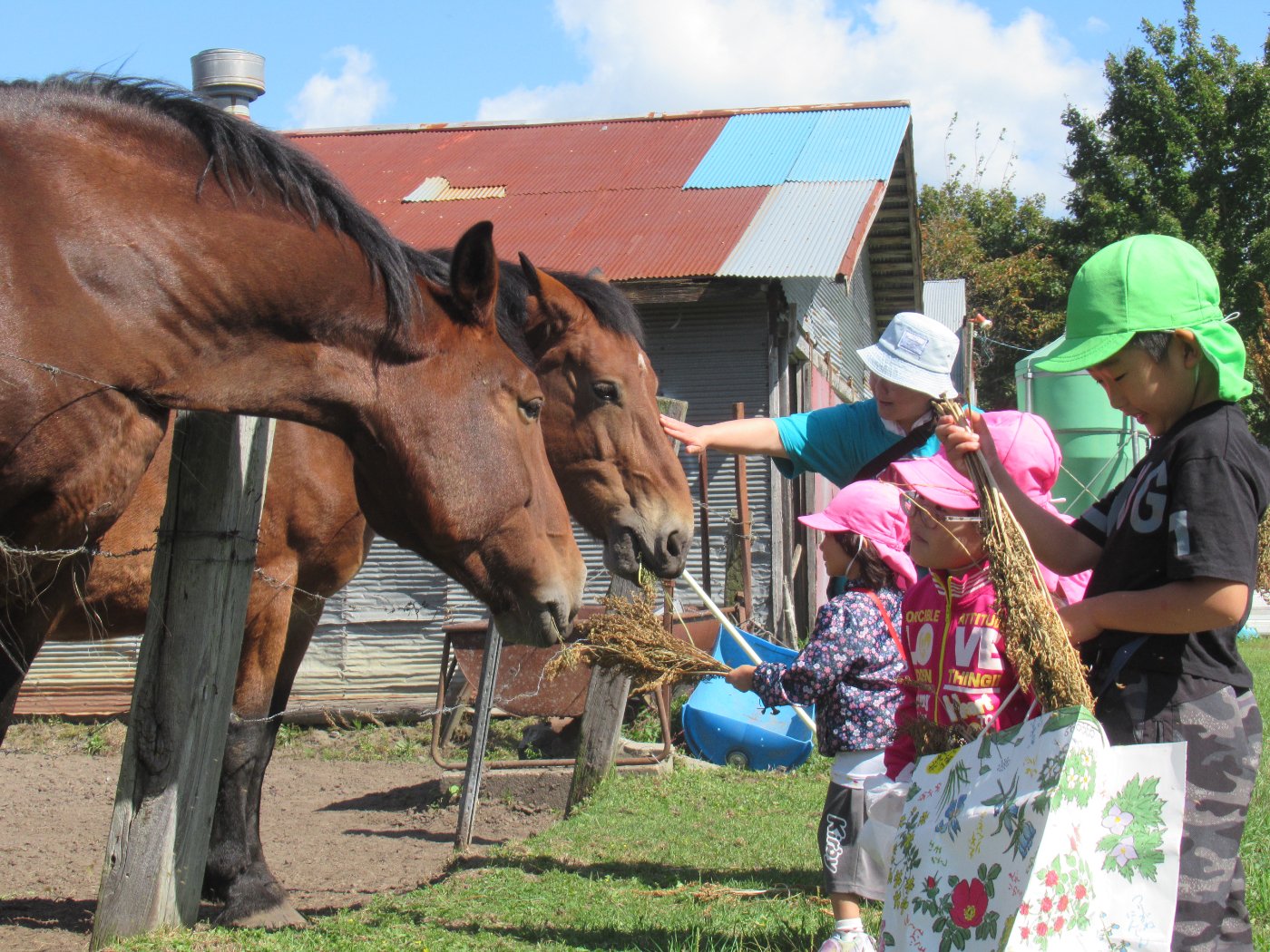 つくし組外の教職員も交代で総合実習を参観するため、いちご組・たけのこ組は合同で朝の会をしたり、園外散策に出掛けたりしました。幼稚園から5分ほど歩いた所にある牧場に馬を見に行こう!と、収穫後に干しておいたニンジンの葉を携えて行ってきました。馬との触れ合いに慣れている子もいれば、間近に見る大きさに驚いている子もいましたが、次々と自分たちのところまで駆け寄ってきてニンジンの葉を美味しそうに食べてくれる馬の姿には癒されたようです。その後は、中学校裏から鉄道公園、スケートリンクへとぐるりと回って散策しました。少し涼しくなった風を感じながら、木の実を拾い集めたり、キノコや枝付きの木の葉を発見したり、様々な秋の自然を堪能していた子ども達です。
