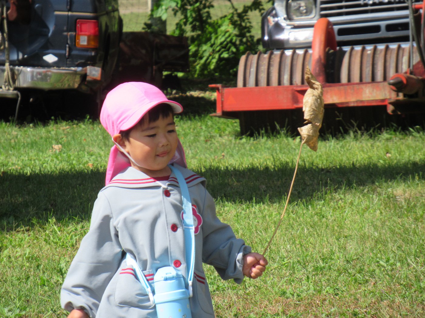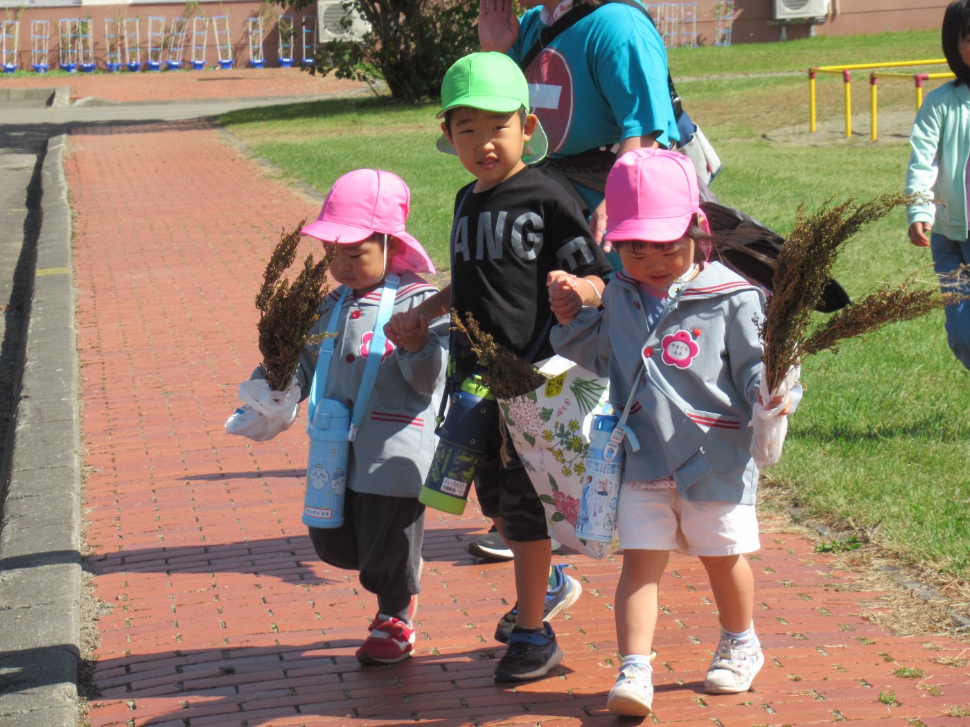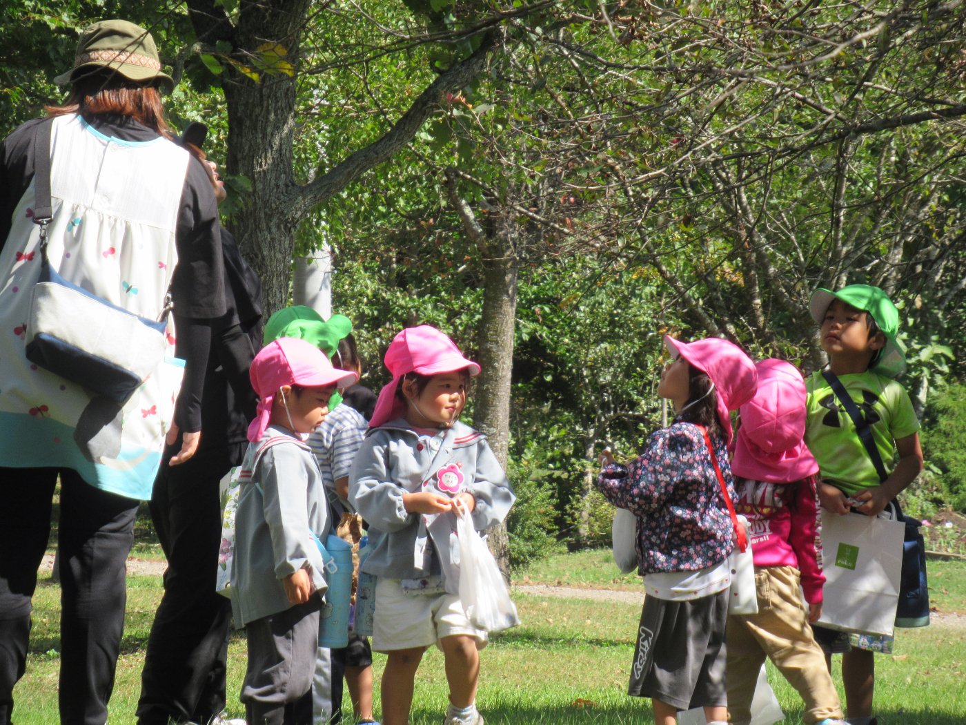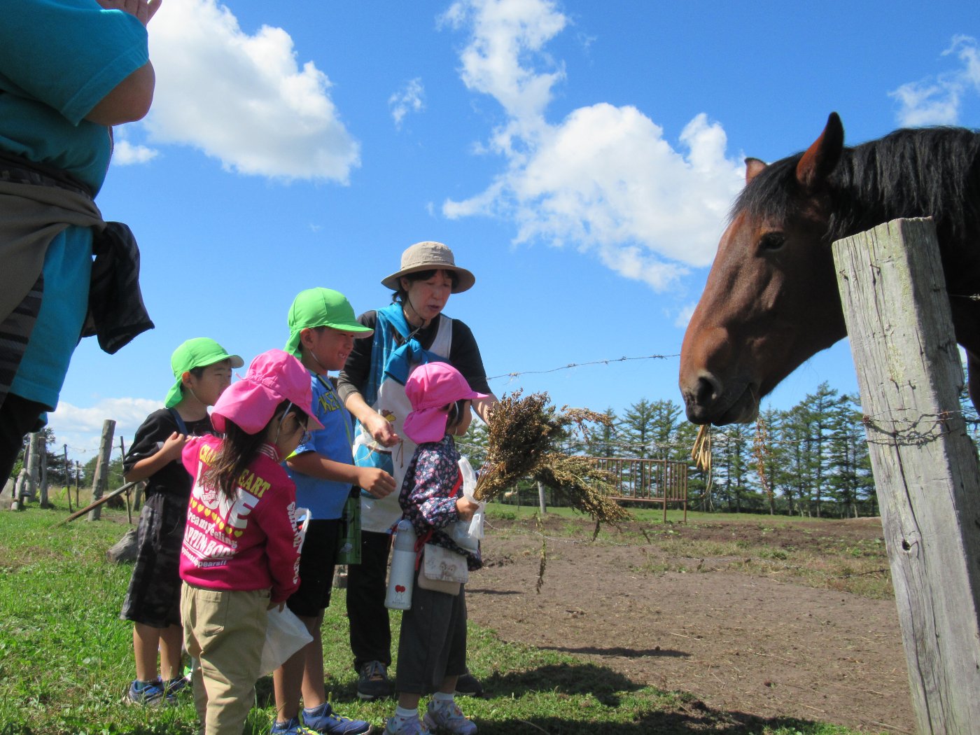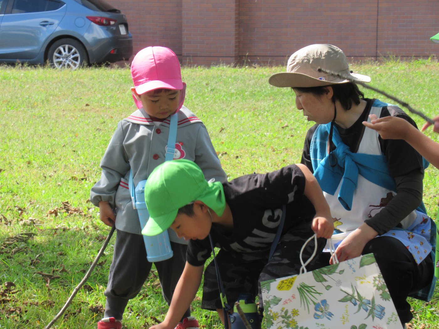 つくし組外の教職員も交代で総合実習を参観するため、いちご組・たけのこ組は合同で朝の会をしたり、園外散策に出掛けたりしました。幼稚園から5分ほど歩いた所にある牧場に馬を見に行こう!と、収穫後に干しておいたニンジンの葉を携えて行ってきました。馬との触れ合いに慣れている子もいれば、間近に見る大きさに驚いている子もいましたが、次々と自分たちのところまで駆け寄ってきてニンジンの葉を美味しそうに食べてくれる馬の姿には癒されたようです。その後は、中学校裏から鉄道公園、スケートリンクへとぐるりと回って散策しました。少し涼しくなった風を感じながら、木の実を拾い集めたり、キノコや枝付きの木の葉を発見したり、様々な秋の自然を堪能していた子ども達です。