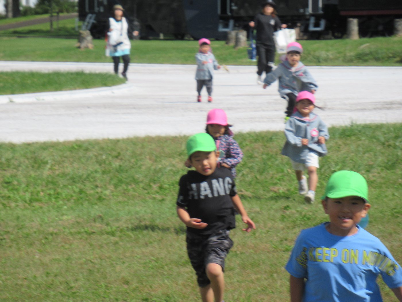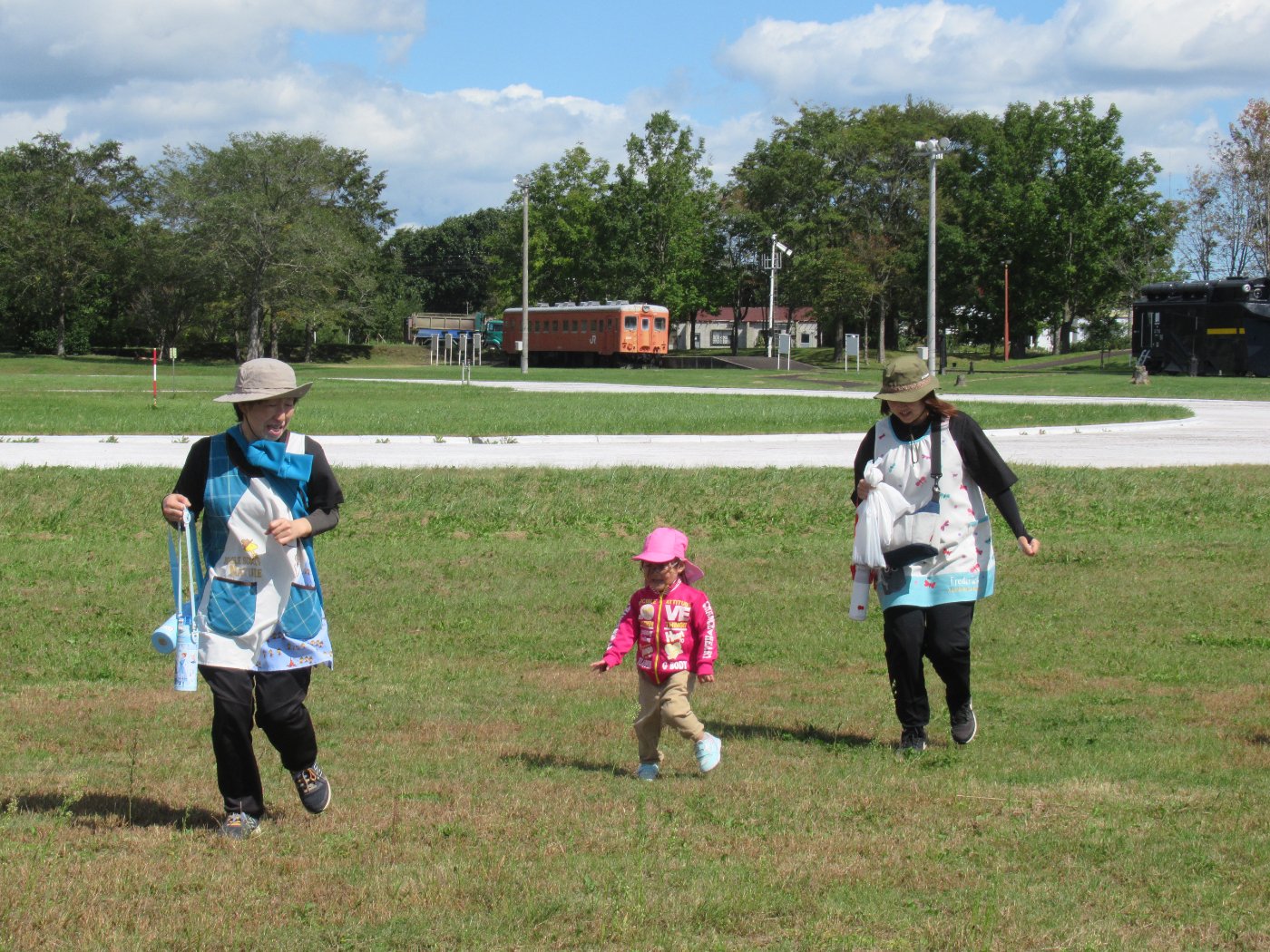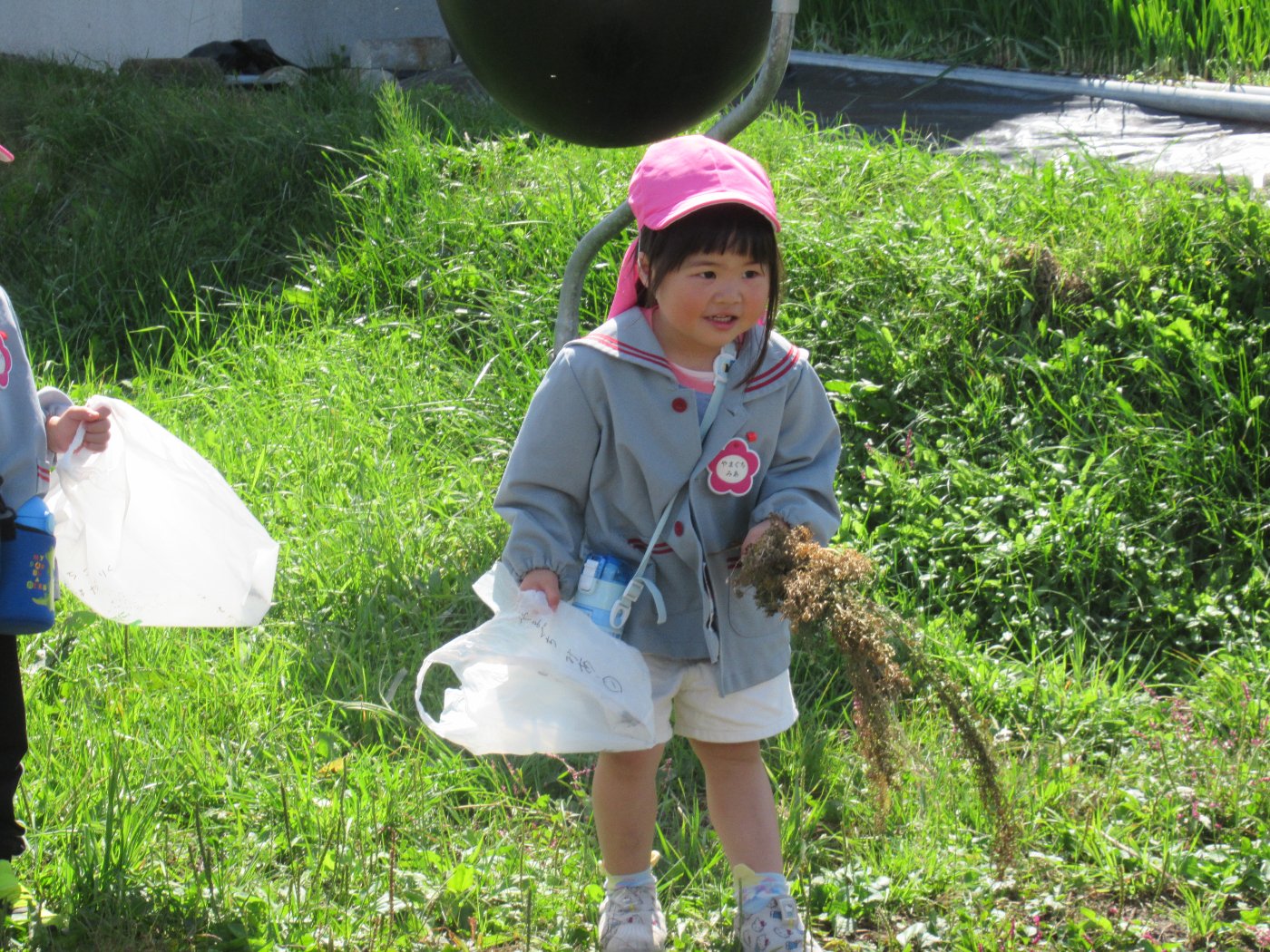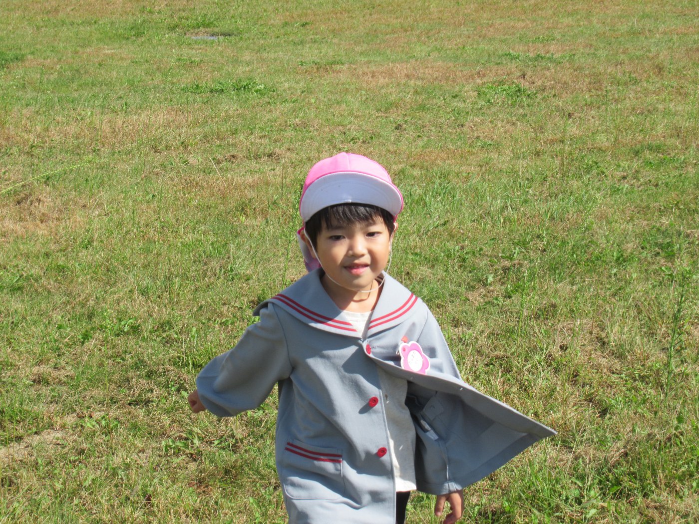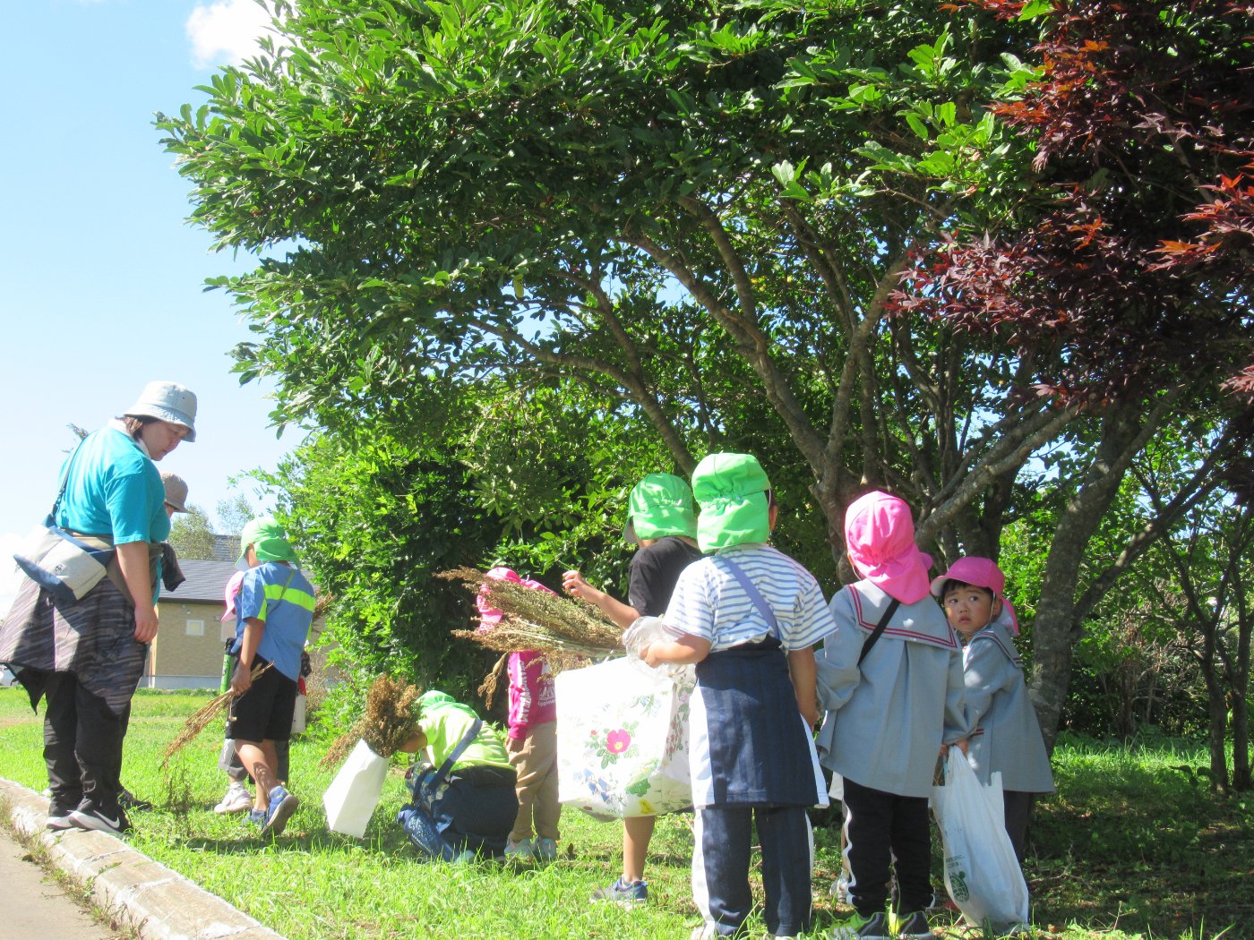 つくし組外の教職員も交代で総合実習を参観するため、いちご組・たけのこ組は合同で朝の会をしたり、園外散策に出掛けたりしました。幼稚園から5分ほど歩いた所にある牧場に馬を見に行こう!と、収穫後に干しておいたニンジンの葉を携えて行ってきました。馬との触れ合いに慣れている子もいれば、間近に見る大きさに驚いている子もいましたが、次々と自分たちのところまで駆け寄ってきてニンジンの葉を美味しそうに食べてくれる馬の姿には癒されたようです。その後は、中学校裏から鉄道公園、スケートリンクへとぐるりと回って散策しました。少し涼しくなった風を感じながら、木の実を拾い集めたり、キノコや枝付きの木の葉を発見したり、様々な秋の自然を堪能していた子ども達です。