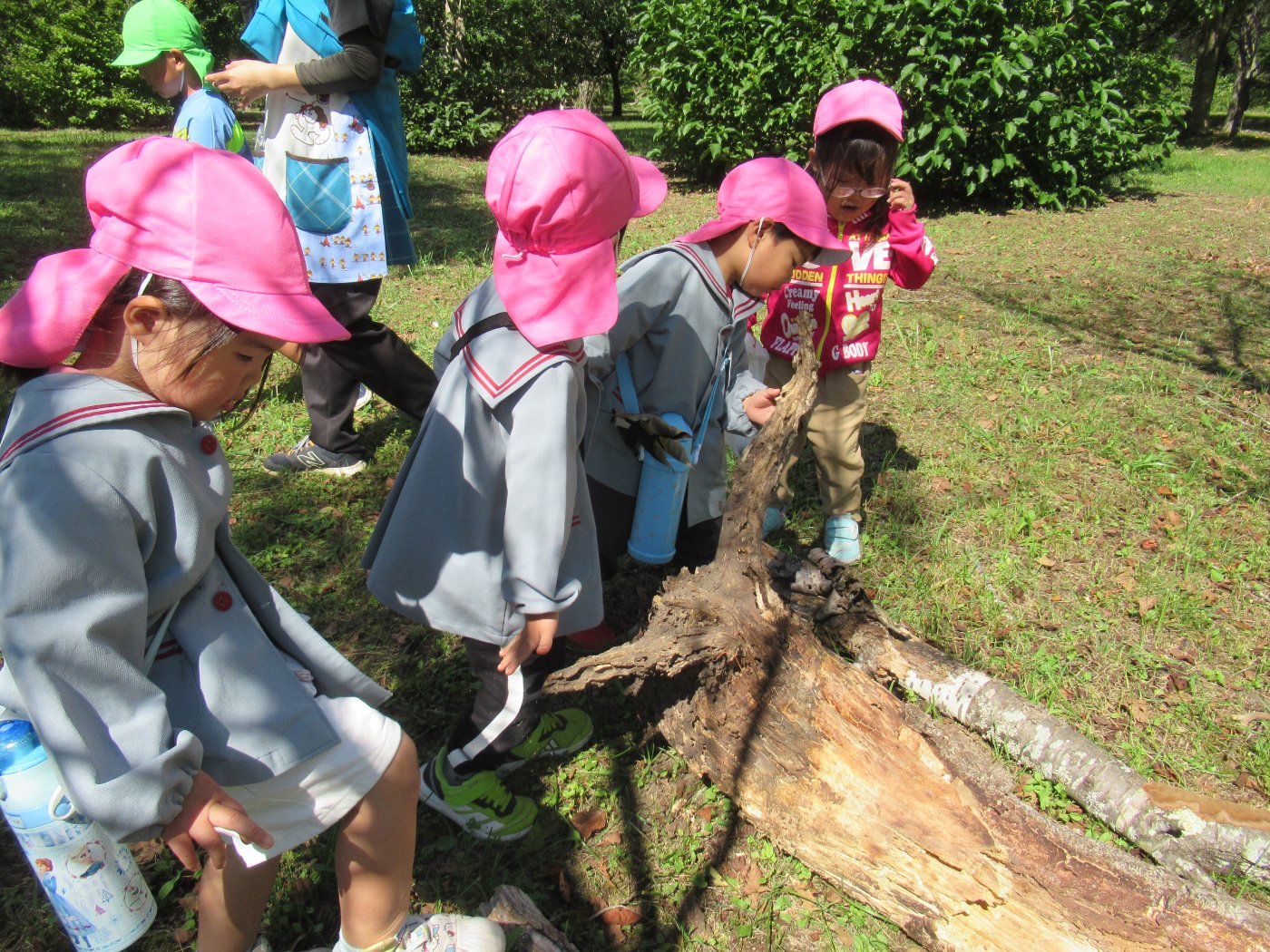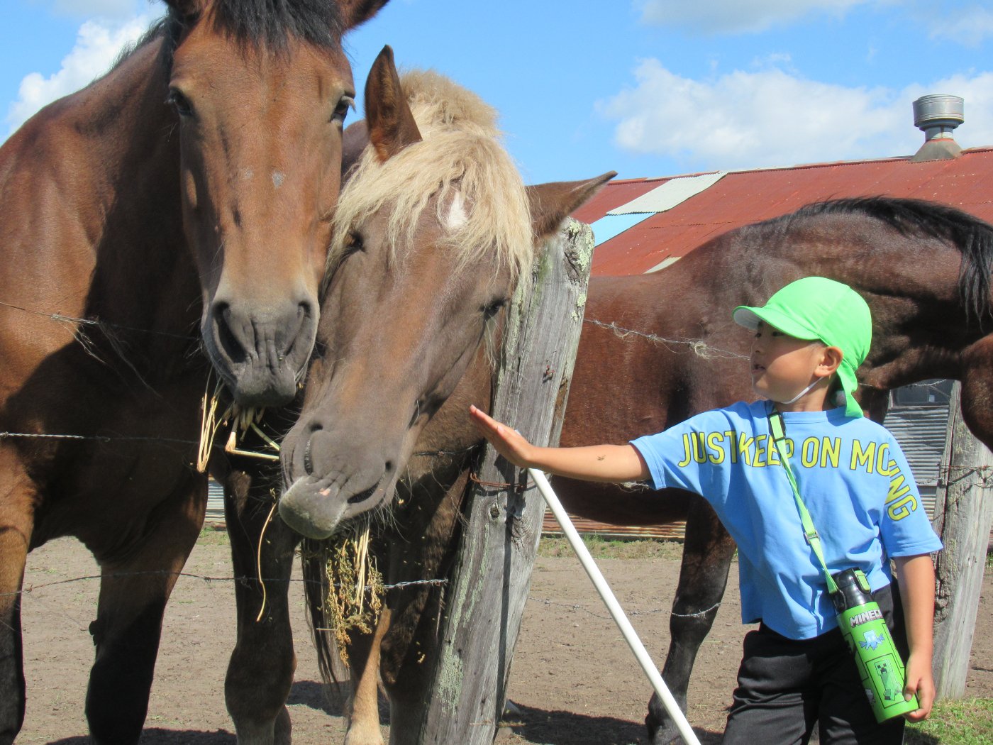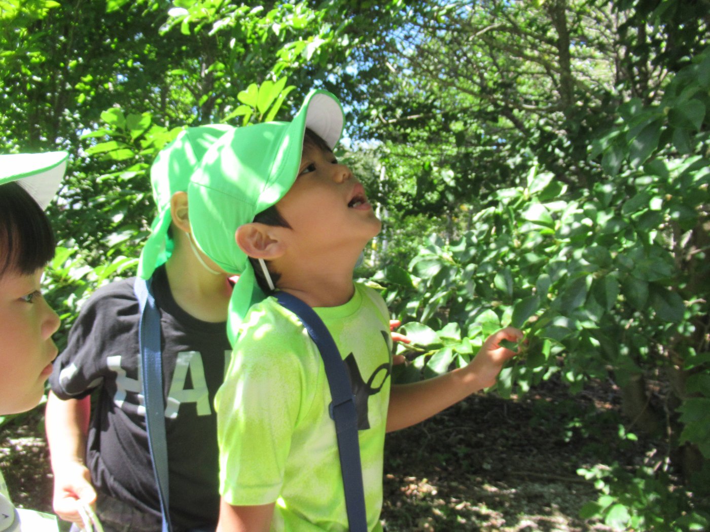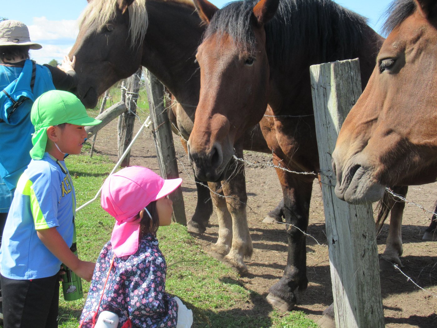 つくし組外の教職員も交代で総合実習を参観するため、いちご組・たけのこ組は合同で朝の会をしたり、園外散策に出掛けたりしました。幼稚園から5分ほど歩いた所にある牧場に馬を見に行こう!と、収穫後に干しておいたニンジンの葉を携えて行ってきました。馬との触れ合いに慣れている子もいれば、間近に見る大きさに驚いている子もいましたが、次々と自分たちのところまで駆け寄ってきてニンジンの葉を美味しそうに食べてくれる馬の姿には癒されたようです。その後は、中学校裏から鉄道公園、スケートリンクへとぐるりと回って散策しました。少し涼しくなった風を感じながら、木の実を拾い集めたり、キノコや枝付きの木の葉を発見したり、様々な秋の自然を堪能していた子ども達です。