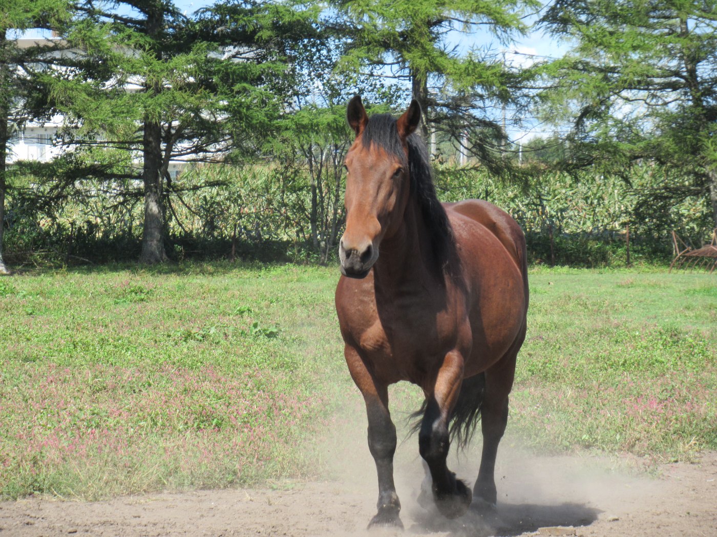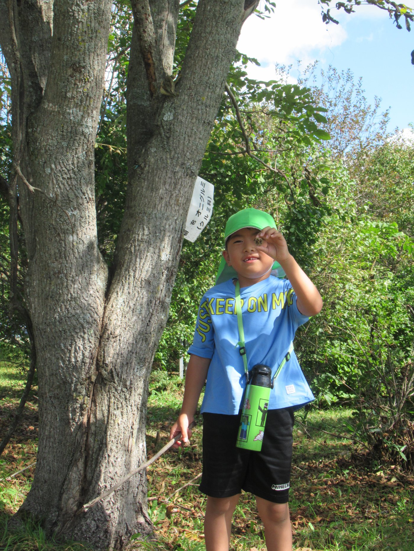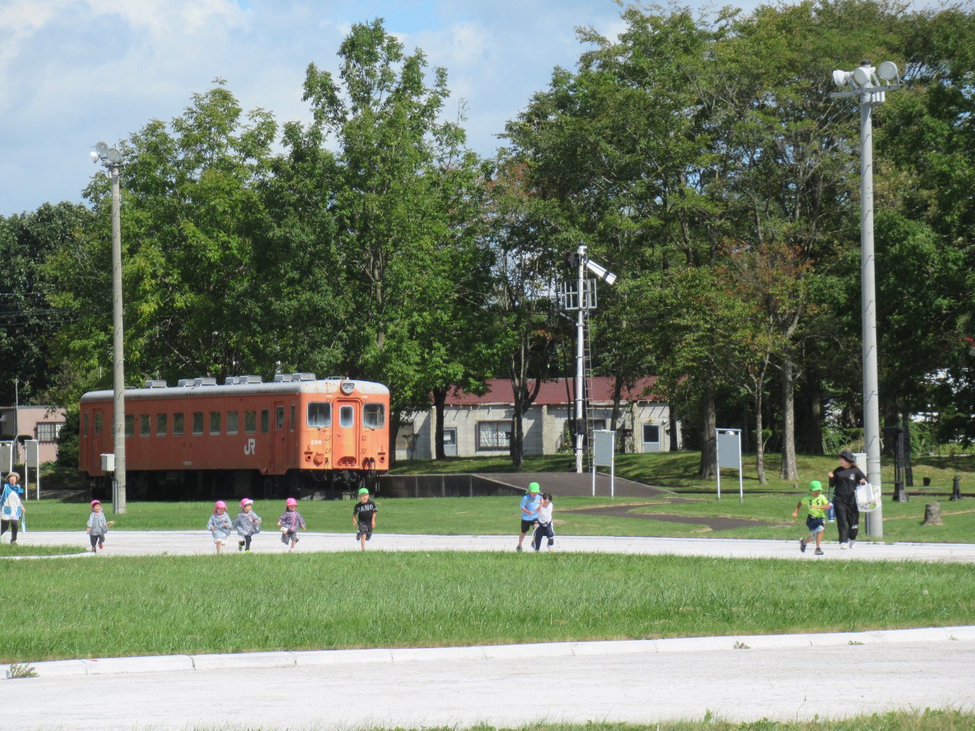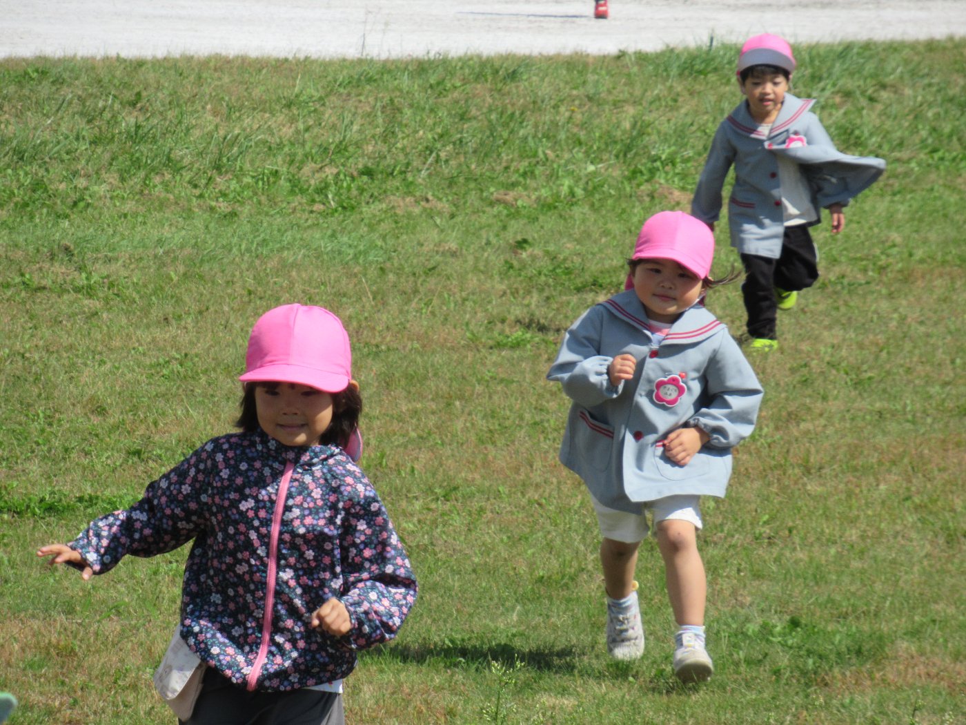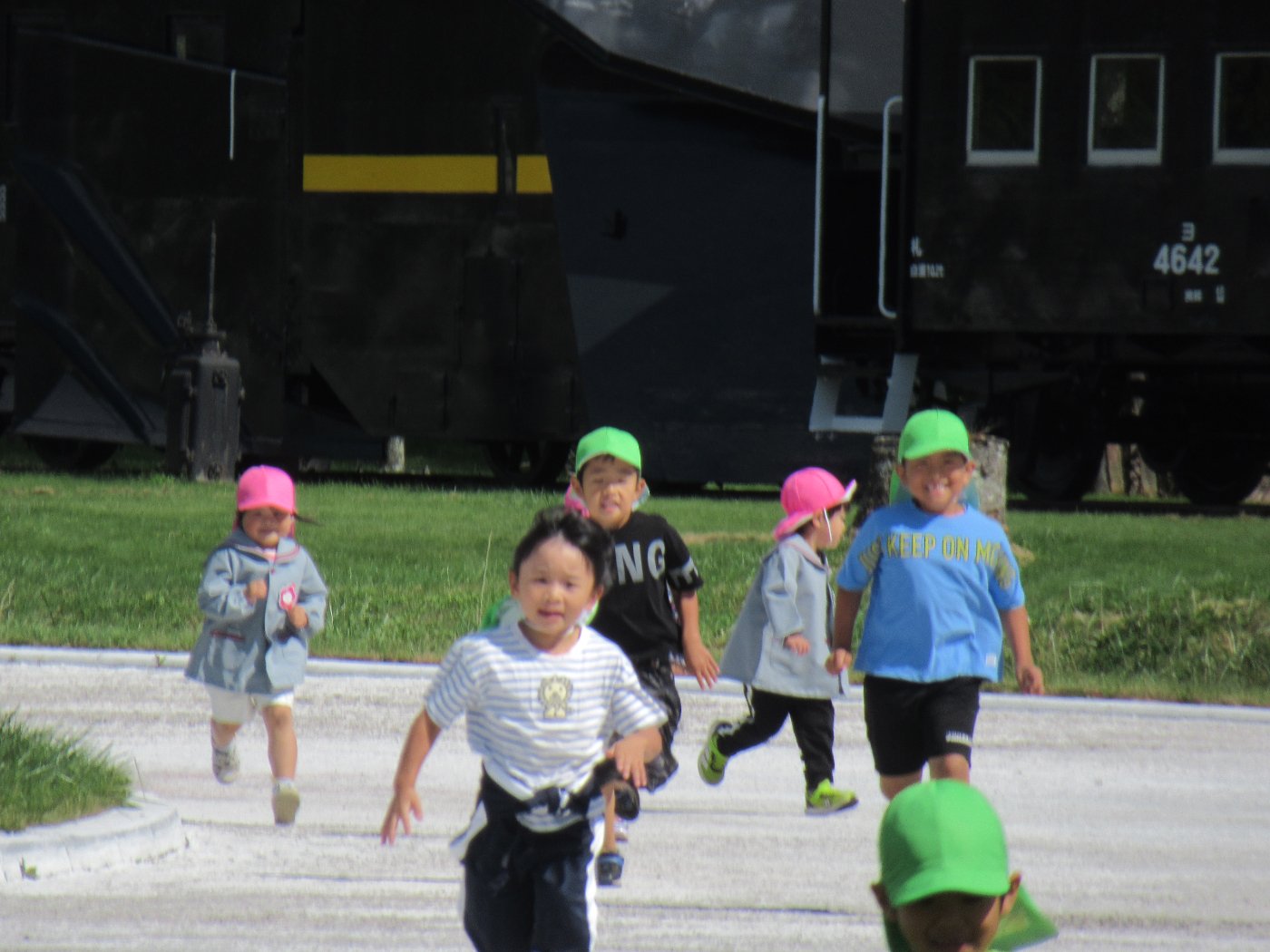 つくし組外の教職員も交代で総合実習を参観するため、いちご組・たけのこ組は合同で朝の会をしたり、園外散策に出掛けたりしました。幼稚園から5分ほど歩いた所にある牧場に馬を見に行こう!と、収穫後に干しておいたニンジンの葉を携えて行ってきました。馬との触れ合いに慣れている子もいれば、間近に見る大きさに驚いている子もいましたが、次々と自分たちのところまで駆け寄ってきてニンジンの葉を美味しそうに食べてくれる馬の姿には癒されたようです。その後は、中学校裏から鉄道公園、スケートリンクへとぐるりと回って散策しました。少し涼しくなった風を感じながら、木の実を拾い集めたり、キノコや枝付きの木の葉を発見したり、様々な秋の自然を堪能していた子ども達です。