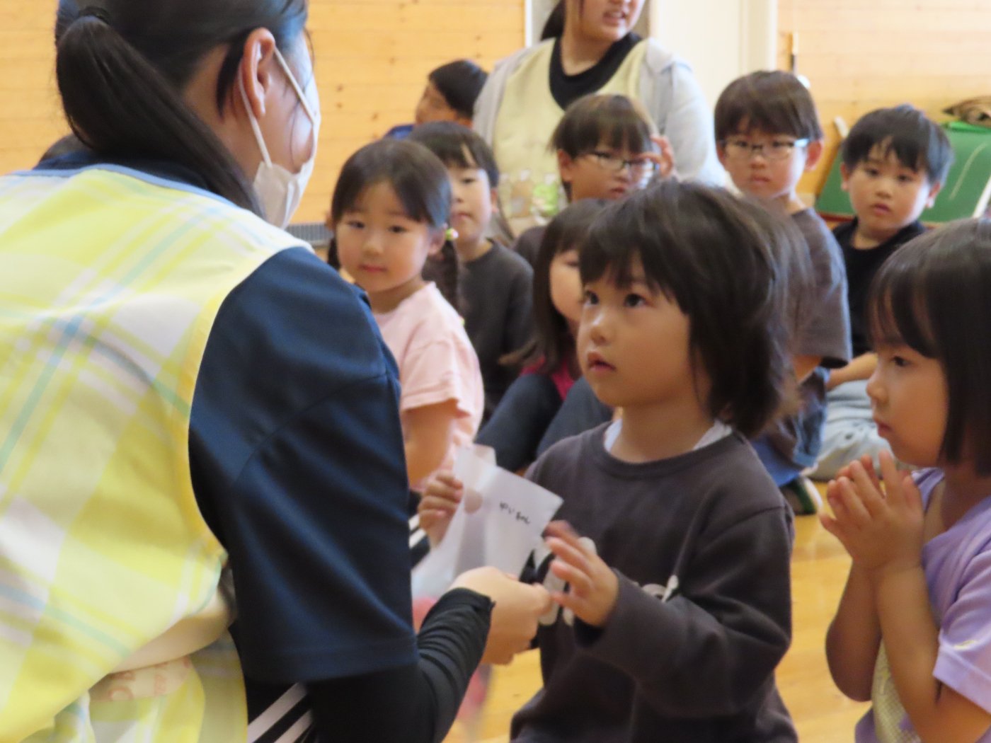 ご家庭で、一人ずつ書(描)いていただいたM先生へのメッセージカードは冊子にし、各クラスの代表園児に手渡してもらいました。手渡す時には何か一言伝えてほしいことをお願いすると、「たくさん遊んでくれてありがとう」「また遊びに来てね」「大好き♪」という言葉を伝えていた代表園児たち。その言葉に感動していたM先生とのやり取りに、気持ちがほっこり温かくなりました。保護者の皆様には、メッセージカードご協力をありがとうございました。