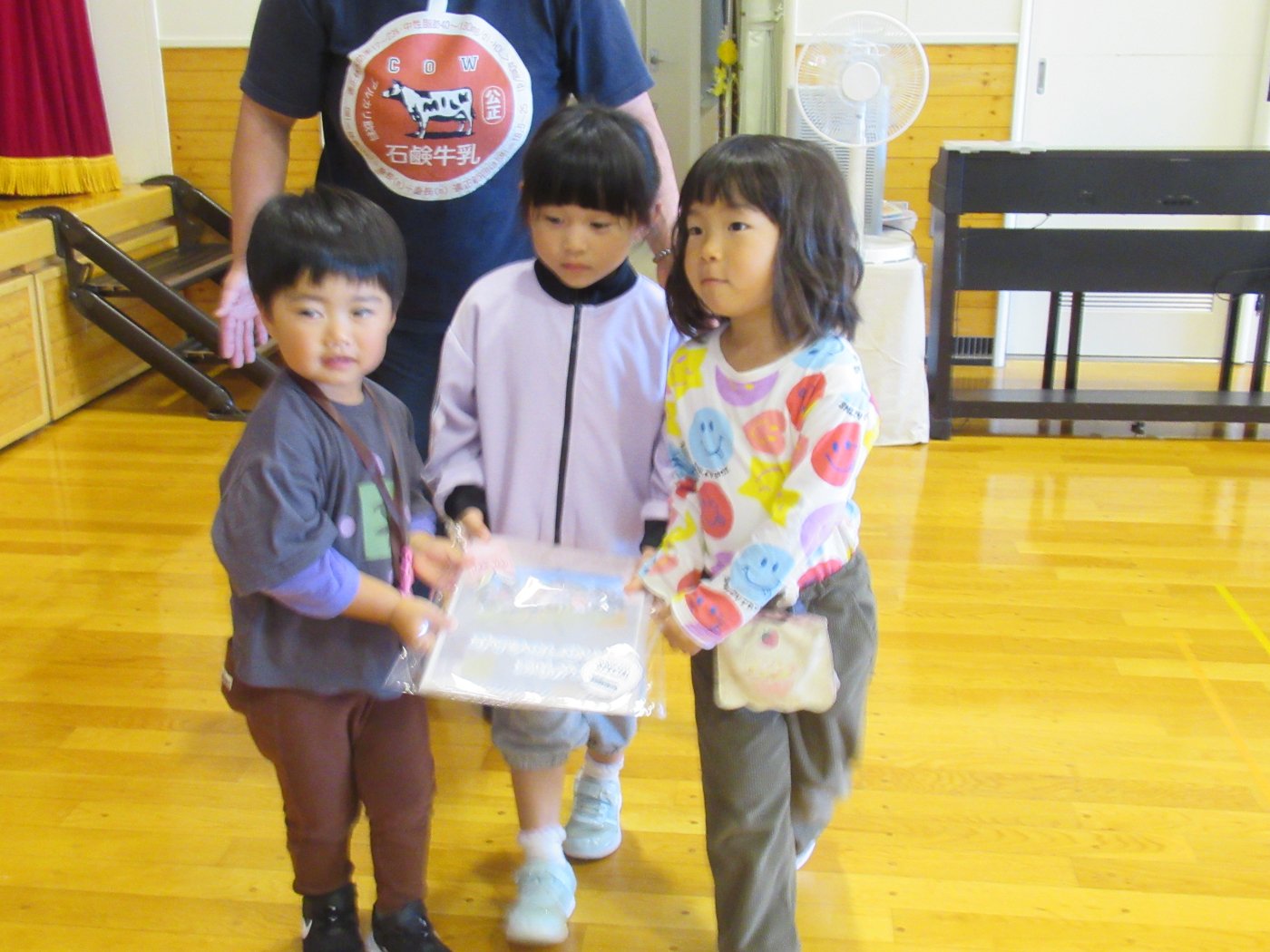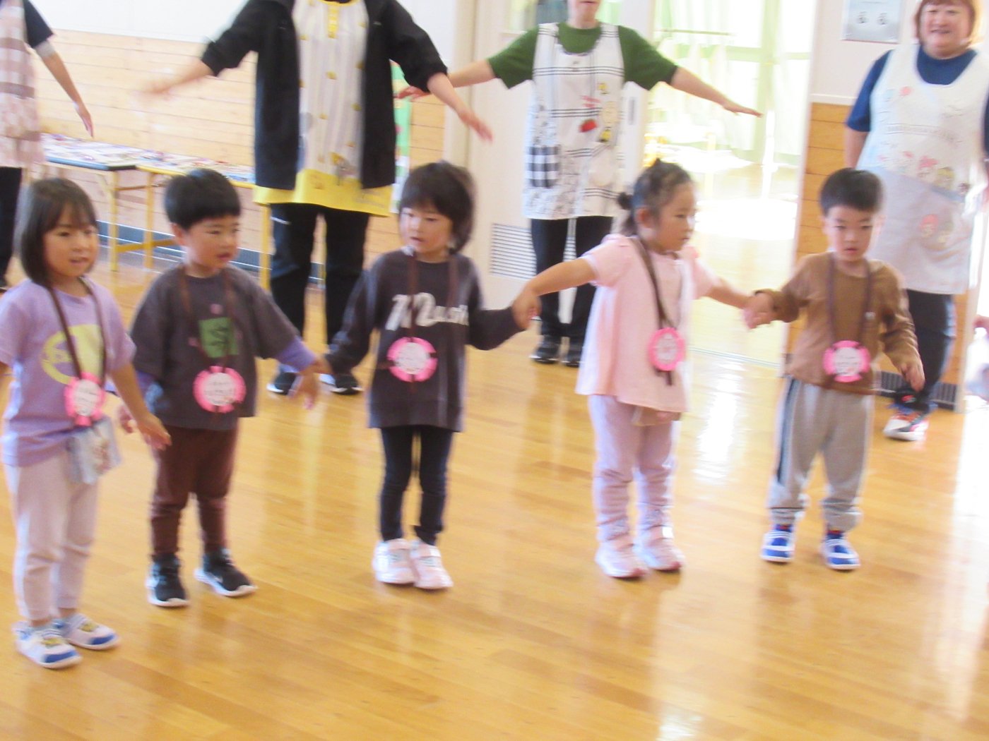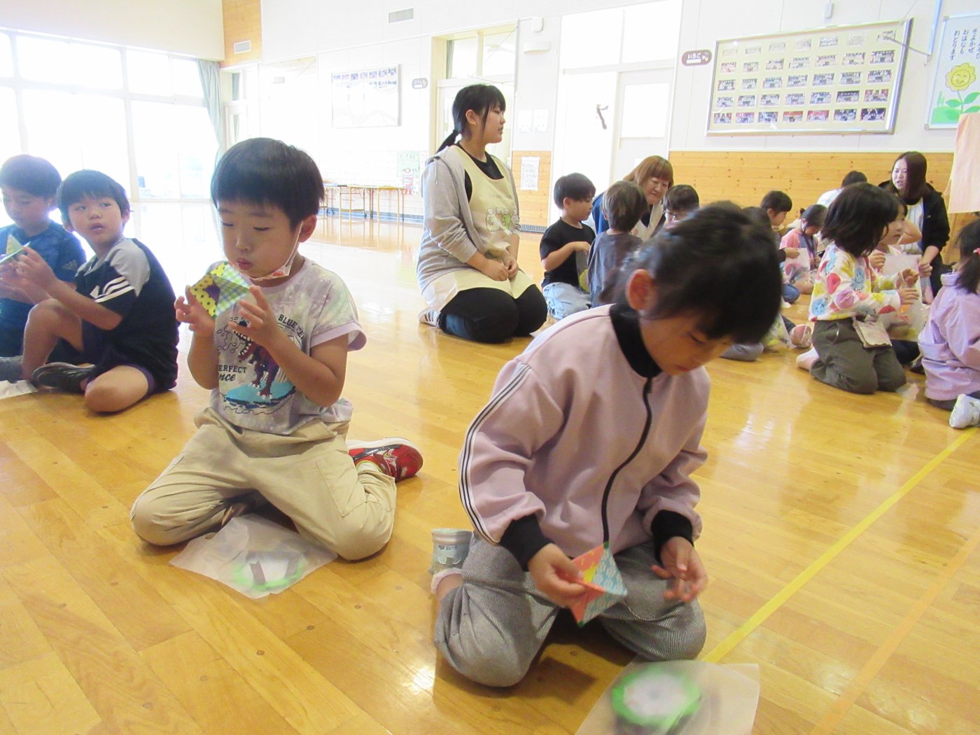 最後の帰りの会では、みんなでプレイルームに集り、お別れ会を行いました。製作が得意なM先生から、手作り絵本を使ってのお別れの挨拶では、その仕掛け(電子レンジに餡子とパンを入れクルクル回すと、手紙を携えたアンパンマンが登場☆彡)にワァ~ッと目を輝かせたり、折り紙で作った『吹き駒コマ』や『メッセージ付きメダル』をプレゼントされ、大喜びの子ども達でした。