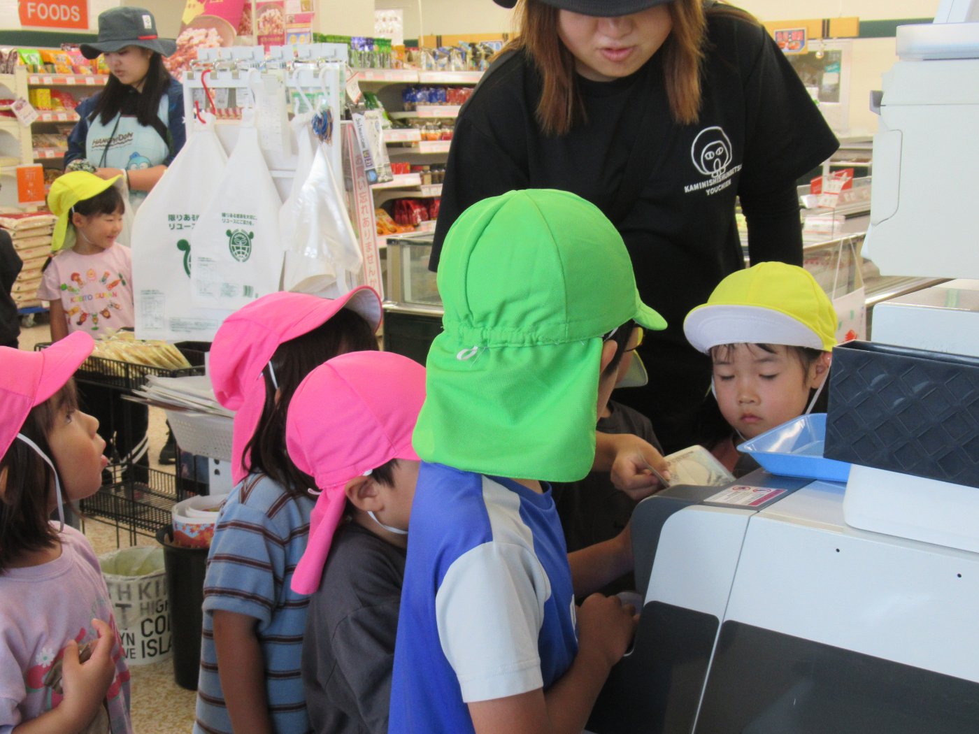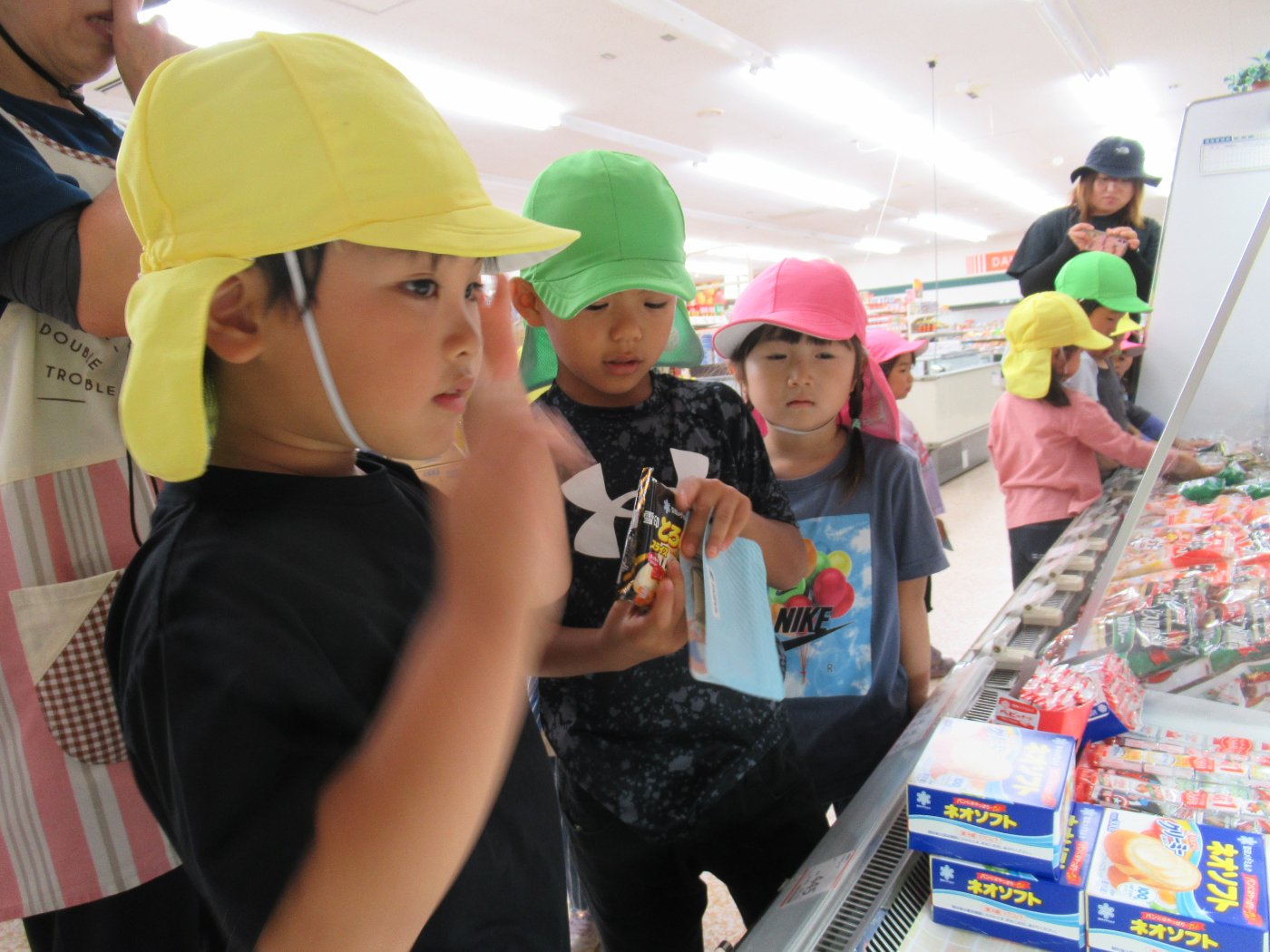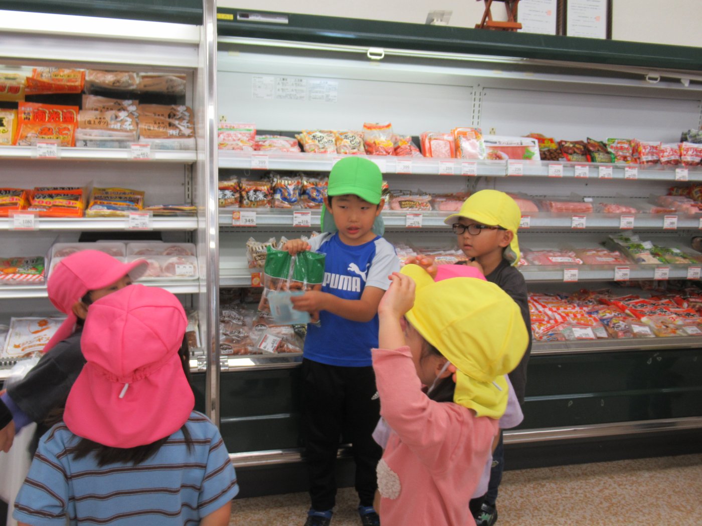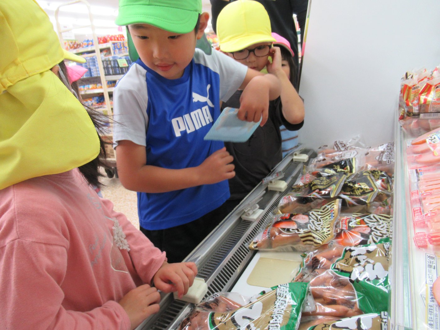山ブドウ狩りの帰りには、ピザ作りに必要な材料(チーズ、コーン、ウィンナー)を買いにAコープに行ってきました。買物といえば、経験者たけのこ組の出番です! 買い出しする3種類の食材チームに分かれ、たけのこ組がいちご組・つくし組をリードしながら買物をしました。