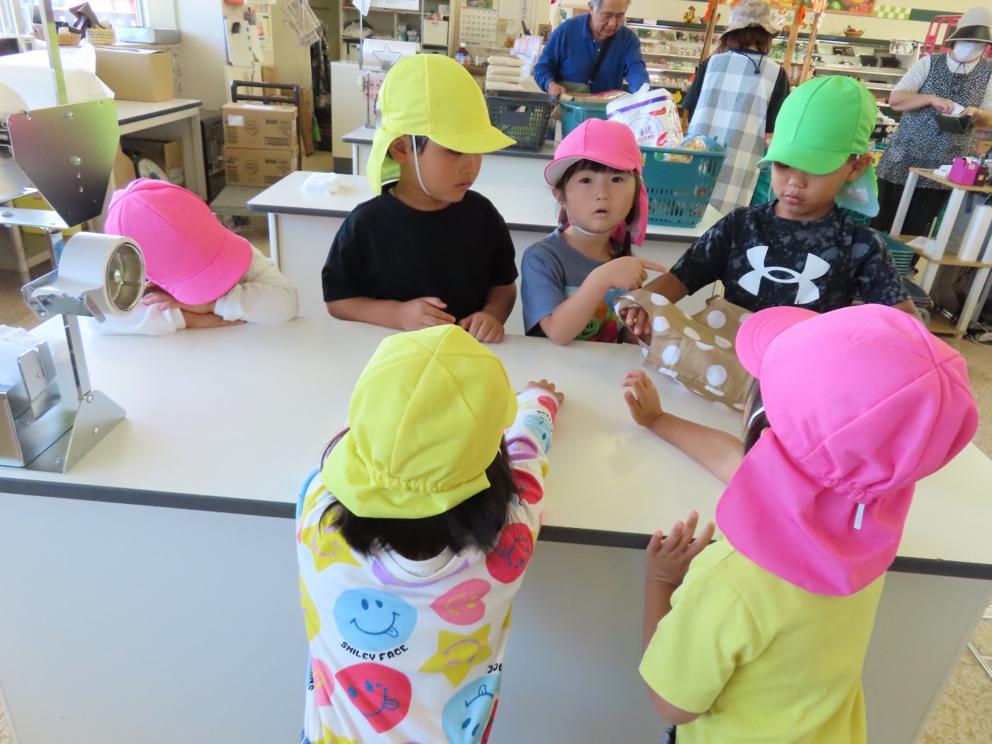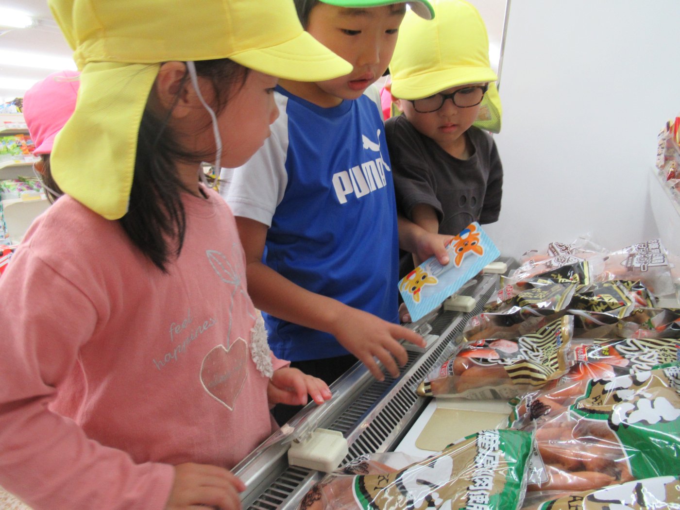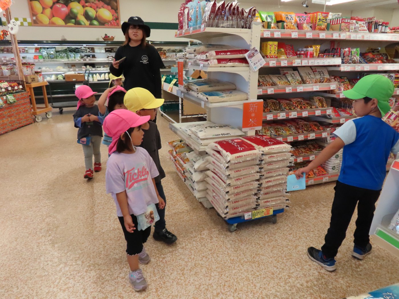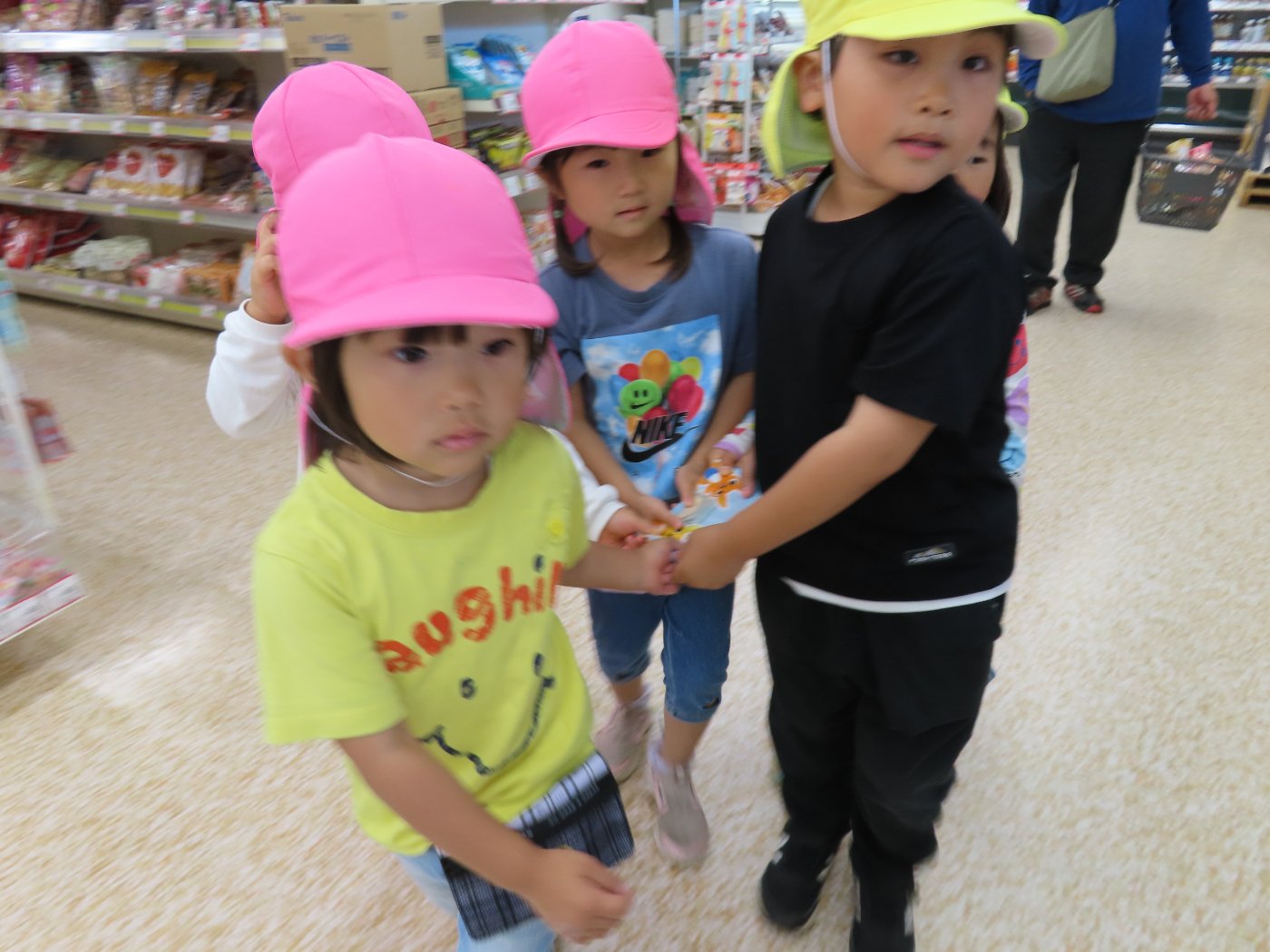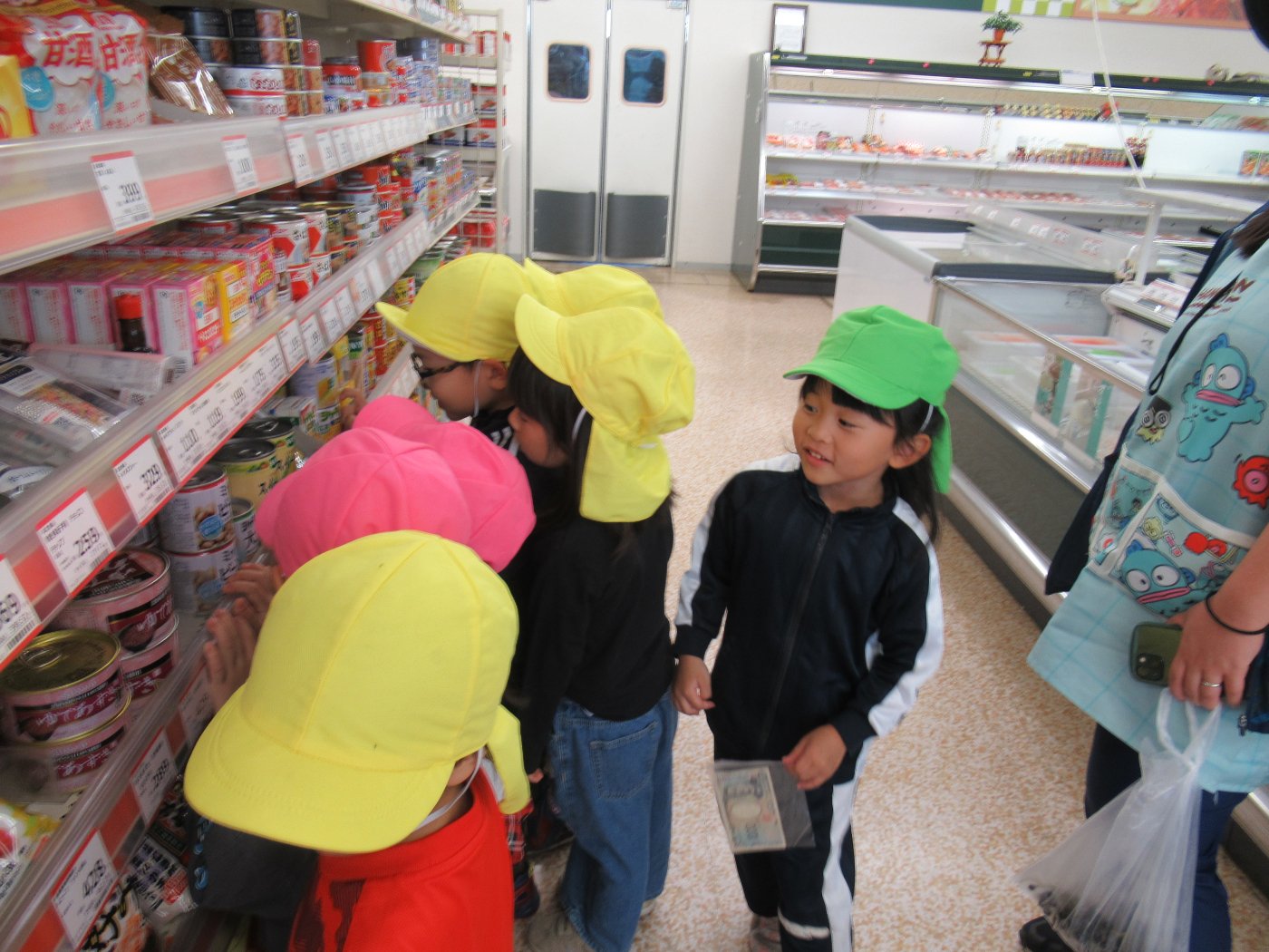 山ブドウ狩りの帰りには、ピザ作りに必要な材料(チーズ、コーン、ウィンナー)を買いにAコープに行ってきました。買物といえば、経験者たけのこ組の出番です! 買い出しする3種類の食材チームに分かれ、たけのこ組がいちご組・つくし組をリードしながら買物をしました。