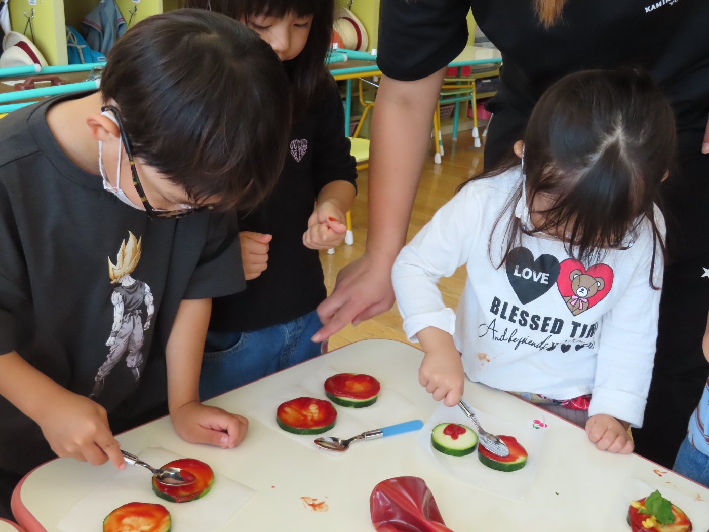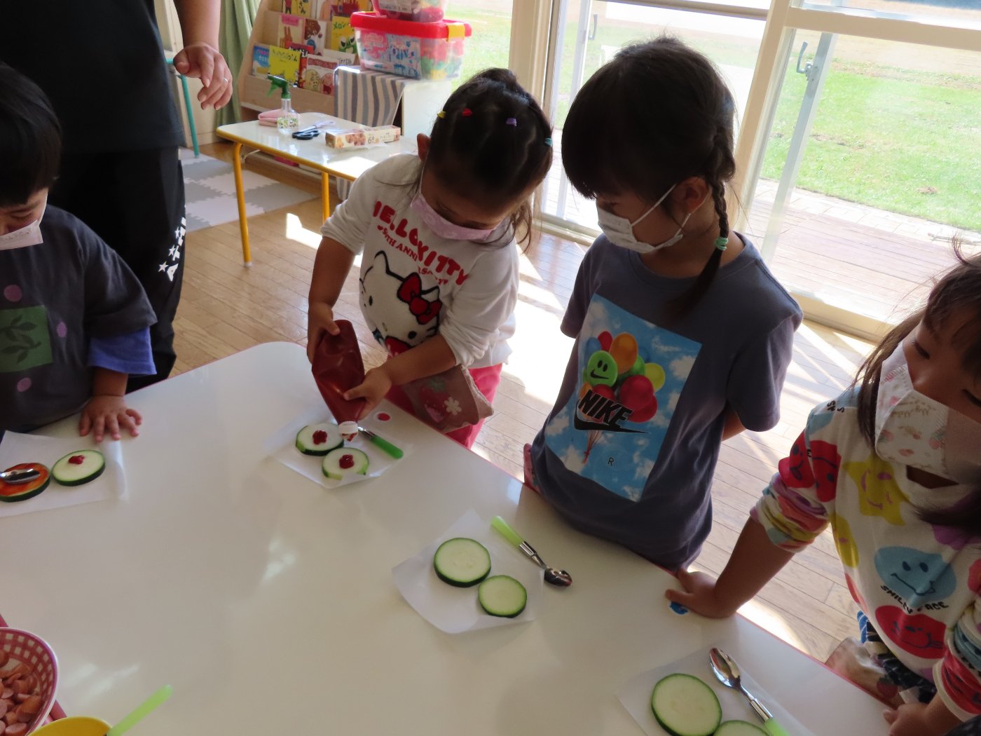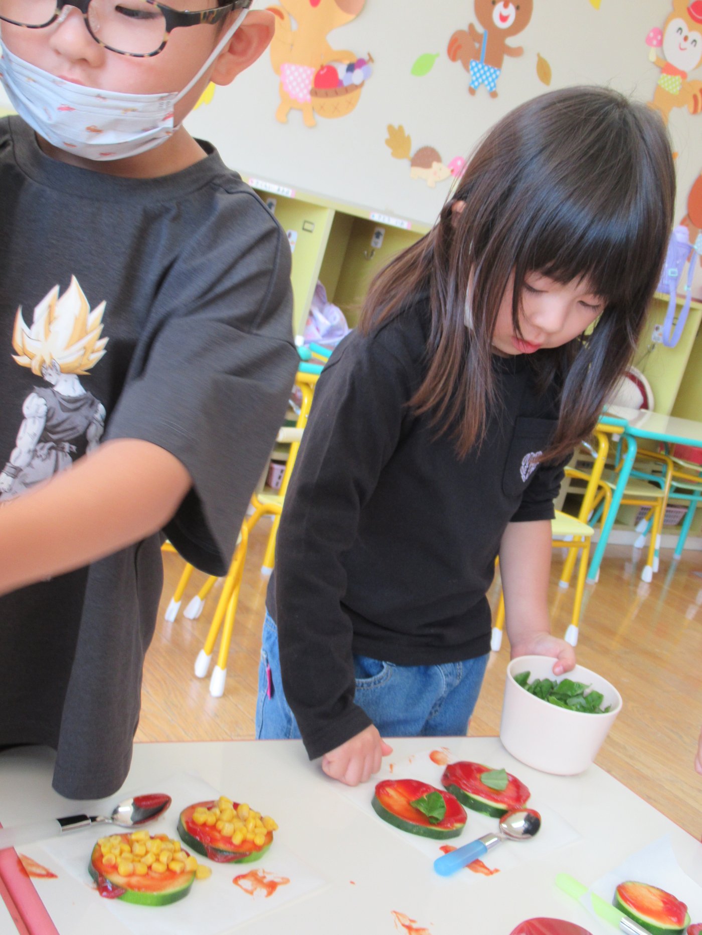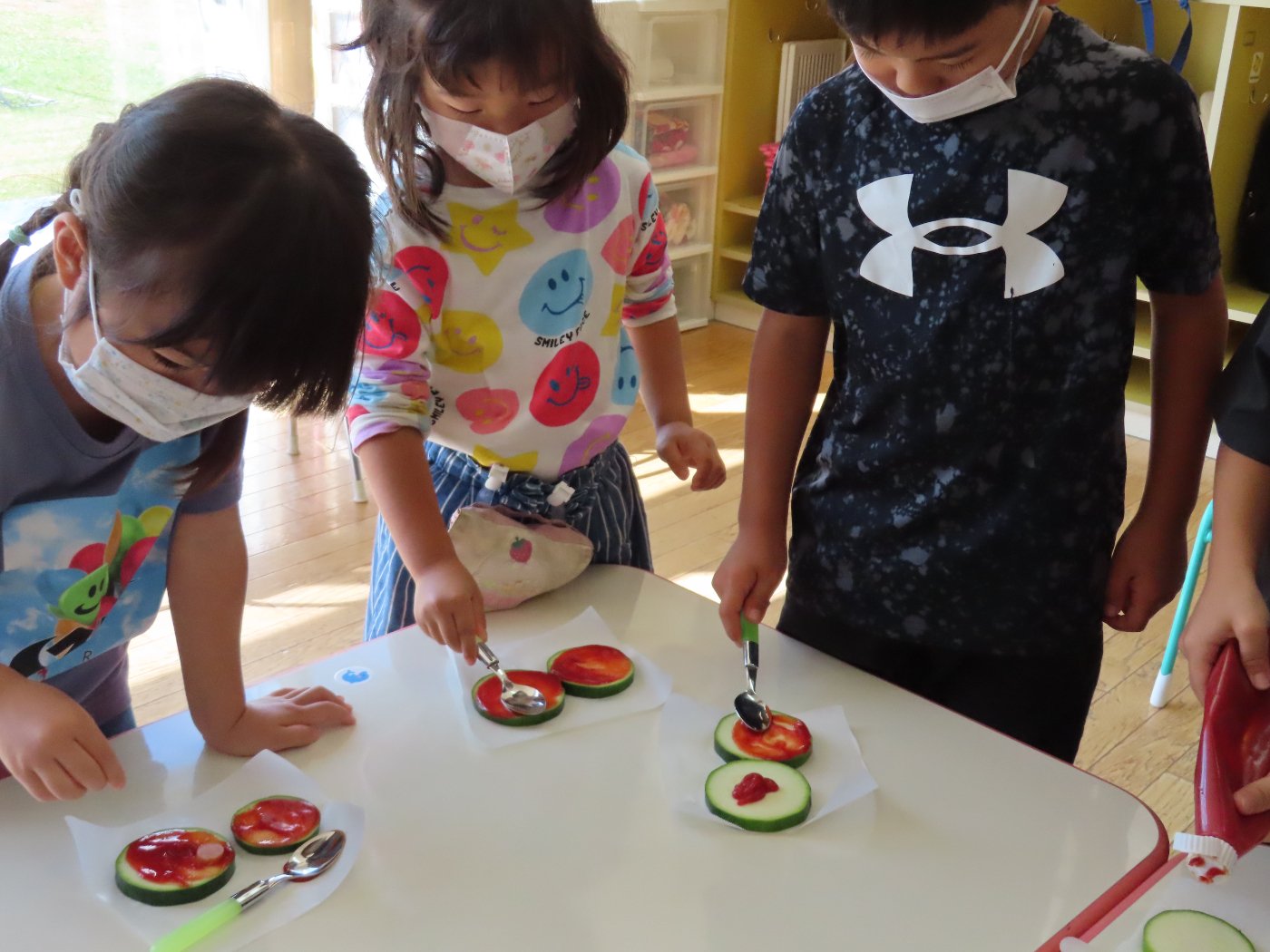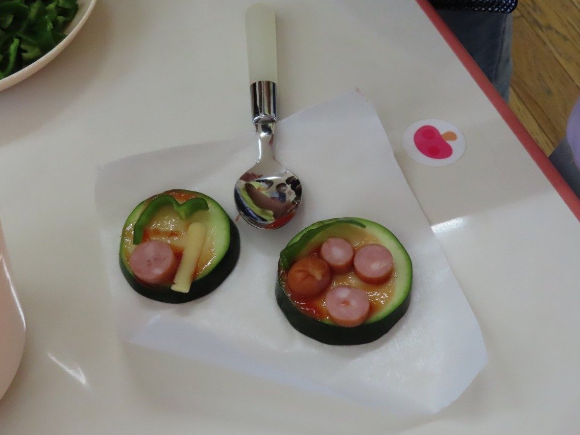 ピザ作りでは、輪切りにしたズッキーニをピザ生地替わりにしてケチャップを塗り、ミニトマト、ピーマン、バジル、ウィンナー、コーン、チーズをお好みでトッピング! それぞれの個性が光る一品に仕上げていました。お味の方は…、何度もおかわりをする子もいれば、上の具材だけを食べる子、渋~い顔をする子と様々でしたが、みんなで和気あいあいと作る過程や味わう雰囲気を楽しんでいた子ども達です。