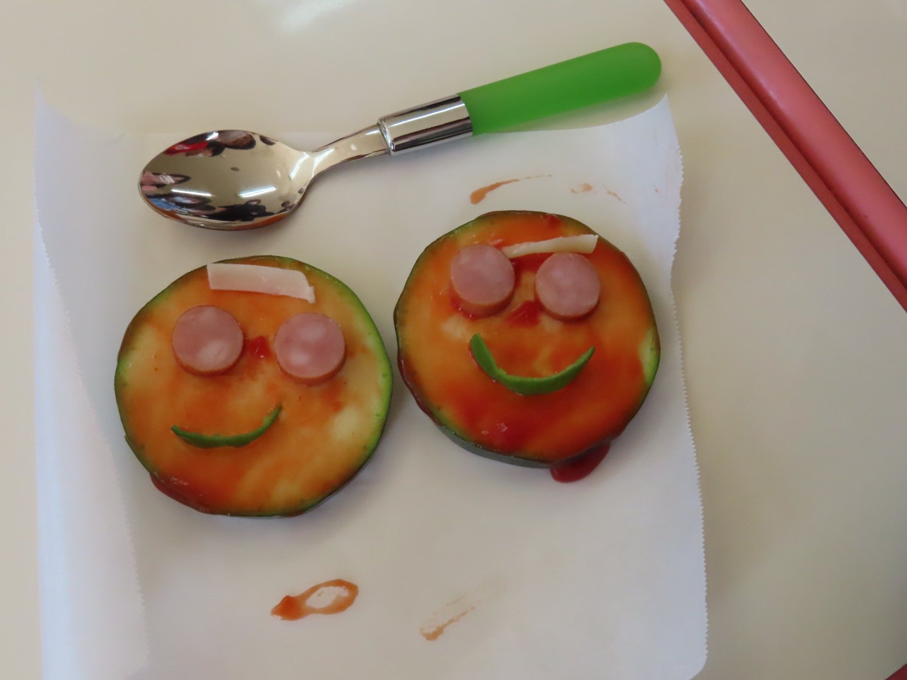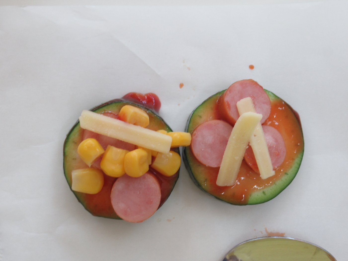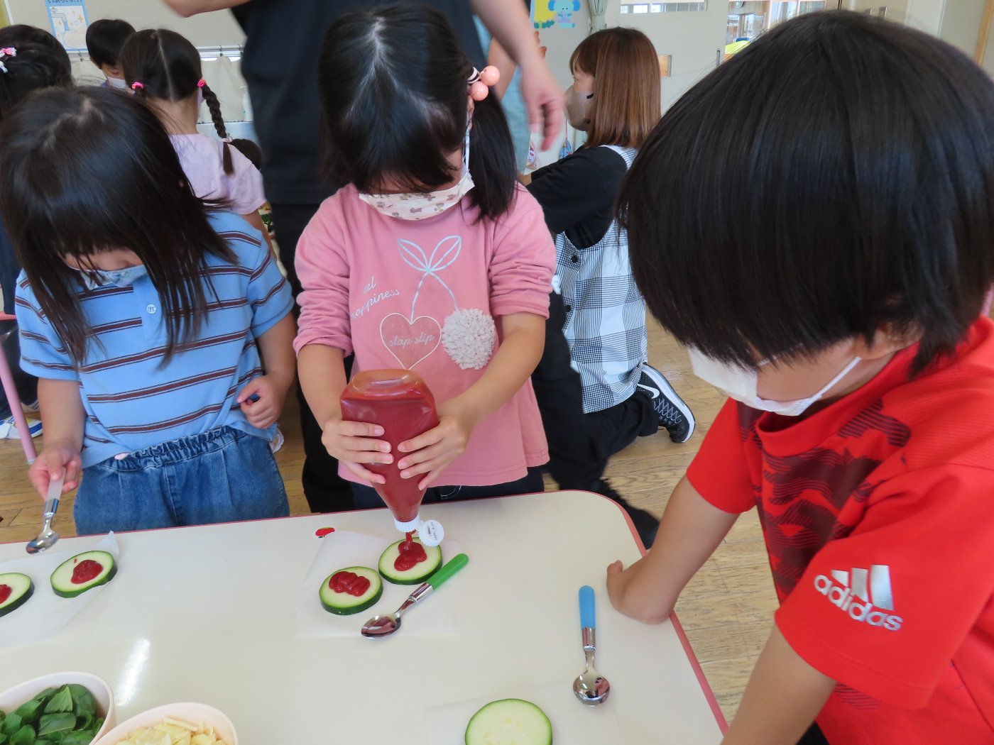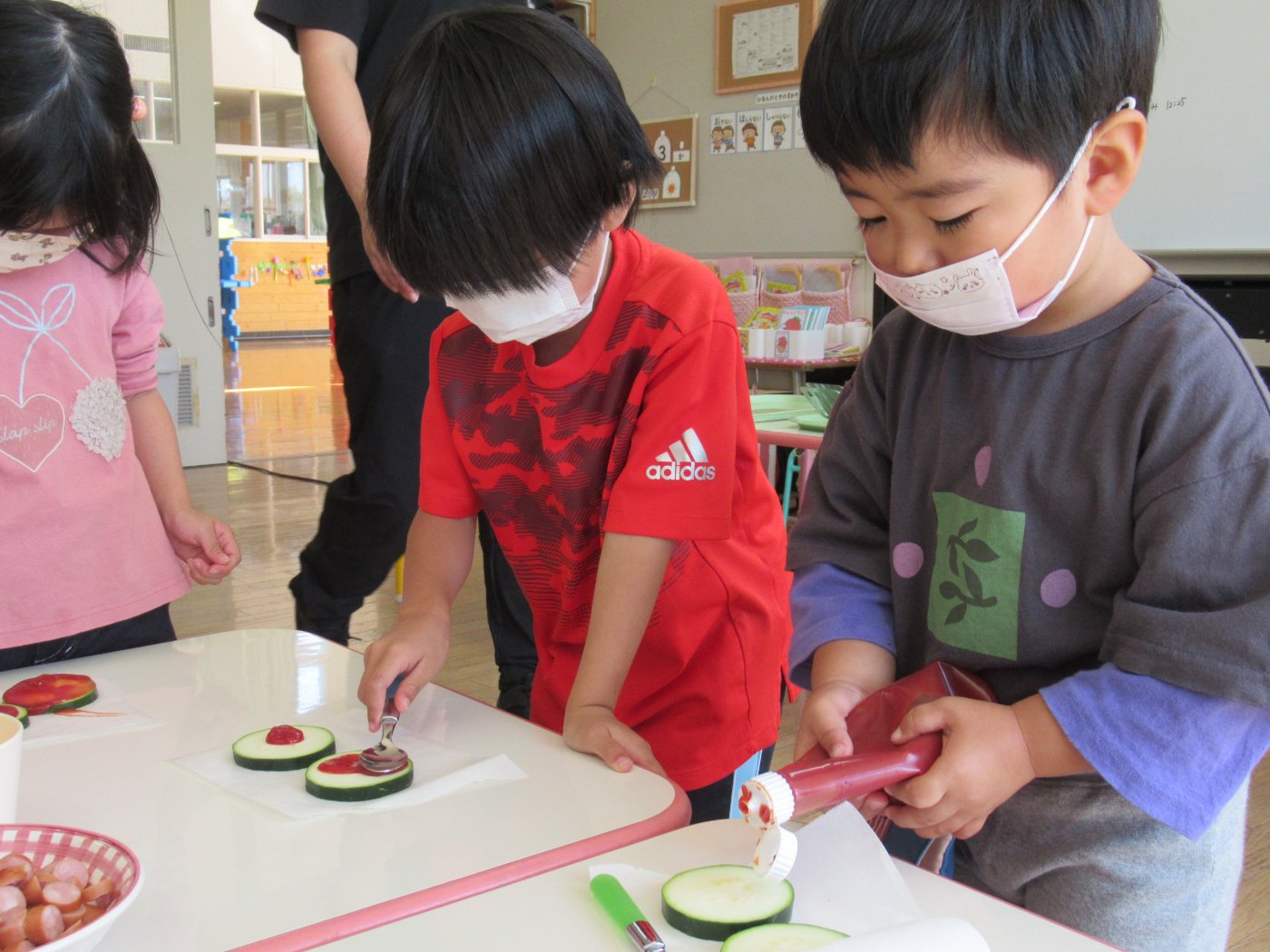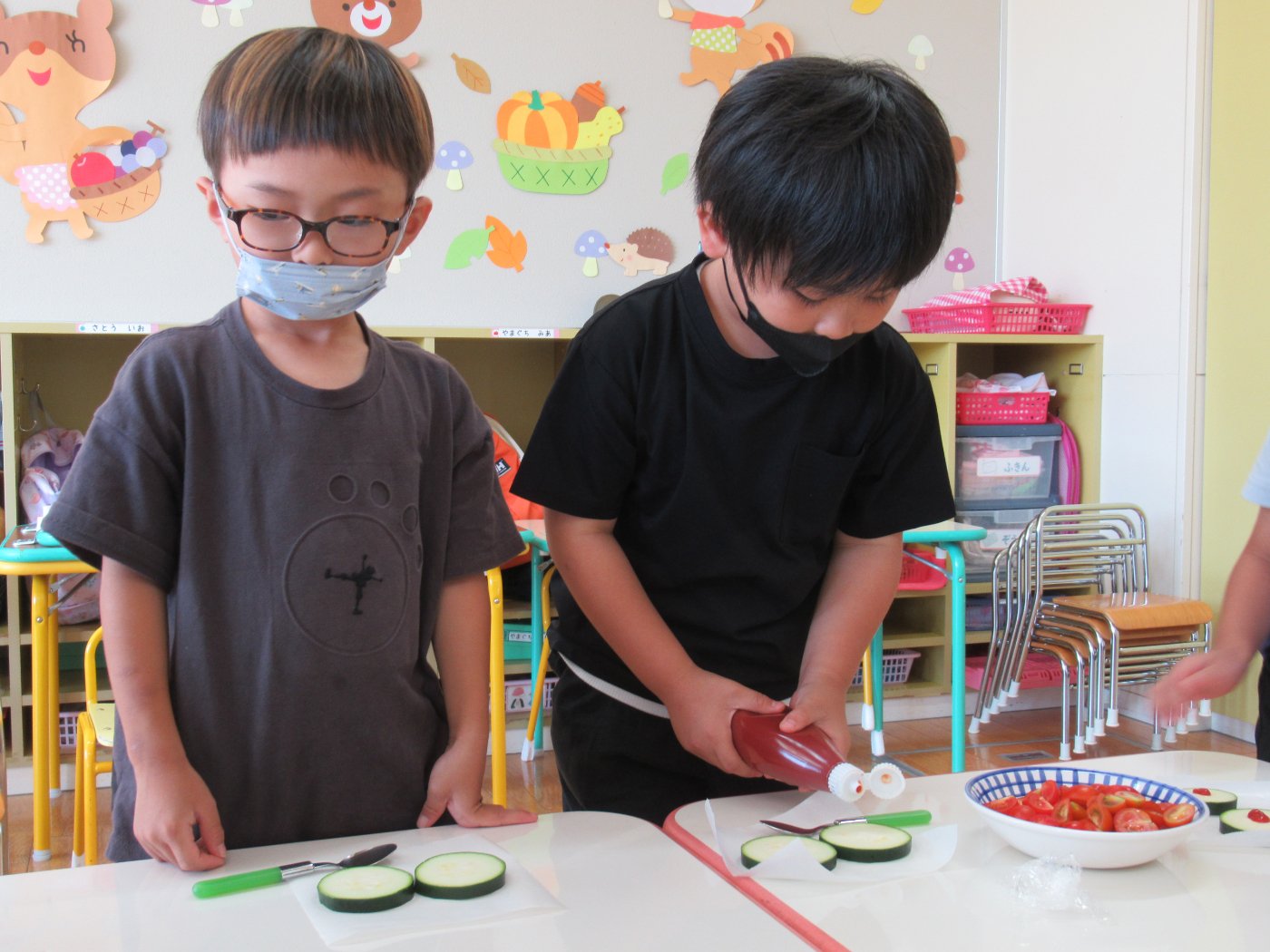 ピザ作りでは、輪切りにしたズッキーニをピザ生地替わりにしてケチャップを塗り、ミニトマト、ピーマン、バジル、ウィンナー、コーン、チーズをお好みでトッピング! それぞれの個性が光る一品に仕上げていました。お味の方は…、何度もおかわりをする子もいれば、上の具材だけを食べる子、渋~い顔をする子と様々でしたが、みんなで和気あいあいと作る過程や味わう雰囲気を楽しんでいた子ども達です。