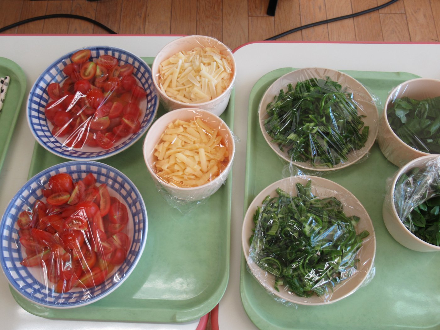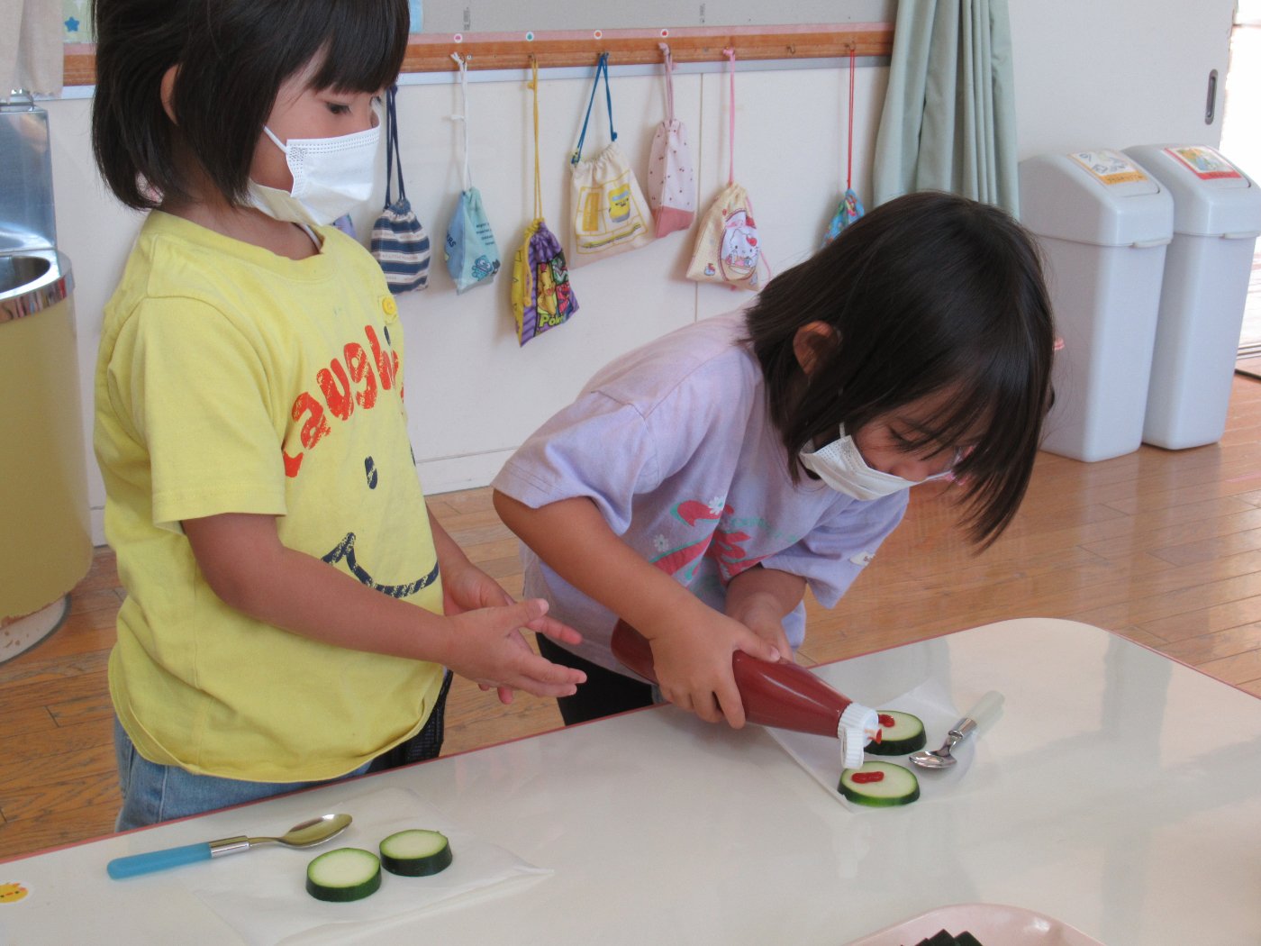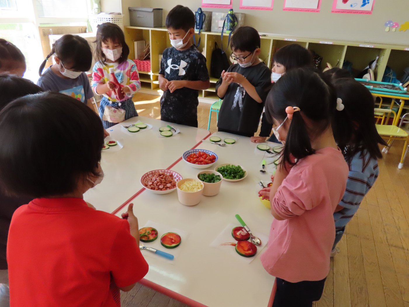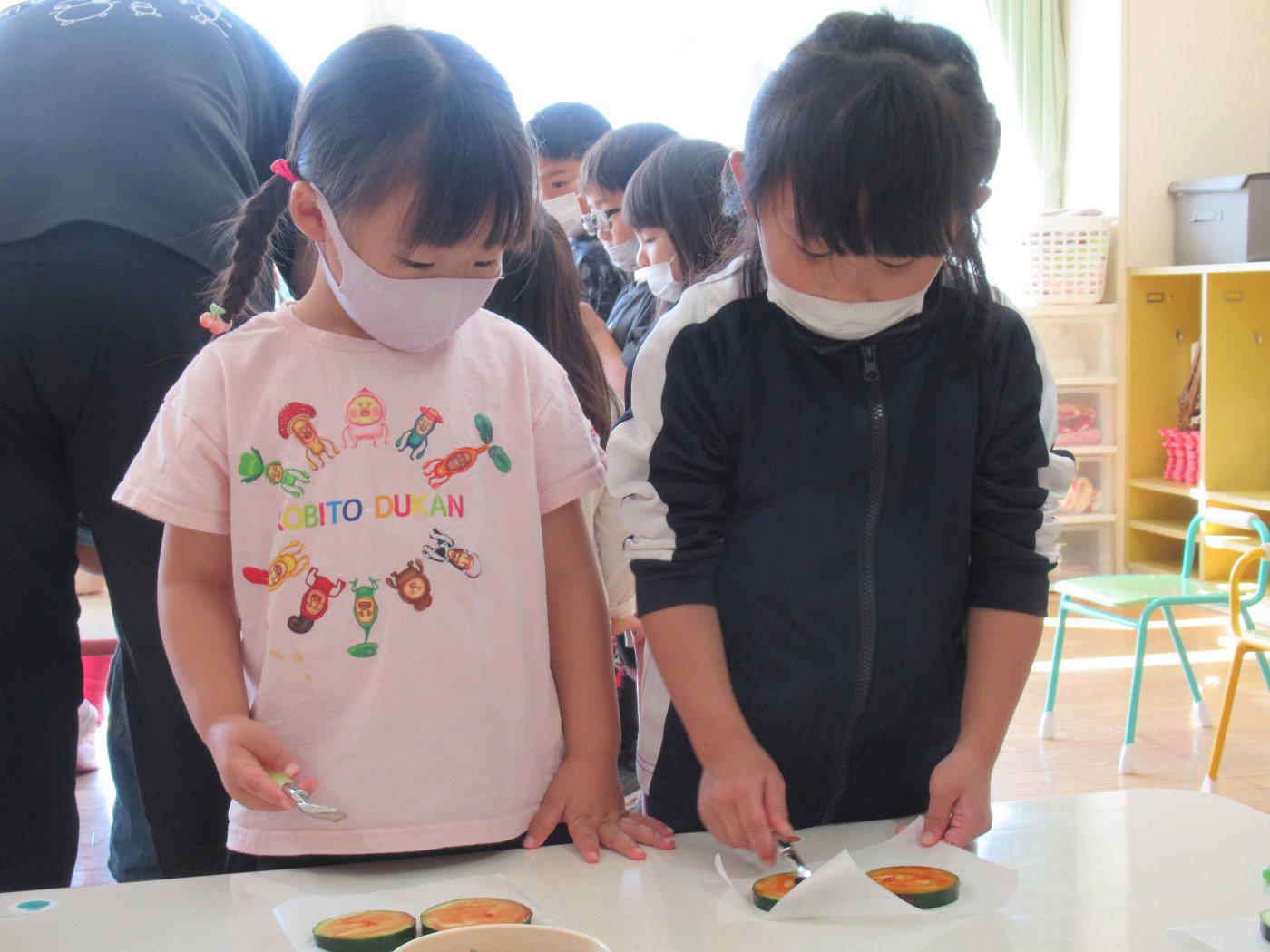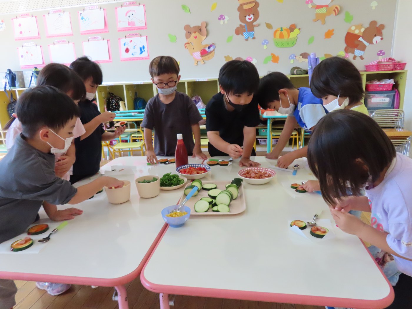 ピザ作りでは、輪切りにしたズッキーニをピザ生地替わりにしてケチャップを塗り、ミニトマト、ピーマン、バジル、ウィンナー、コーン、チーズをお好みでトッピング! それぞれの個性が光る一品に仕上げていました。お味の方は…、何度もおかわりをする子もいれば、上の具材だけを食べる子、渋~い顔をする子と様々でしたが、みんなで和気あいあいと作る過程や味わう雰囲気を楽しんでいた子ども達です。