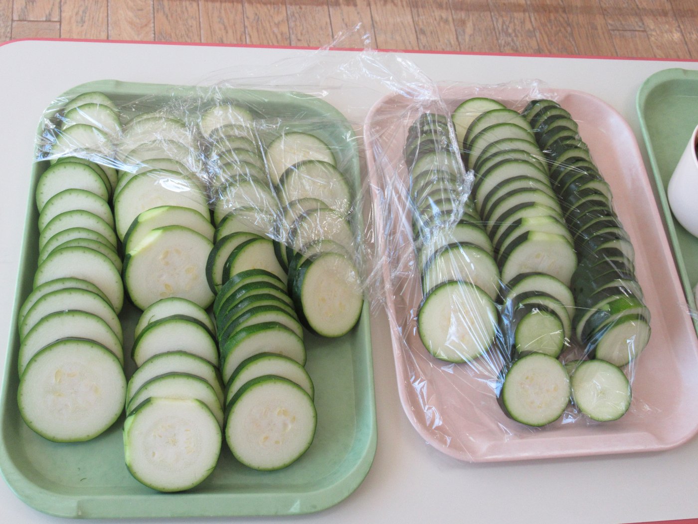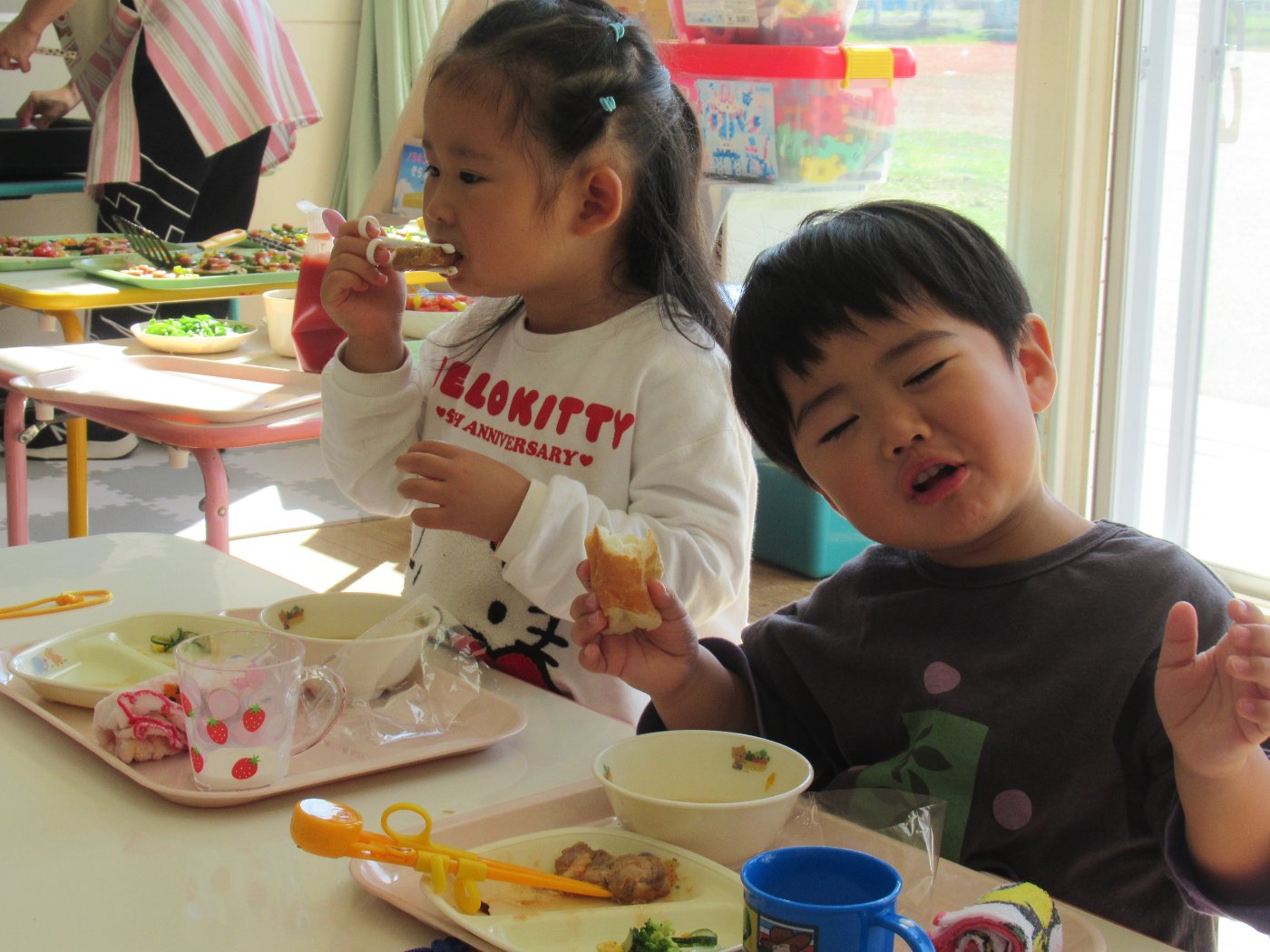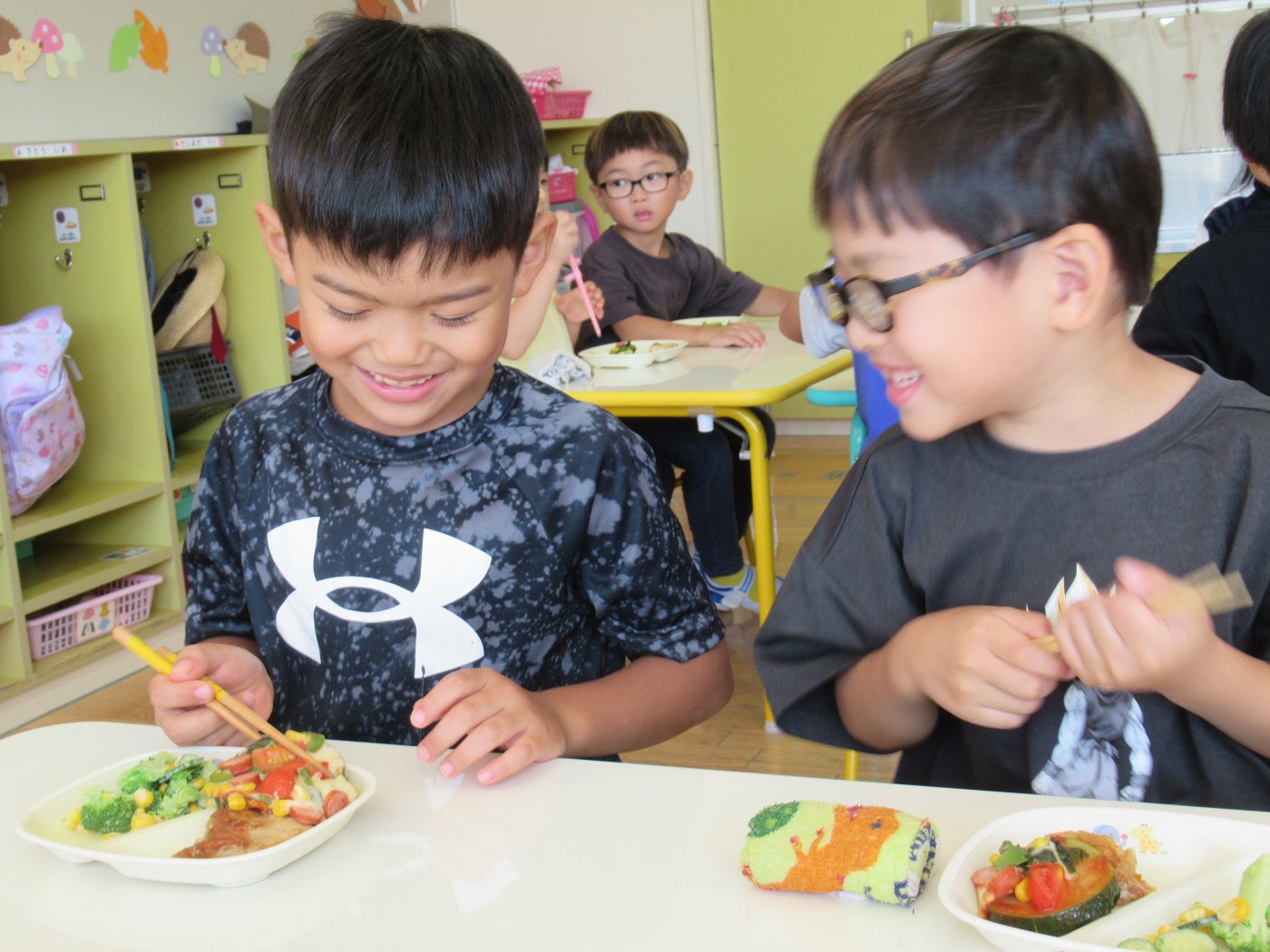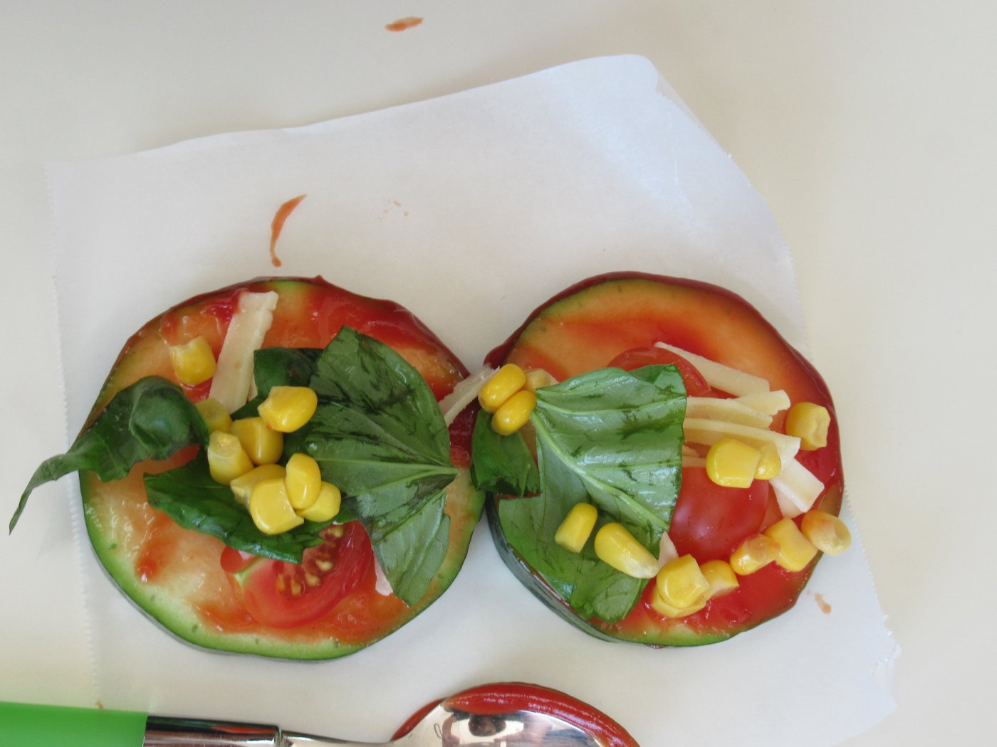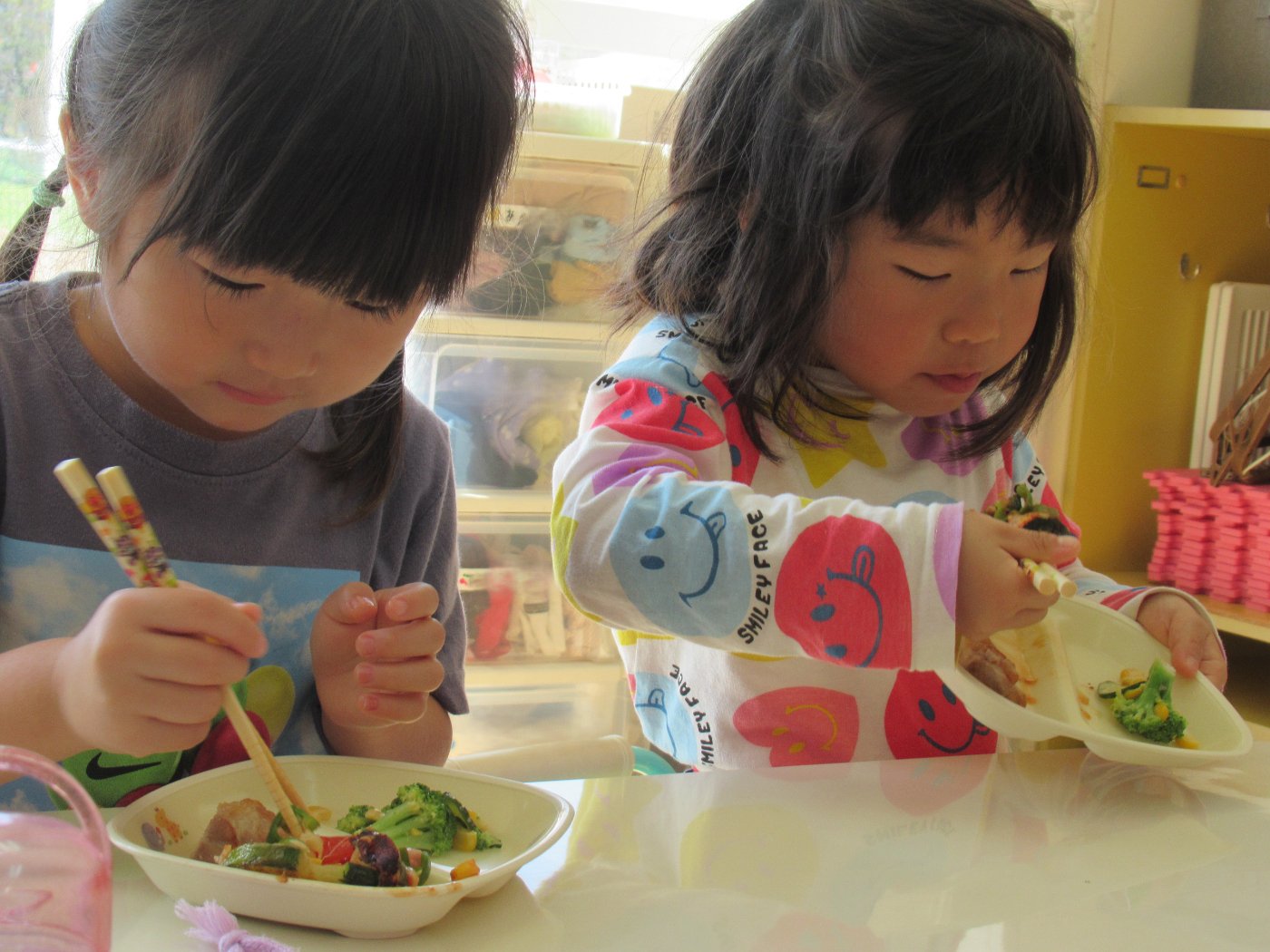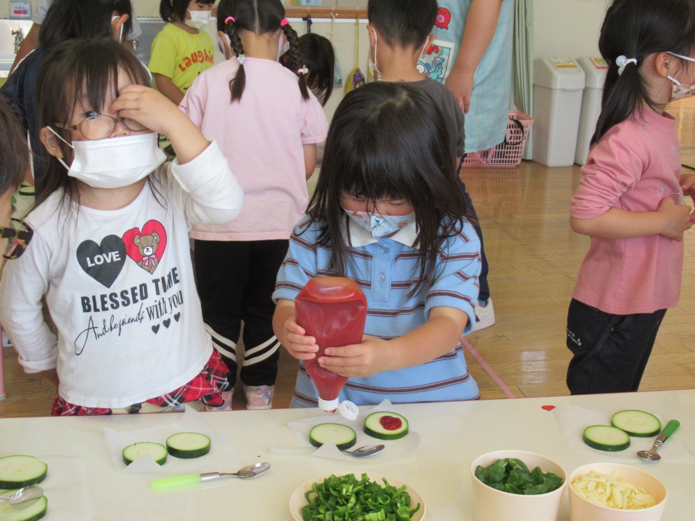 ピザ作りでは、輪切りにしたズッキーニをピザ生地替わりにしてケチャップを塗り、ミニトマト、ピーマン、バジル、ウィンナー、コーン、チーズをお好みでトッピング! それぞれの個性が光る一品に仕上げていました。お味の方は…、何度もおかわりをする子もいれば、上の具材だけを食べる子、渋~い顔をする子と様々でしたが、みんなで和気あいあいと作る過程や味わう雰囲気を楽しんでいた子ども達です。