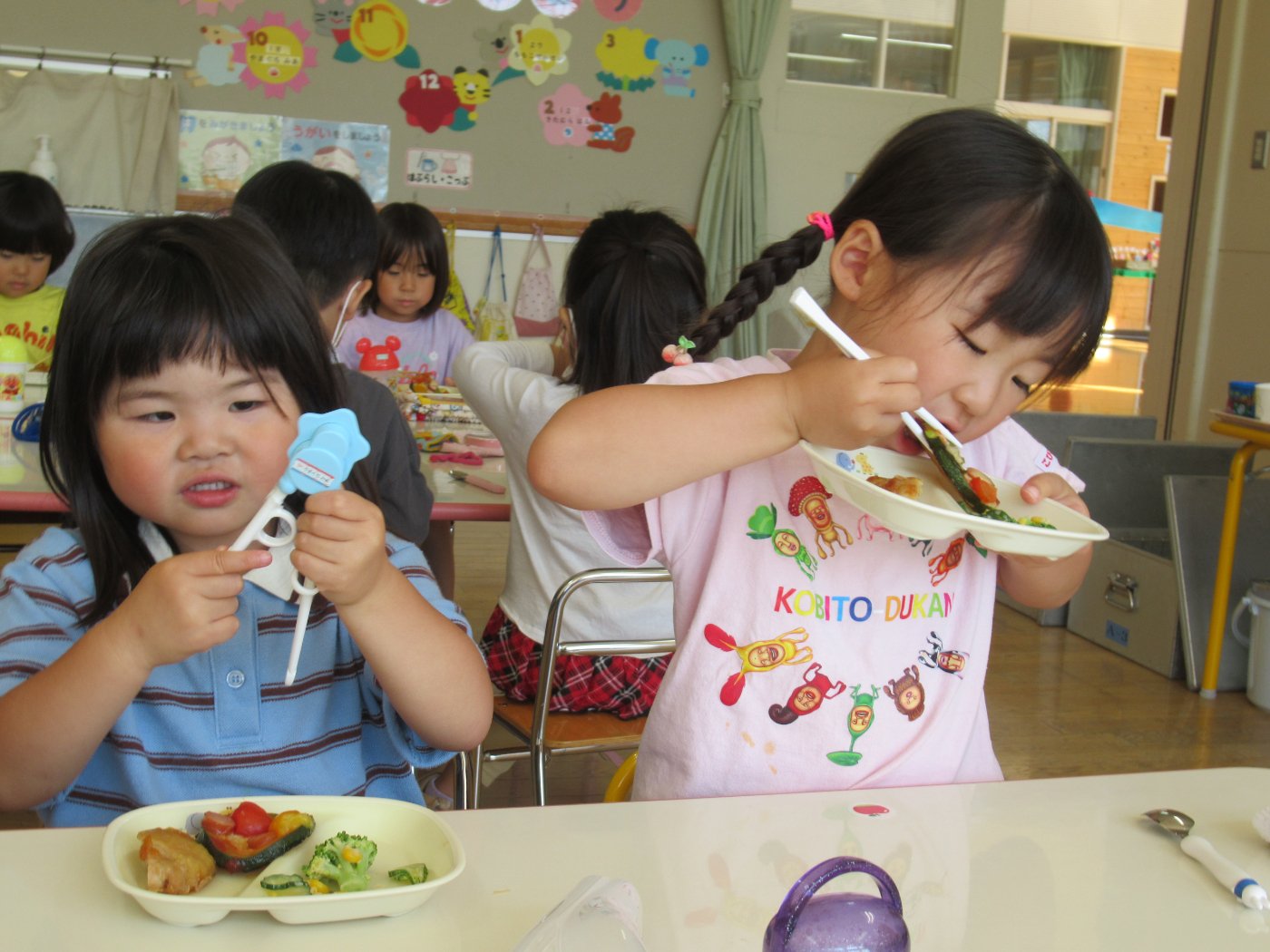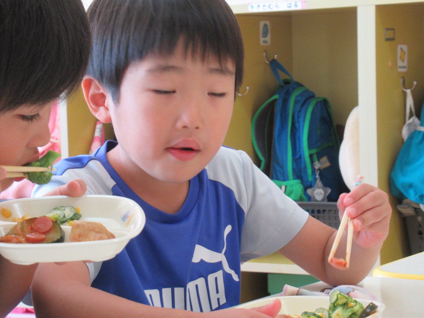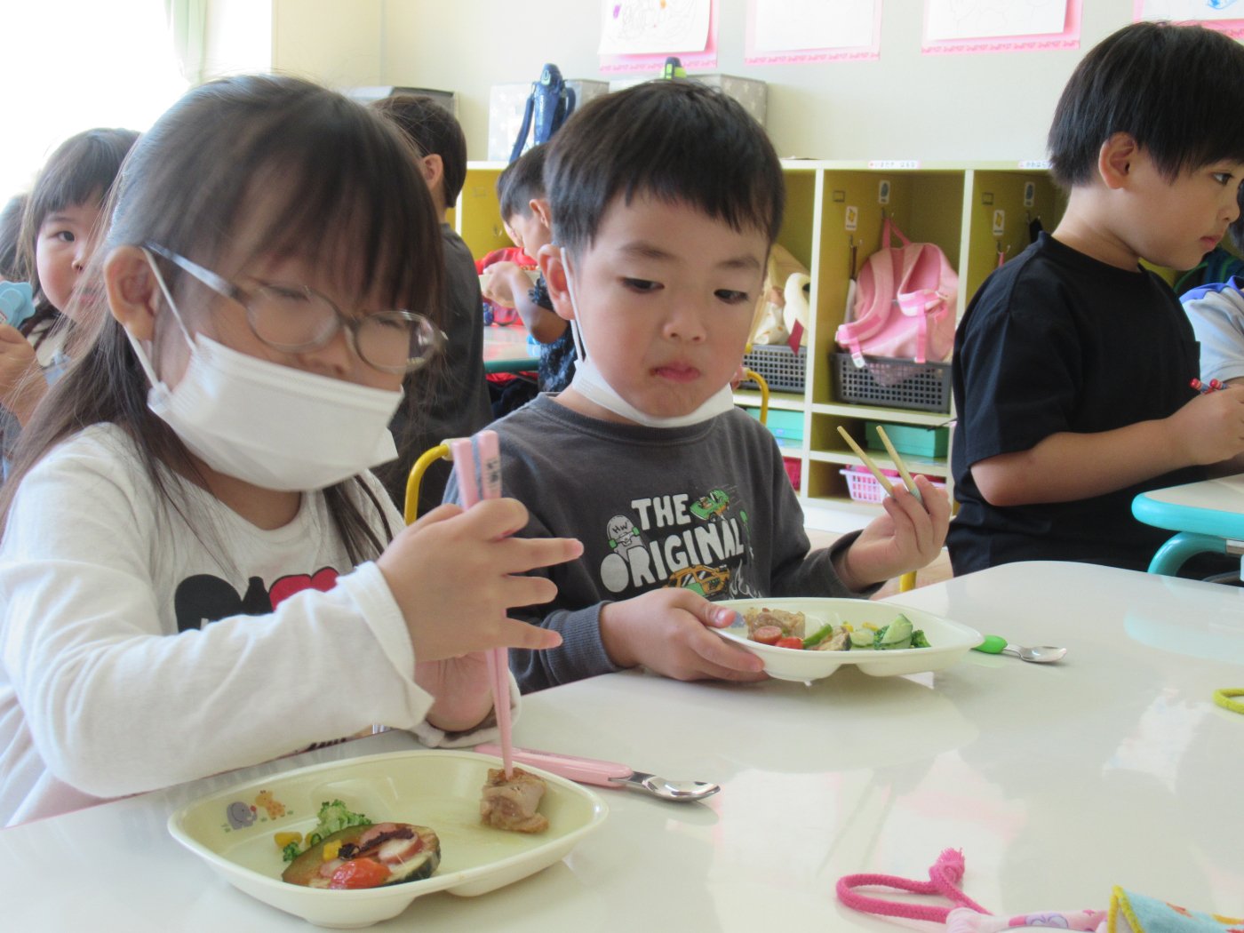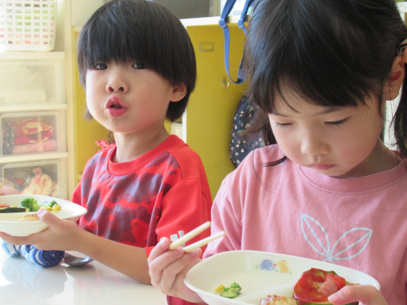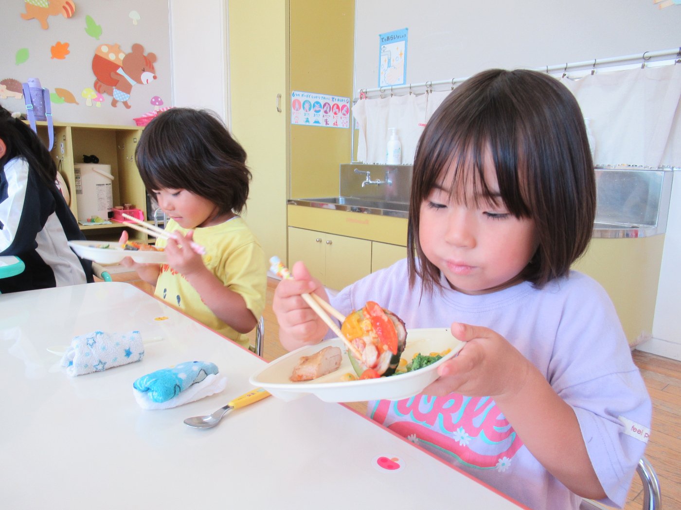 ピザ作りでは、輪切りにしたズッキーニをピザ生地替わりにしてケチャップを塗り、ミニトマト、ピーマン、バジル、ウィンナー、コーン、チーズをお好みでトッピング! それぞれの個性が光る一品に仕上げていました。お味の方は…、何度もおかわりをする子もいれば、上の具材だけを食べる子、渋~い顔をする子と様々でしたが、みんなで和気あいあいと作る過程や味わう雰囲気を楽しんでいた子ども達です。