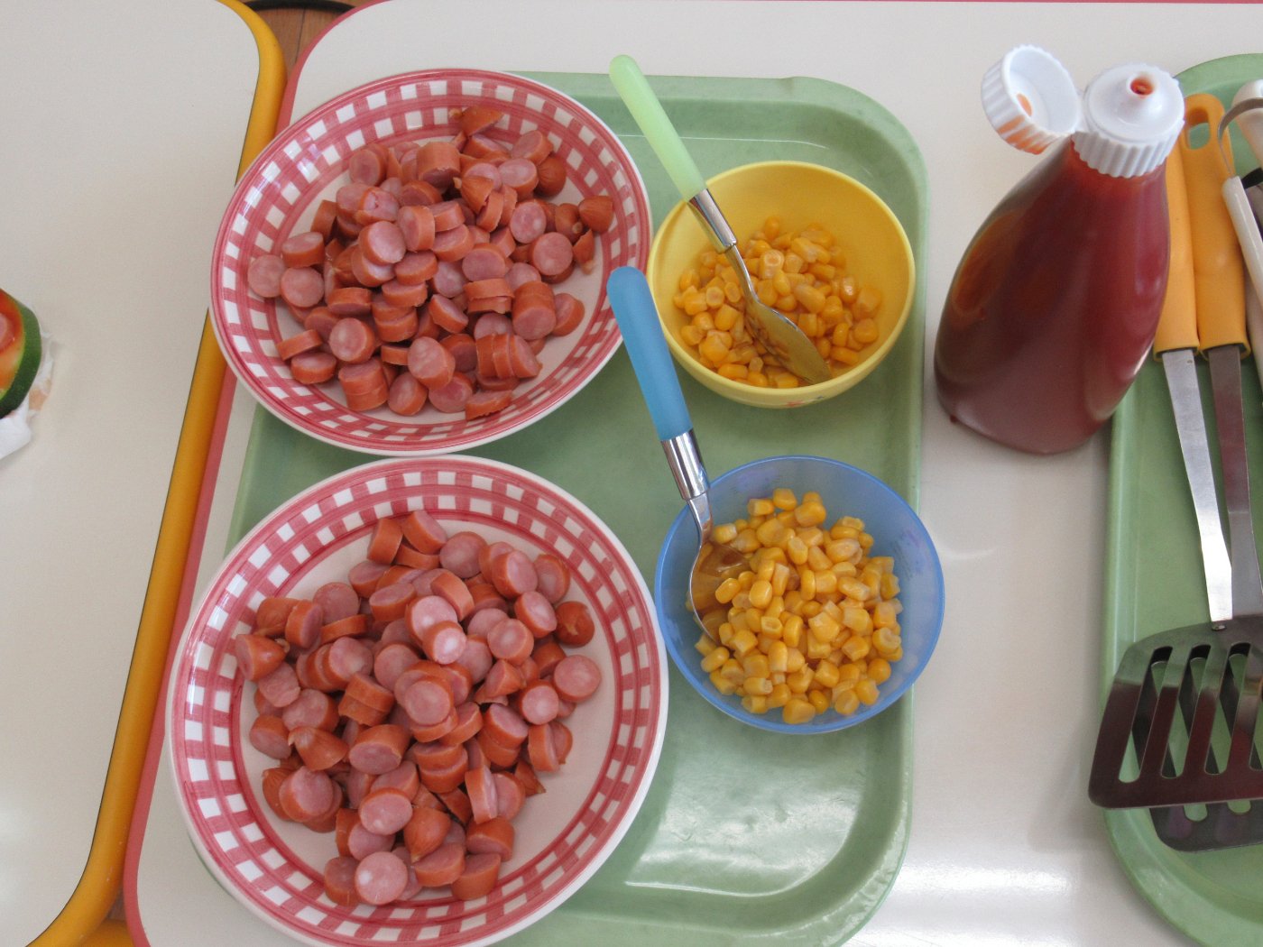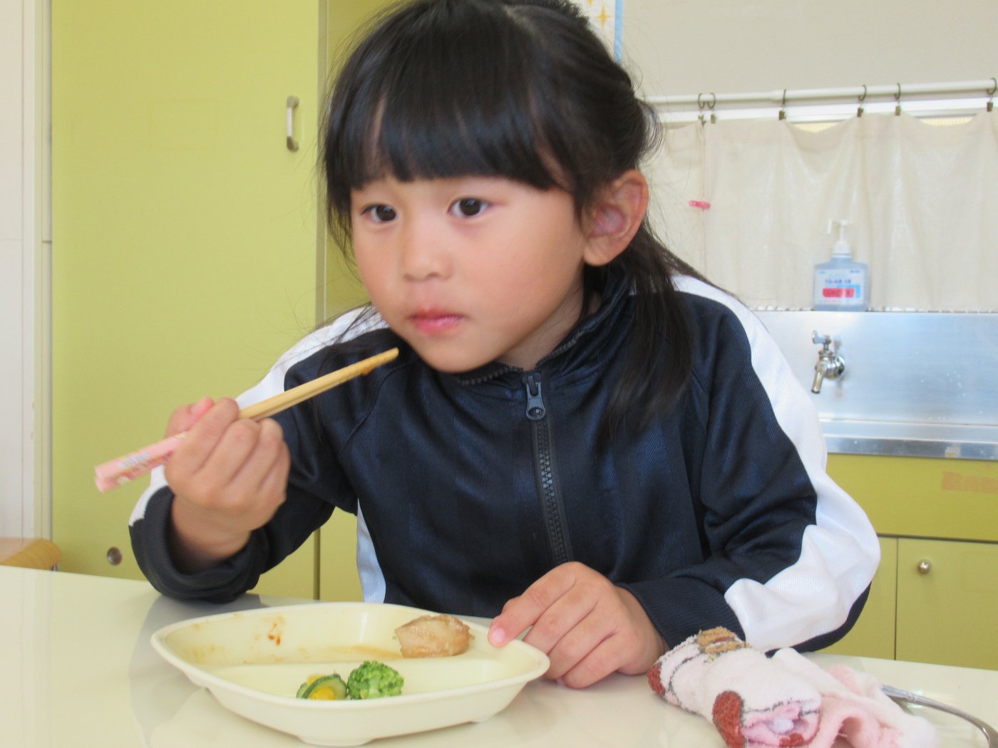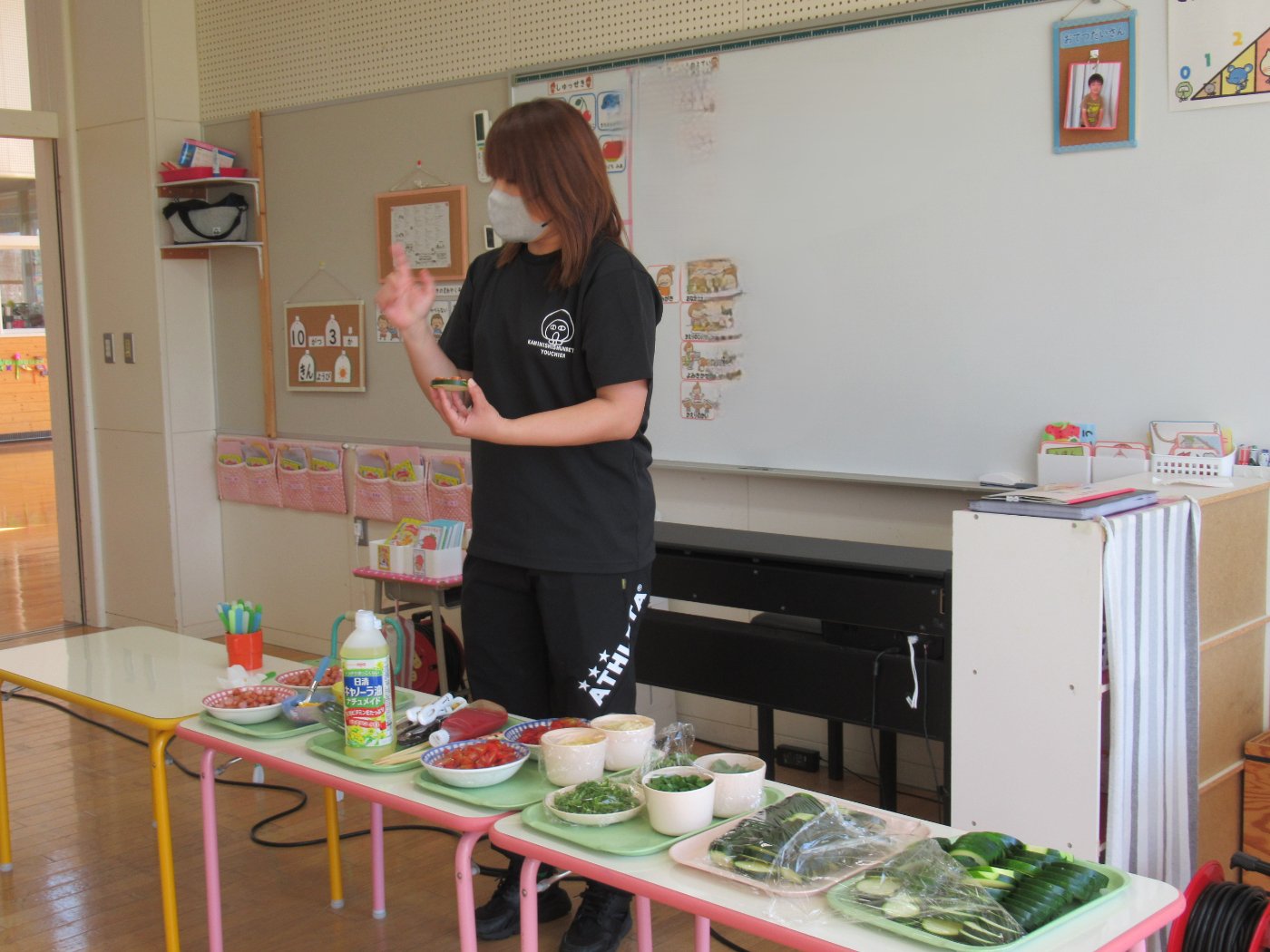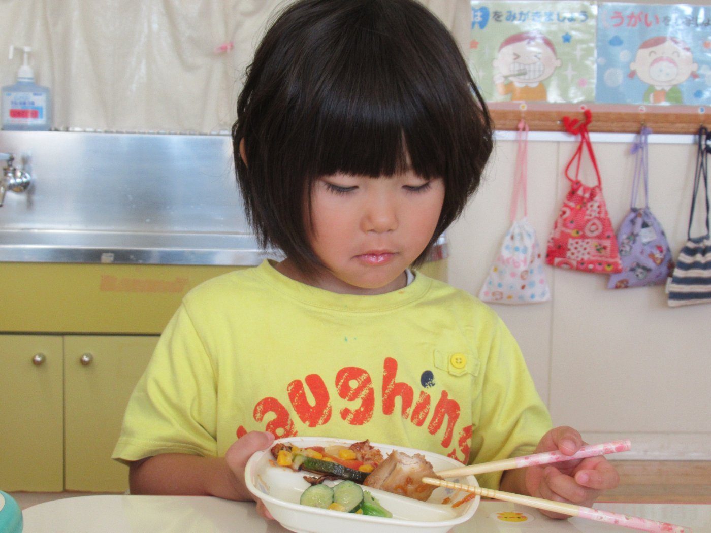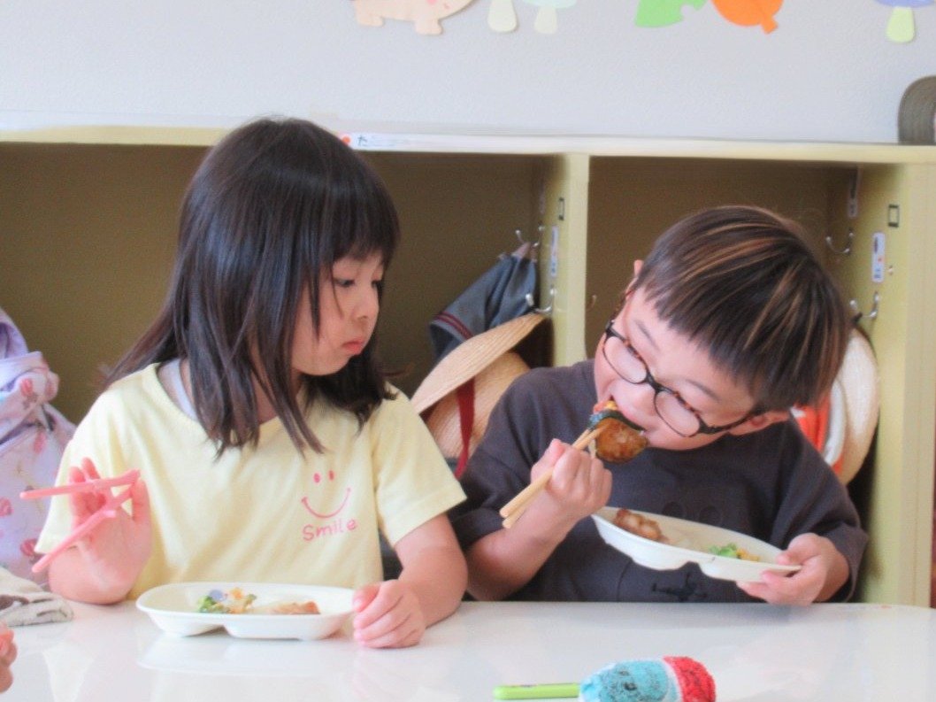 ピザ作りでは、輪切りにしたズッキーニをピザ生地替わりにしてケチャップを塗り、ミニトマト、ピーマン、バジル、ウィンナー、コーン、チーズをお好みでトッピング! それぞれの個性が光る一品に仕上げていました。お味の方は…、何度もおかわりをする子もいれば、上の具材だけを食べる子、渋~い顔をする子と様々でしたが、みんなで和気あいあいと作る過程や味わう雰囲気を楽しんでいた子ども達です。