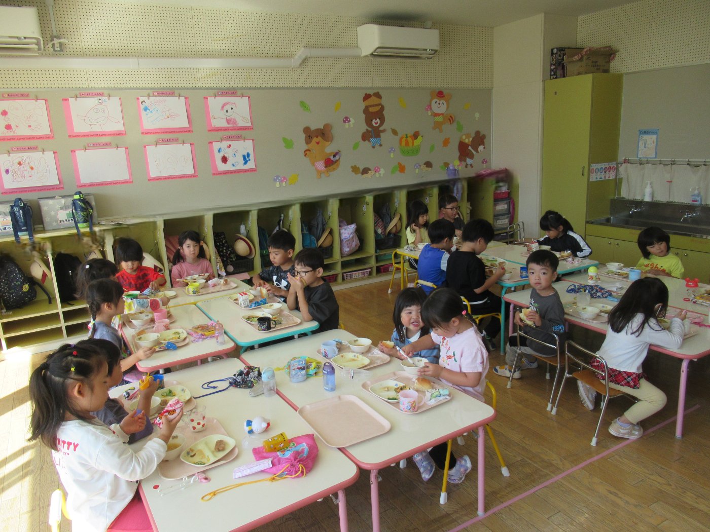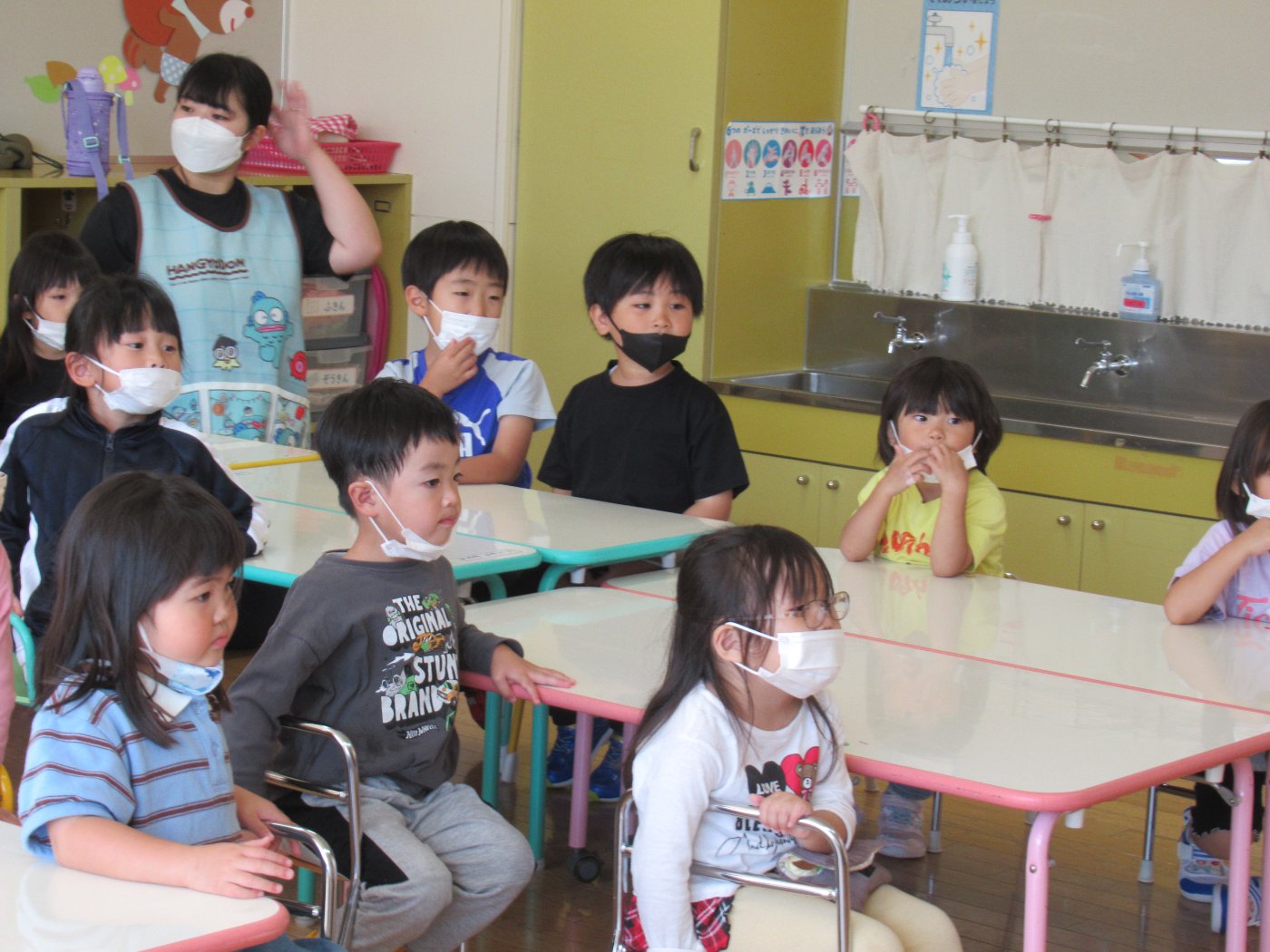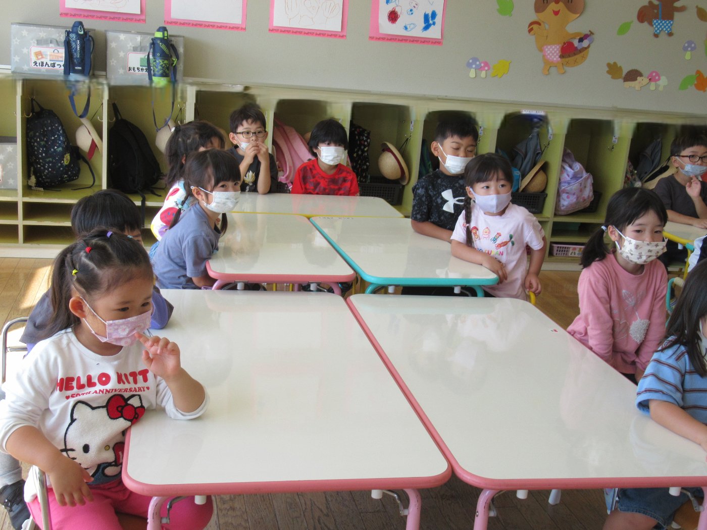 3歳児担任・4歳児副担任が野付幼稚園の学校教育訪問参加のため、今日は3学年合同で1日を過ごしました。全園児でいちご組保育室に集合しての朝の会では、どの子もわくわく・うきうきの表情でしたよ。