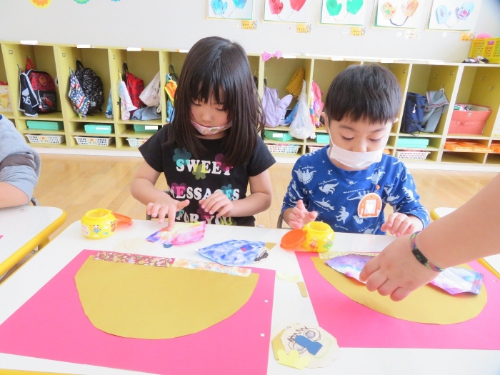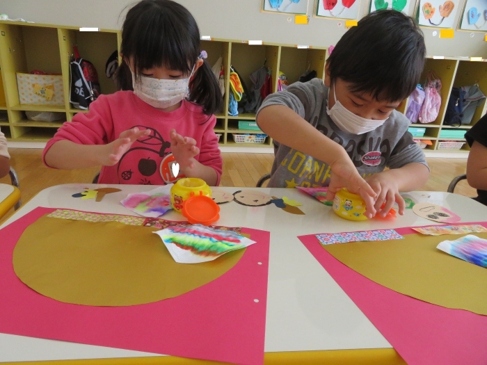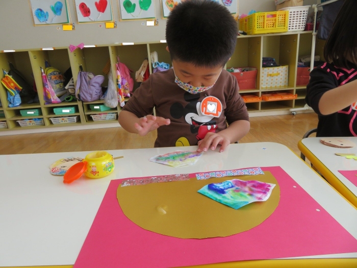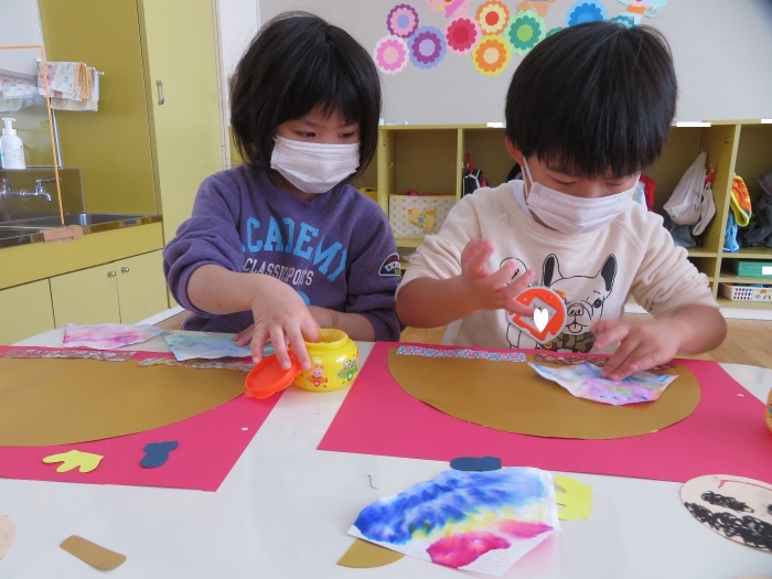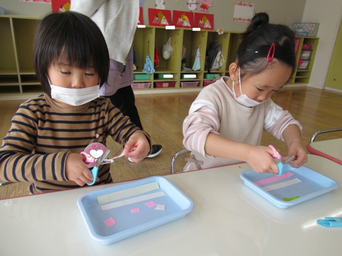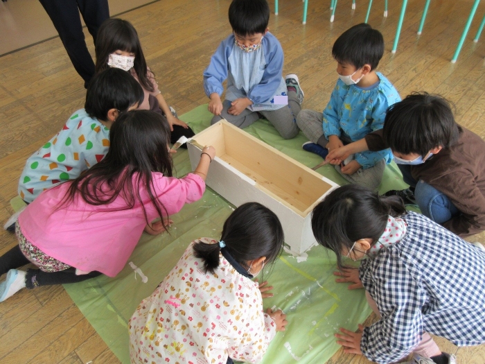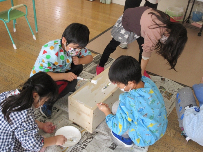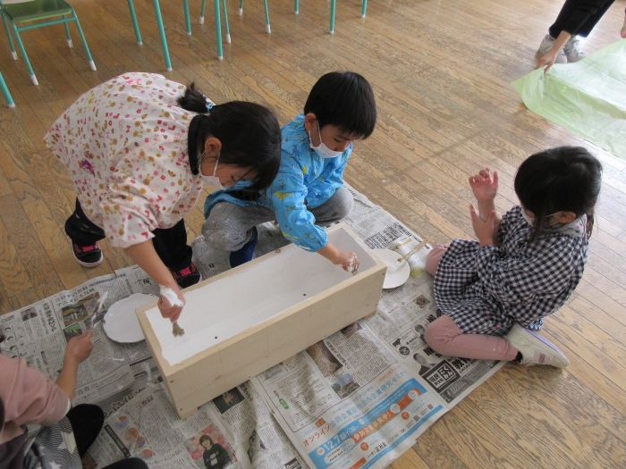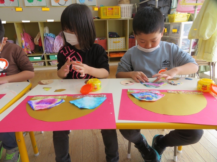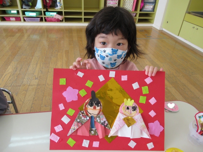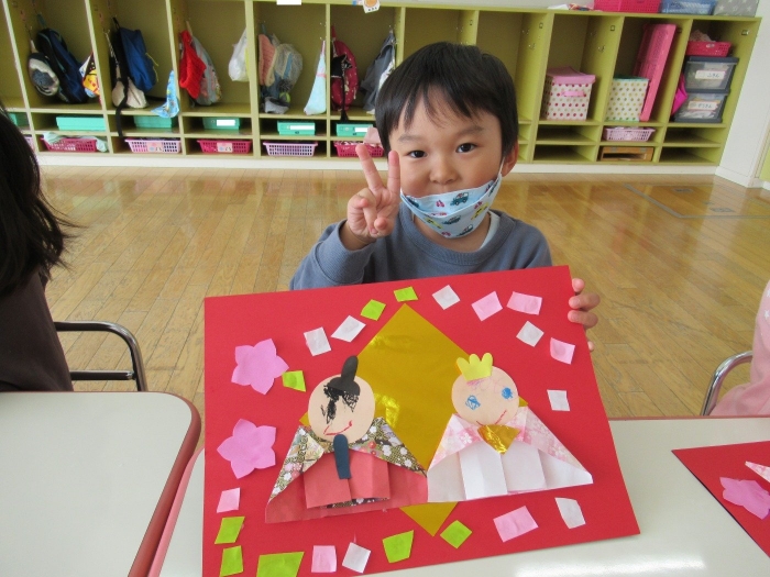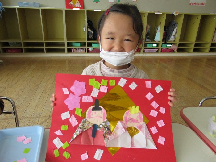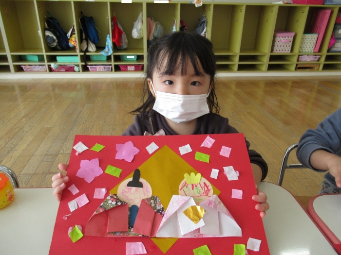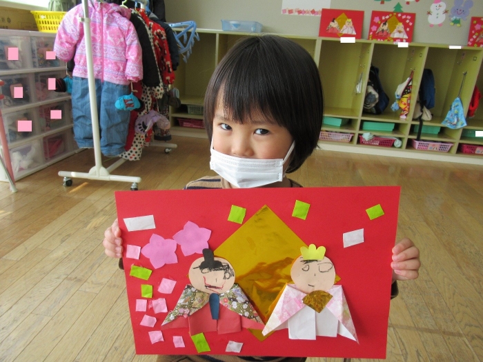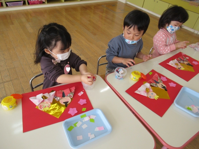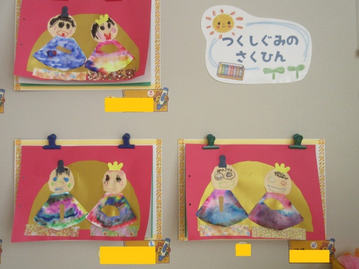 いちごさん・つくしさんは、昨日から制作していた雛人形が、今日完成しました。力作をご覧ください。たけのこさんは、8名で相談して決めた卒園制作に向けて取り組んでいます。どんな卒園制作が完成するのかお楽しみに。